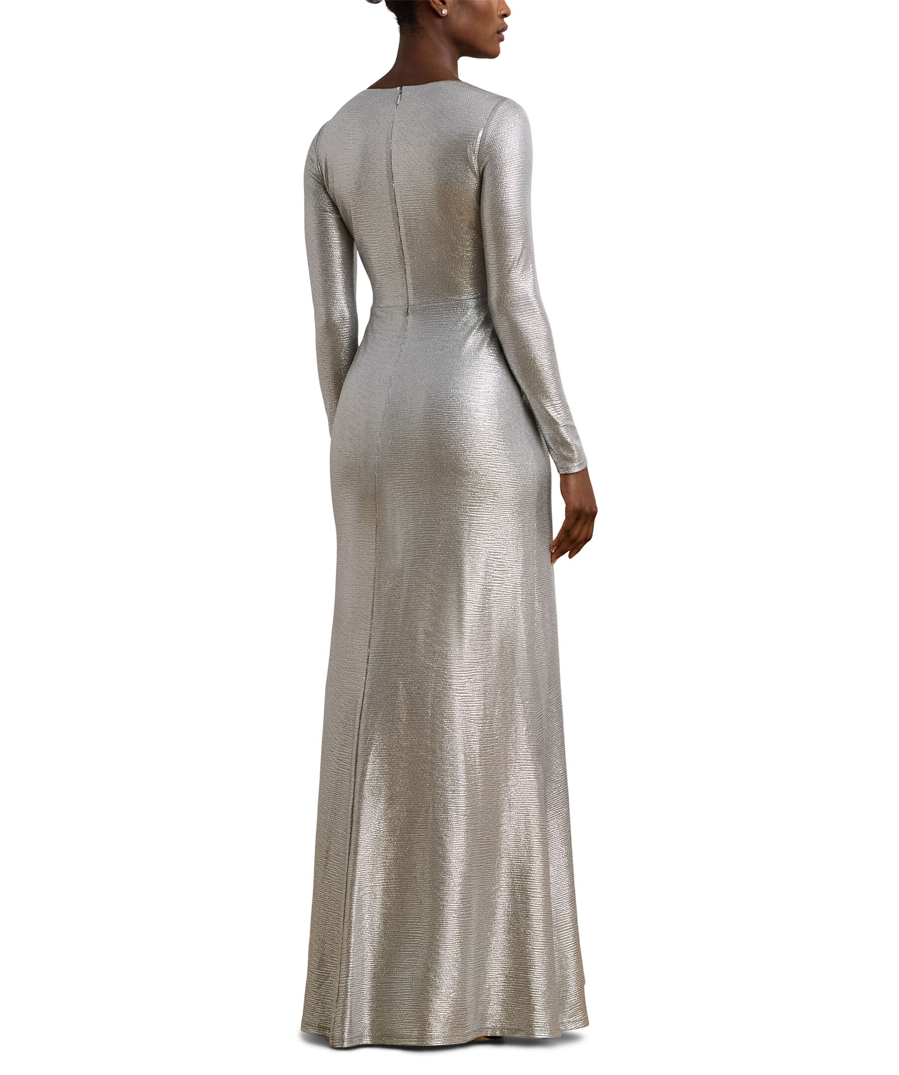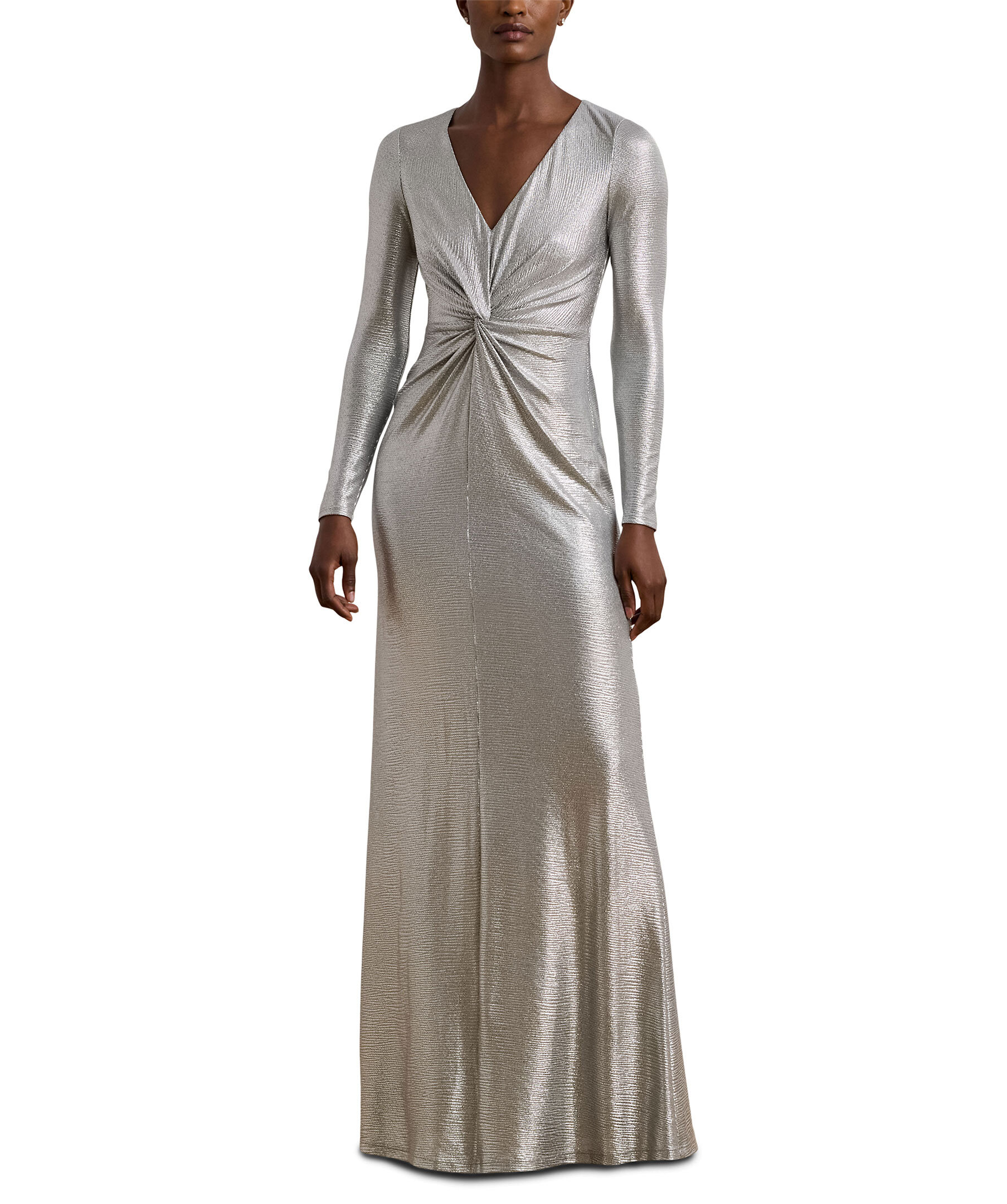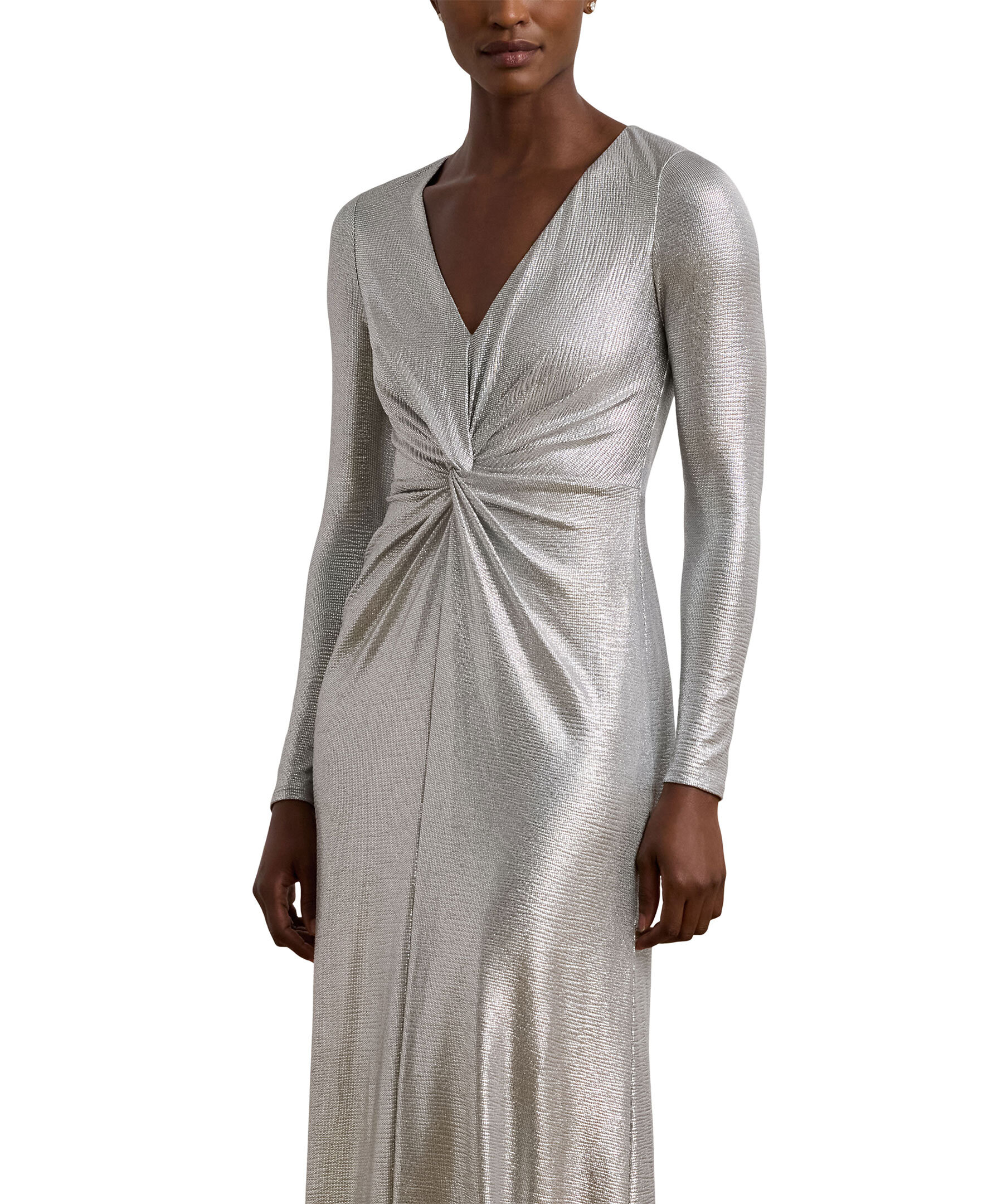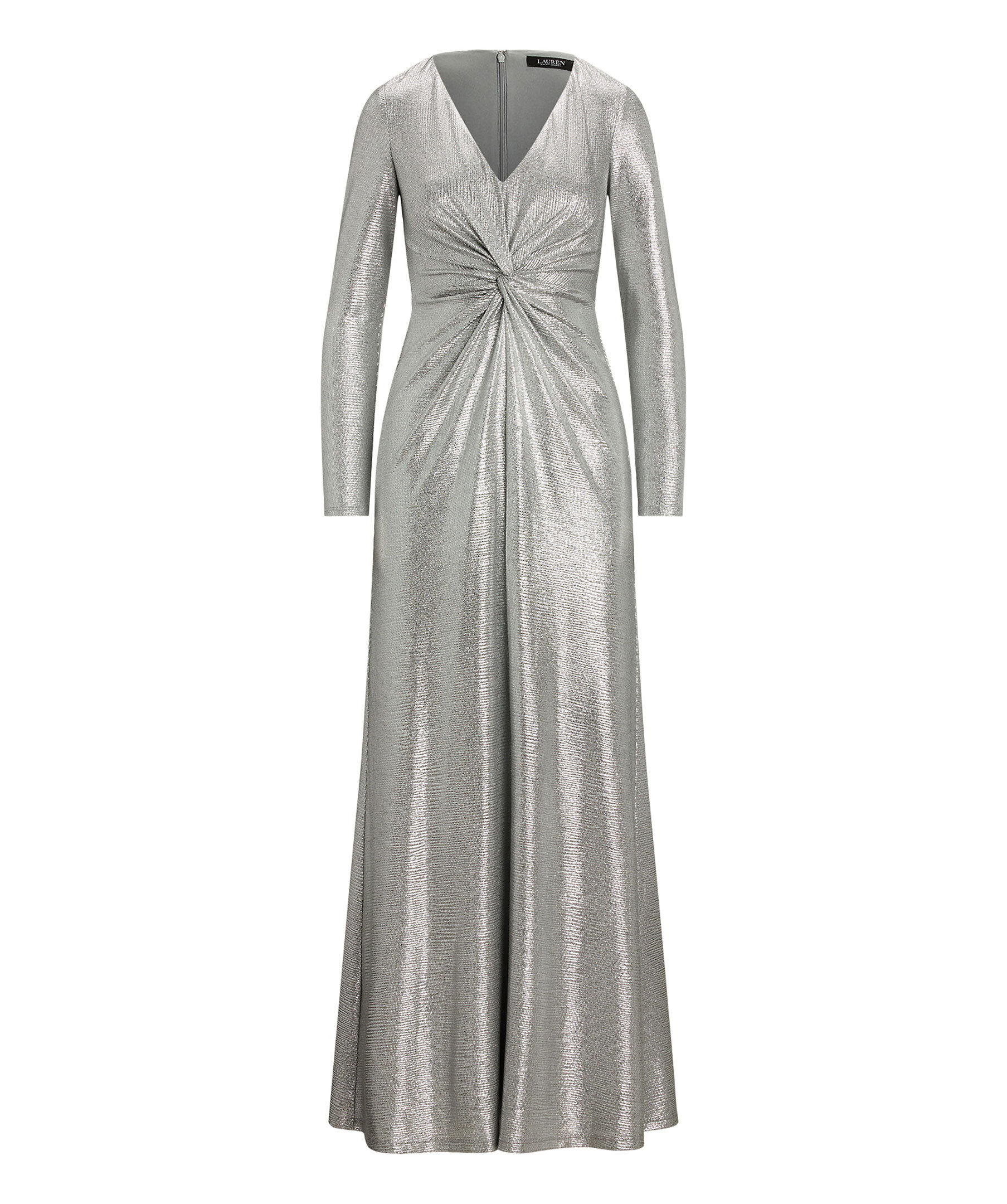 Silvrig aftonklänning från Lauren Ralph Lauren. Tillverkad av ett stretchigt stickat tyg med en strålande metallisk finish. Den kännetecknas av en elegant tvistdetalj och en statyliknande kolumnsilhuett, vilket gör den till ett utmärkt val för din nästa tillställning. Klänningen faller till golvet och har V-ringning, dold dragkedja i ryggen med hak- och ögonslutning samt långa ärmar. Tvistdetaljen sitter vid midjan för en smickrande form. Modellen är 178cm och har på sig strl 36.
