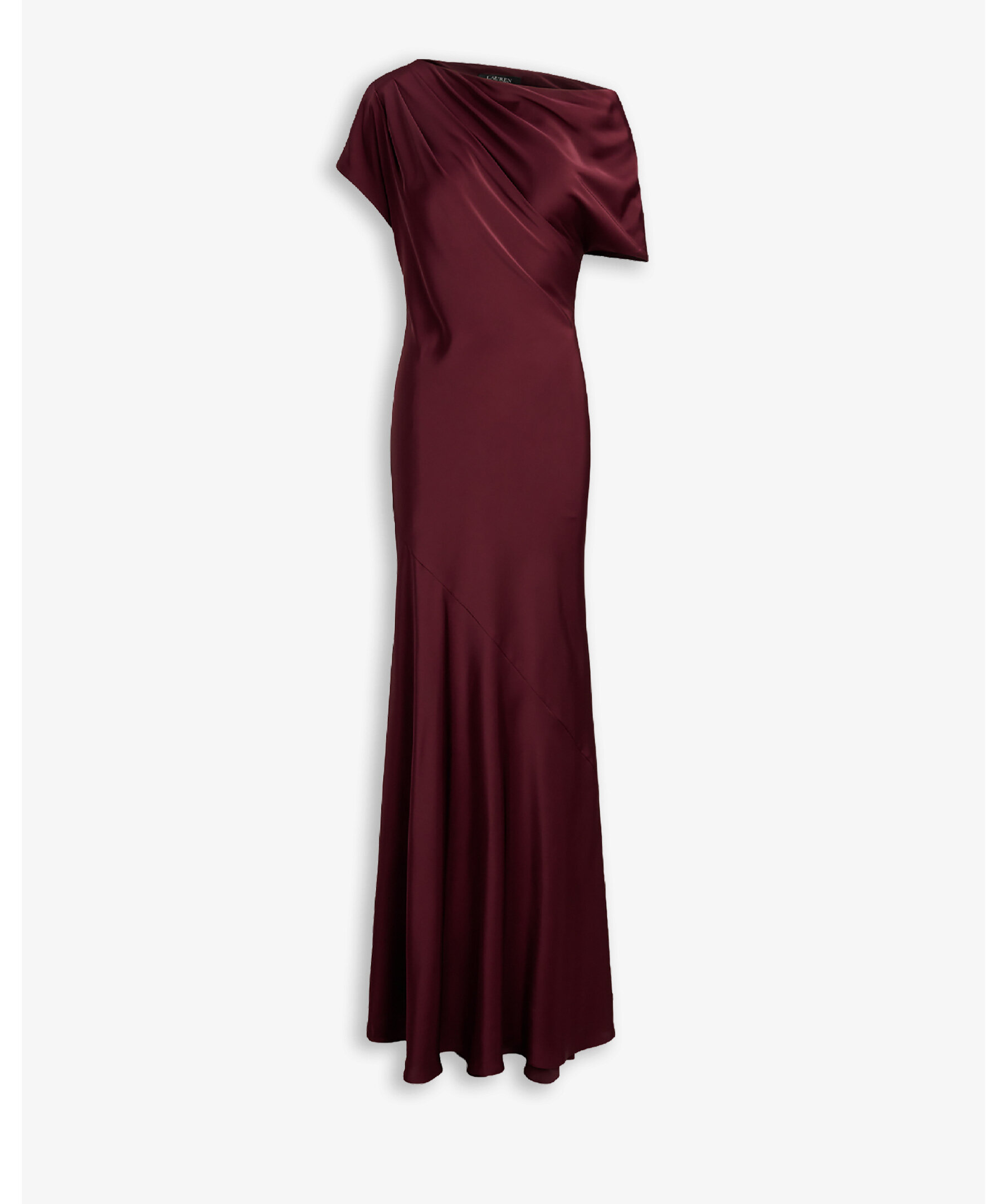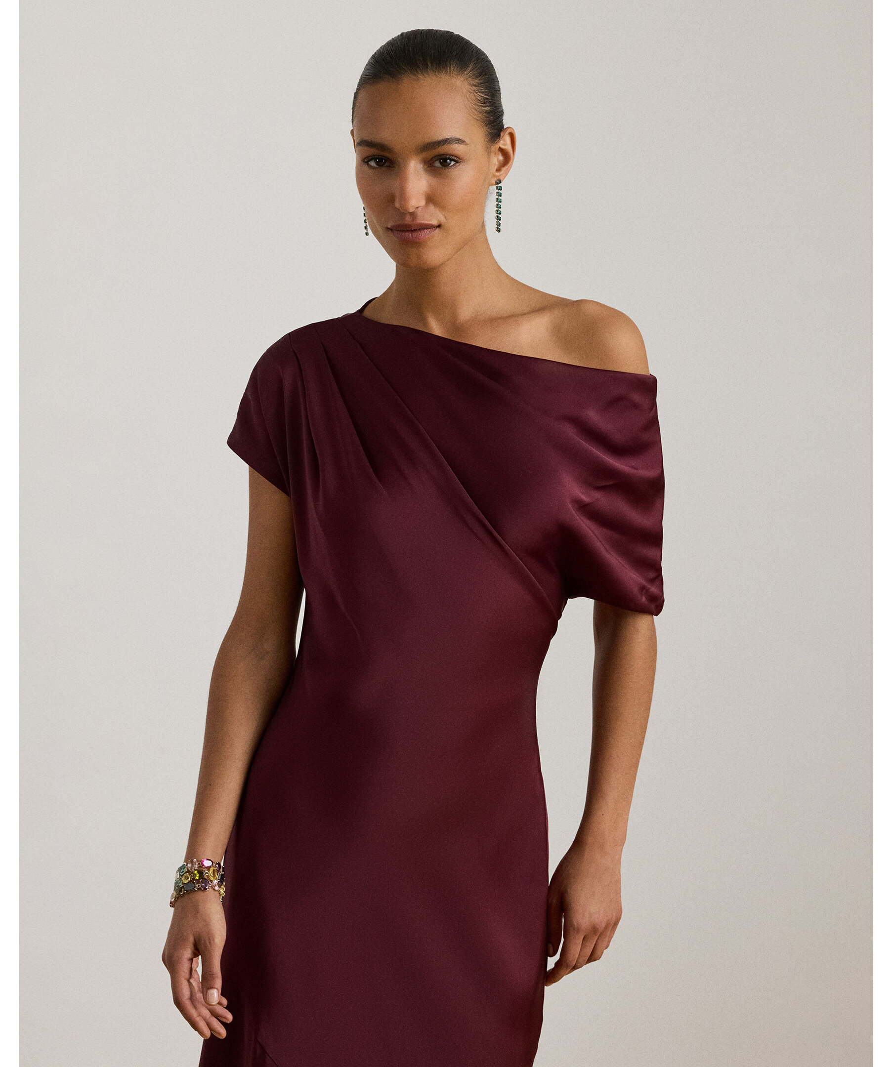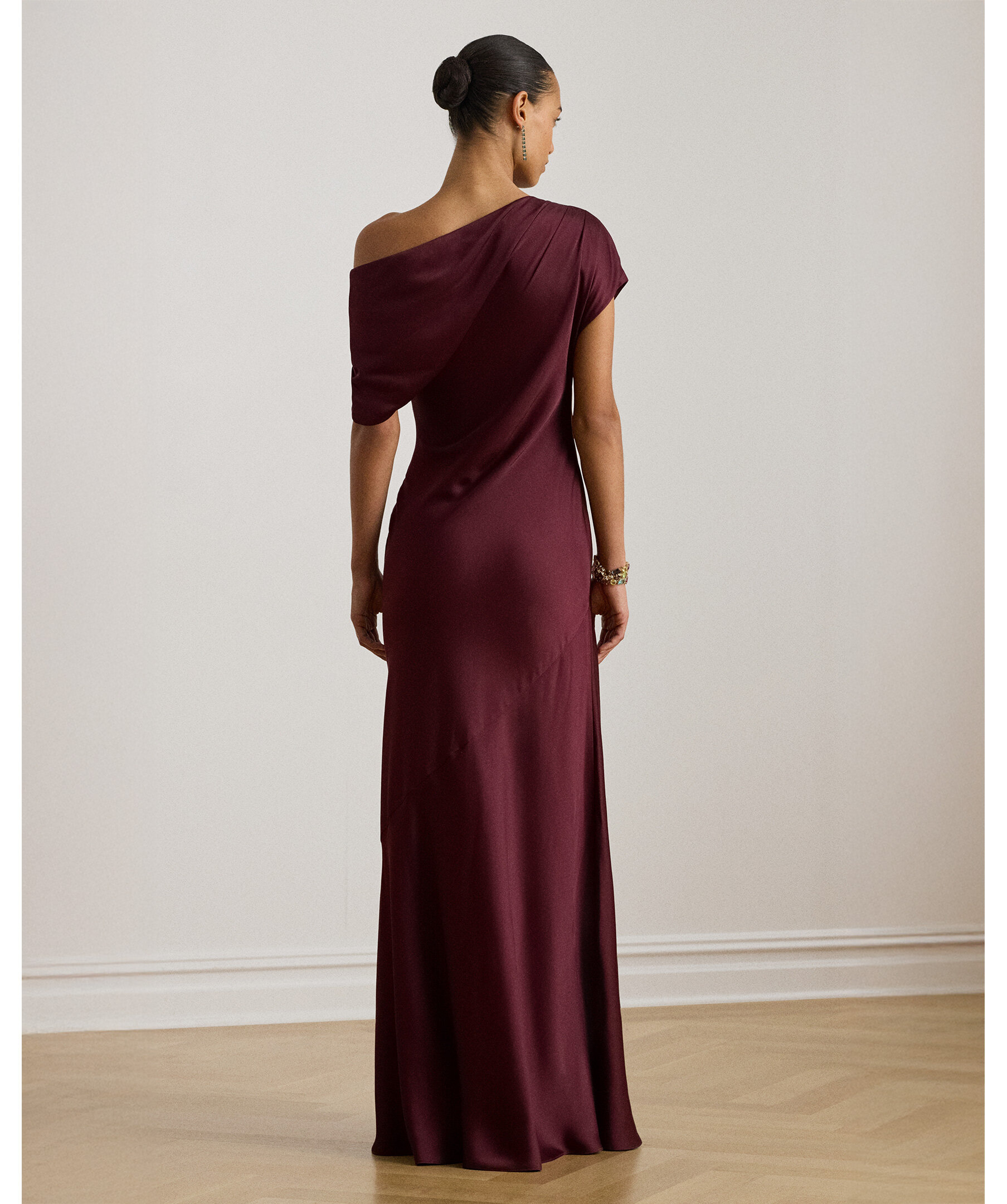 Elegant golvlång klänning från Ralph Lauren i satin‑charmeuse med asymmetrisk off‑shoulder‑ringning som framhäver axlarna. Klänningen har en elegant, figurnära silhuett och ett vackert fall med subtil glans för festens finare tillfällen.