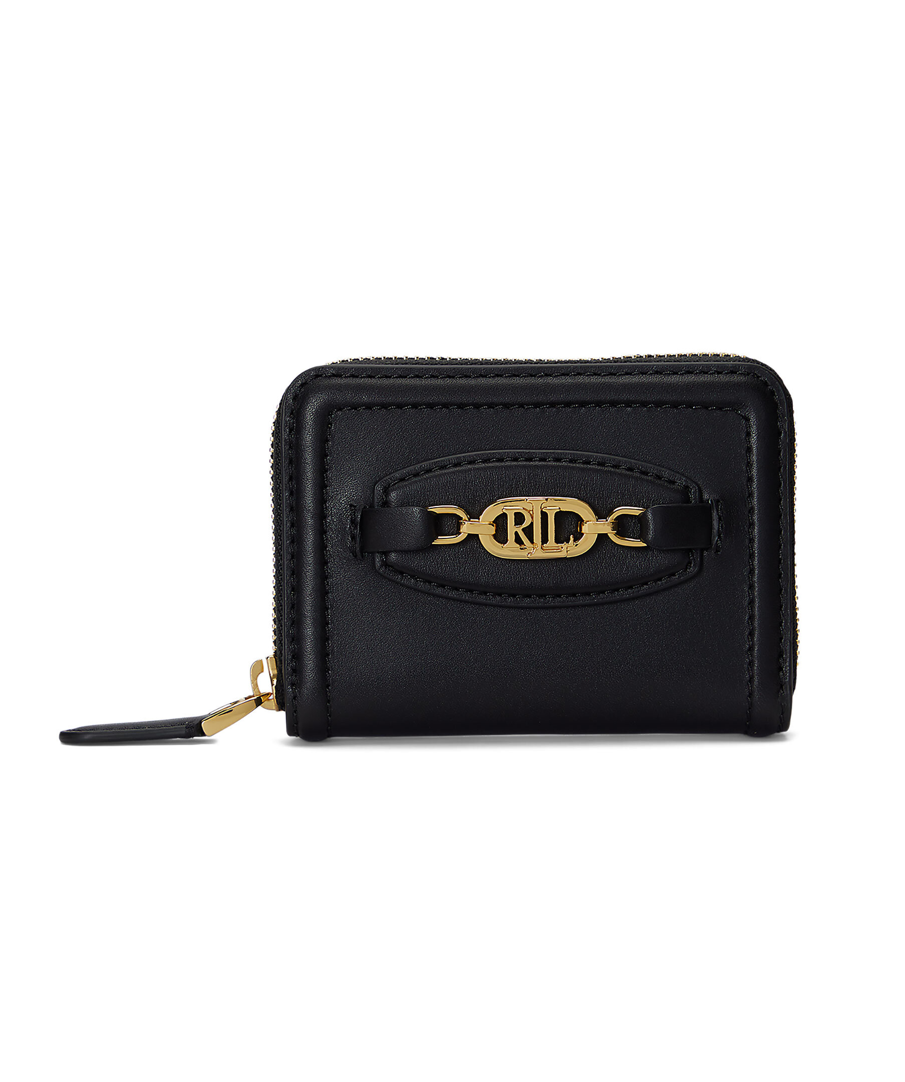 Svart plånbok i läder från Lauren Ralph Lauren. Huvudfacket stängs med dragkedja, fack för mynt med dragkedja. Guldfärgade detaljer i metall. Logotyp framtill. Plånbokens mått: B 12 x H 9.