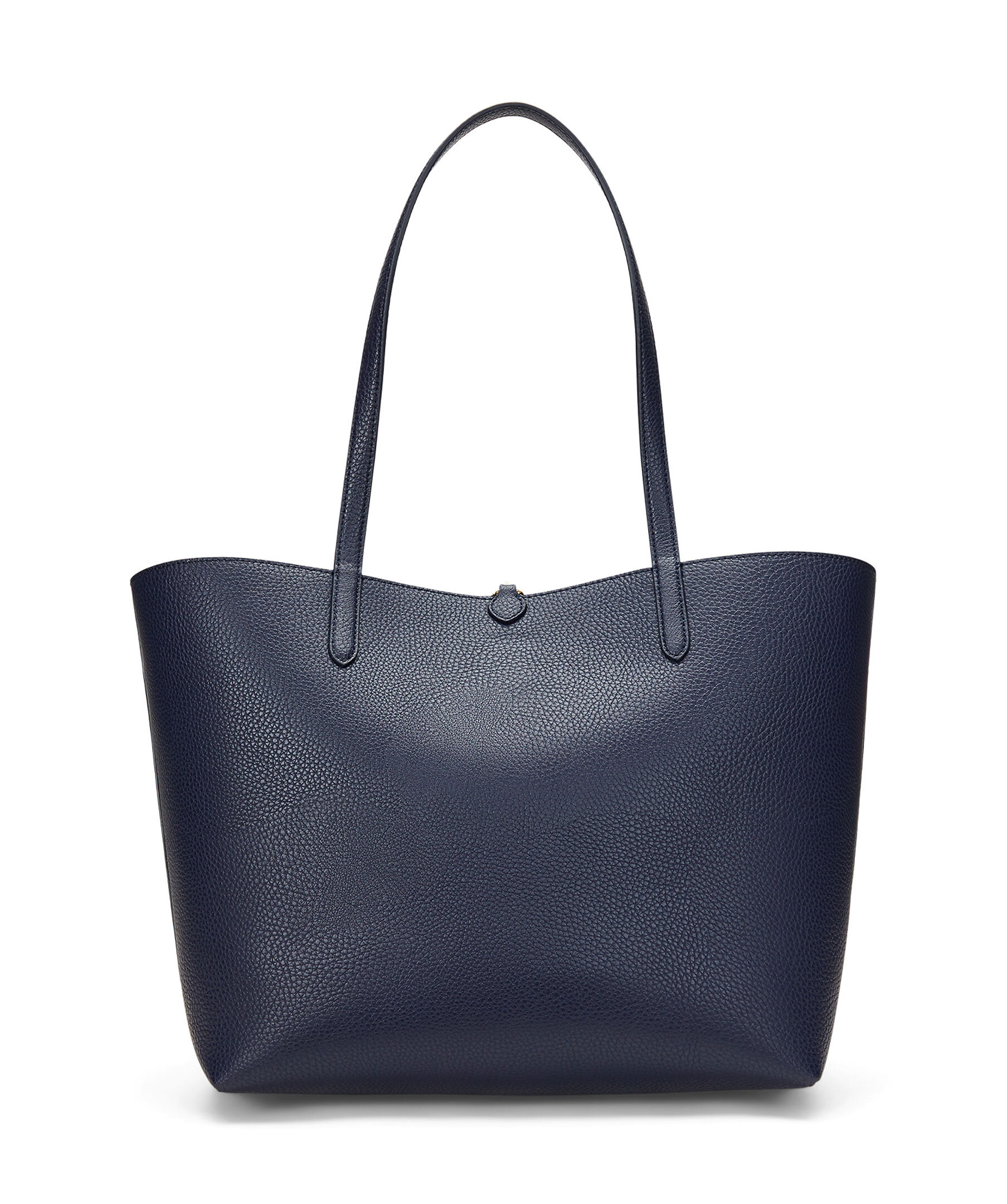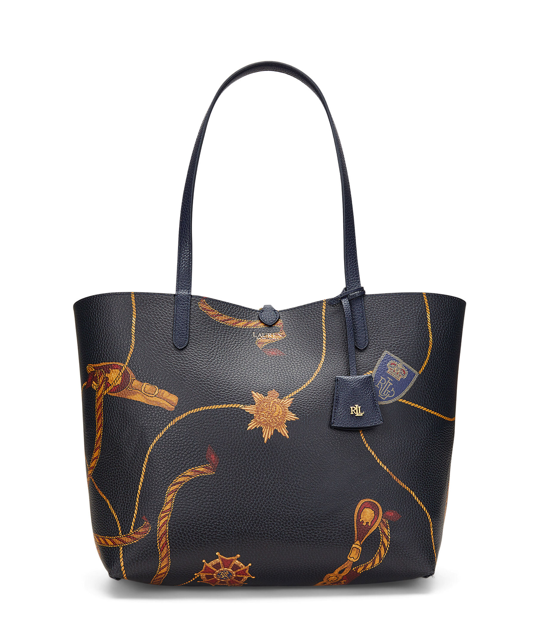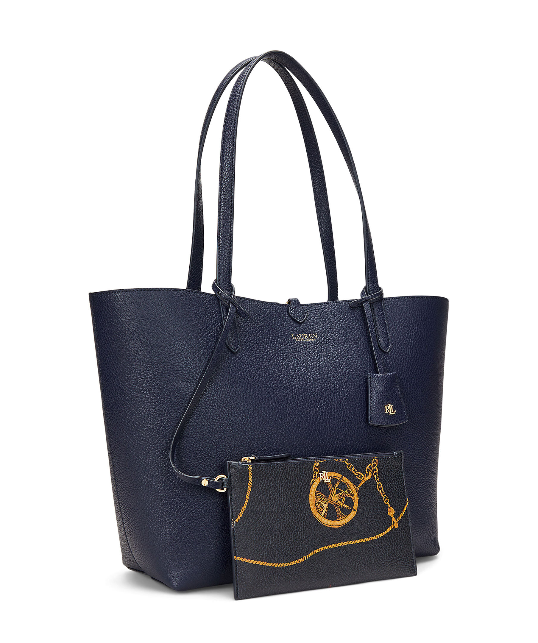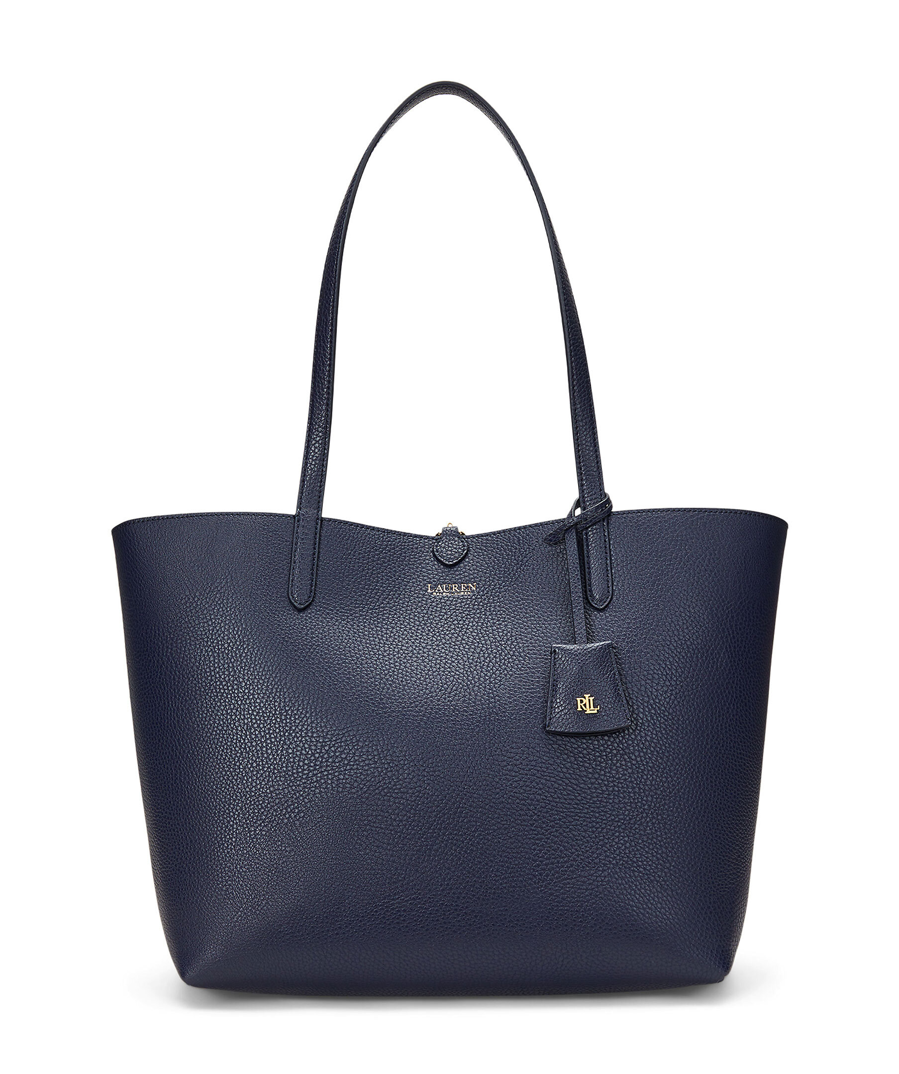 Mörkblå väska från Lauren Ralph Lauren. En elegant och praktisk väska som kan vändas för att variera mellan en enfärgad sida och en mönstrad sida, vilket gör den mångsidig och användbar för olika tillfällen. Grain-textur som ger ett sofistikerat utseende. Dubbla handtag, en avtagbar innerväska med dragkedja för extra förvaring, och logotyp. Mått: 32/43 x 29 x 13 cm.