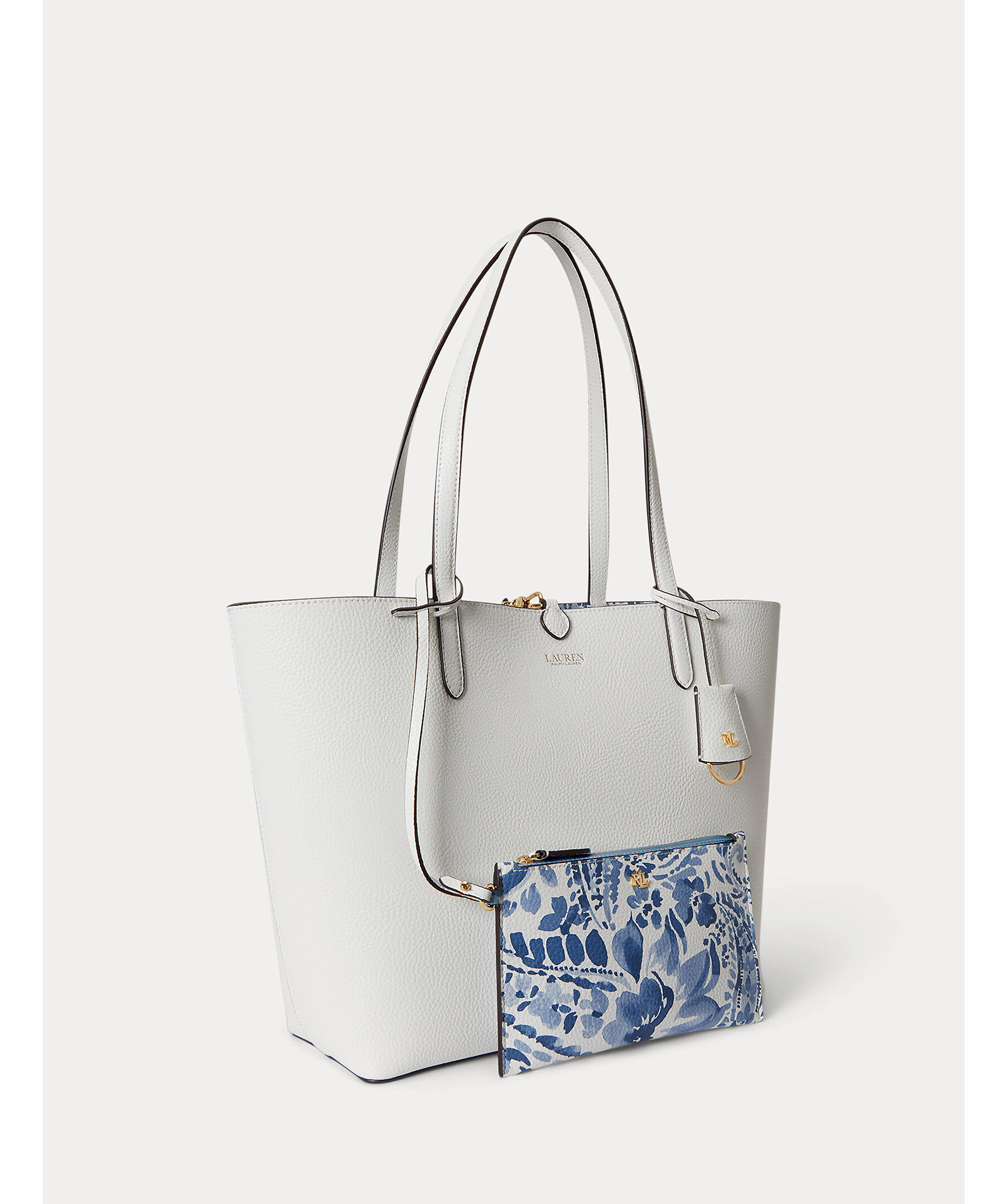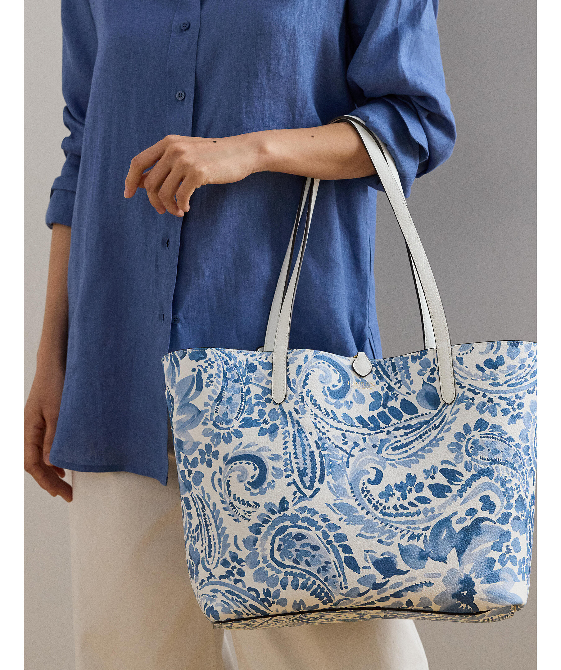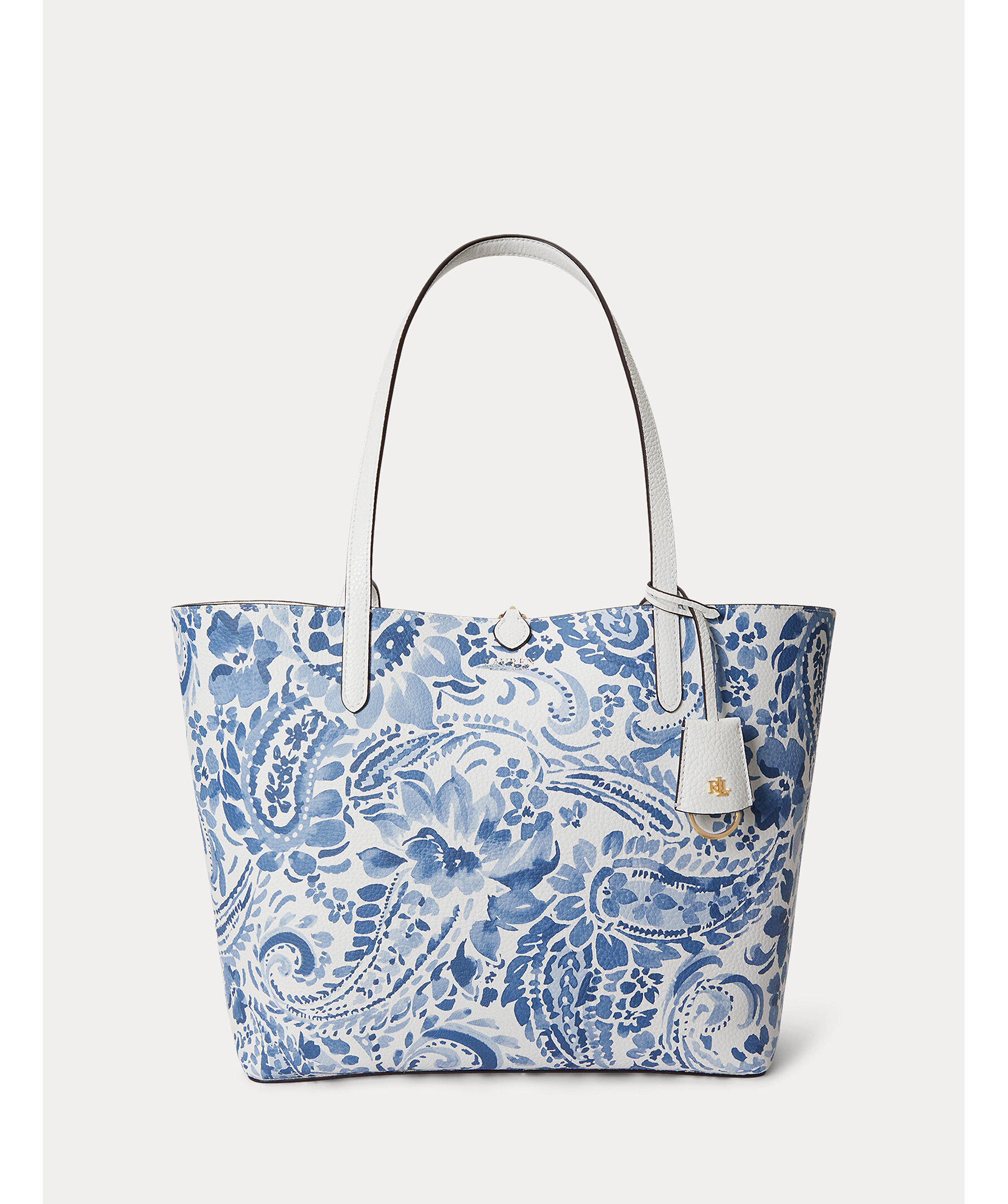 Väska från Lauren Ralph Lauren. En elegant och praktisk väska som kan vändas för att variera mellan en enfärgad sida och en mönstrad sida, vilket gör den mångsidig och användbar för olika tillfällen. Grain-textur som ger ett sofistikerat utseende. Dubbla handtag, en avtagbar innerväska med dragkedja för extra förvaring, och logotyp. Mått: 32/43 x 29 x 13 cm.