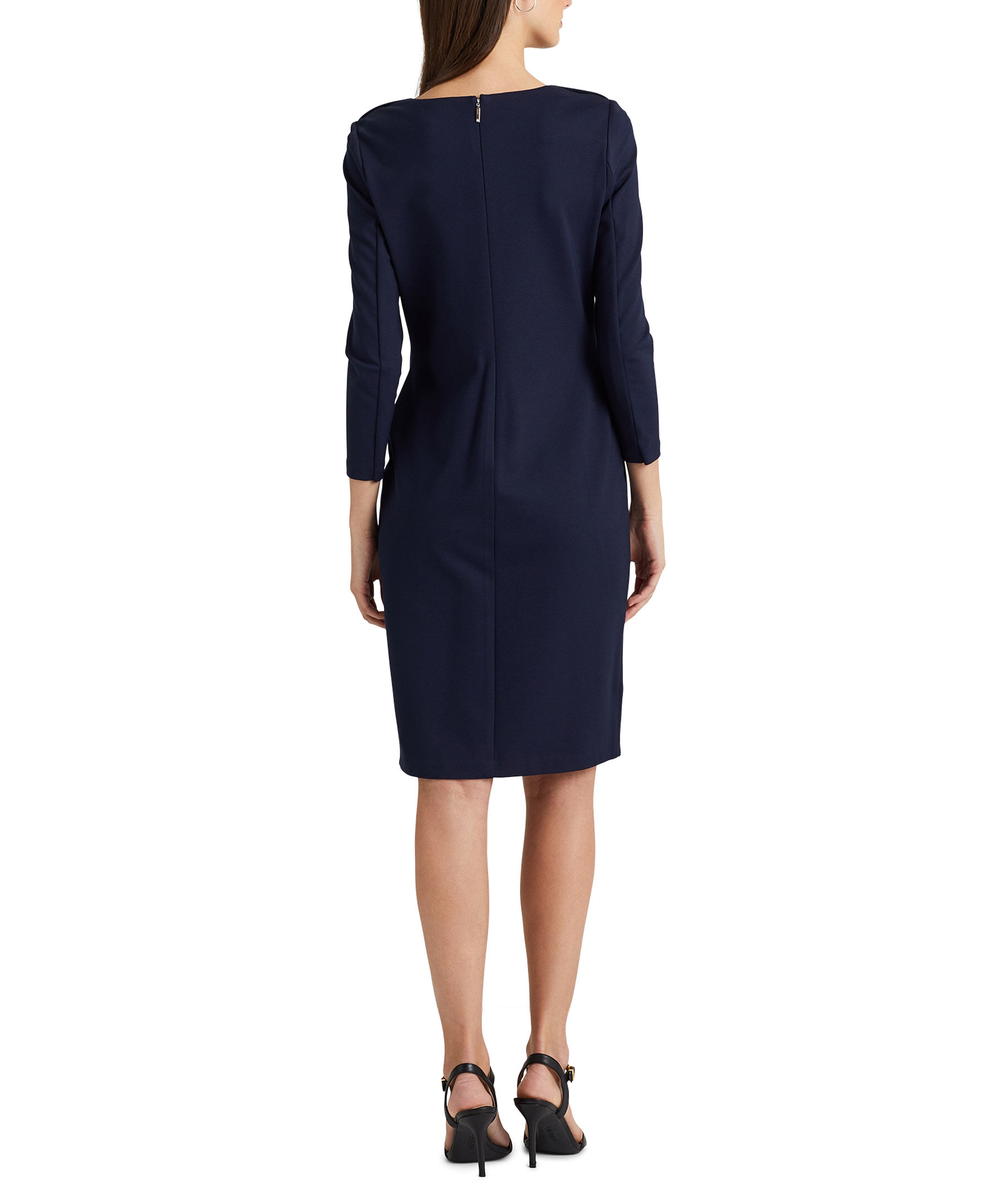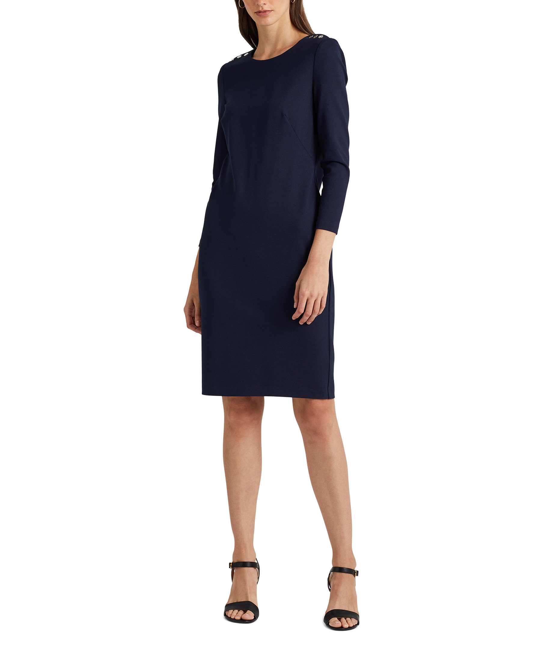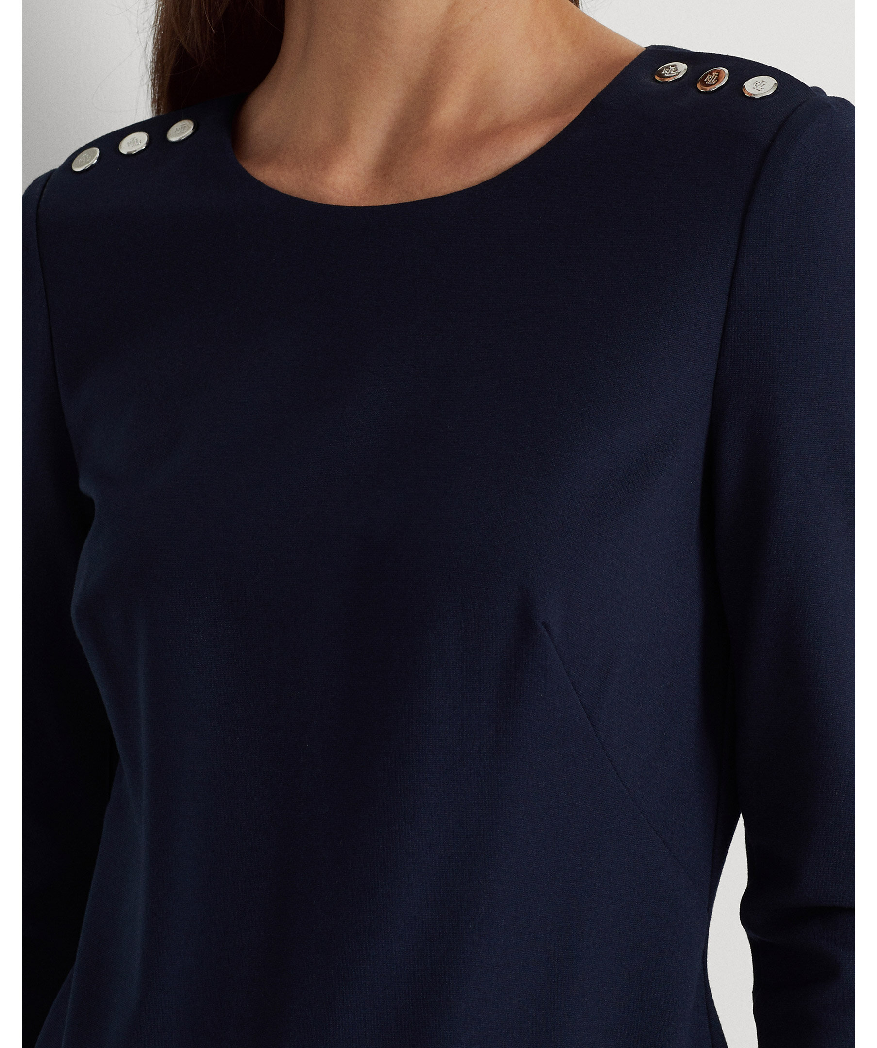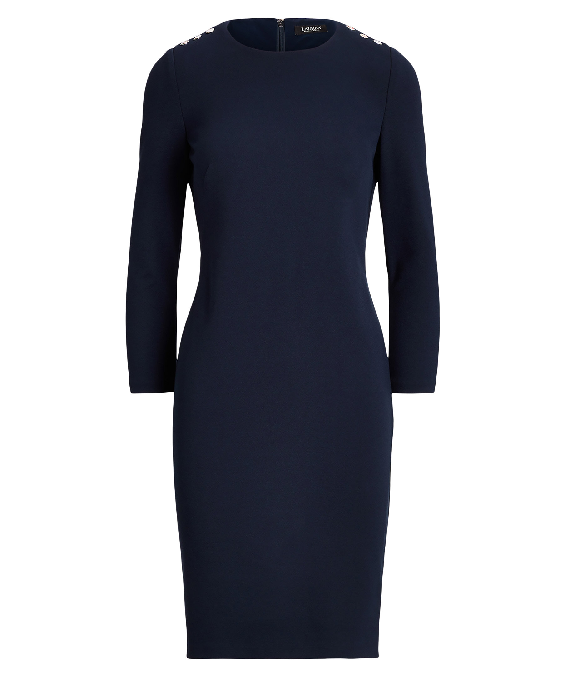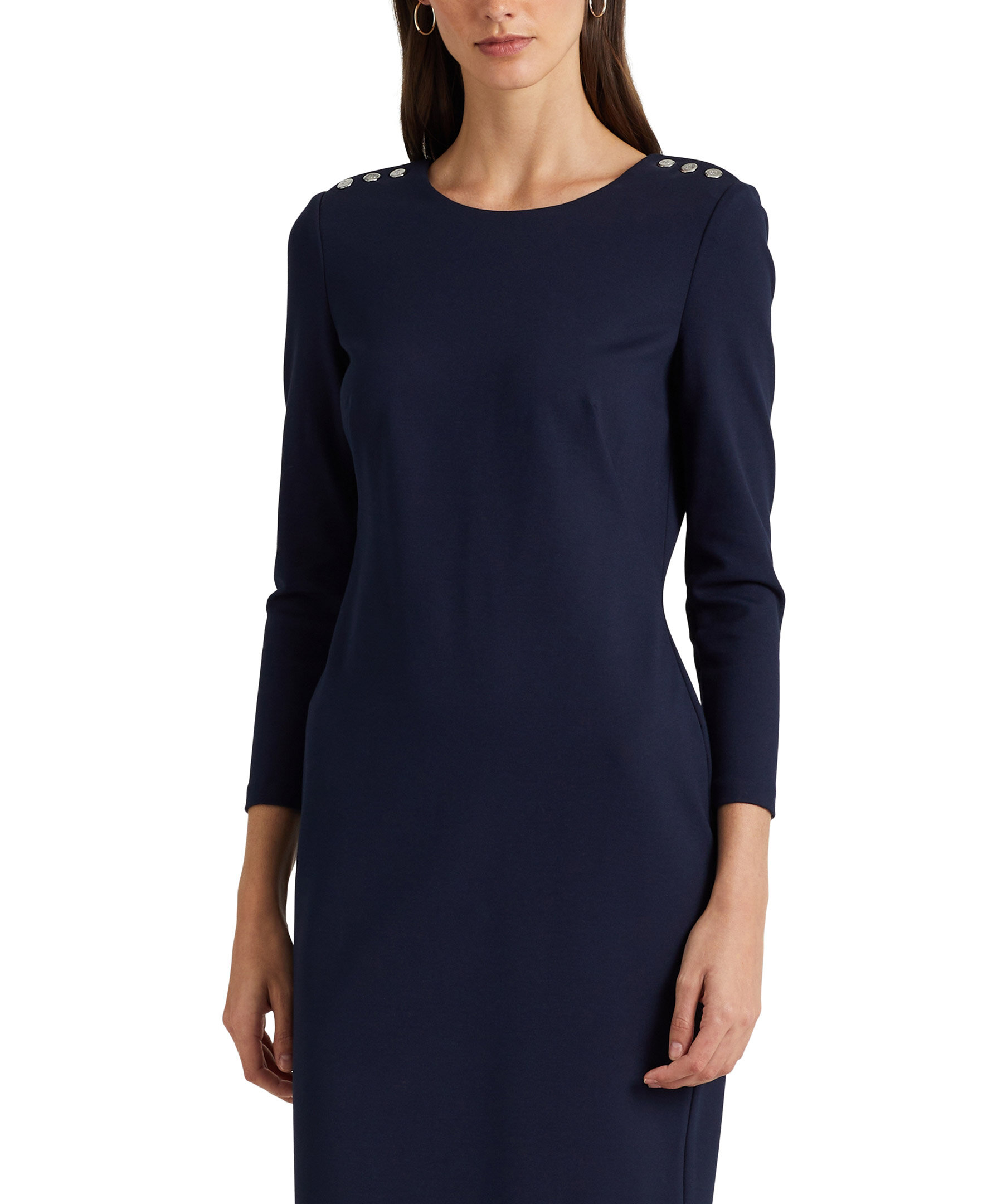 Marinblå, elegant klänning med långa ärmar från Lauren Ralph Lauren. Skuren för en kroppsnära passform och är prydd med tre "LRL"-graverade snäpputsmyckningar på varje axel. Avsedd att slå i knät. Rundad halsringning, dold dragkedja mitt bak med hake-och-ögon-stängning. Trekvartslånga ärmar, bystpilar och helfodrad förutom ärmarna. Modellen är 178 cm och bär en storlek 34.