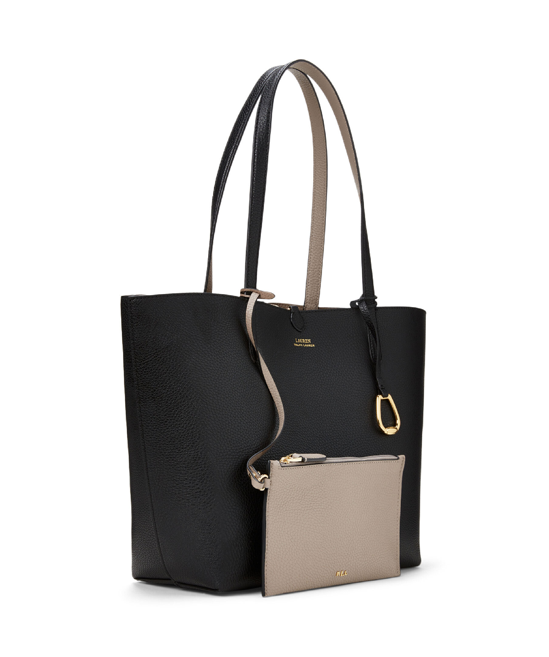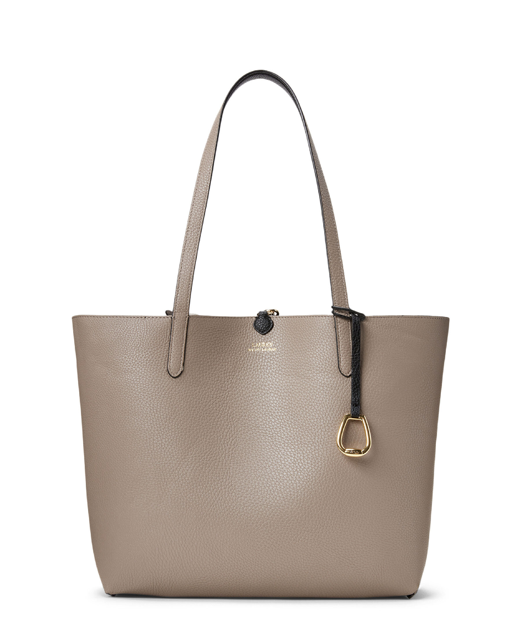 Svart och beige väska från Lauren Ralph Lauren. En elegant och praktisk väska som kan vändas för att variera mellan två olika färger, vilket gör den mångsidig och användbar för olika tillfällen. Grain-textur som ger ett sofistikerat utseende. Dubbla handtag, en avtagbar innerväska med dragkedja för extra förvaring, och logotyp. Mått: 32/43 x 29 x 13 cm.