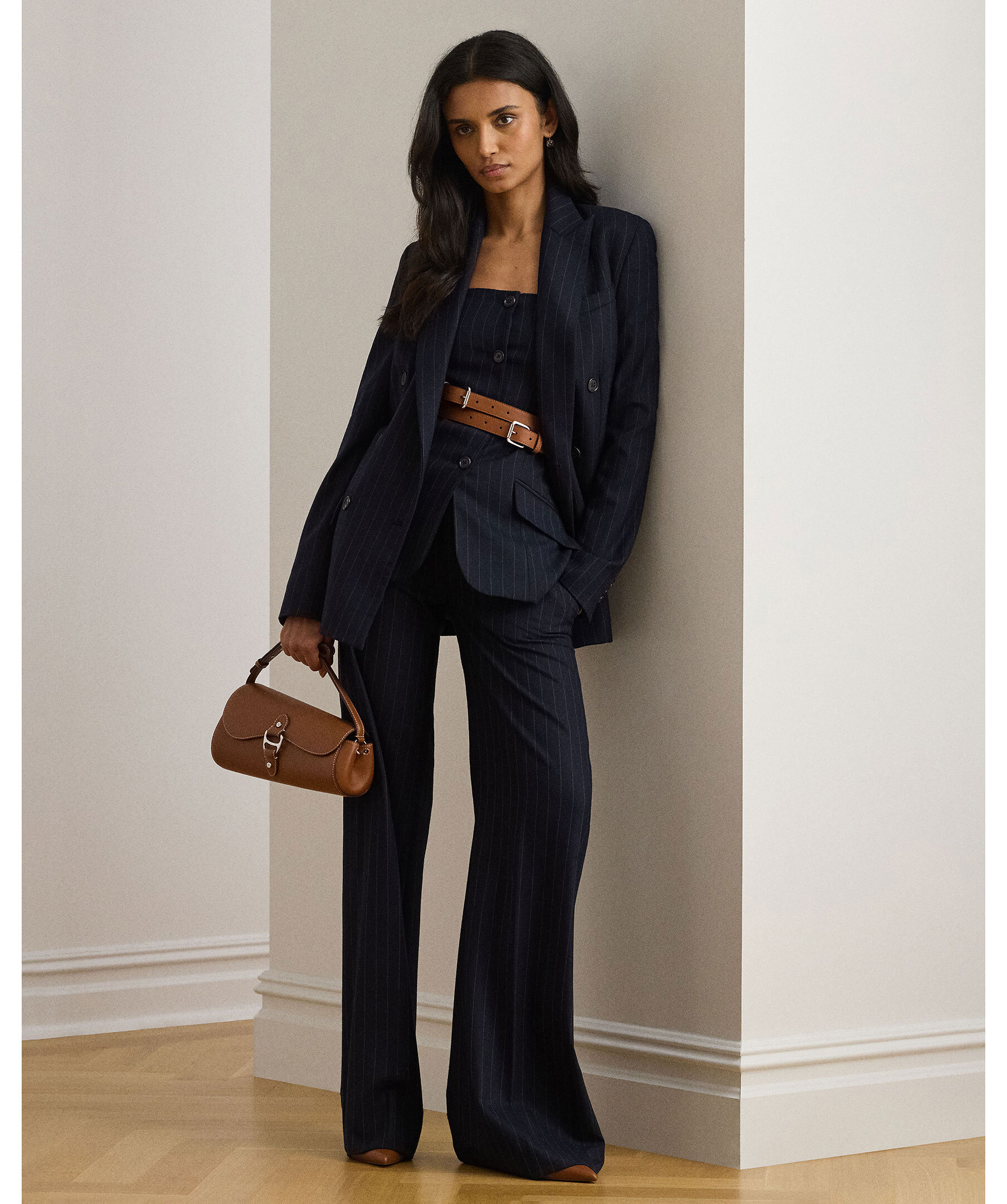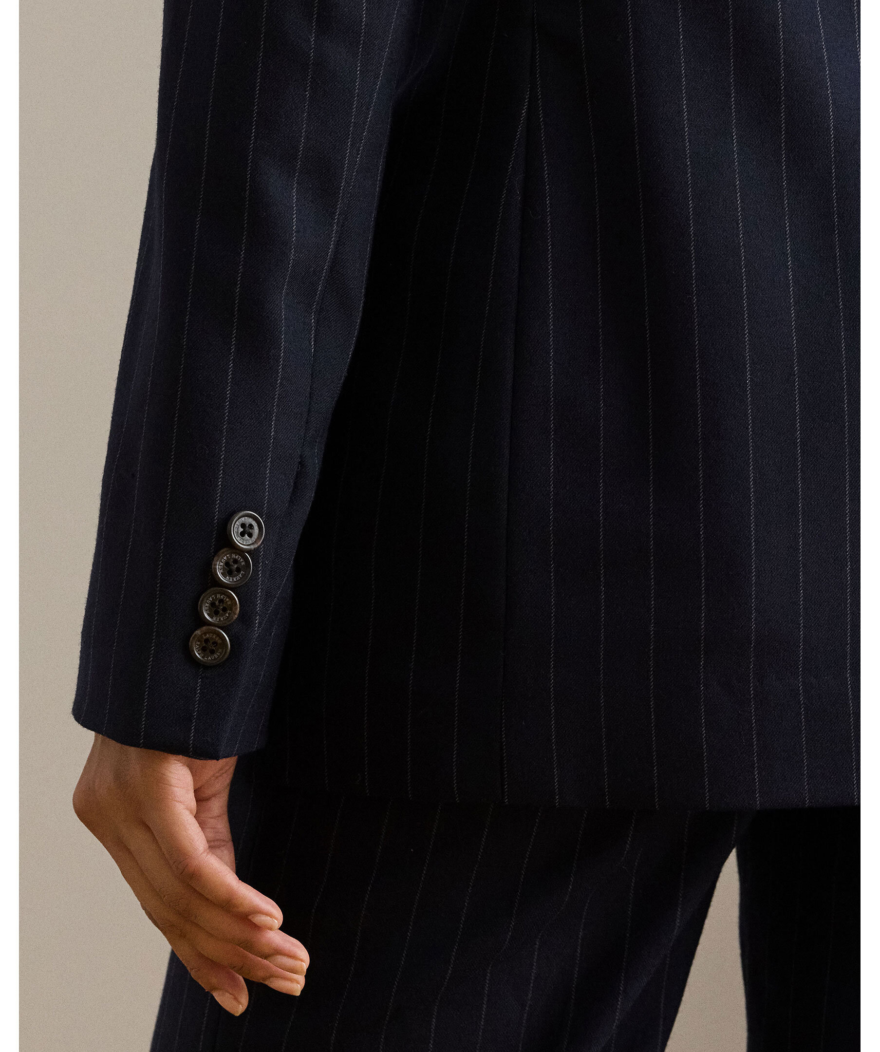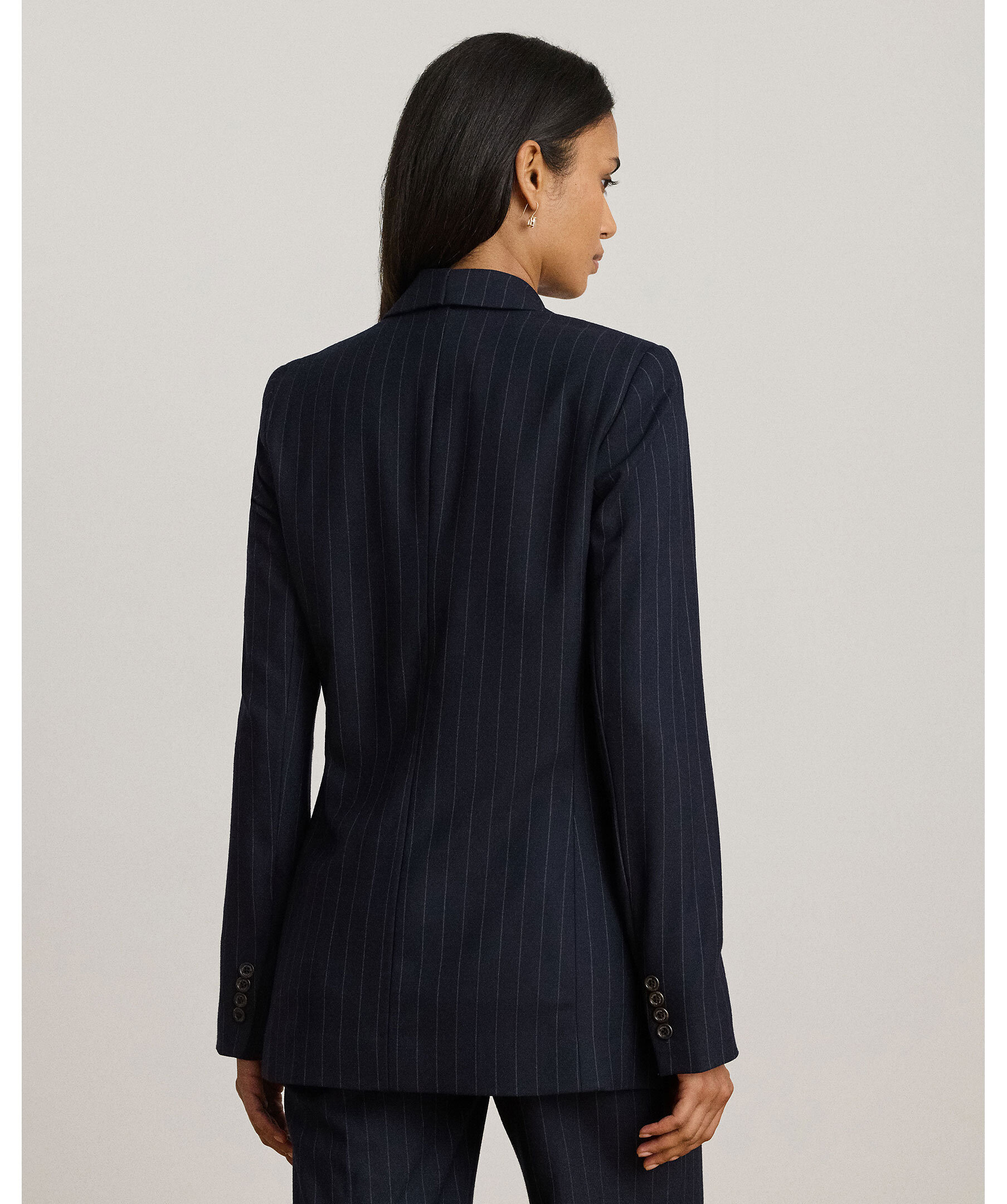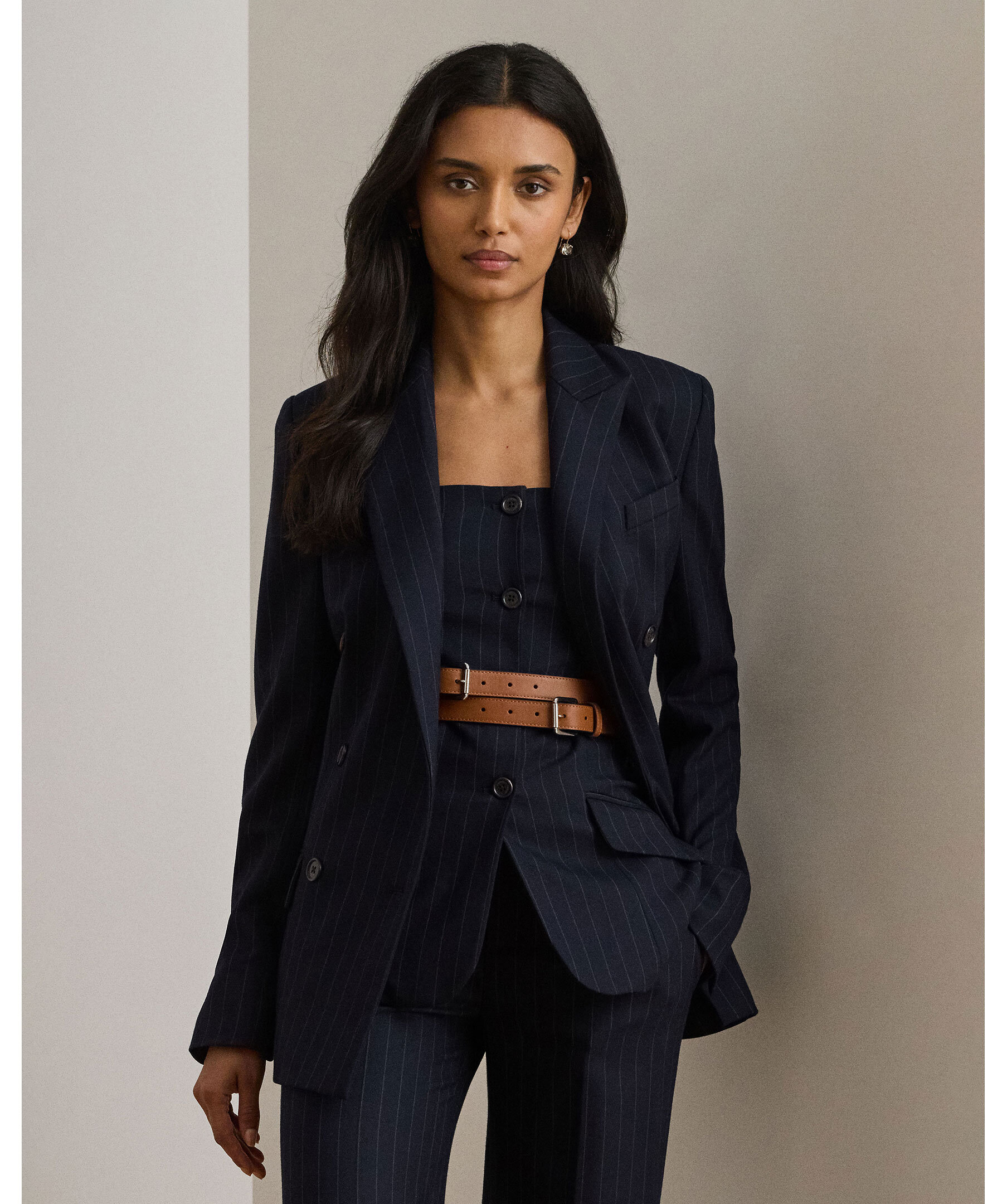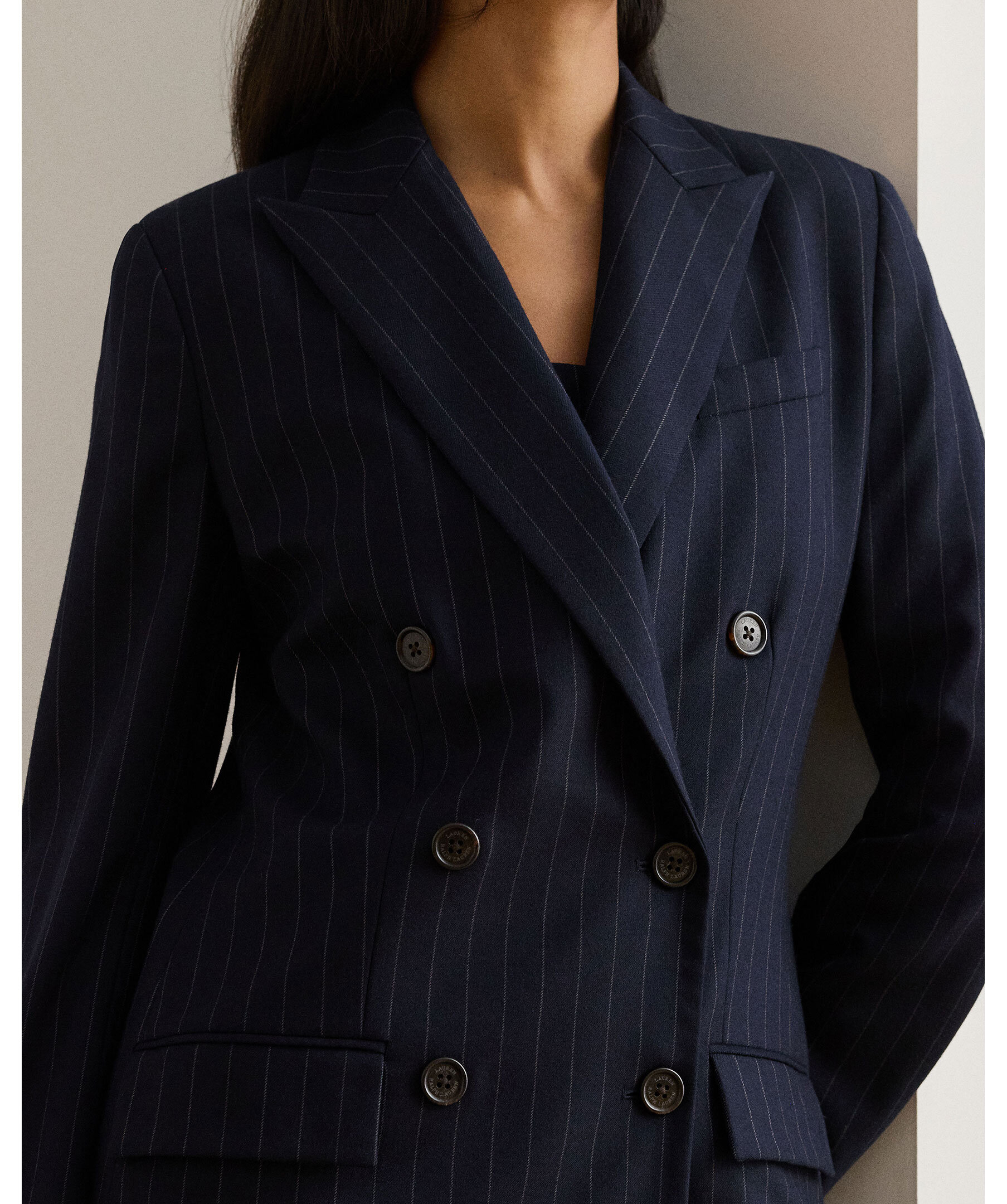 En sofistikerad dubbelknäppt kavaj i marinblått med smala kritstreck från Lauren Ralph Lauren. Kavjen är skräddad i en avslappnad passform som faller vid höften. Designad med spetsiga slag, signaturknappar i hornlook, axelvaddar och fickor fram. Hel fodrad för en elegant, strukturerad siluett.