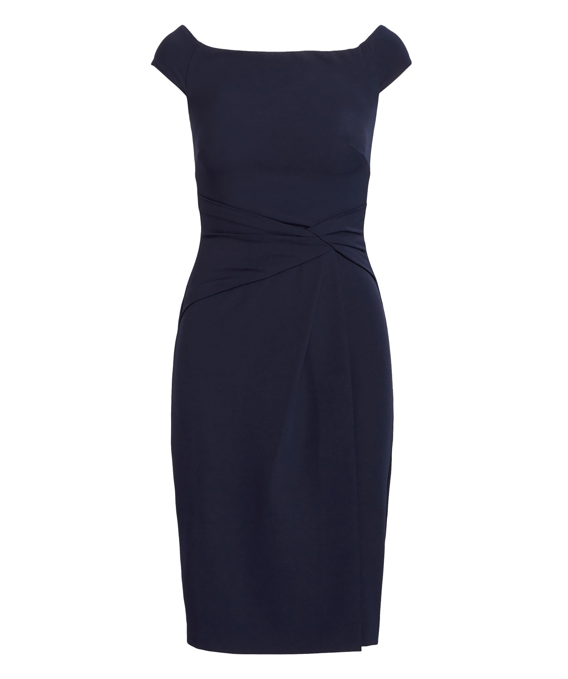 Marinblå cocktailklänning från Lauren Ralph Lauren. Tillverkad i en lyxig crepe och är designad med en elegant off-the-shoulder siluett och en chic twistdetalj i midjan. En slits i kjolen gör det lätt att röra sig. Slim fit och slutar vid knät. Dold dragkedja mitt bak med hake-och-ögon-stängning. Kepsärmar, vriddetalj i midjan samt helfodrad.