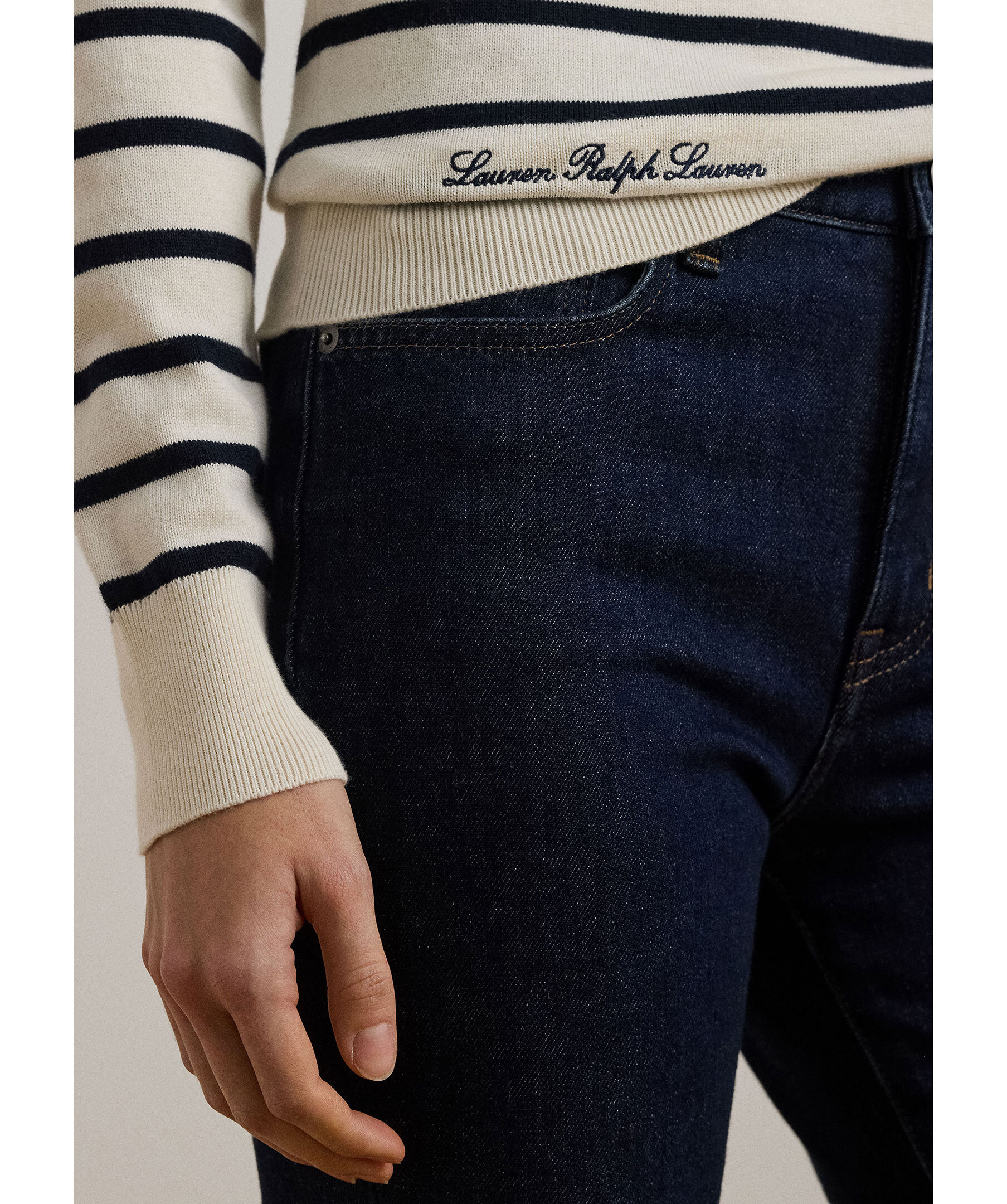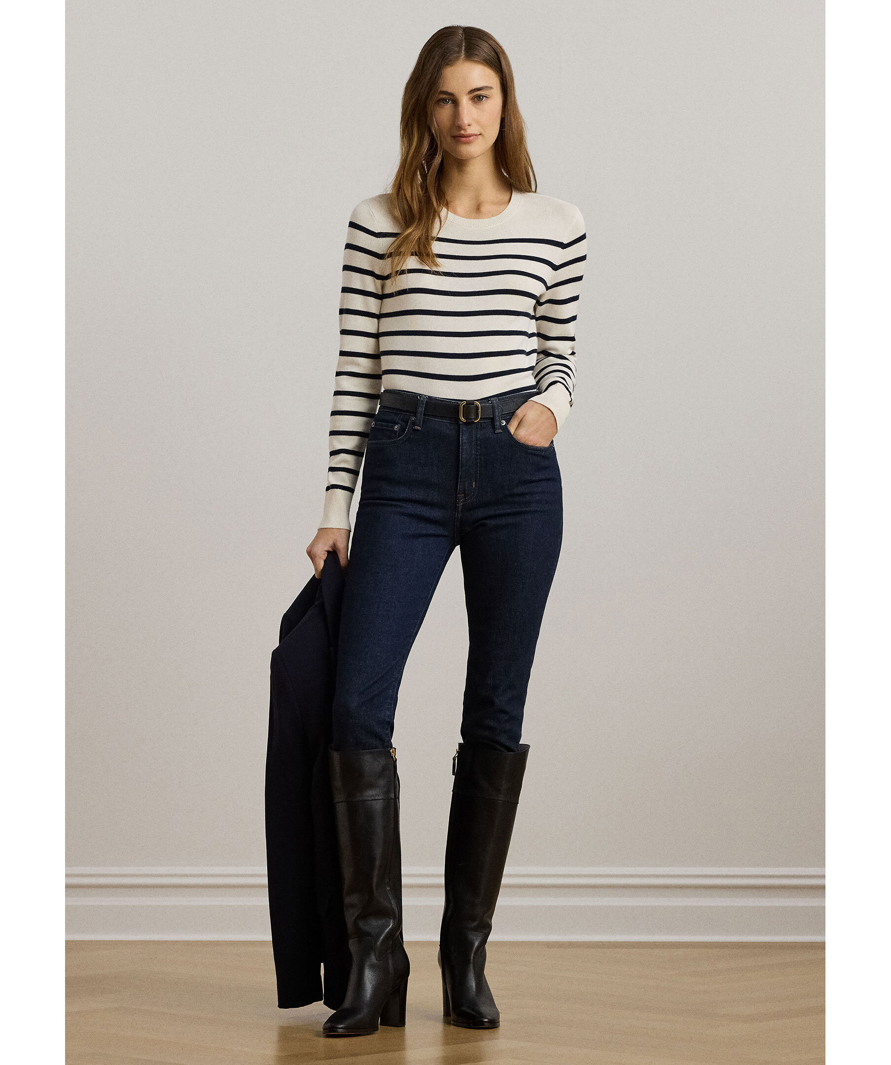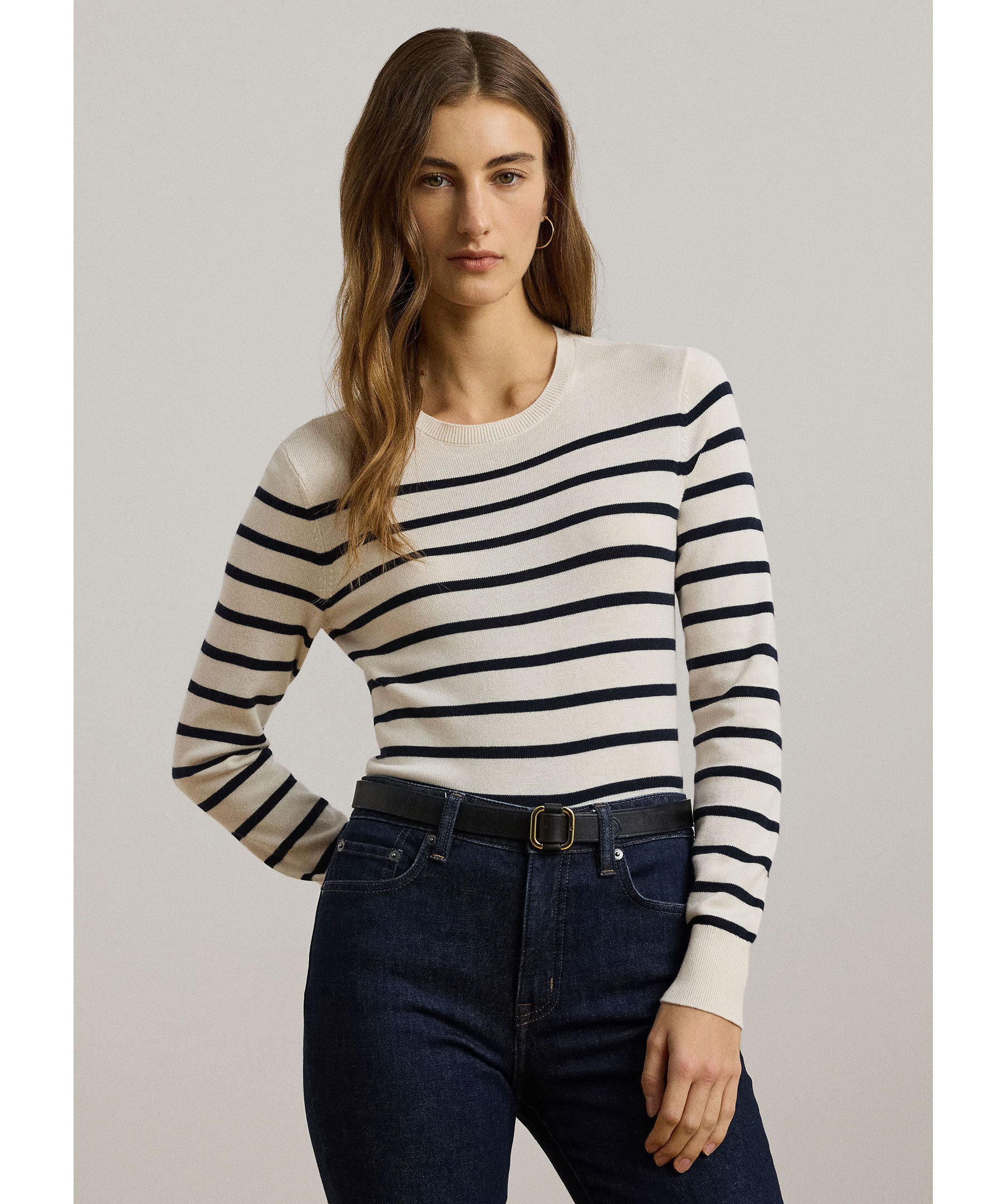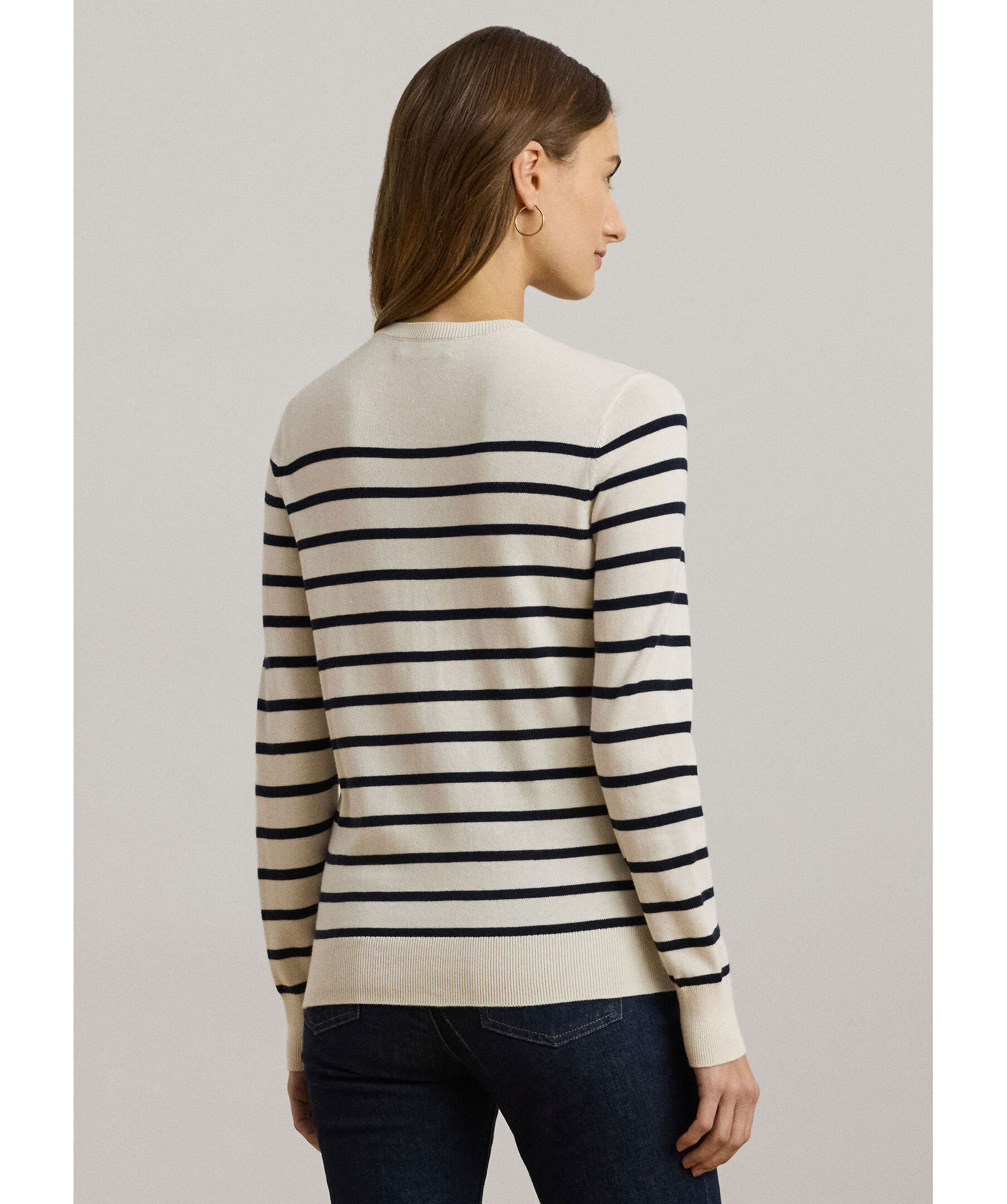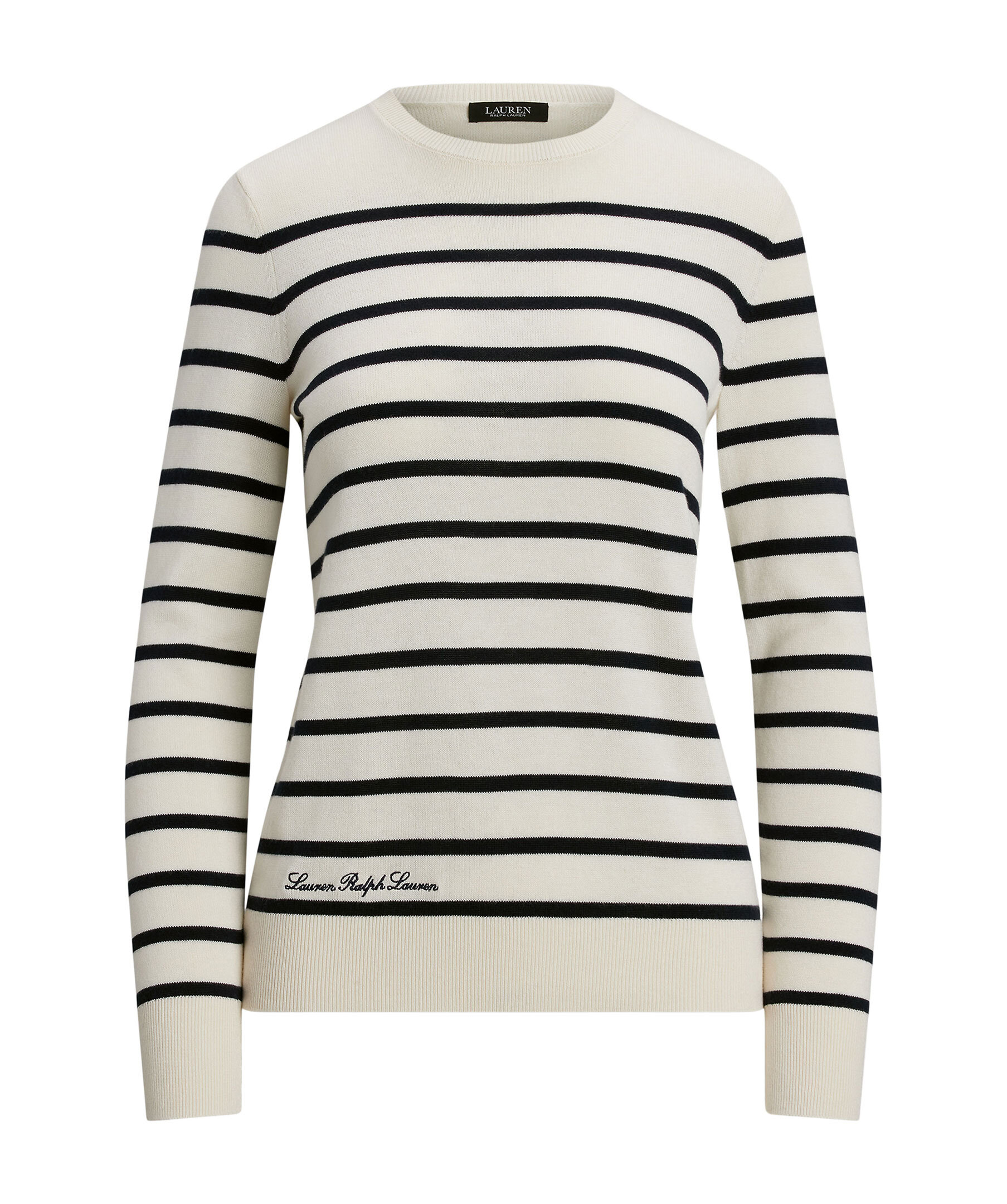 Vit långärmad tröja med blåa ränder från Lauren Ralph Lauren. Tröjan har ribbstickade avslut med mudd och en ribbstickad rund halsringning. Broderad logotyp vid tröjslut framtill på höger sida. Tillverkad av en bomulls blandning.