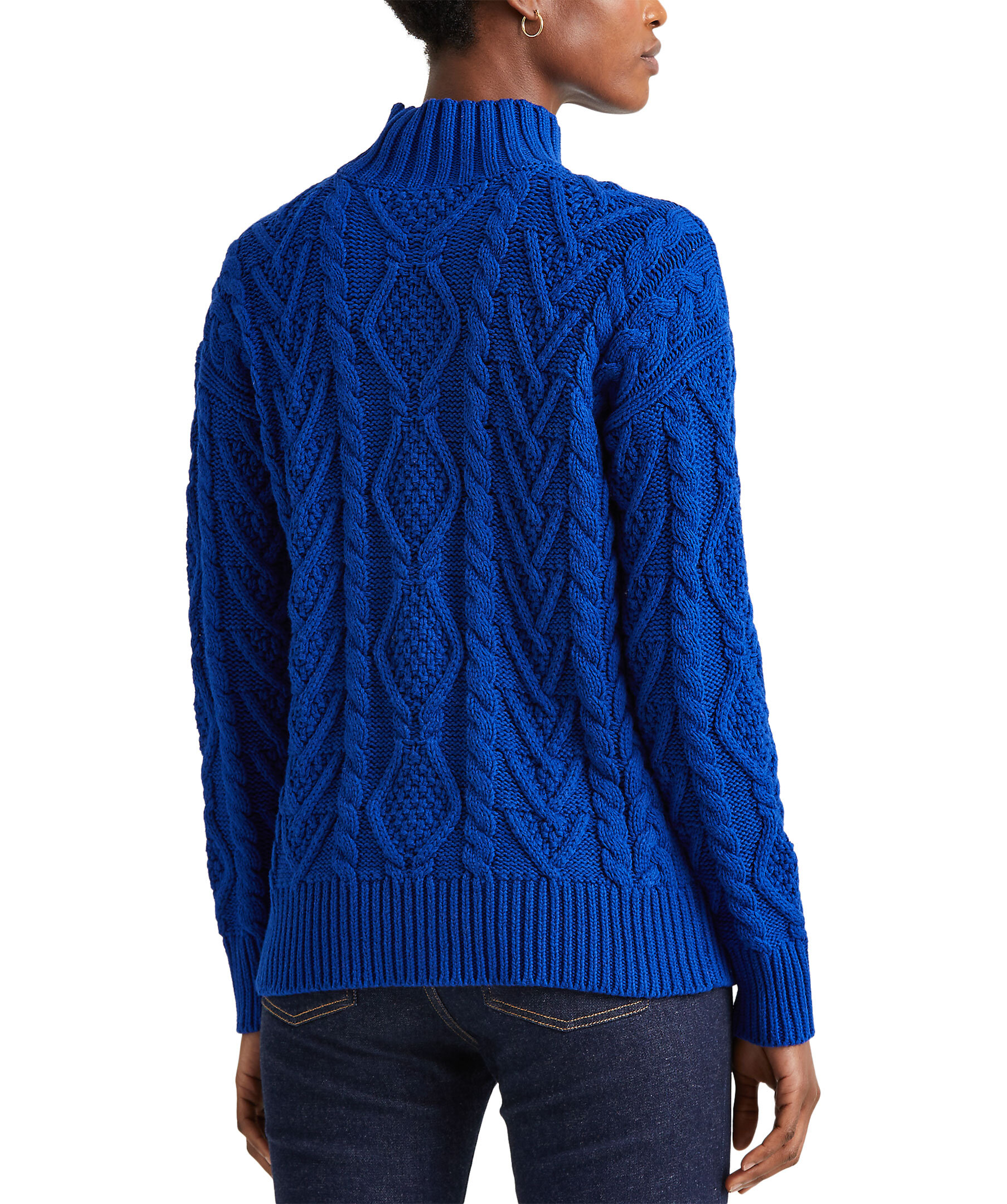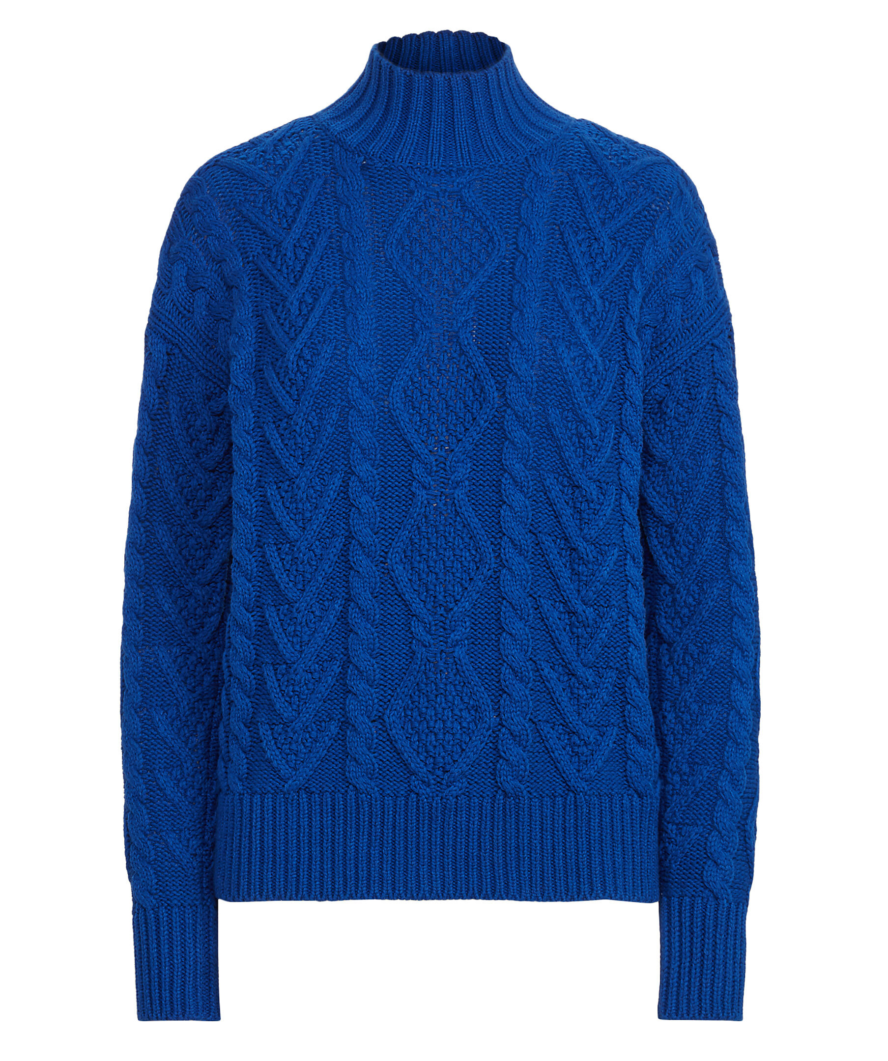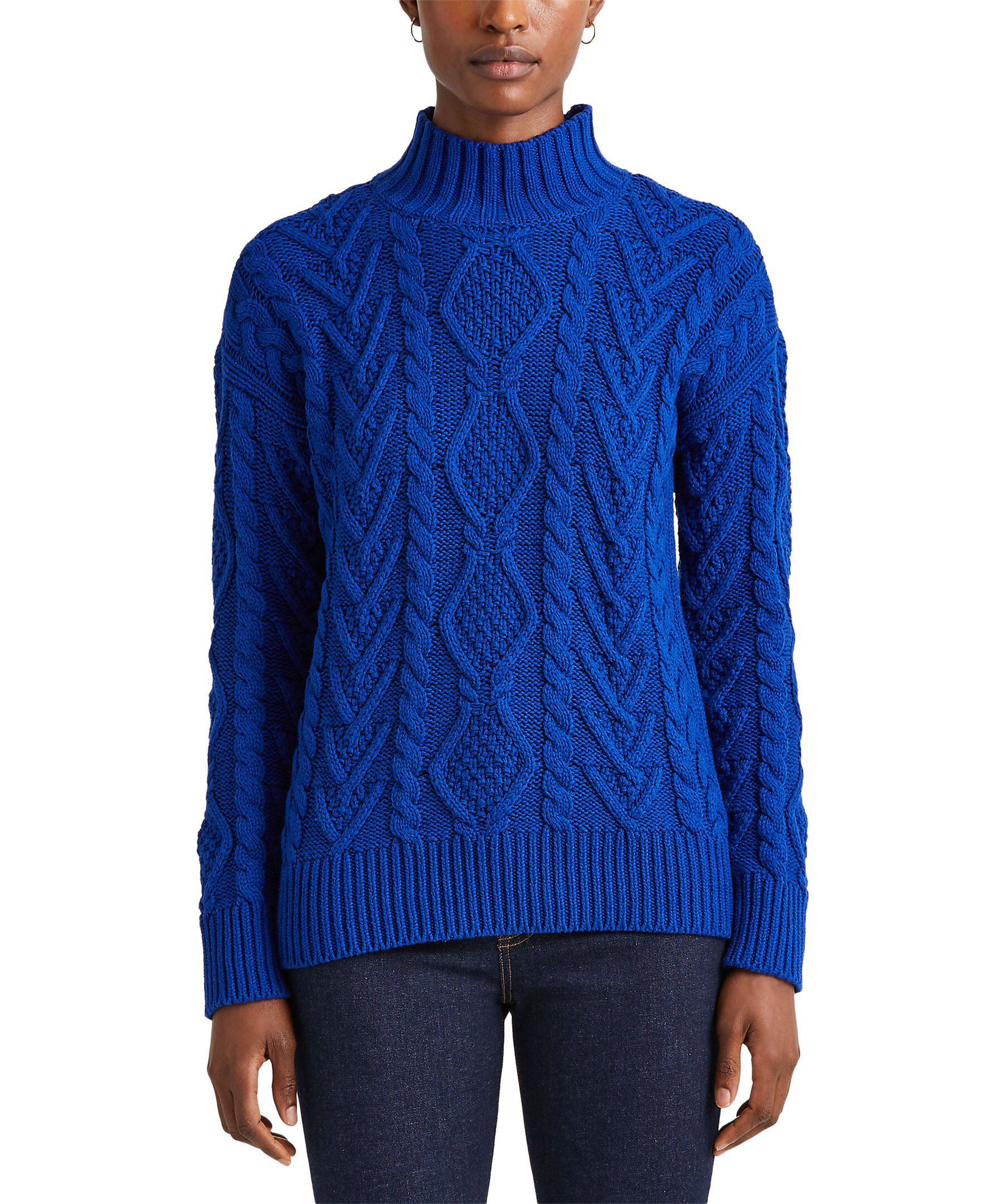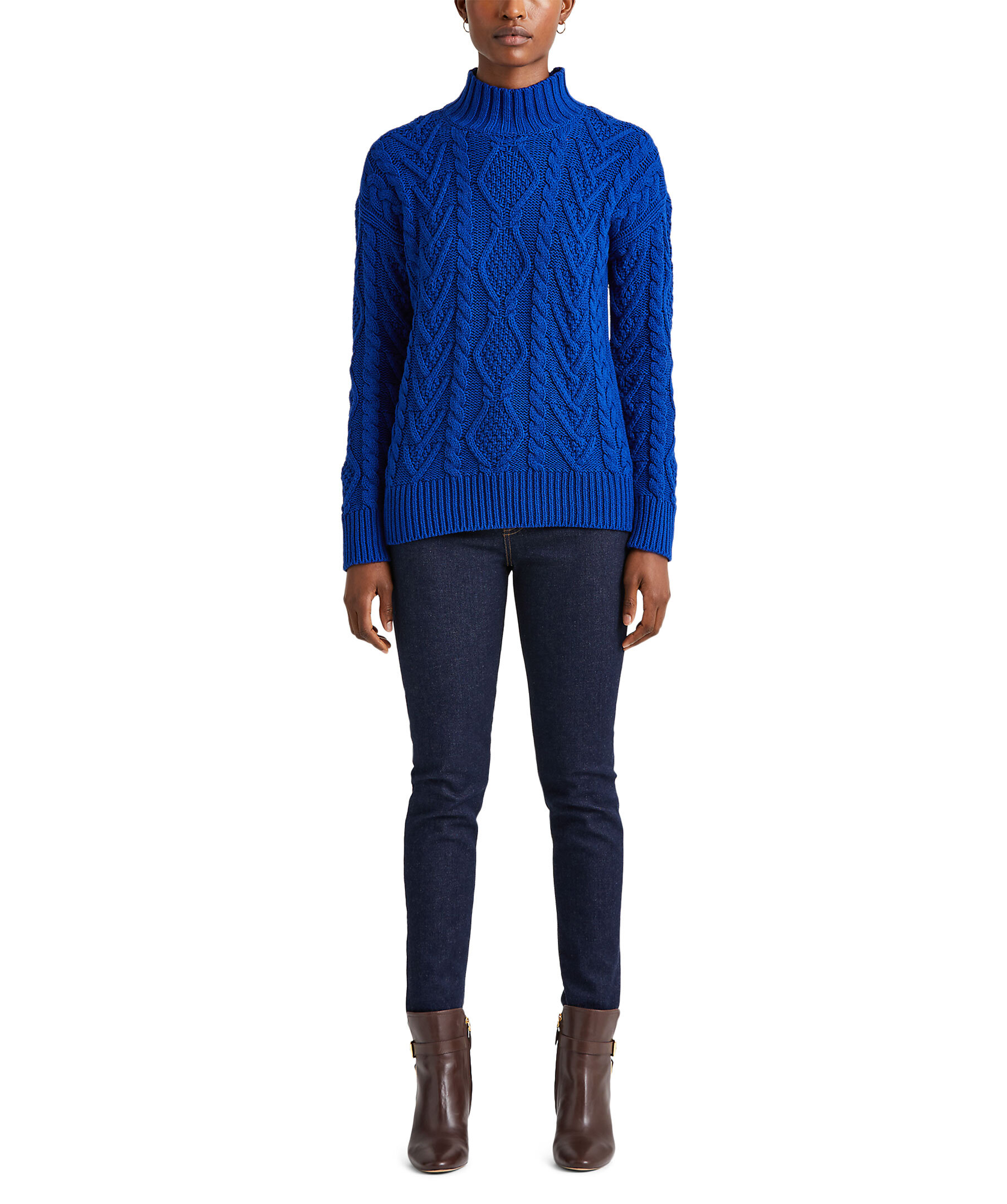 Kornblå kabelstickad tröja i bomullsmix från Lauren Ralph Lauren. Hög ribbstickad krage och muddar.