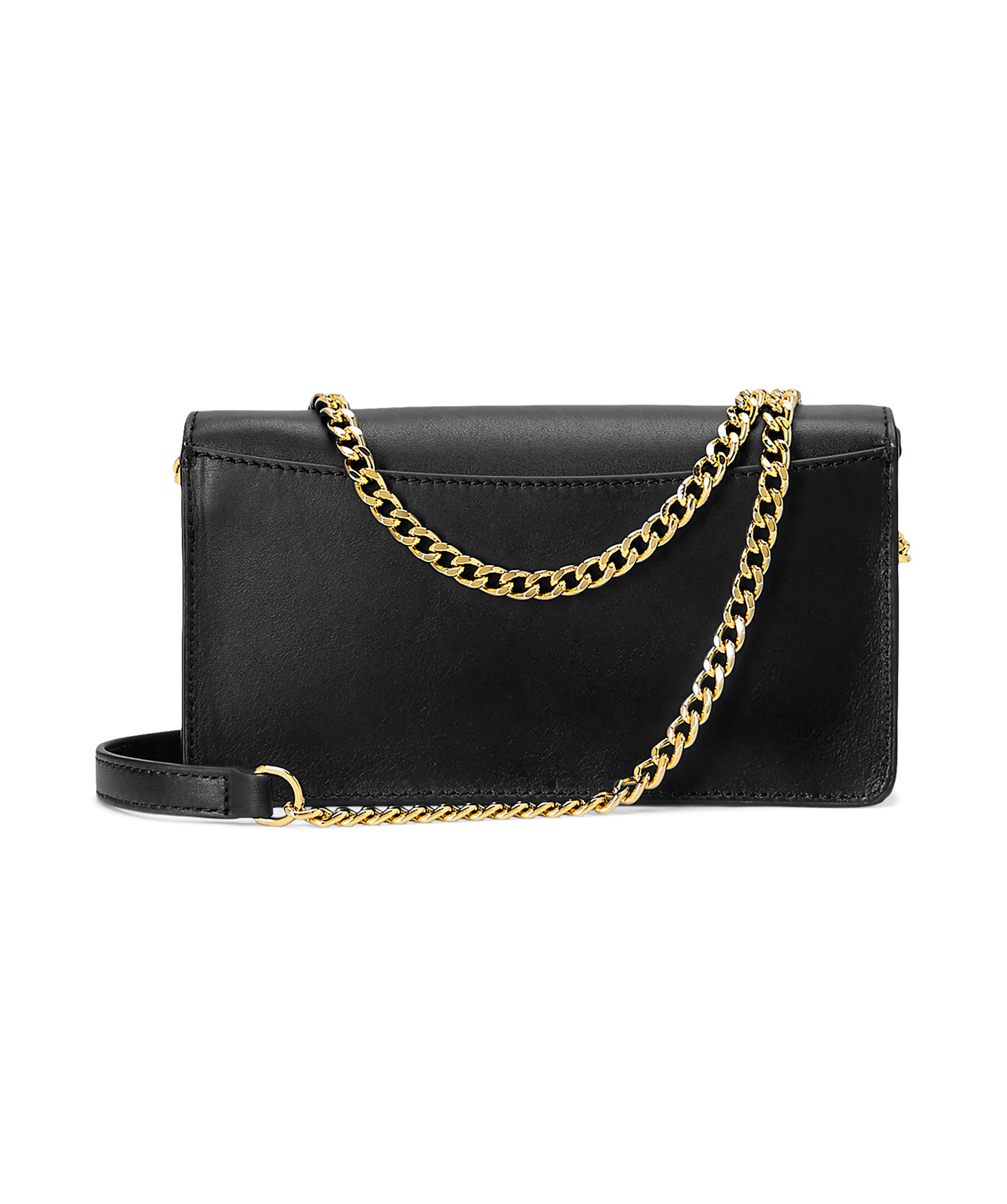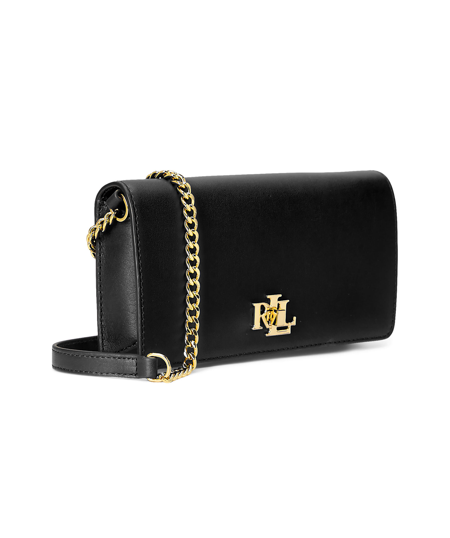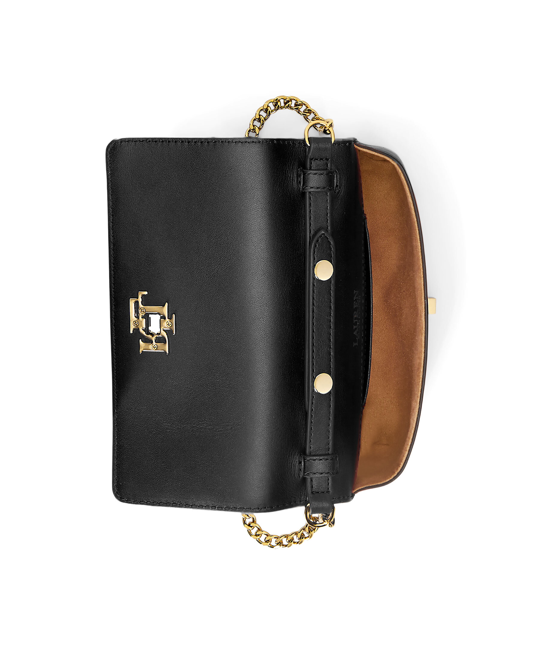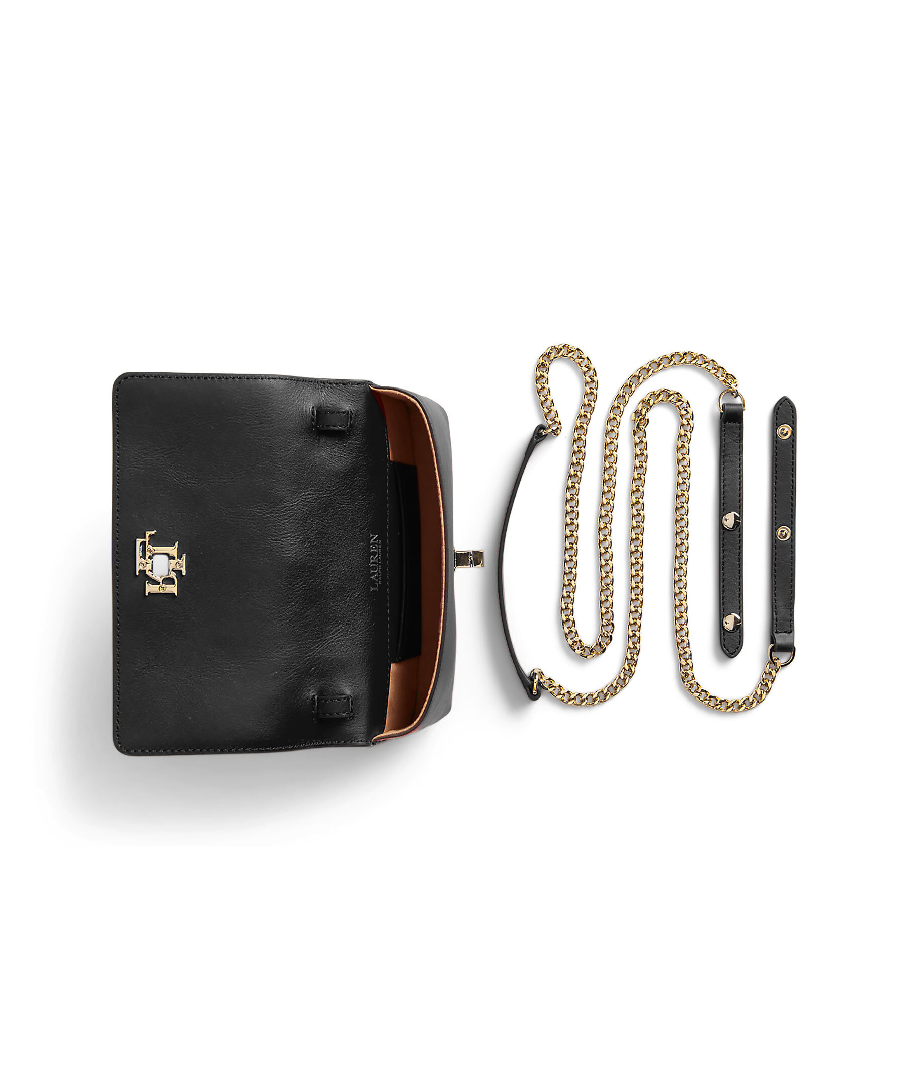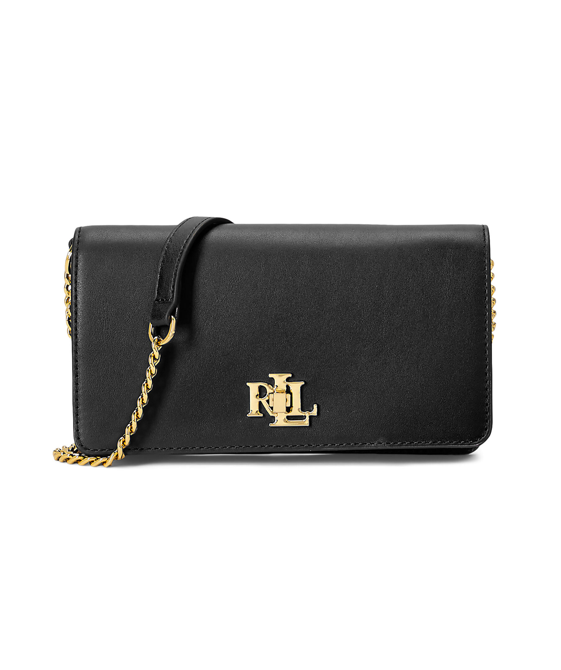 Svart liten handväska Lauren Ralph Lauren. Stängs med lock och guldfärgat lås med logotyp. Justerbar guldfärgad kedja som axelrem. Öppet ytterfack på baksidan. Väskans mått: H 8 x W 18 x D 3 cm.