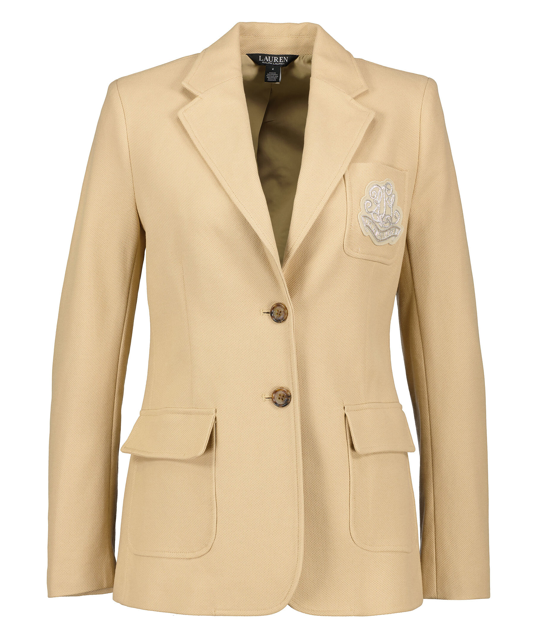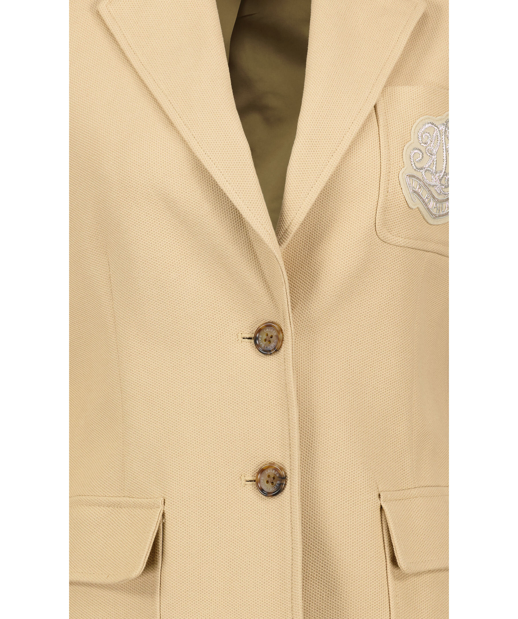 Beige kavaj i strukturerat tyg från Lauren Ralph Lauren. Bröstficka på vänster sida med broderad logotyp. Två fickor med lock. Enkel knäppning. Sprund baktill. Reversekrage. Diskreta axelvaddar. Knappar vid ärmslut. Tillverkad i bomullsblandning.