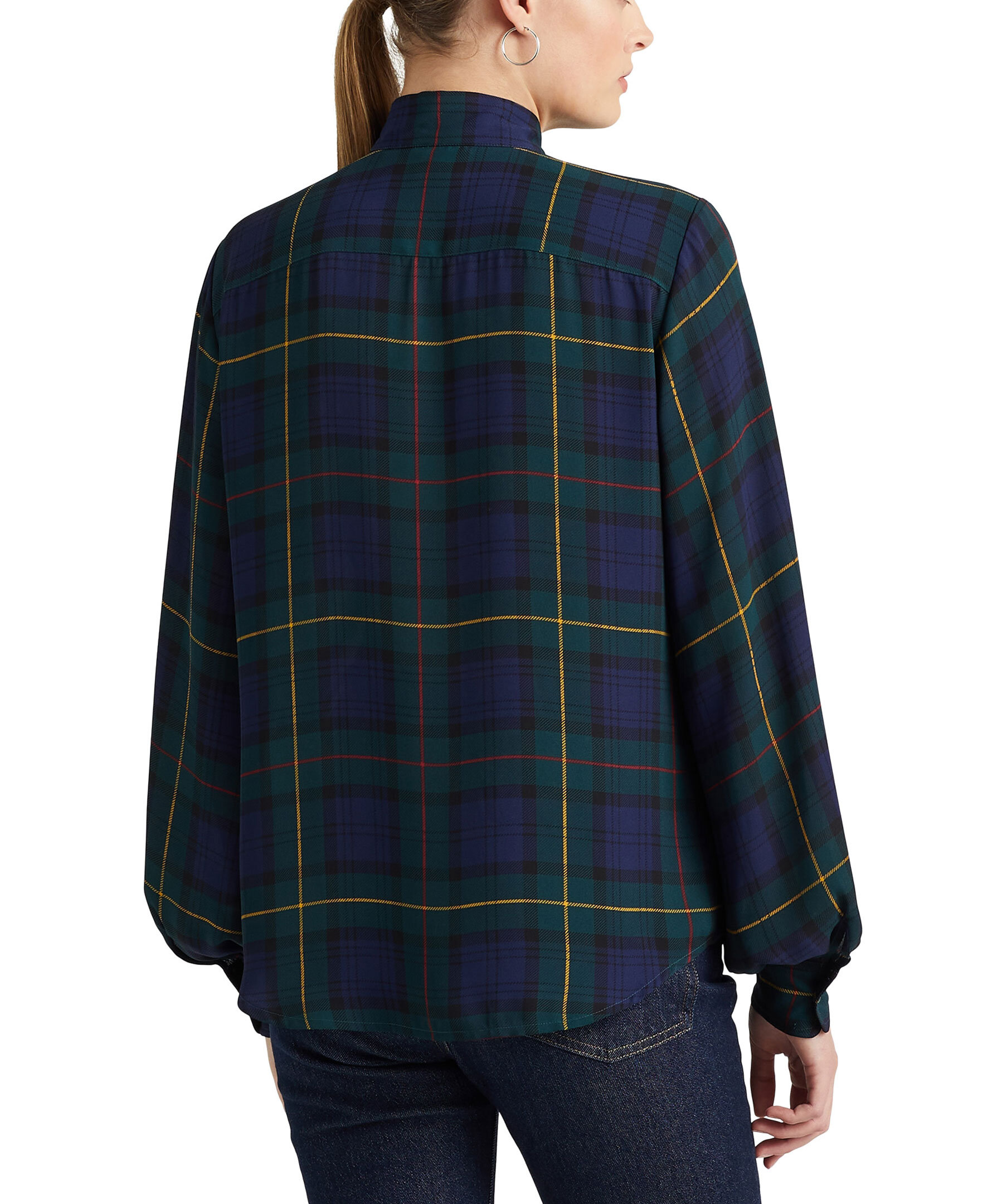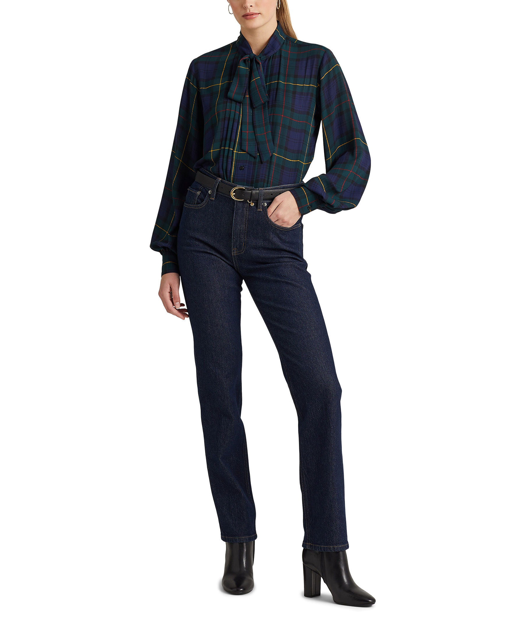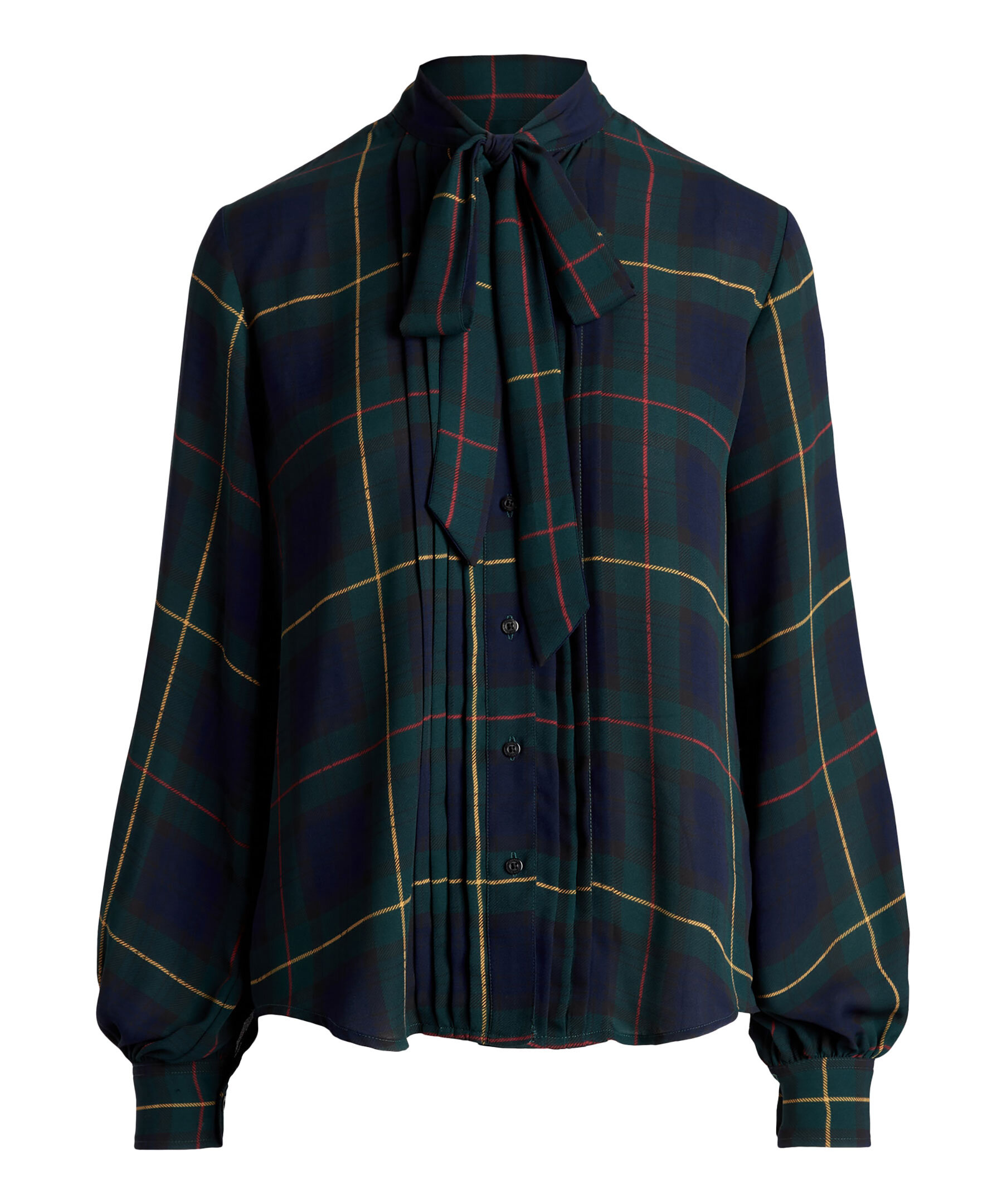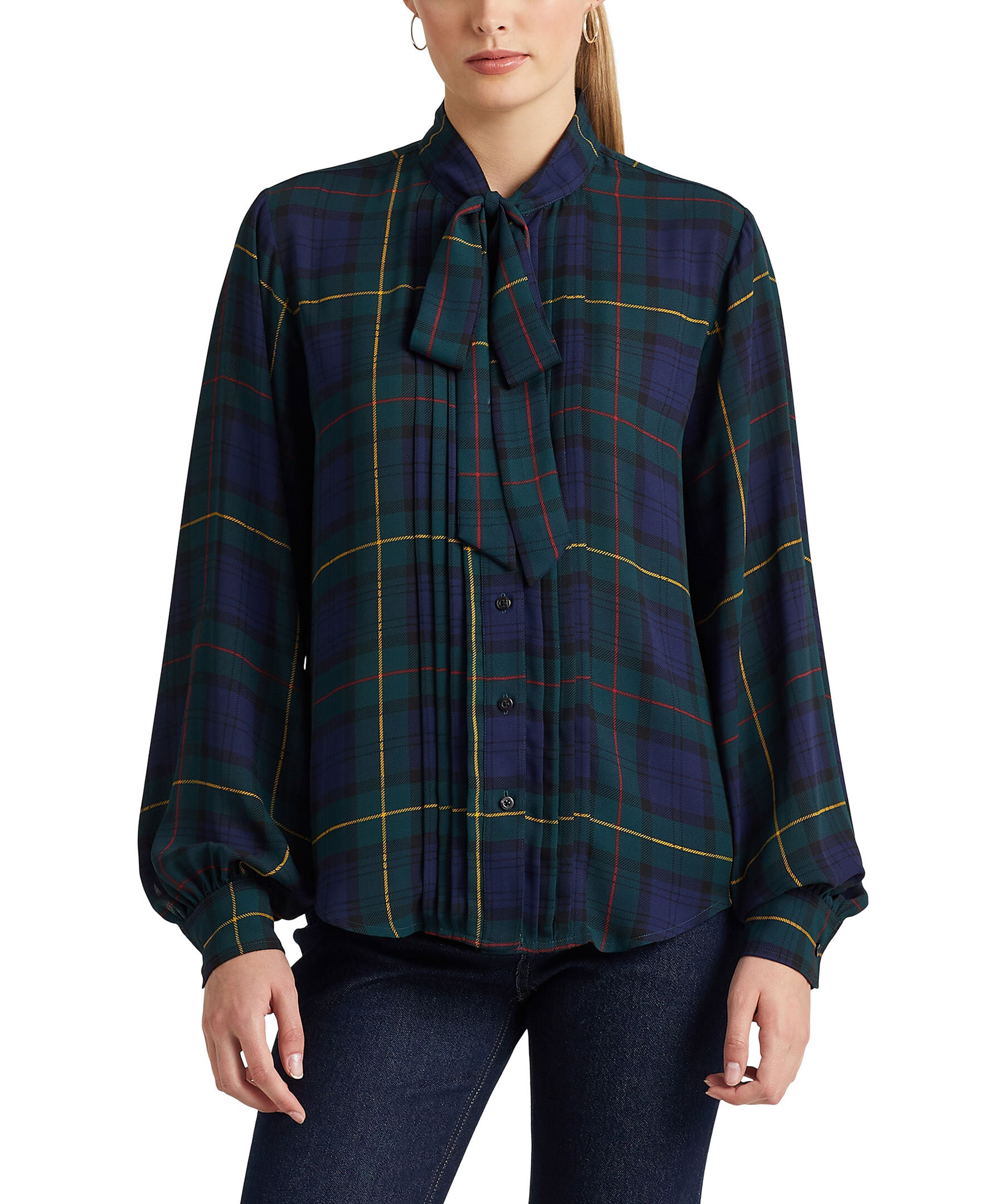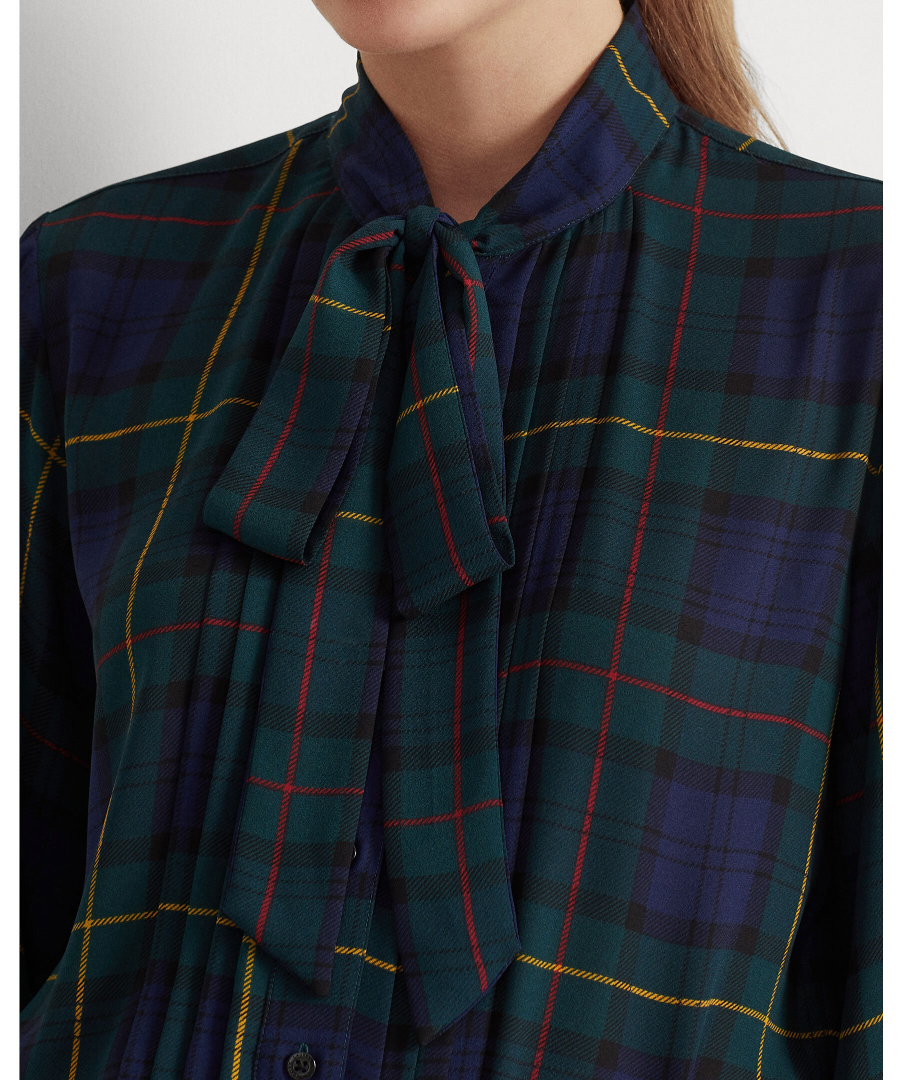 Mörkgrön, rutig blus med knytringning fram från Lauren Ralph Lauren. Puffiga ärmslut och har en avslappnad passform. Avsedd att slå i höften, knappslå och "Lauren Ralph Lauren"-graverade pärlemorknappar. Långa blusärmar med knäppta manschetter. Rynkning i ärmsluten och skjortsvansfåll. Modellen är 178 cm och bär storlek small.