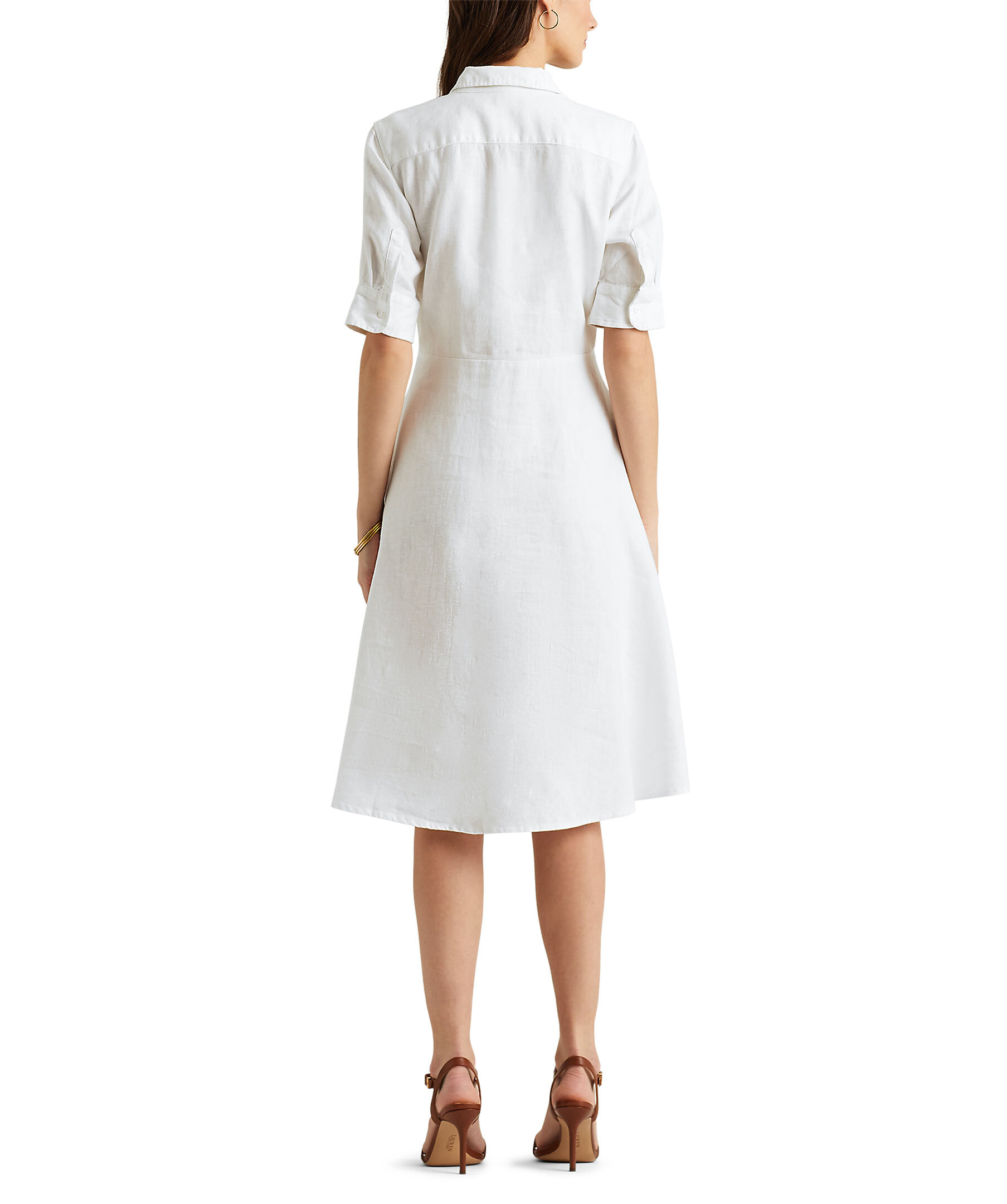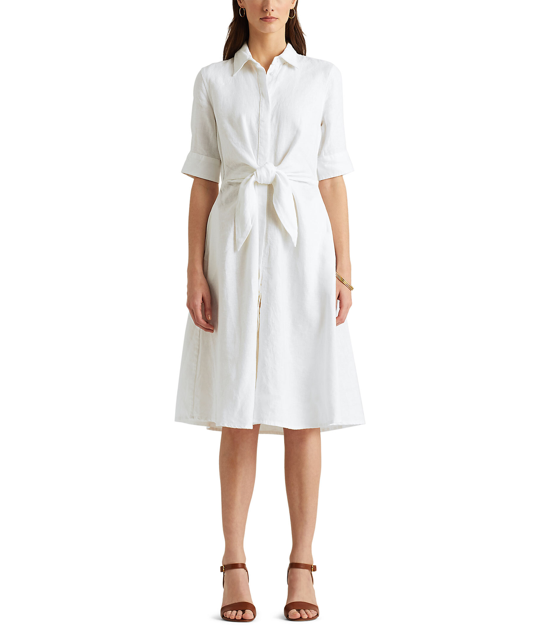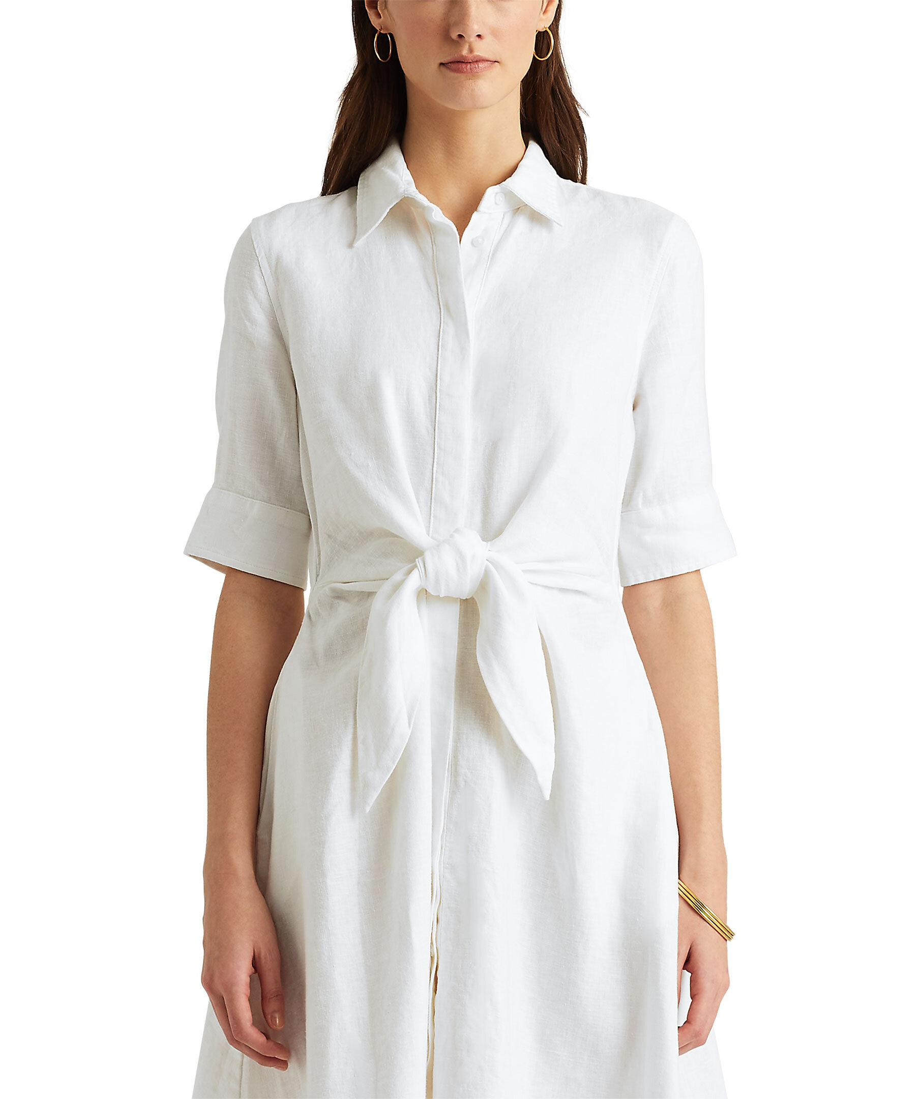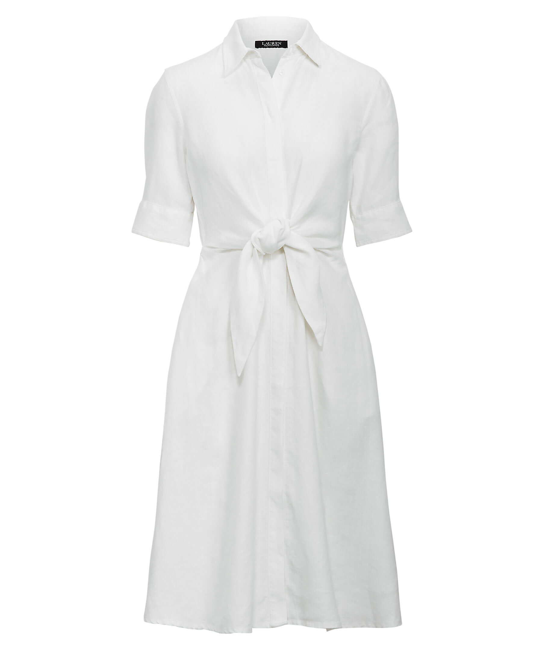 Vit, skjortklänning från Lauren Ralph Lauren. Gjord i skönt linnematerial. Knäppning hela vägen fram, snörning i midjan och har långa t-shirt ärmar. Klänningen är a-linjeformad nertill, har öppna fickor i sidorna och en spetsig krage fram. * Knappar hela vägen * Spetsig krage * Fickor i sidorna