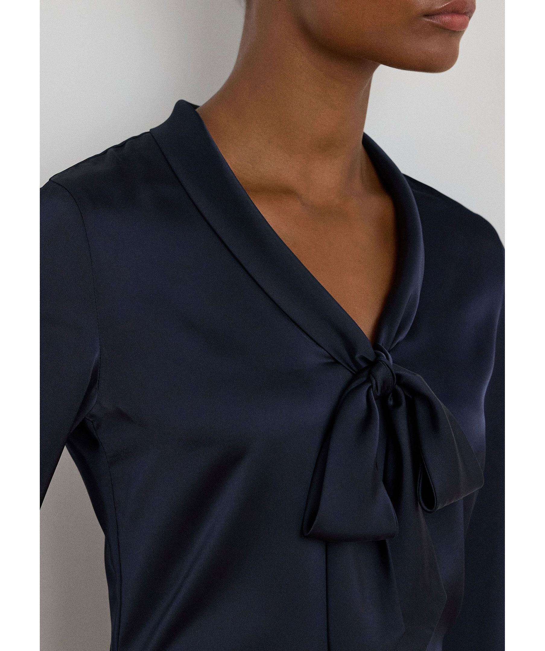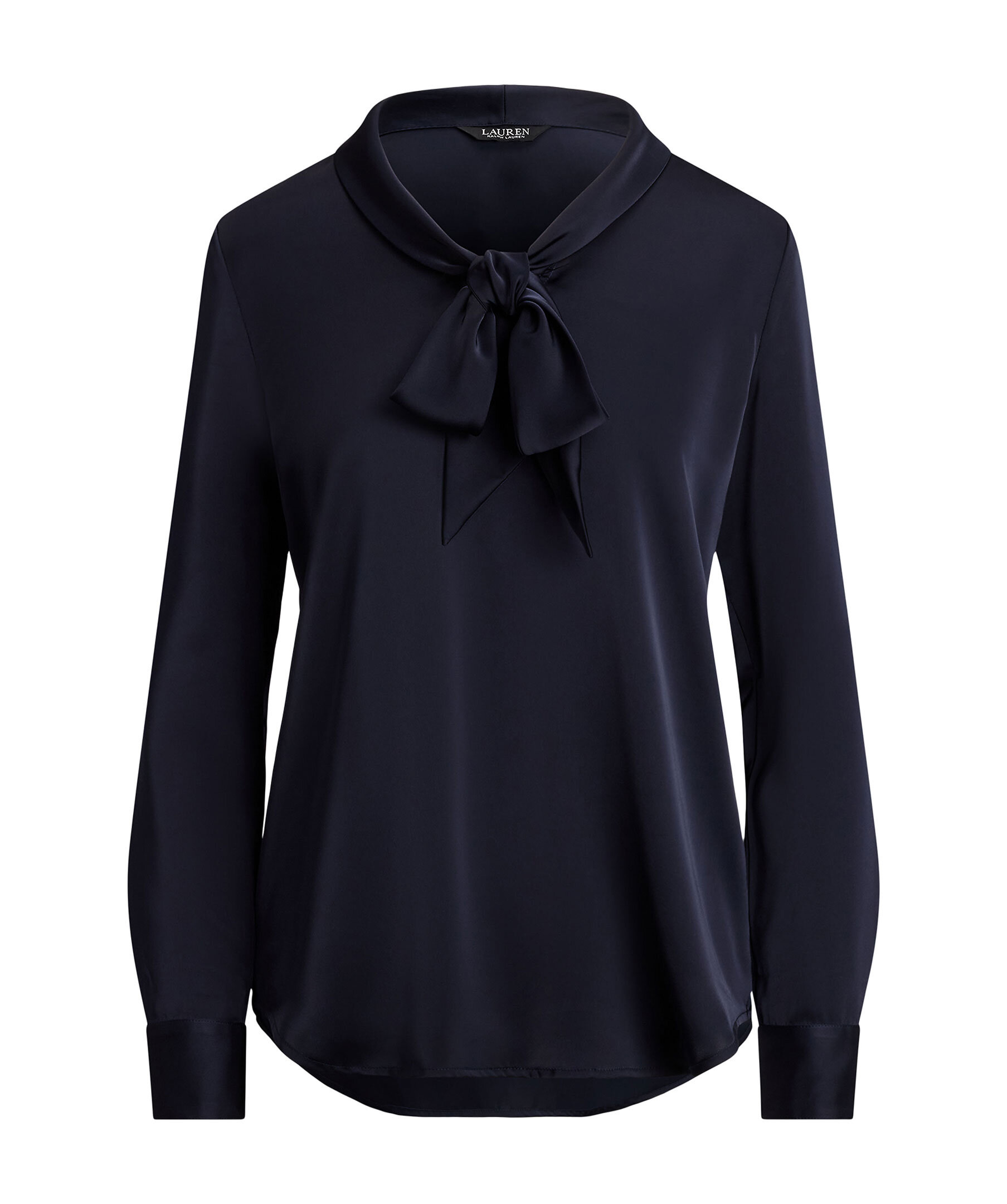 Mörkblå silkblus från Lauren Ralph Lauren. Blusen har långa ärmar och v-ringad halsringning med knytning. Tillverkad i polyester.