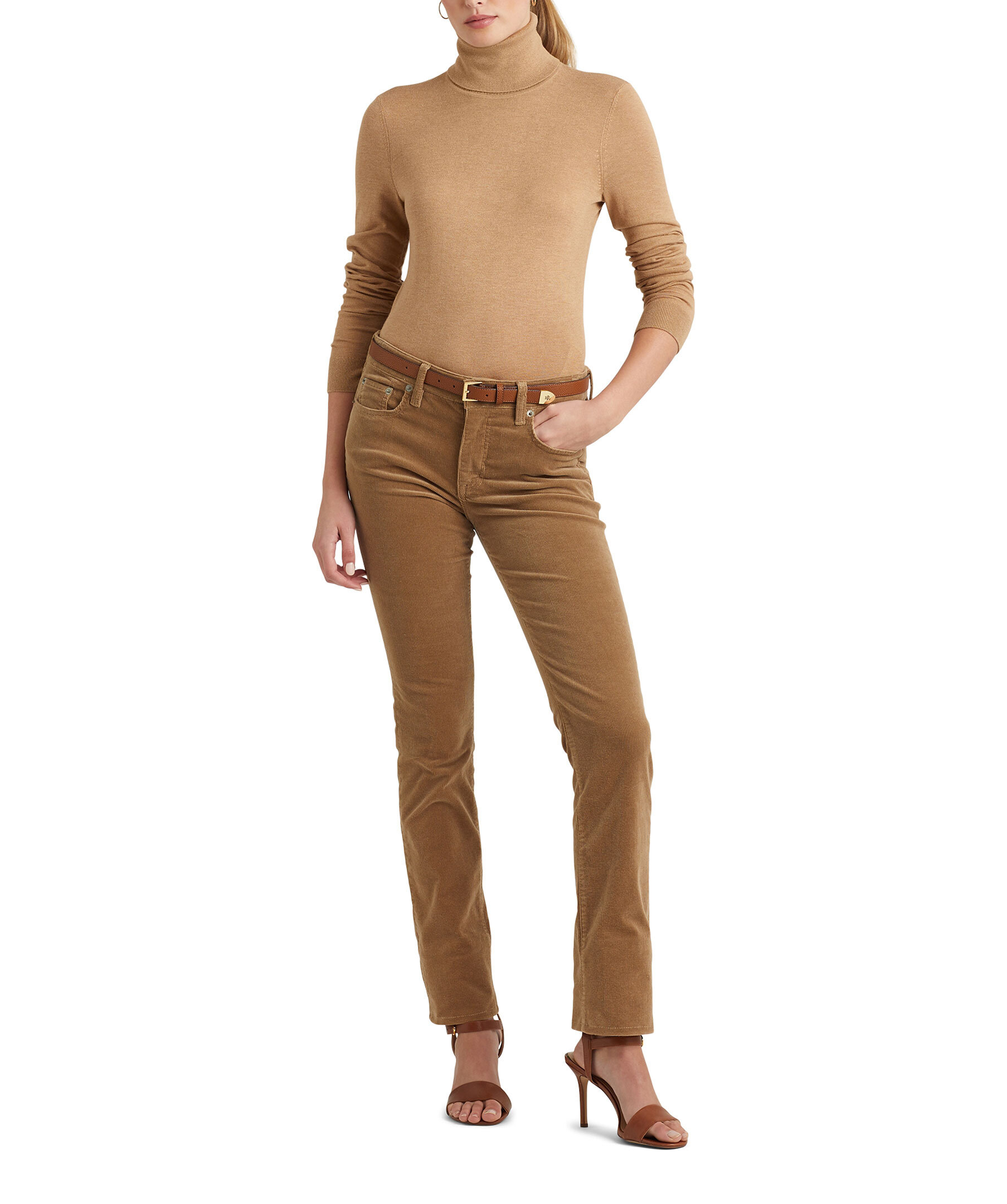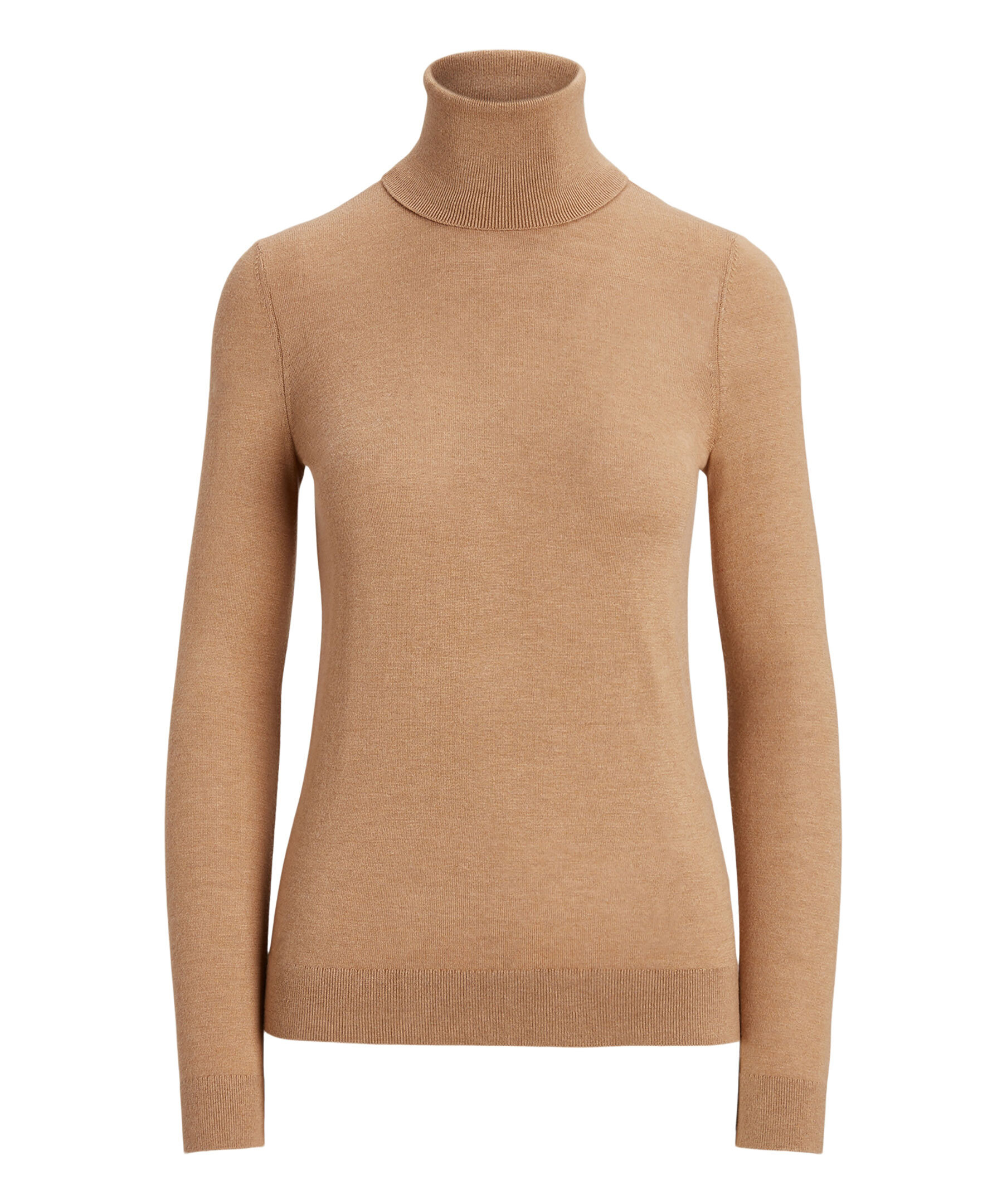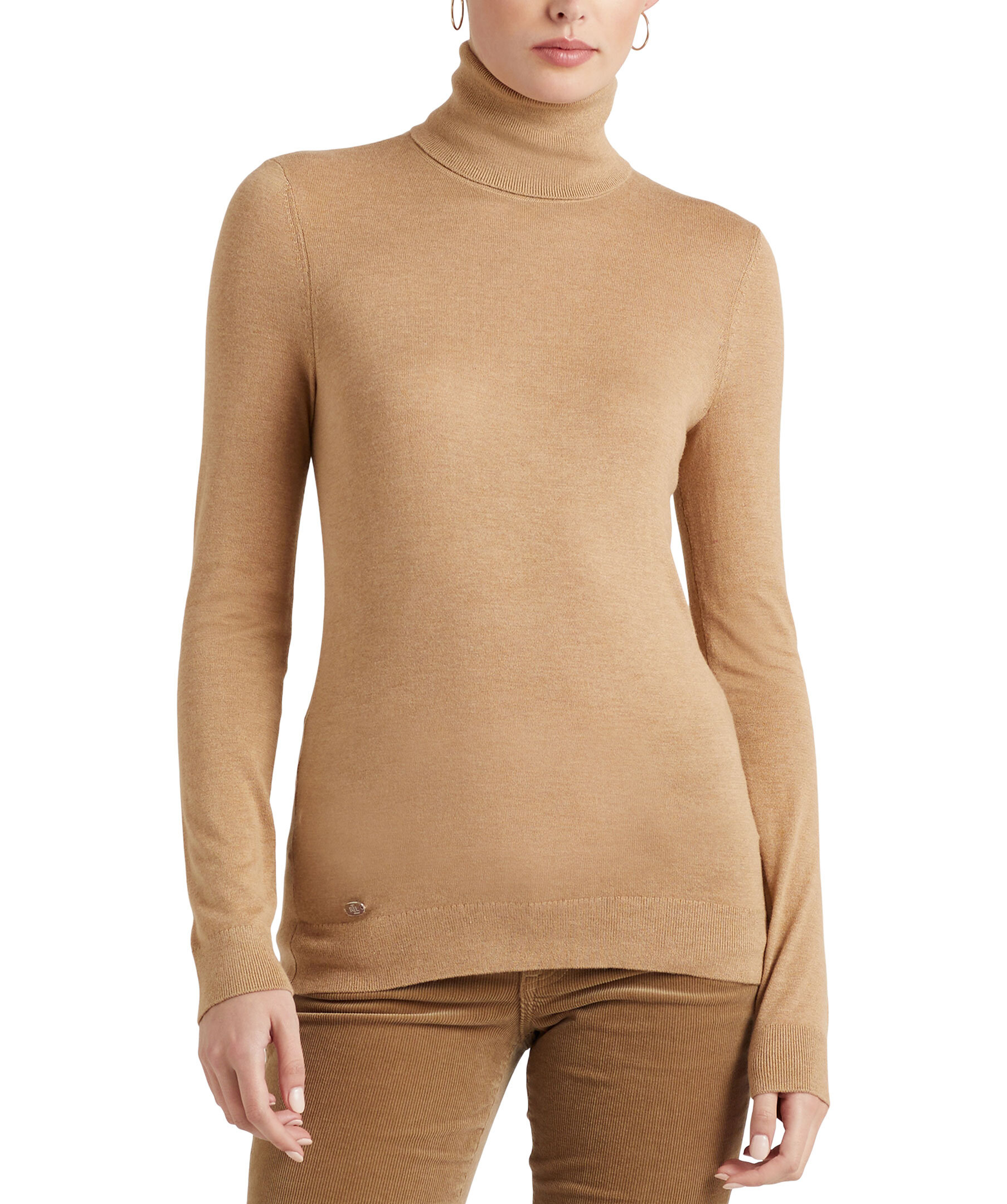 Kamelfärgad, finstickad polotröja från Lauren Ralph Lauren. Tillverkad i modalblandning. Fint, ribbstickade muddar i ärmslut och plaggslut samt hög krage som viks ner.