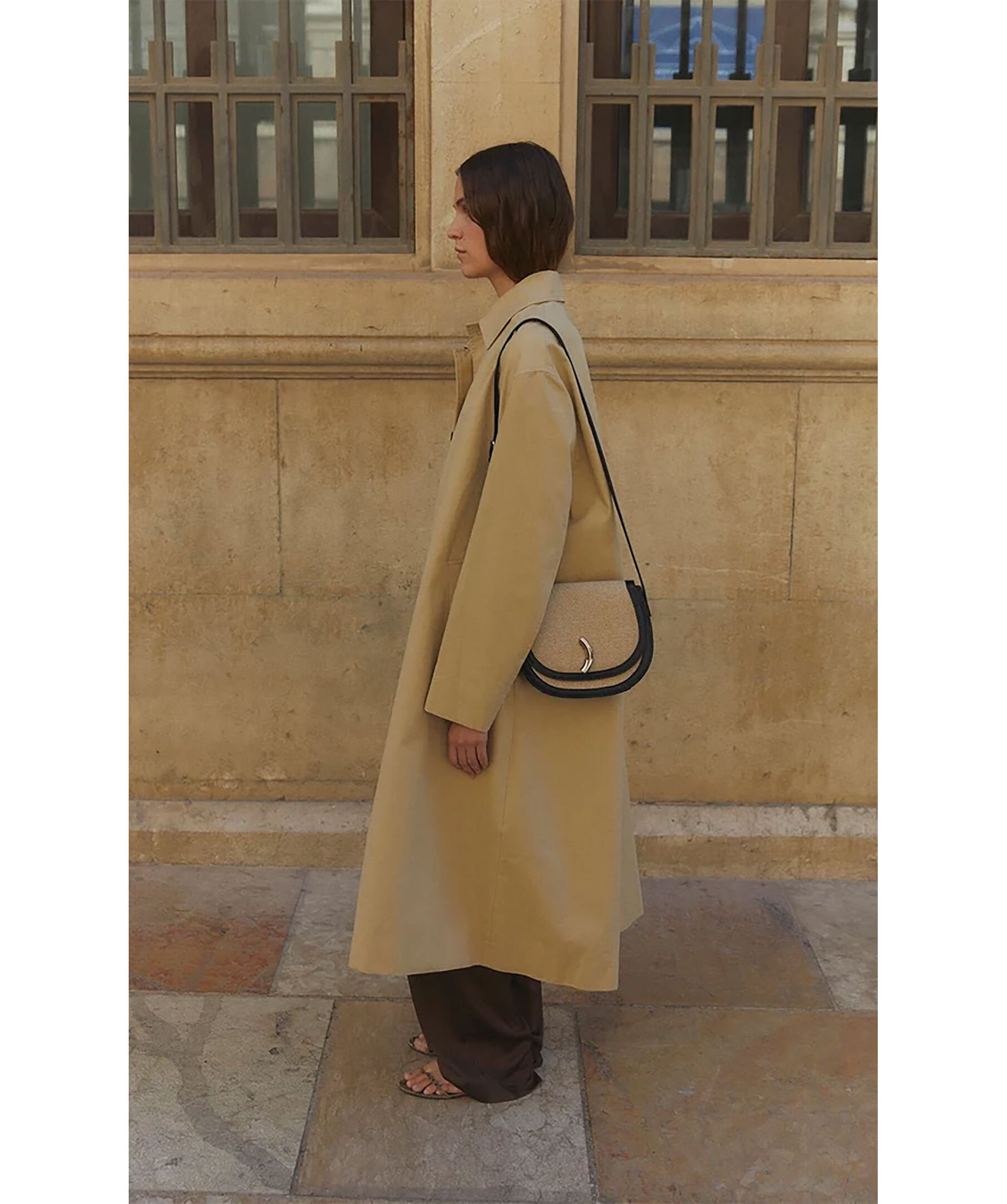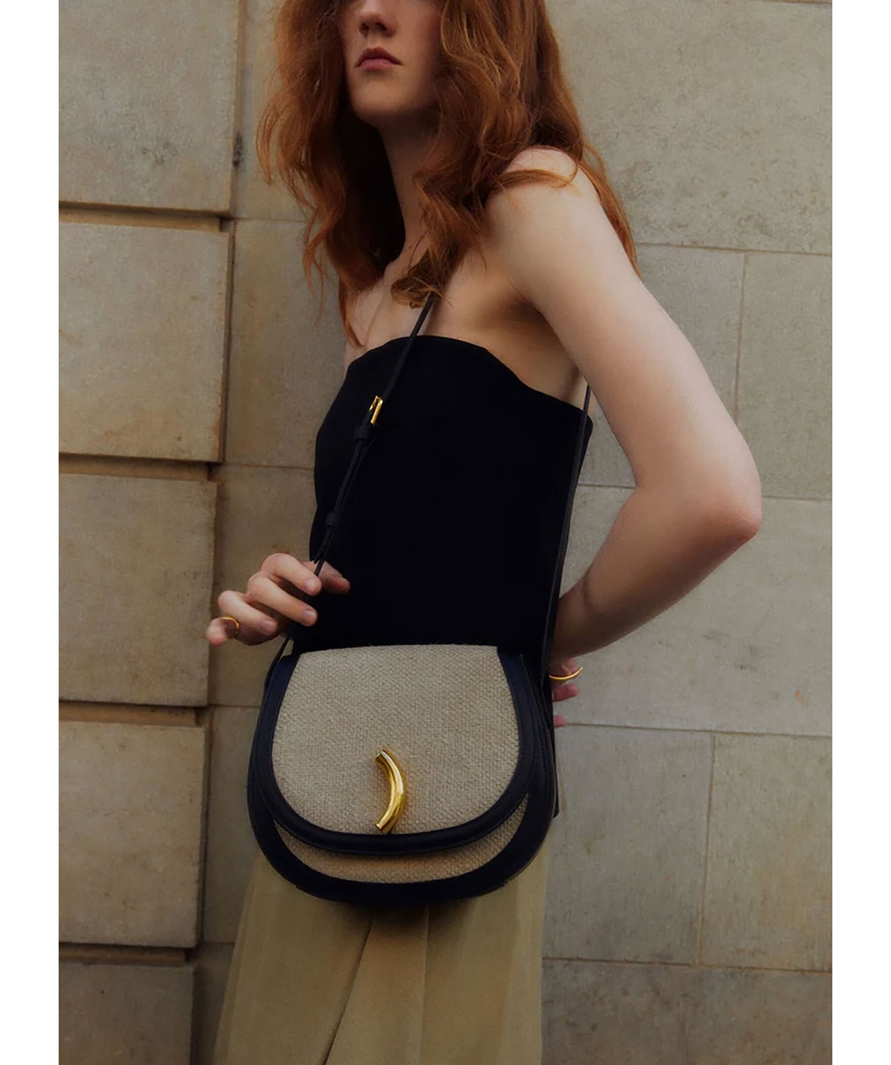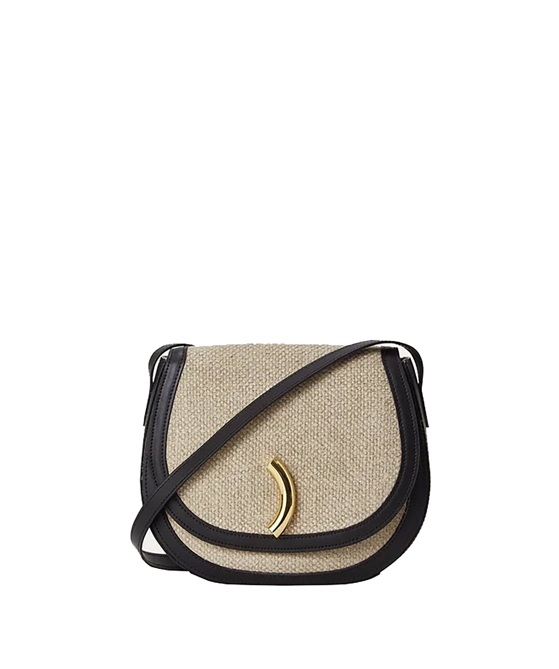 Beige väska i vävt tyg med svarta detaljer i läder. Justerbar axelrem. Stängs med lock. Väskan har ett huvudfack och ett innerfack. Huvudfacket stängs med magnetlås. Guldfärgad detalj framtill på väskans lock. Väskans mått: H 19 cm B 23 cm D 6 cm.