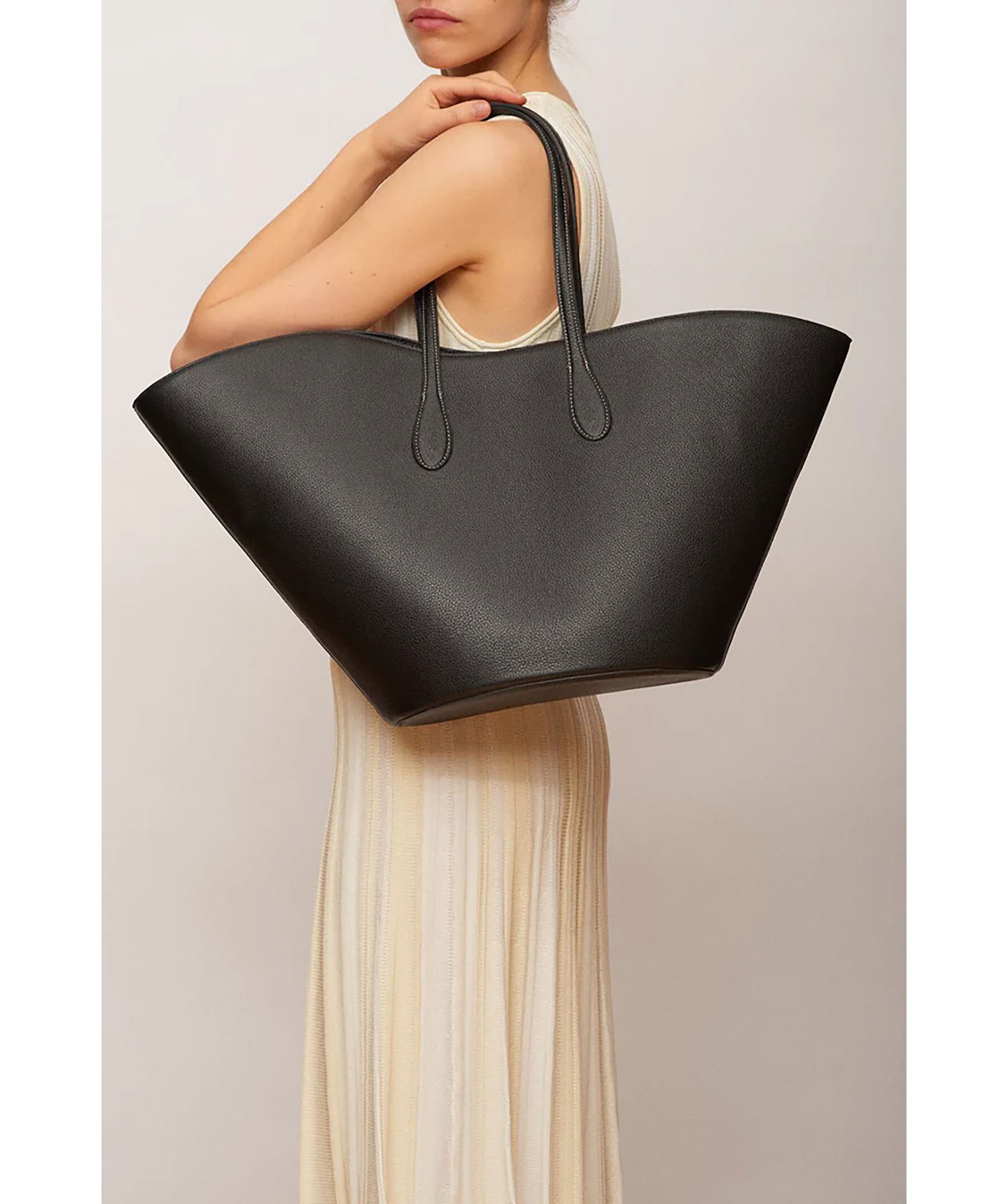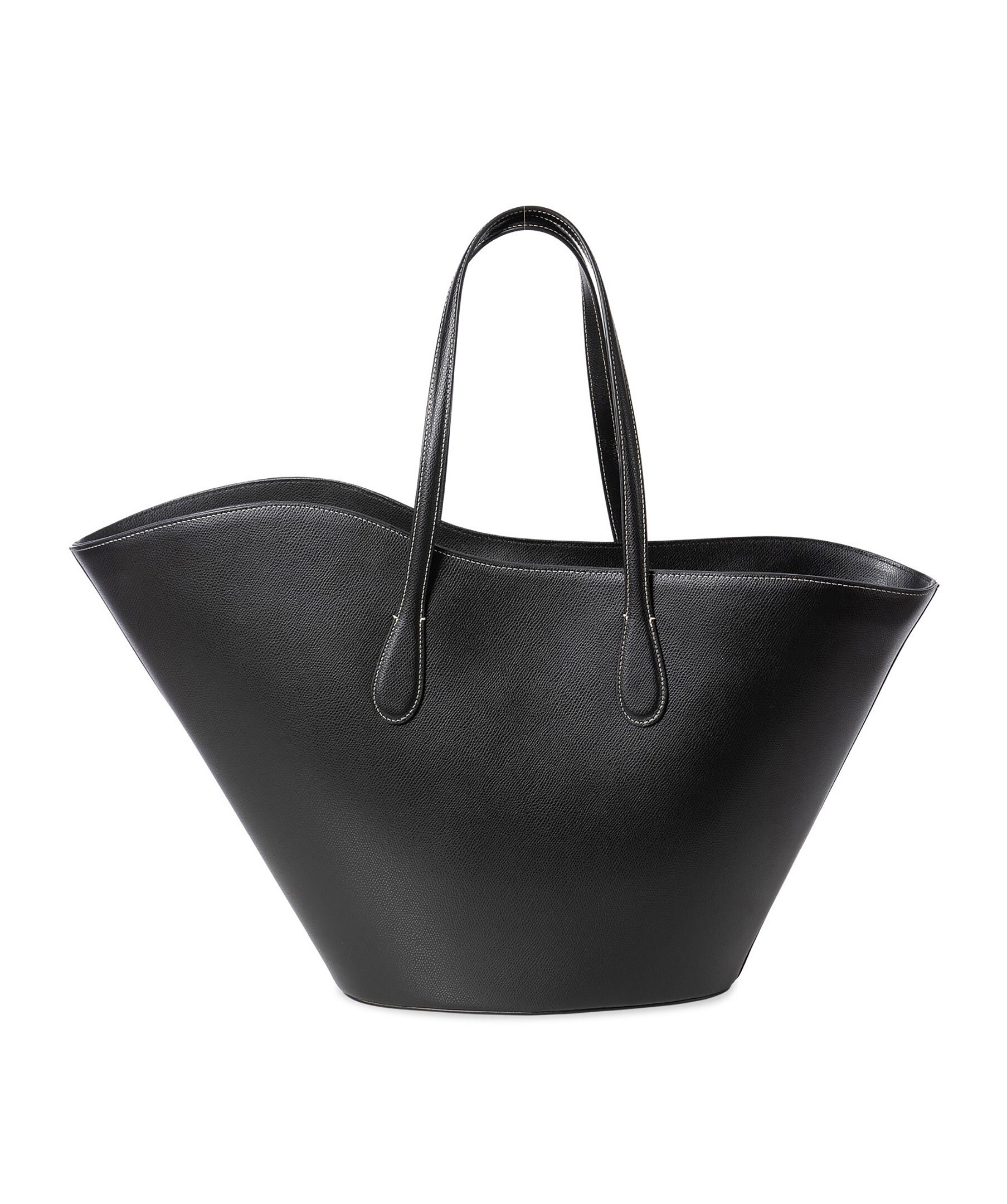Svart stor totebag från Little Liffner. Väskan har platta handtag och är tänkt att bäras på axeln. Är en större modell av deras klassiska Tulip Tote. Ett stort innerfack, mindre fack som stängs med dragkedja och två små öppna fickor. Gjord i läder och har vita synliga stygn. H: 35 X B: 55 (överst) X D: 16 CM