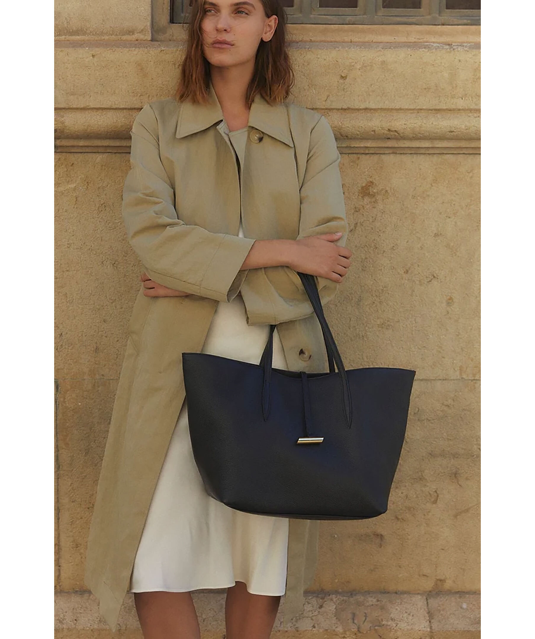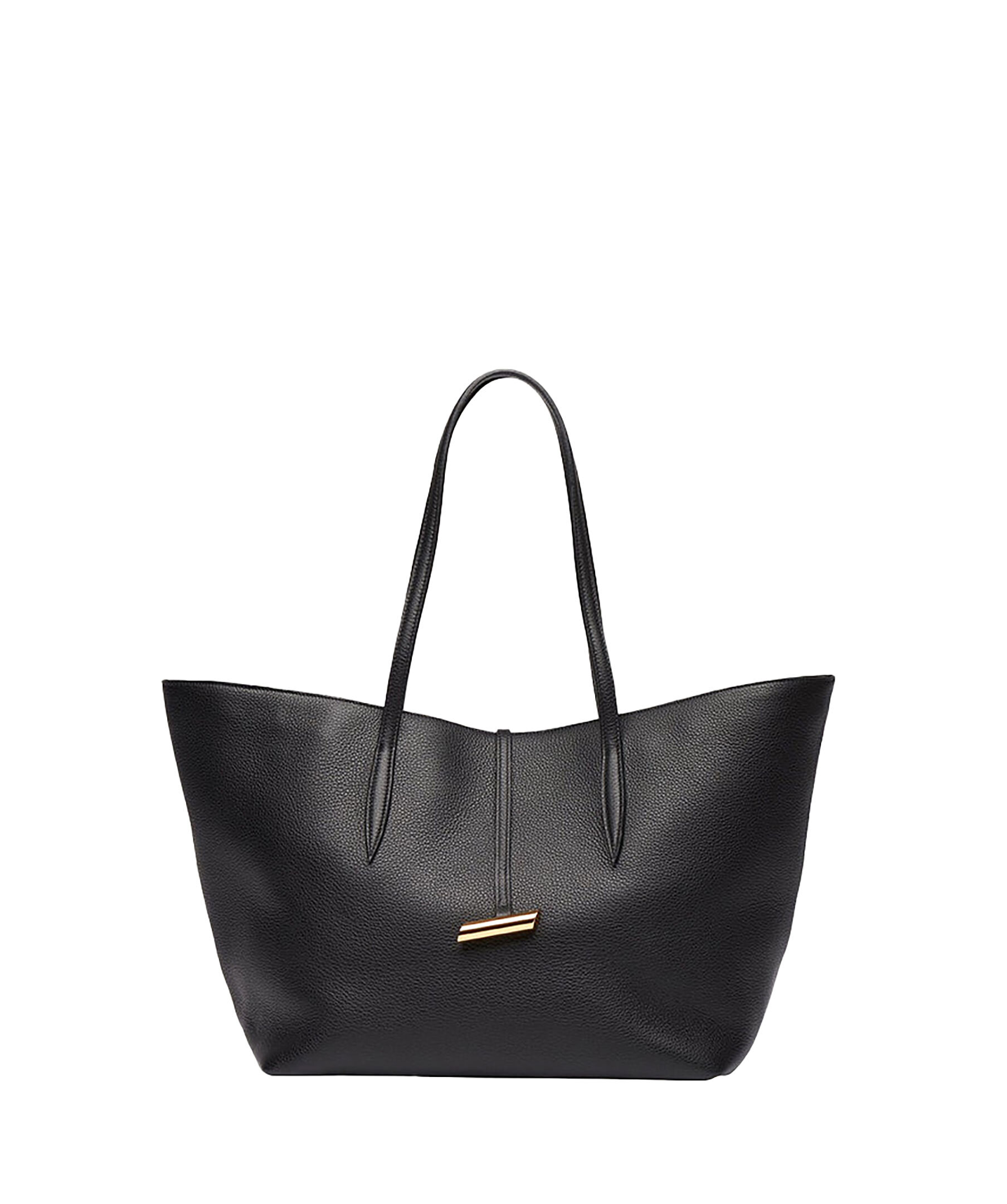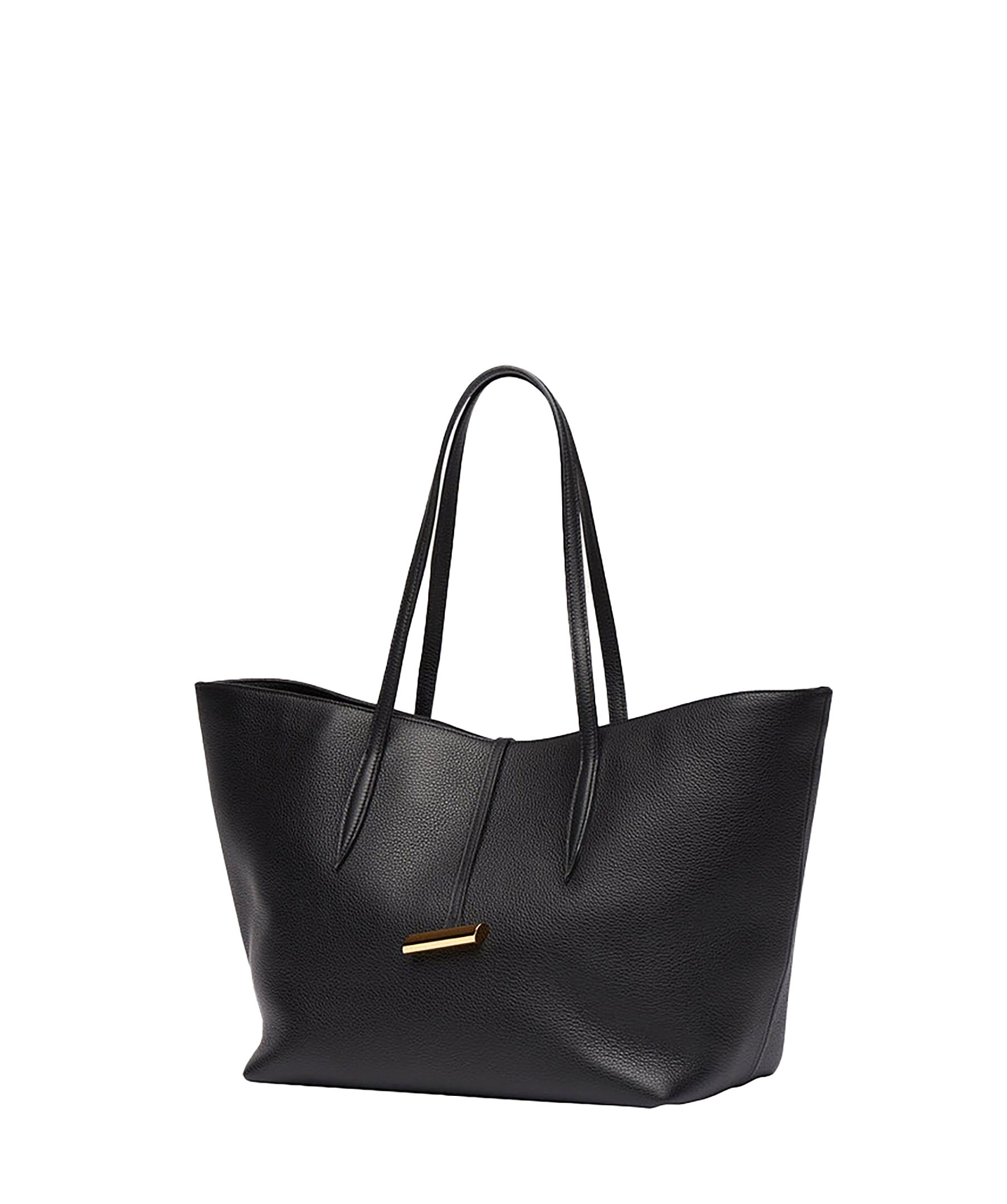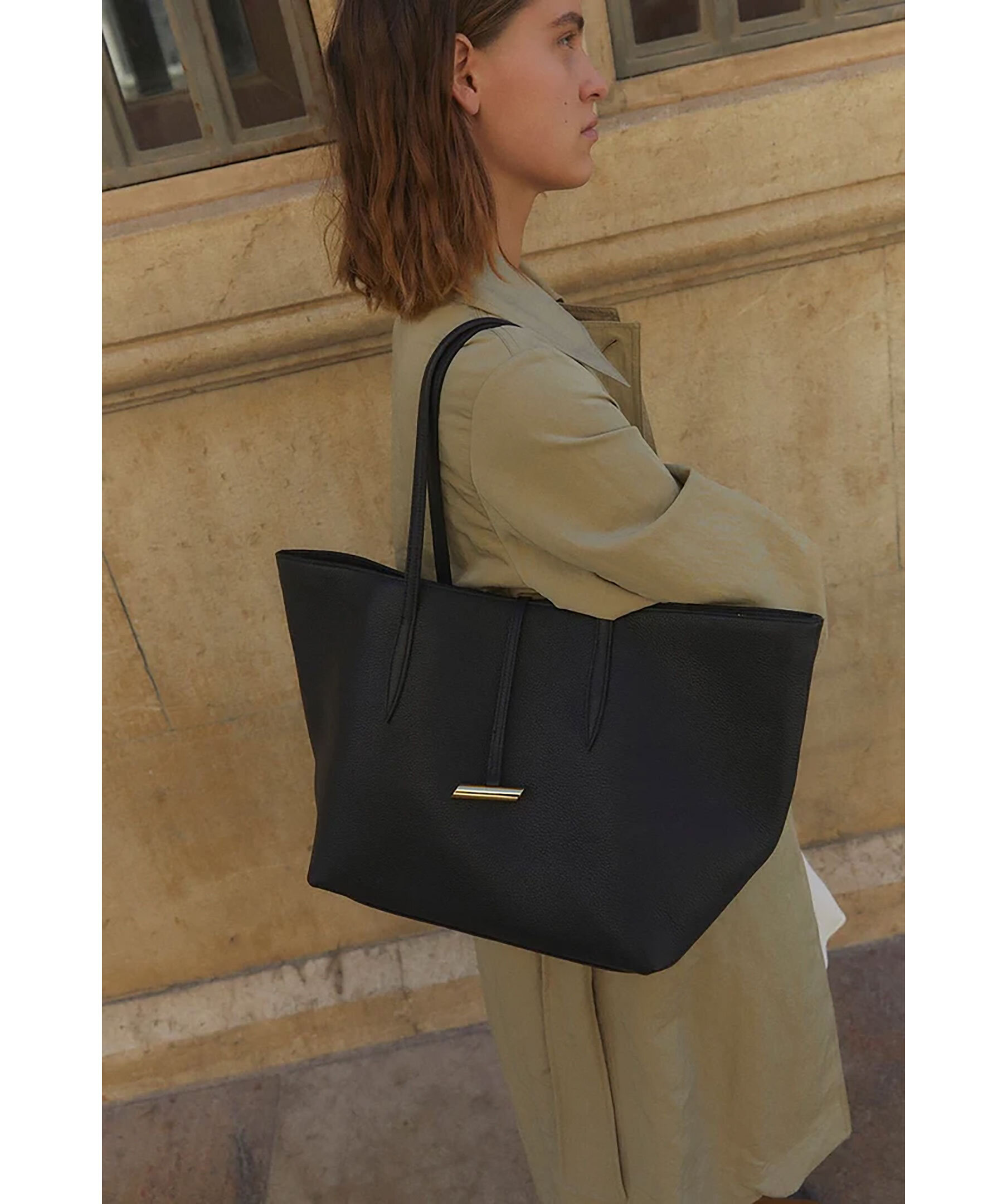 Svart väska i tote modell tillverkad i läder från Little Liffner. Huvudfacket stängs med rem och tyngd, guldfärgad detalj i metall. Innerfack som stängs med dragkedja. Väskans insida är klädd i svart, vävt canvastyg. Väskans mått: H: 30 x W: 48 (topp) x D: 20 cm.