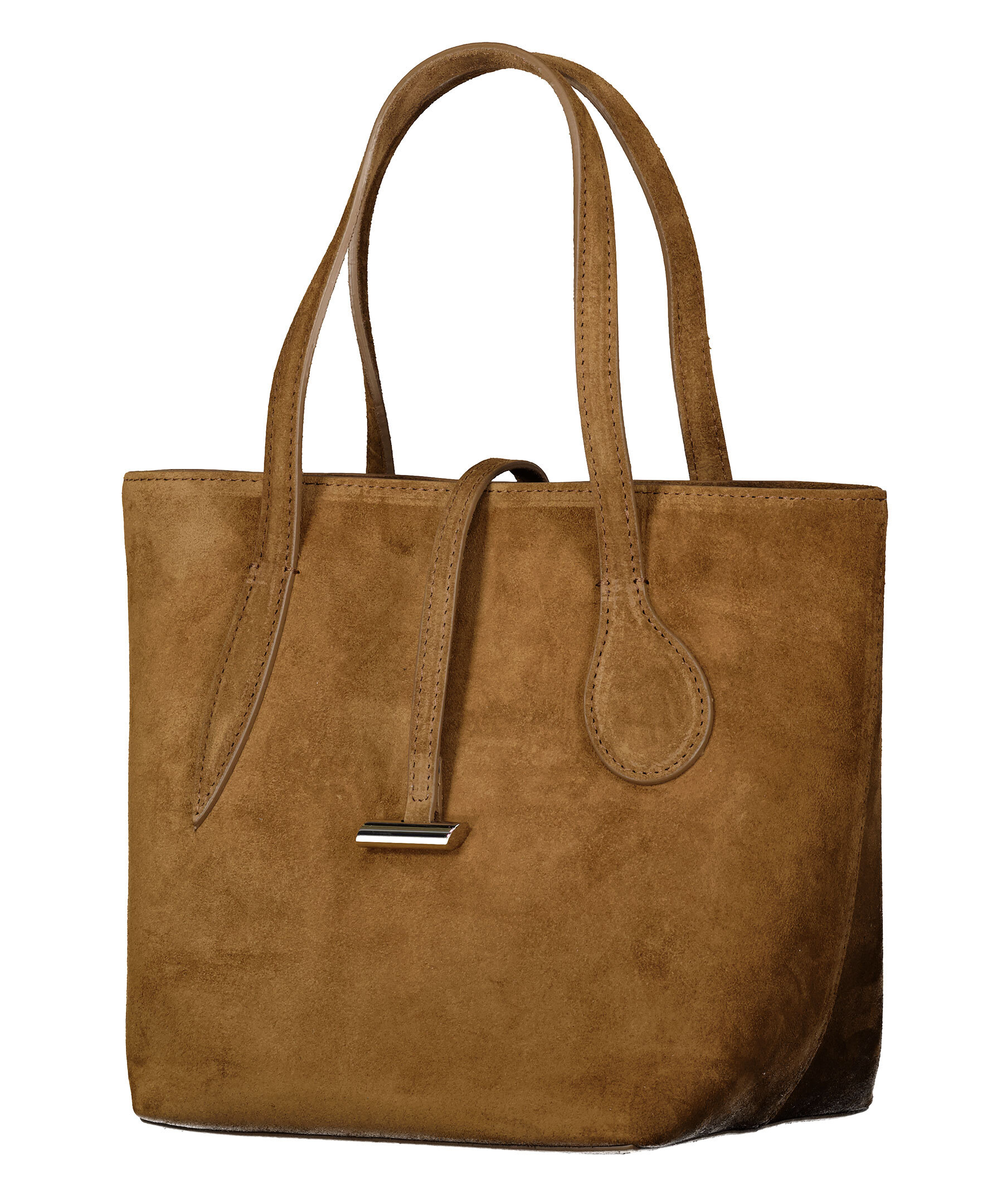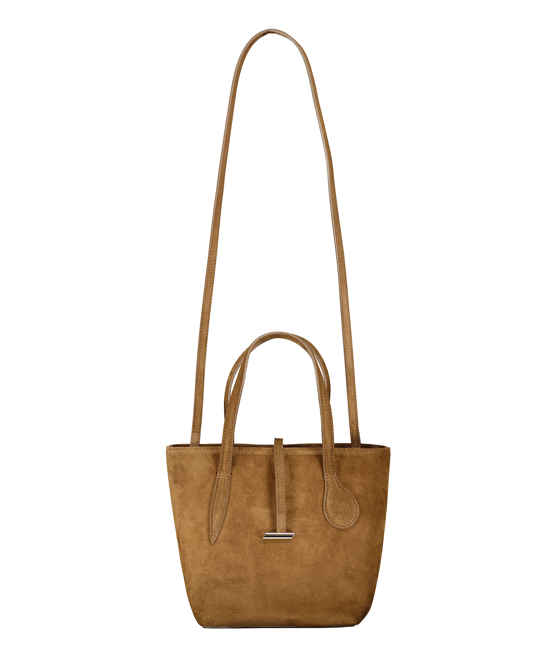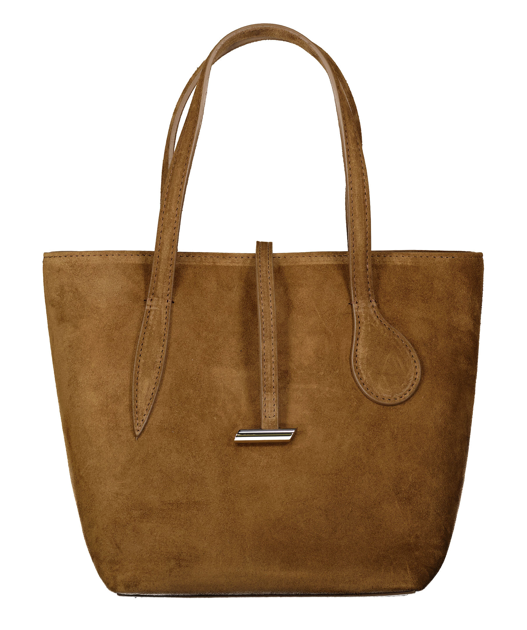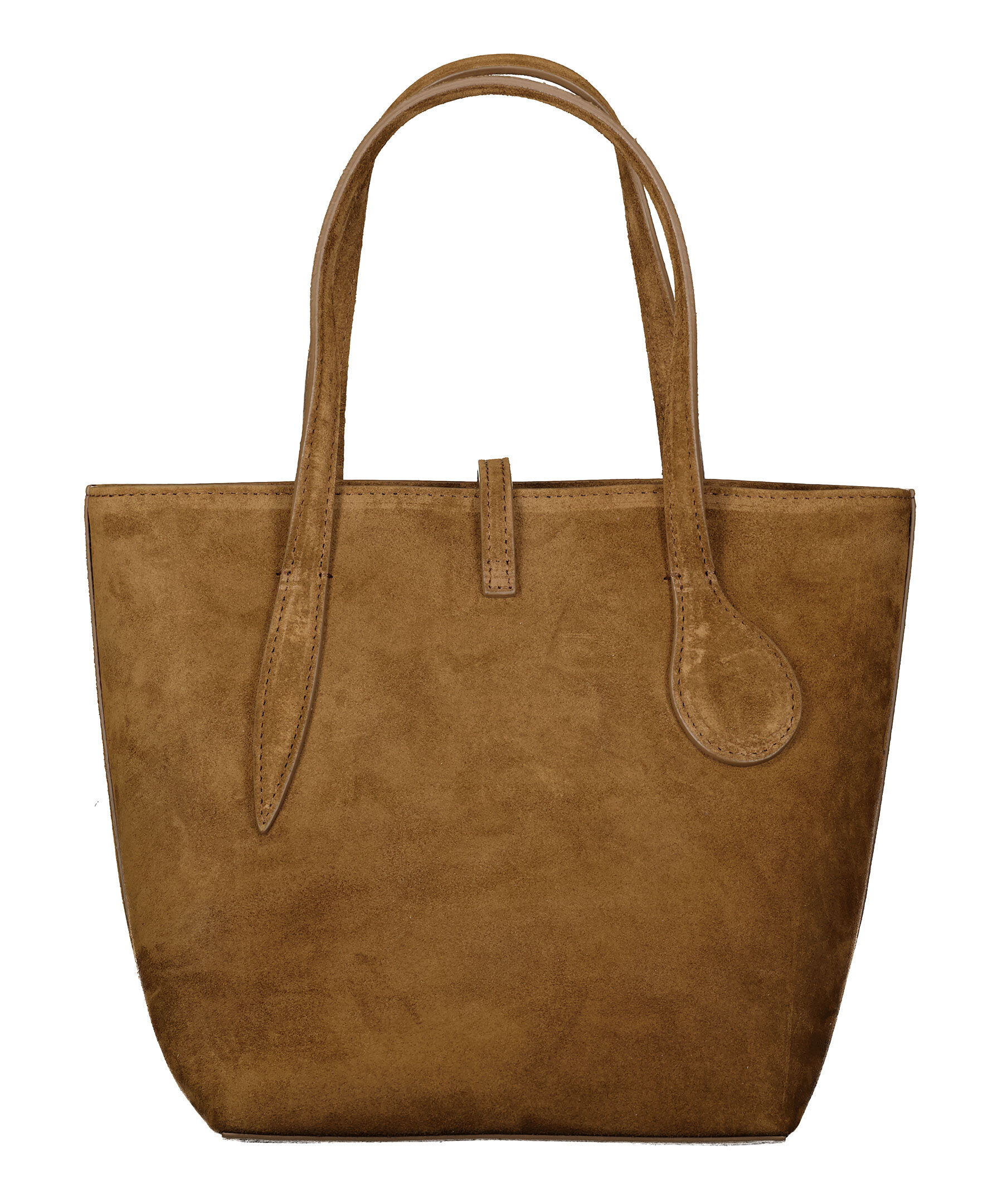 Brun liten väska tillverkad i mocka i totemodell från Little Liffner. Huvudfacket stängs med tryckknapp. Smal, avtagbar axelrem från Little Liffner. Innerfack som stängs med dragkedja. Rem med metalldetalj över huvudfacket. Insidan är klädd med bomull. Väskans mått: Bottom width: 18 cm Top width: 27 cm. Höjd: 20 cm Djup: 18 cm.