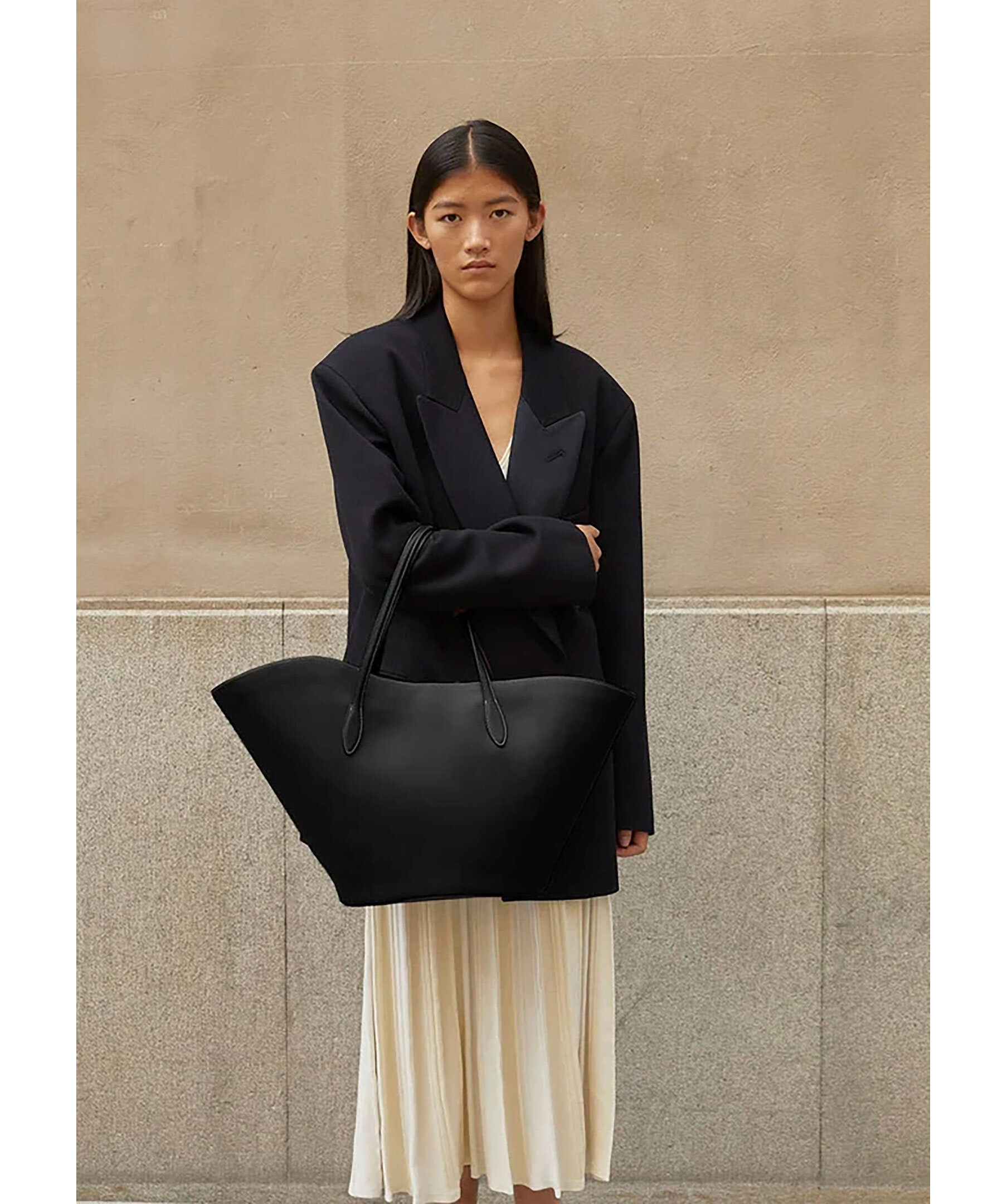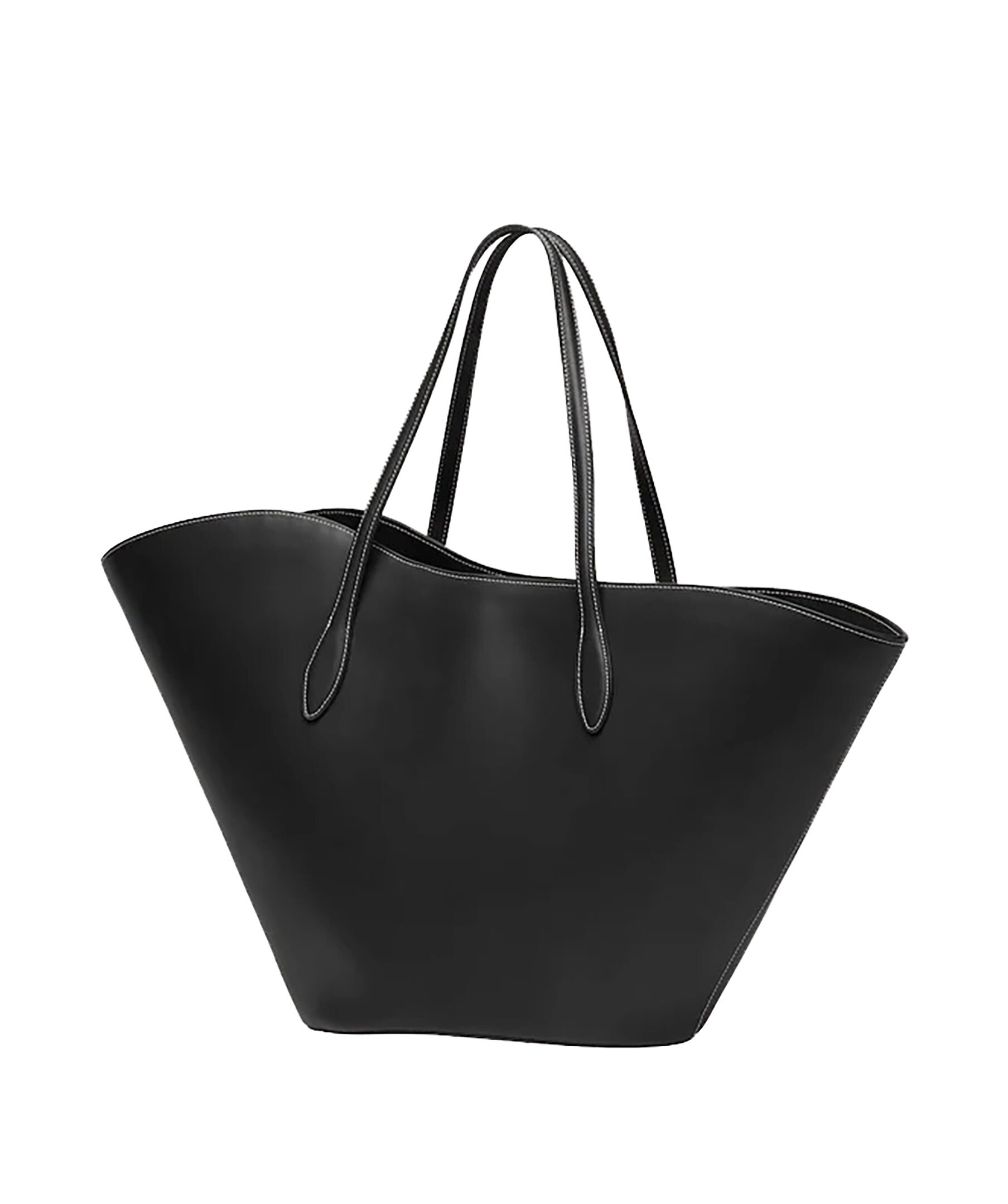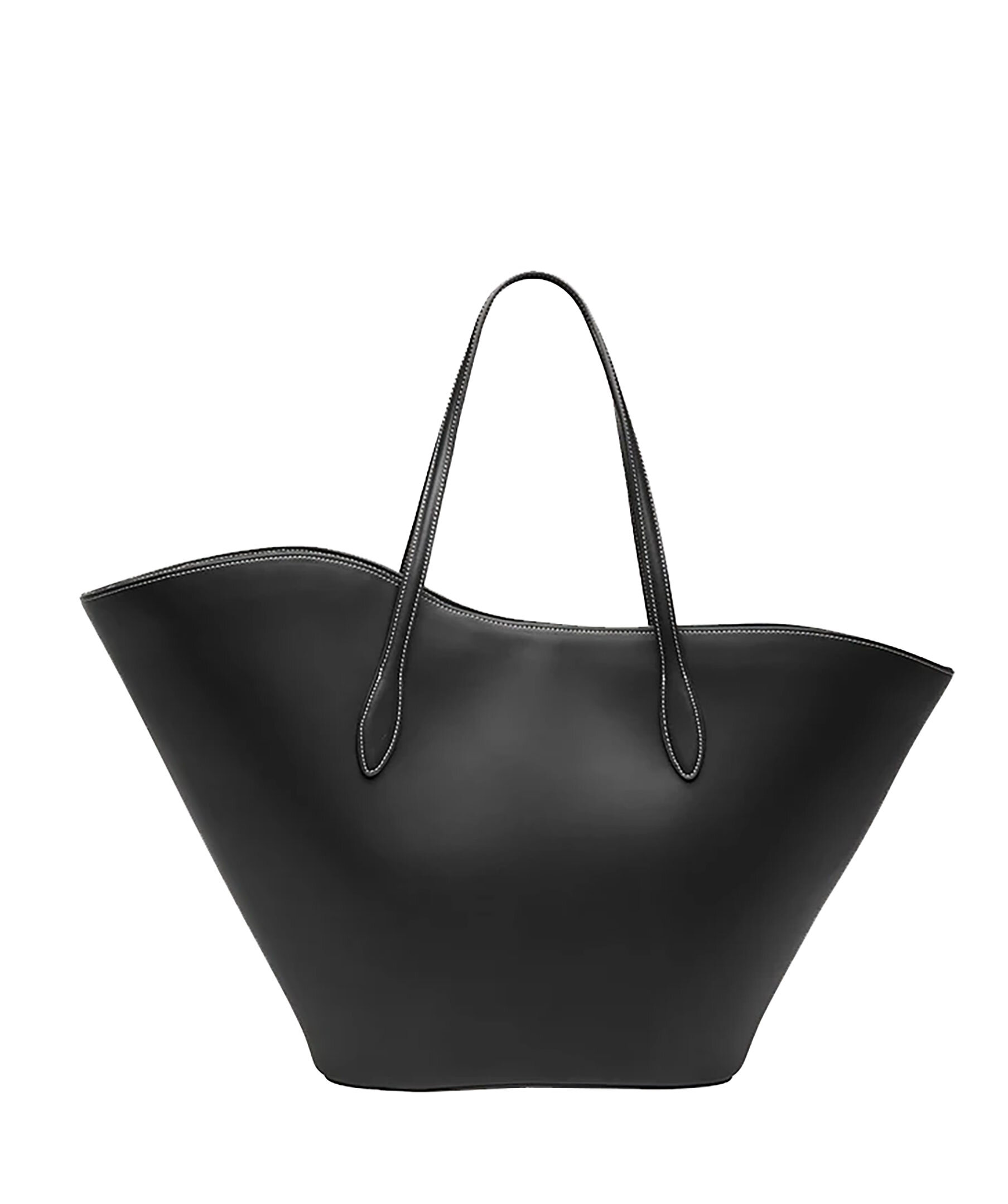 Svart stor totebag i läder från Little Liffner. Vita dekorativa sömmar. Väskan har platta handtag och är tänkt att bäras på axeln. Är en större modell av deras klassiska Tulip Tote. Ett stort innerfack, mindre fack som stängs med dragkedja och två små öppna fickor. H: 35 X B: 55 (överst) X D: 16 CM