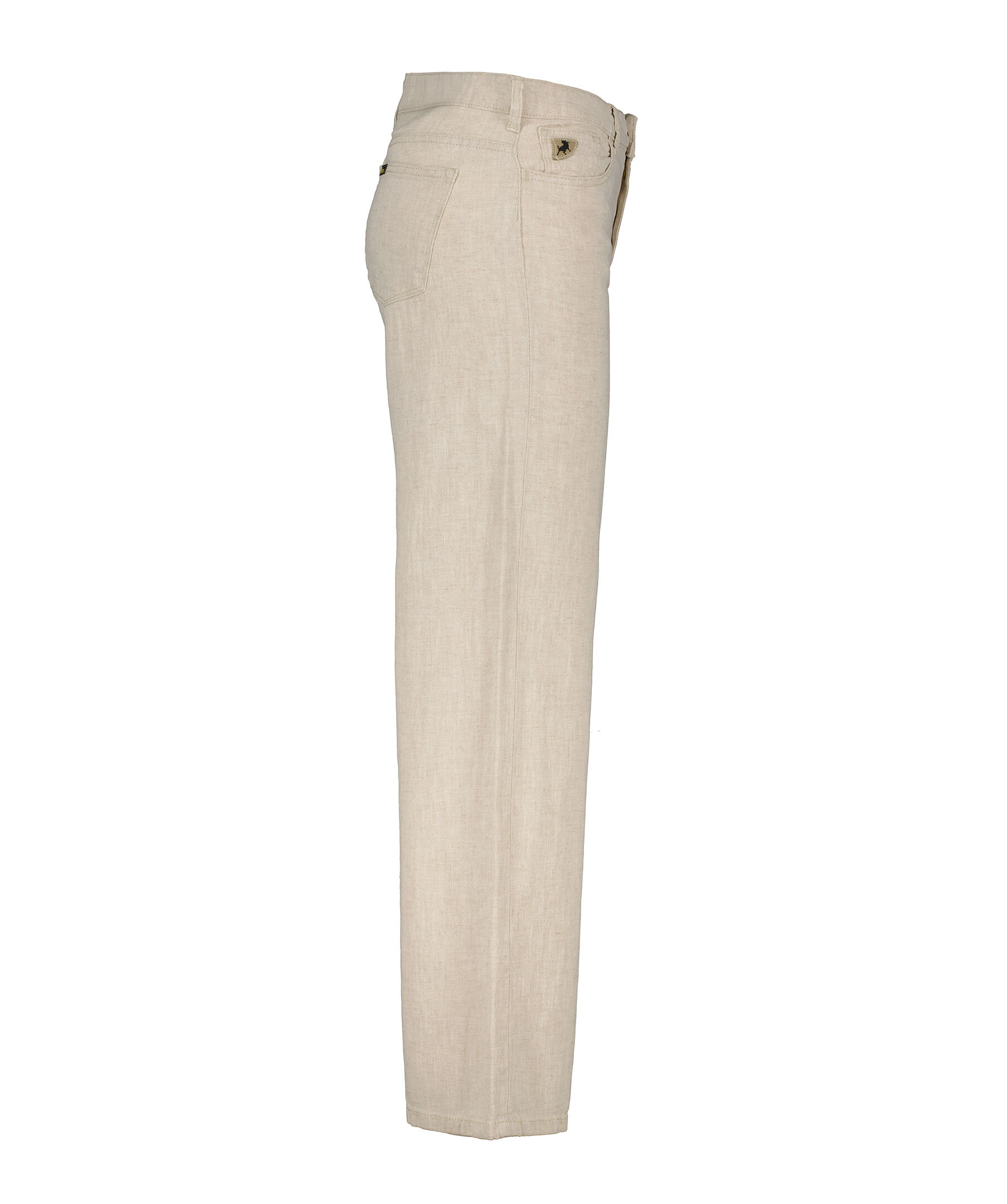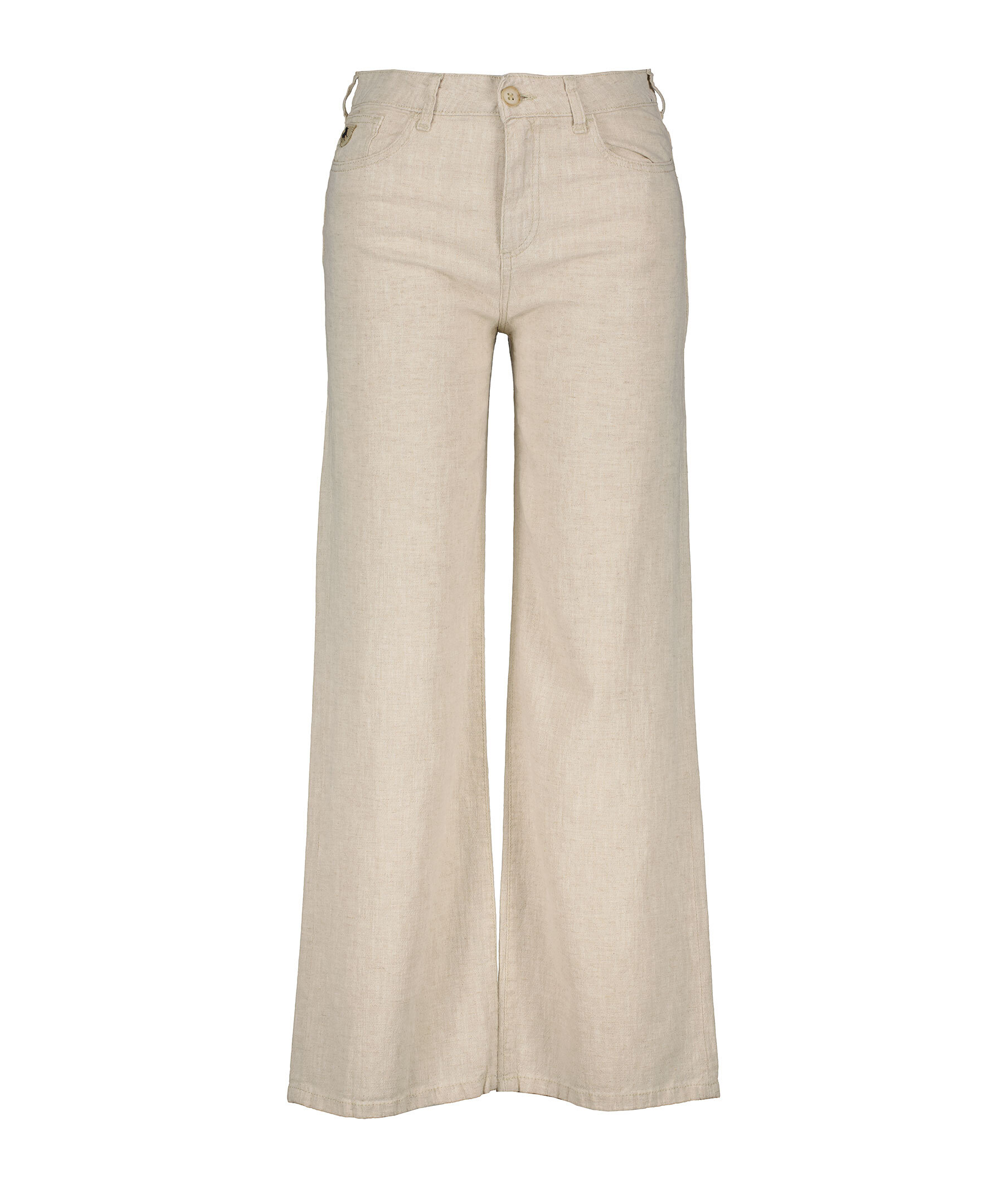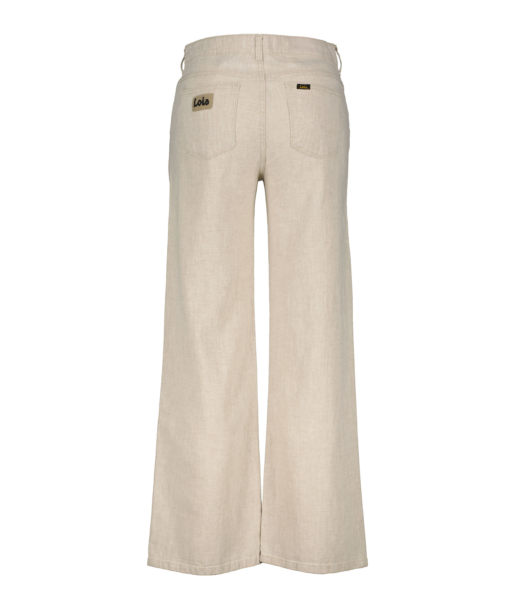 Sandfärgade linnebyxor från Lois. Byxorna har vida ben, bälteshällor i midjan, fem fickor, logotyp på myntficka samt bäcke bakfickorna. Tillverkade i en linneblandning.