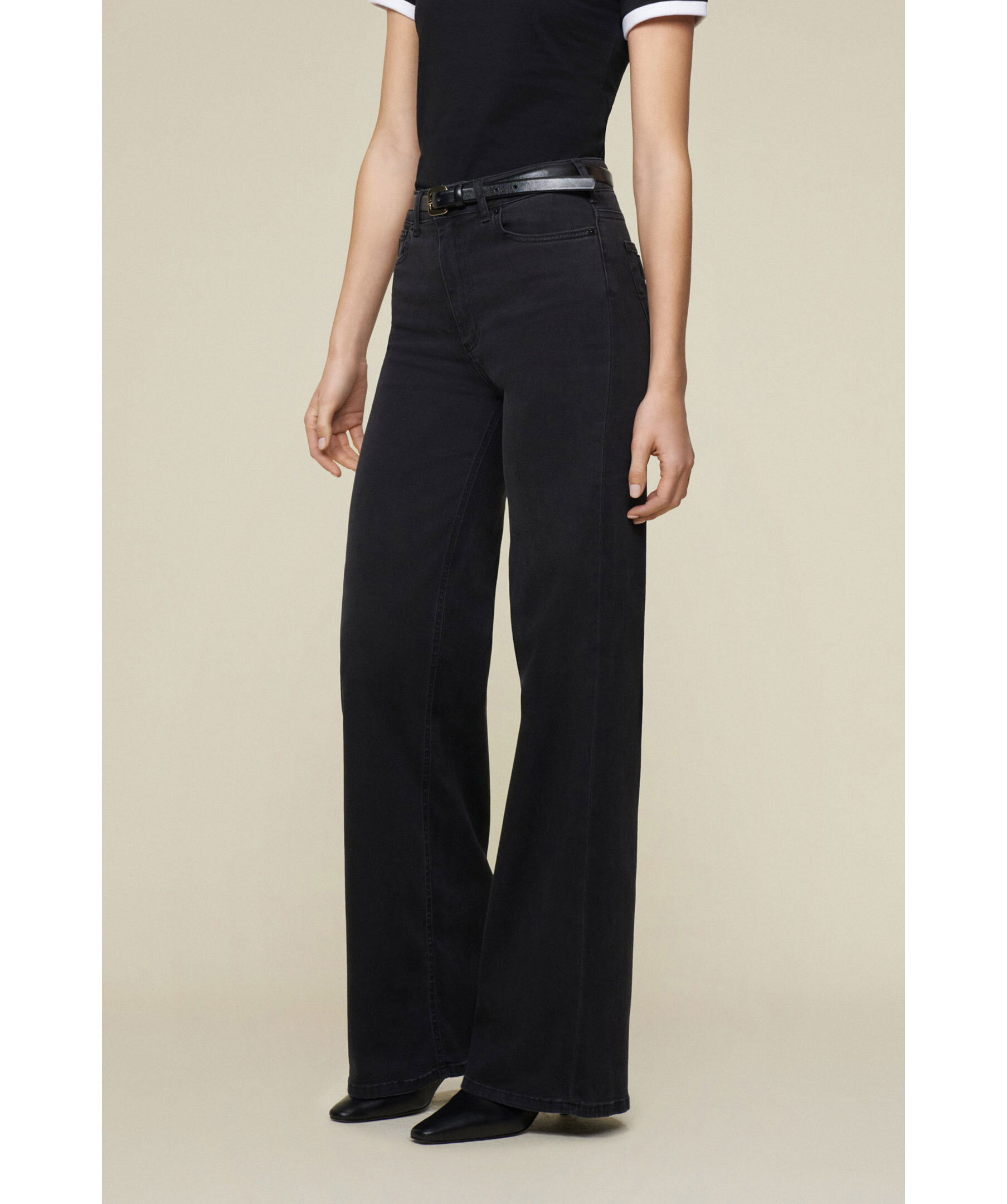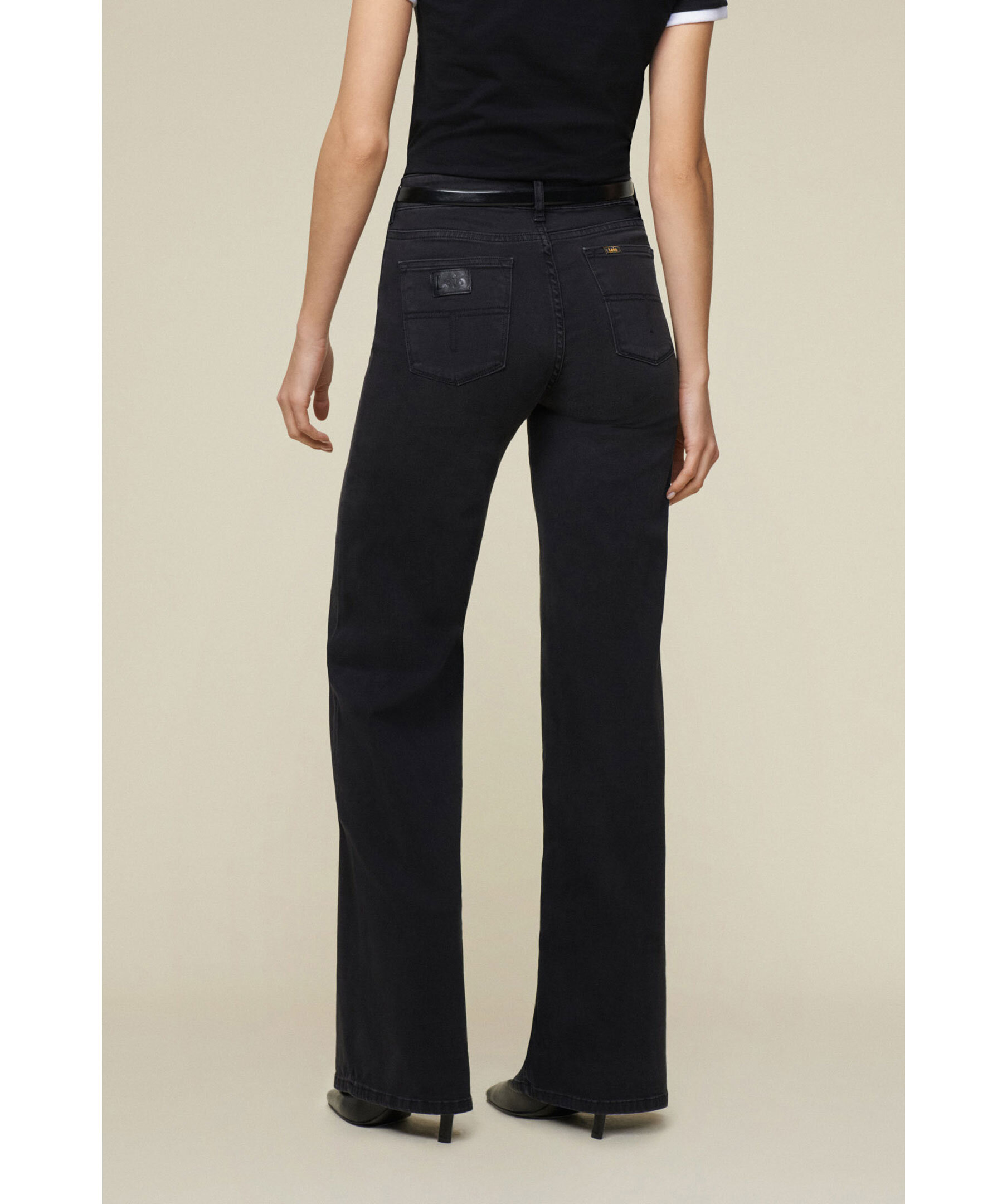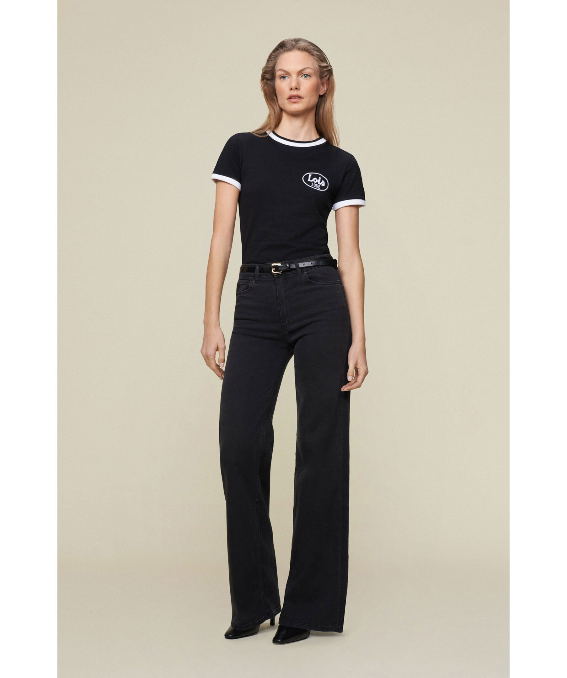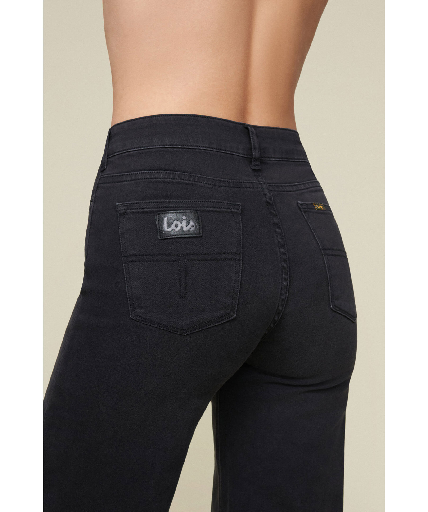 Svarta jeans från Lois. Jeansen har hög midja, fem fickor, logotyp-patch på ena bakfickan samt bälteshällor i midjan. Vida, utsvängda ben. Tillverkade i en bomullsblandning.