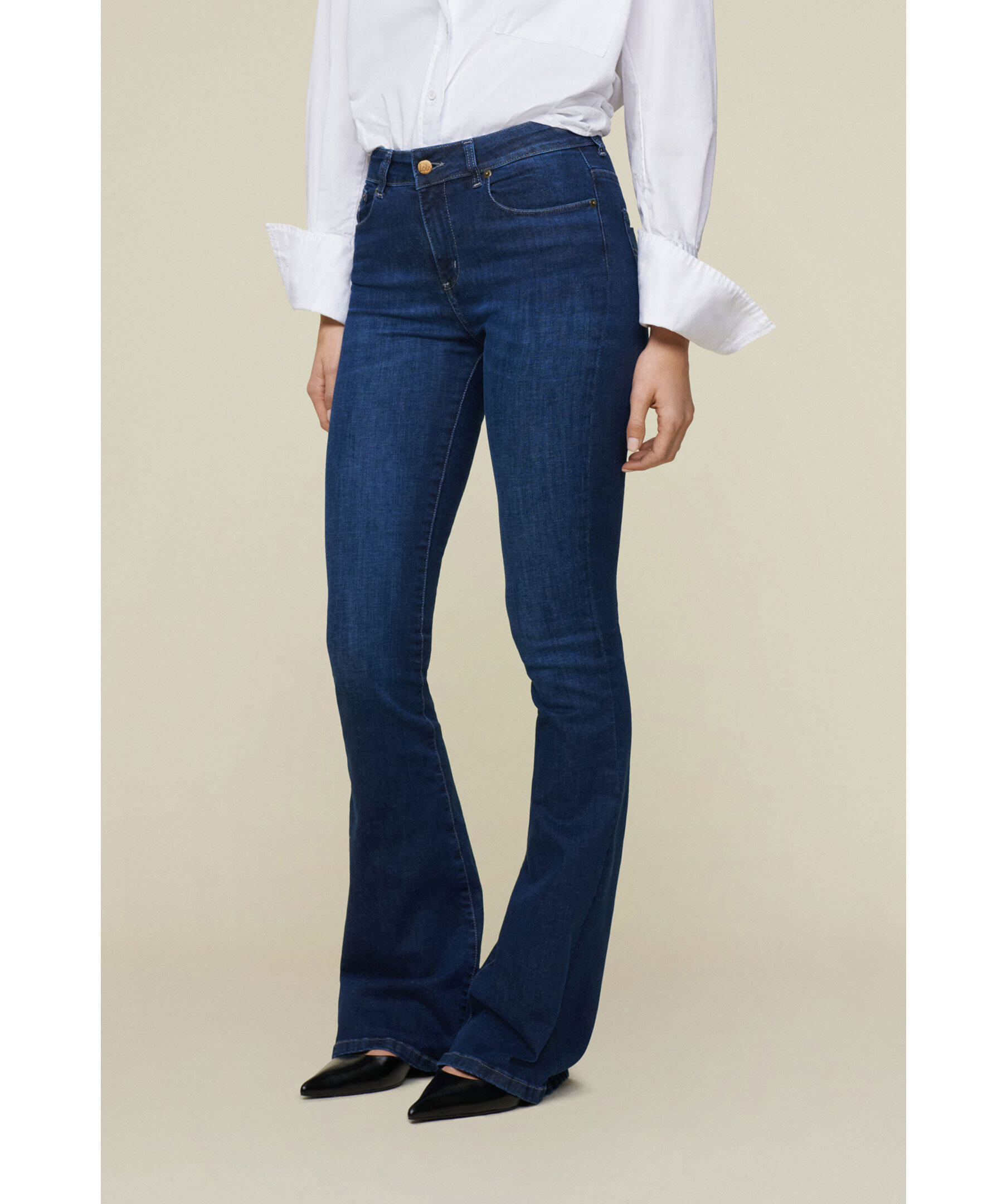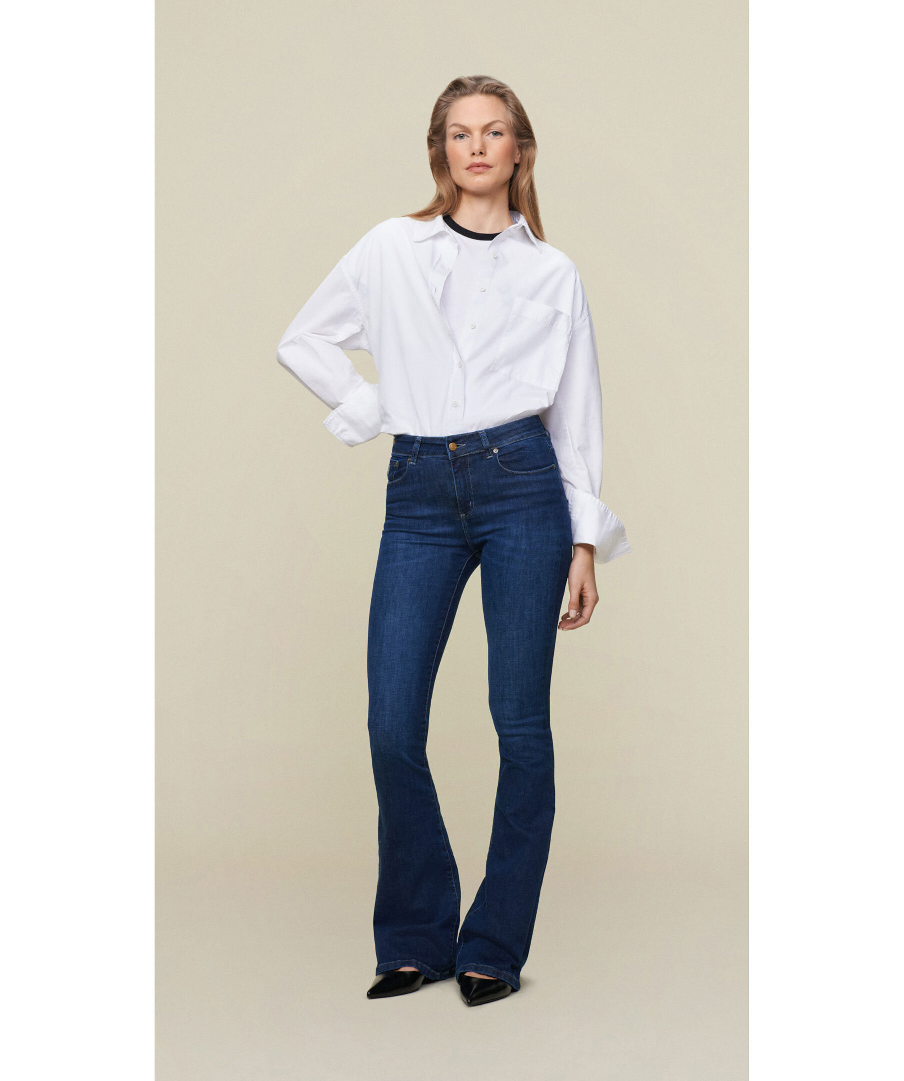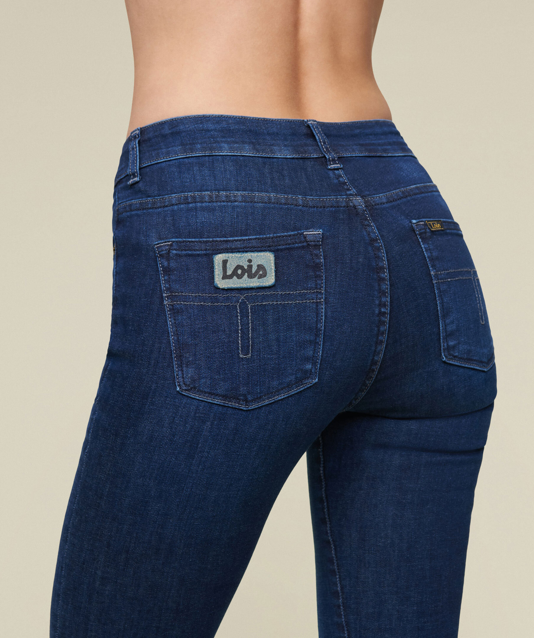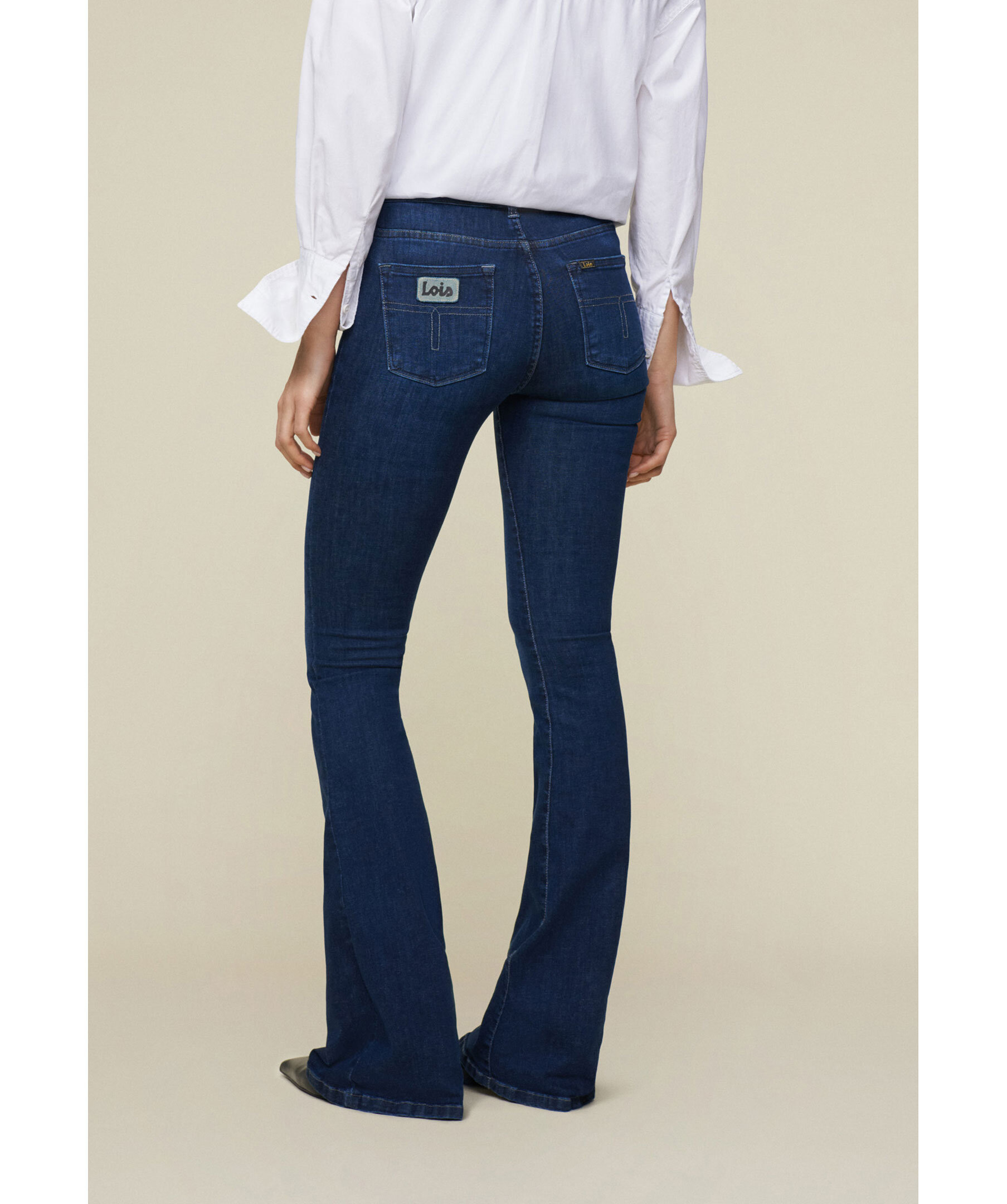 Mörkblå Jeans från Lois. Bootcut modell. Fem fickor. Hällor för bälte. Patch med Logotyp baktill på vänster ficka. Liten lapp med logotyp på högerbakficka. Tillverkad i bomulls blandning.