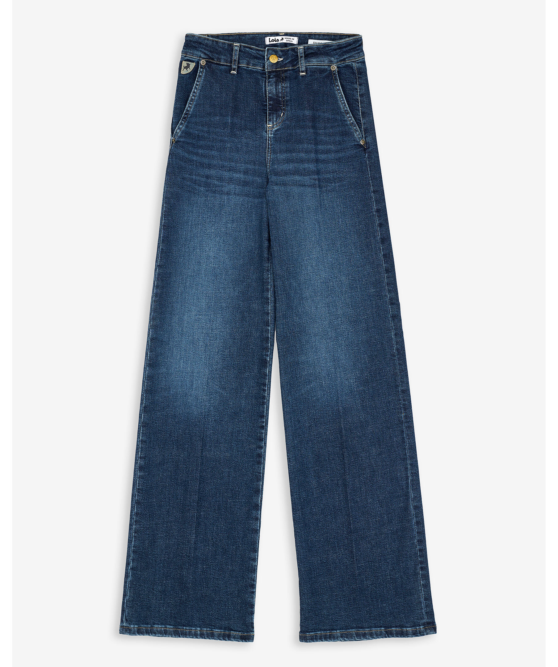 Mörkblå jeans från Lois. Jeansen har en hög midja, smal passform över höften och vida, utsvängda ben som skapar en smickrande siluett. Stretchigt material ger ökad komfort och rörelsefrihet – perfekta för både vardag och fest.
