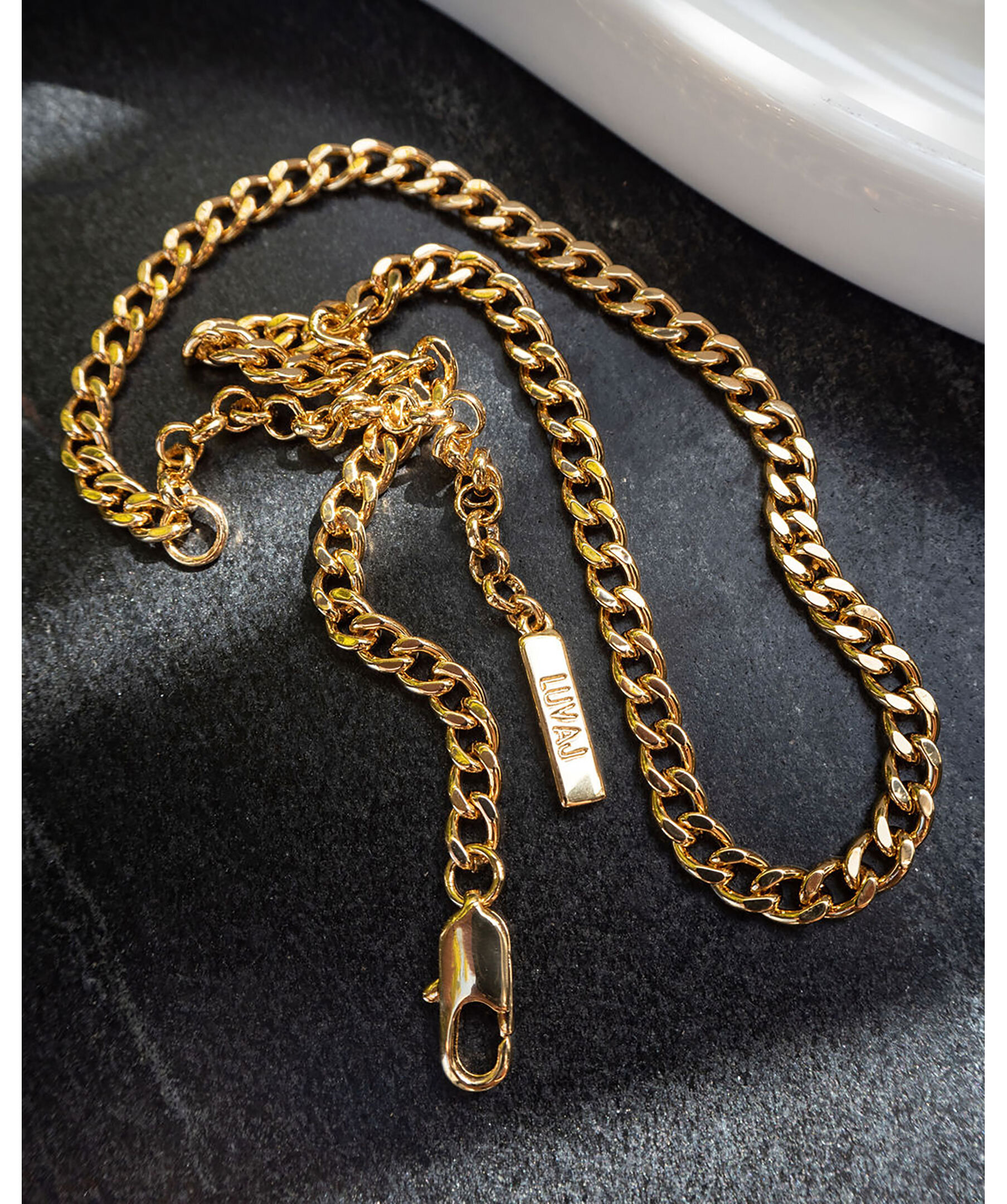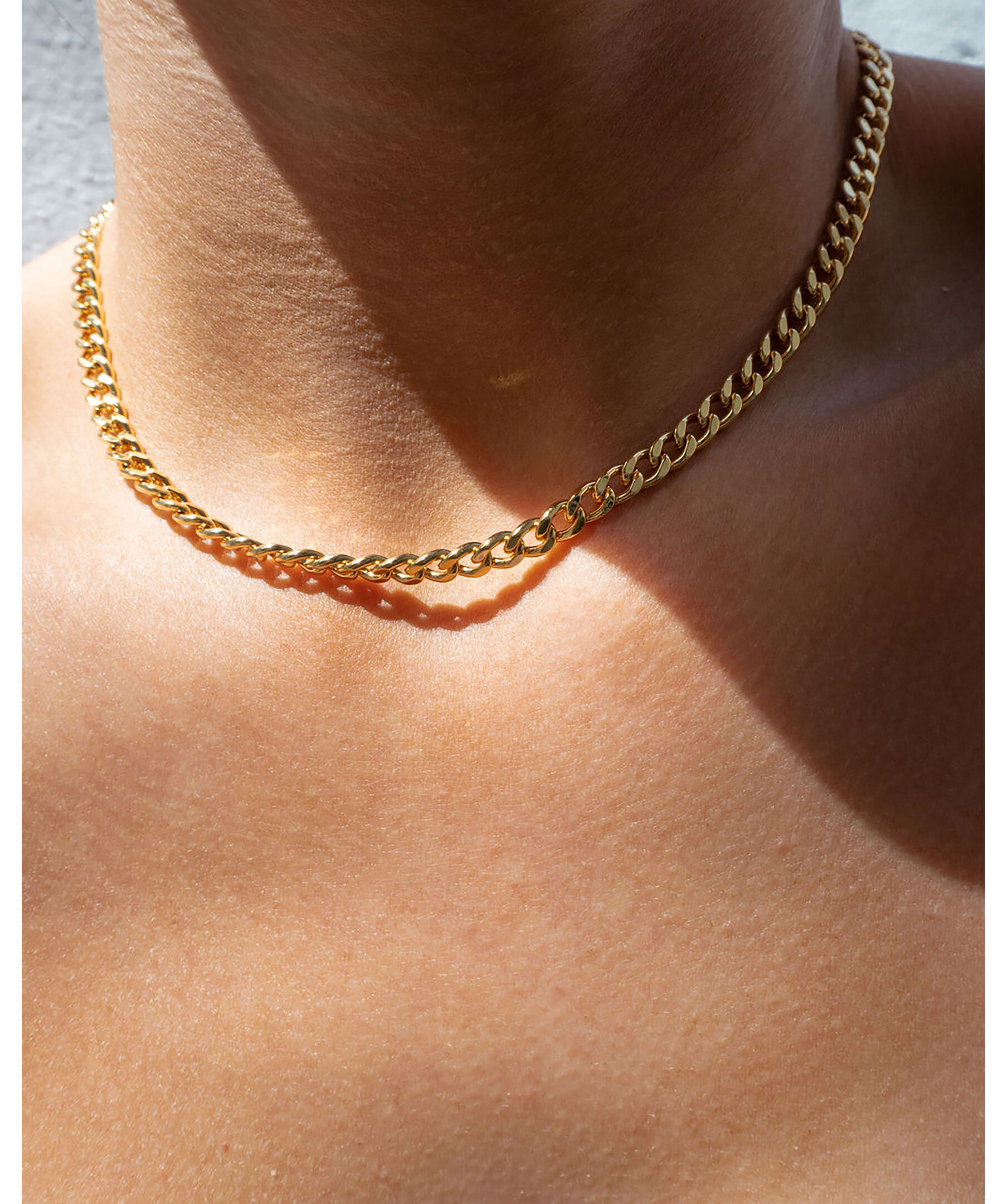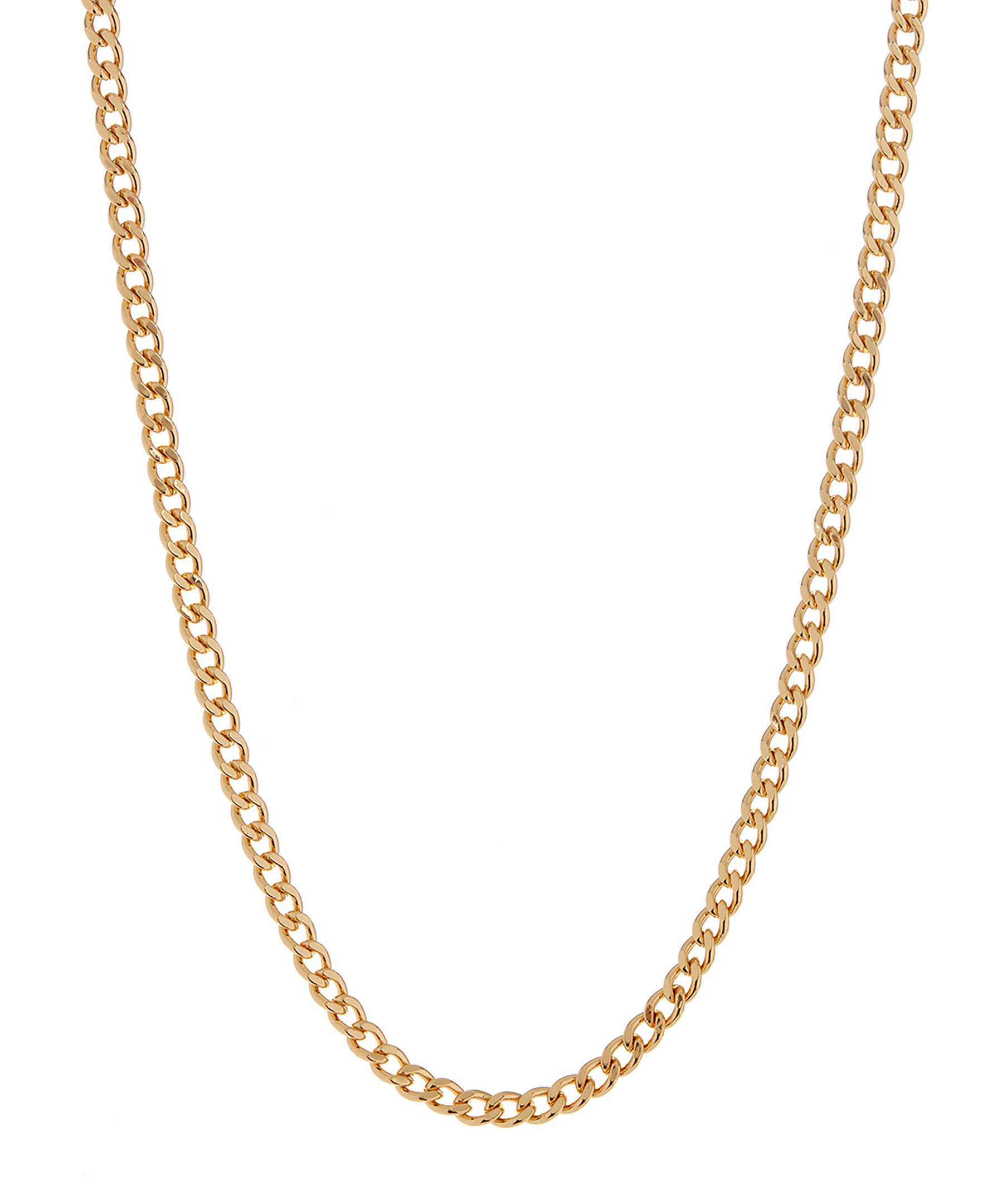 Guldfärgat kedjehalsband från Luv Aj. Passar perfekt att ha i sin enkelhet eller använda tillsammans med andra halsband. Tillverkad av mässing och är pläterad med 18 K guld samt har ett hummerklolås.