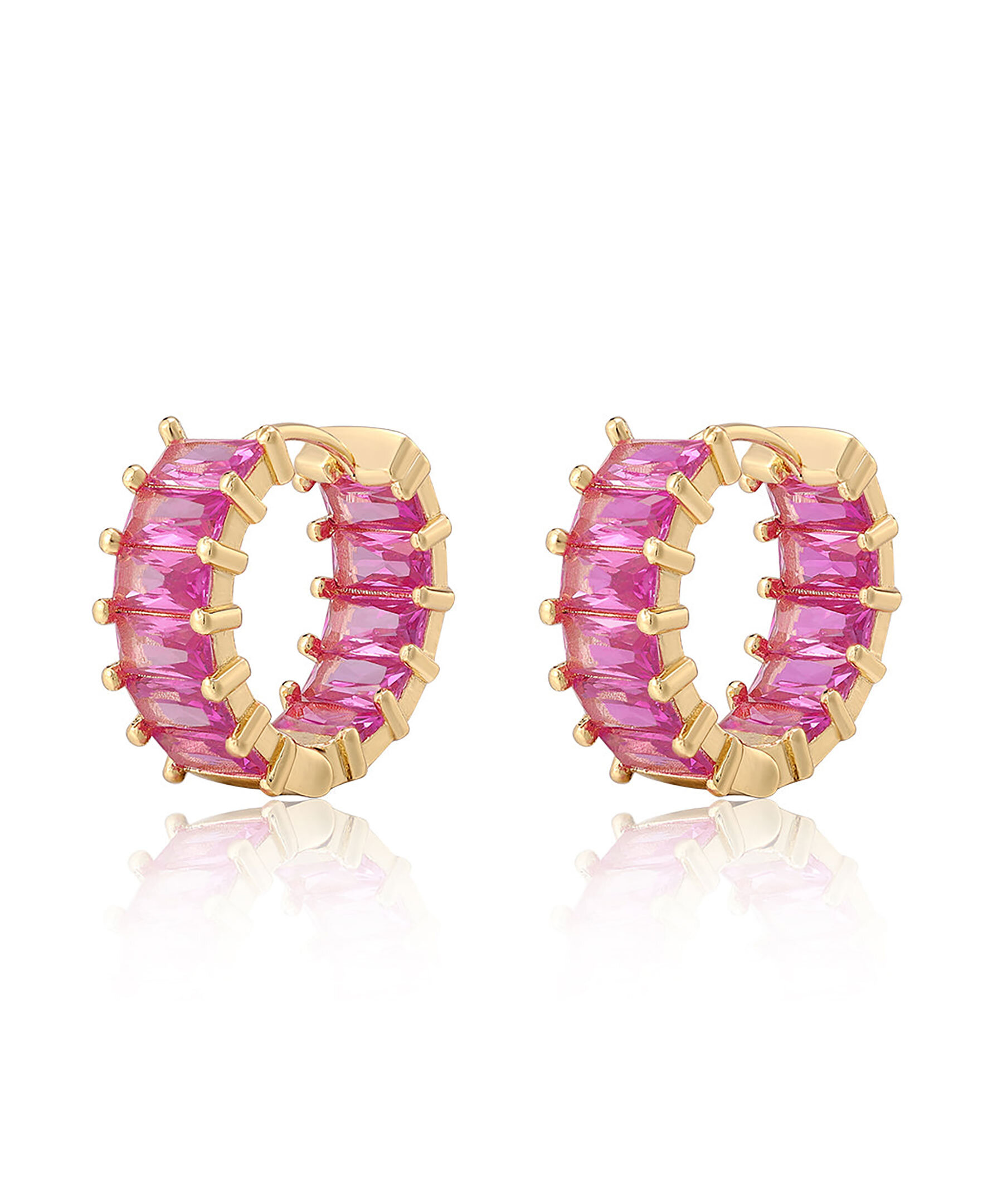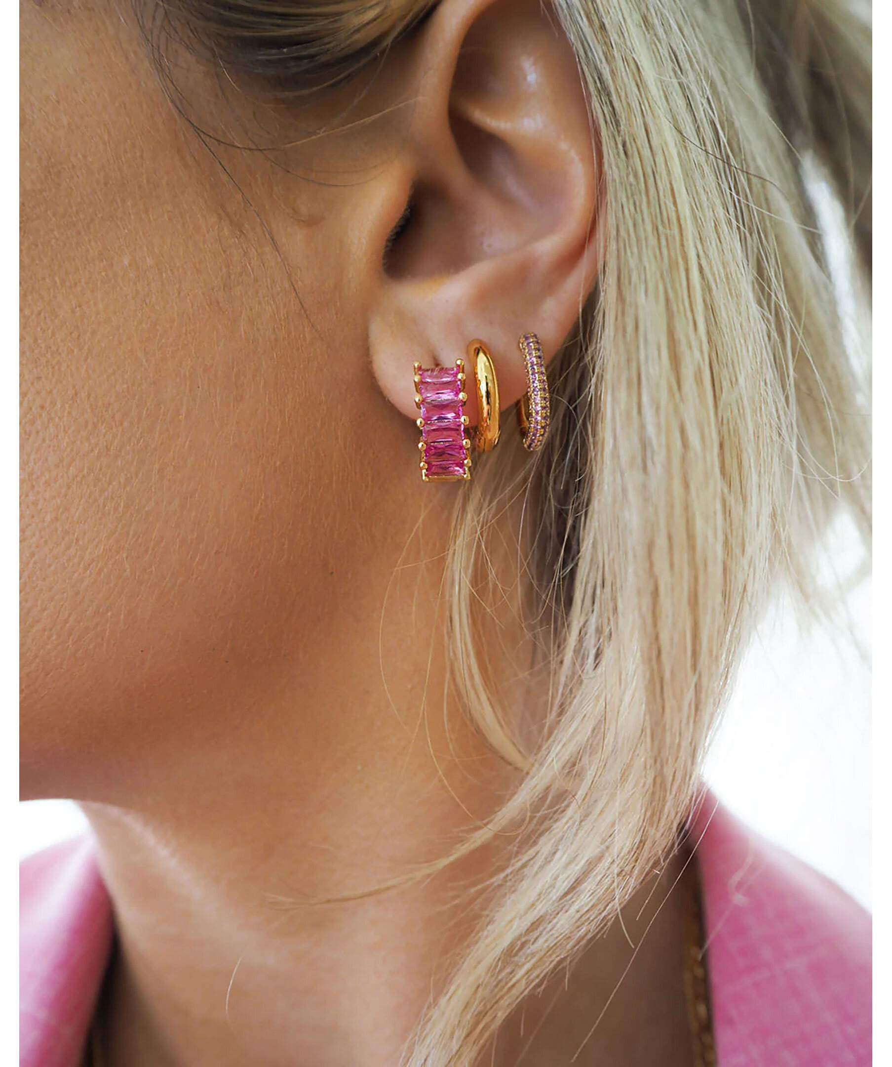 Guldfärgade örhängen från Luv Aj med rosa smargadskurna stenar. Tillverkade i guldpläterad mässing och Cubic Zirconia stenar. Stolparna är gjorda av kirurgiskt stål så de är mycket allergivänliga för känsliga öron