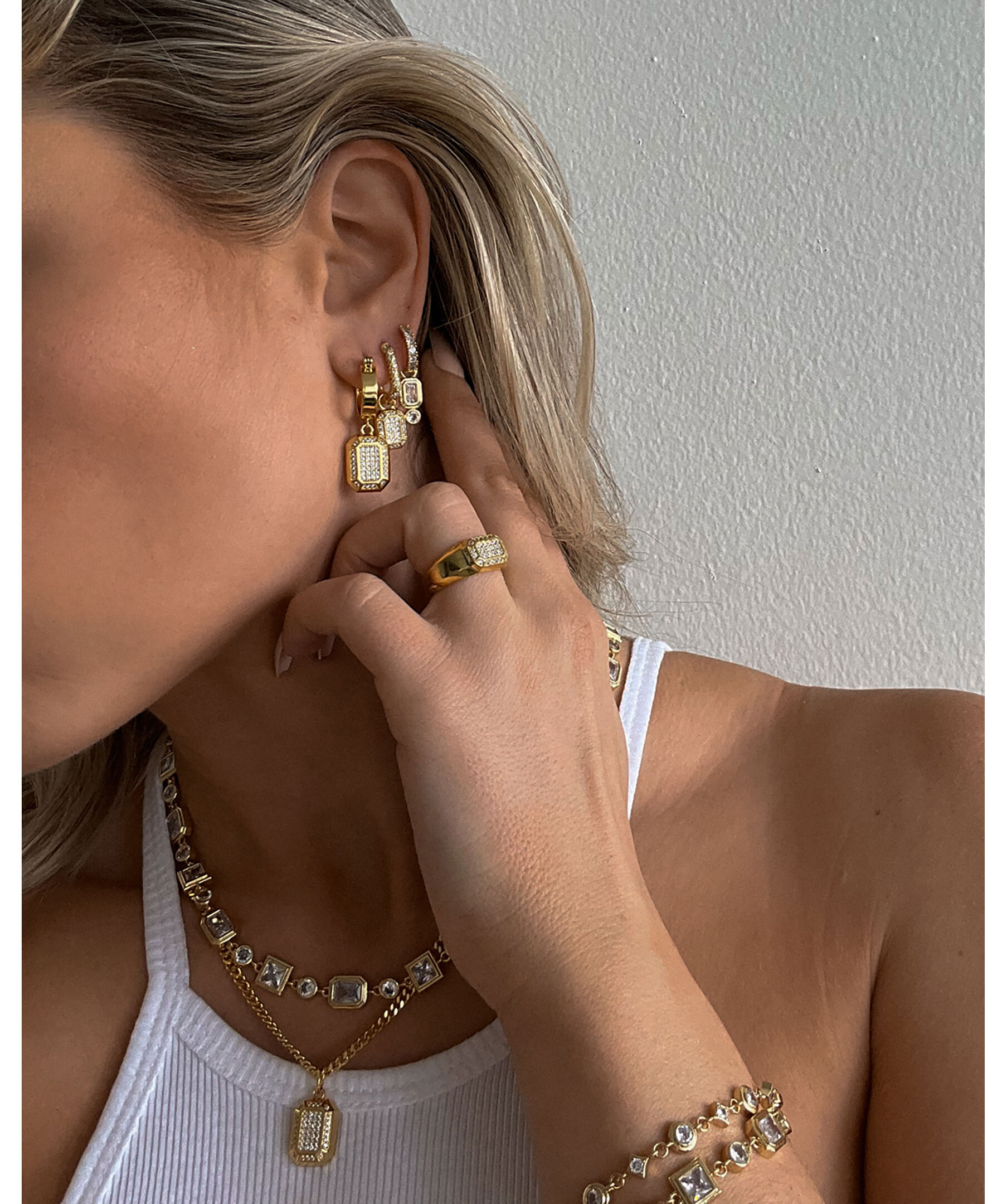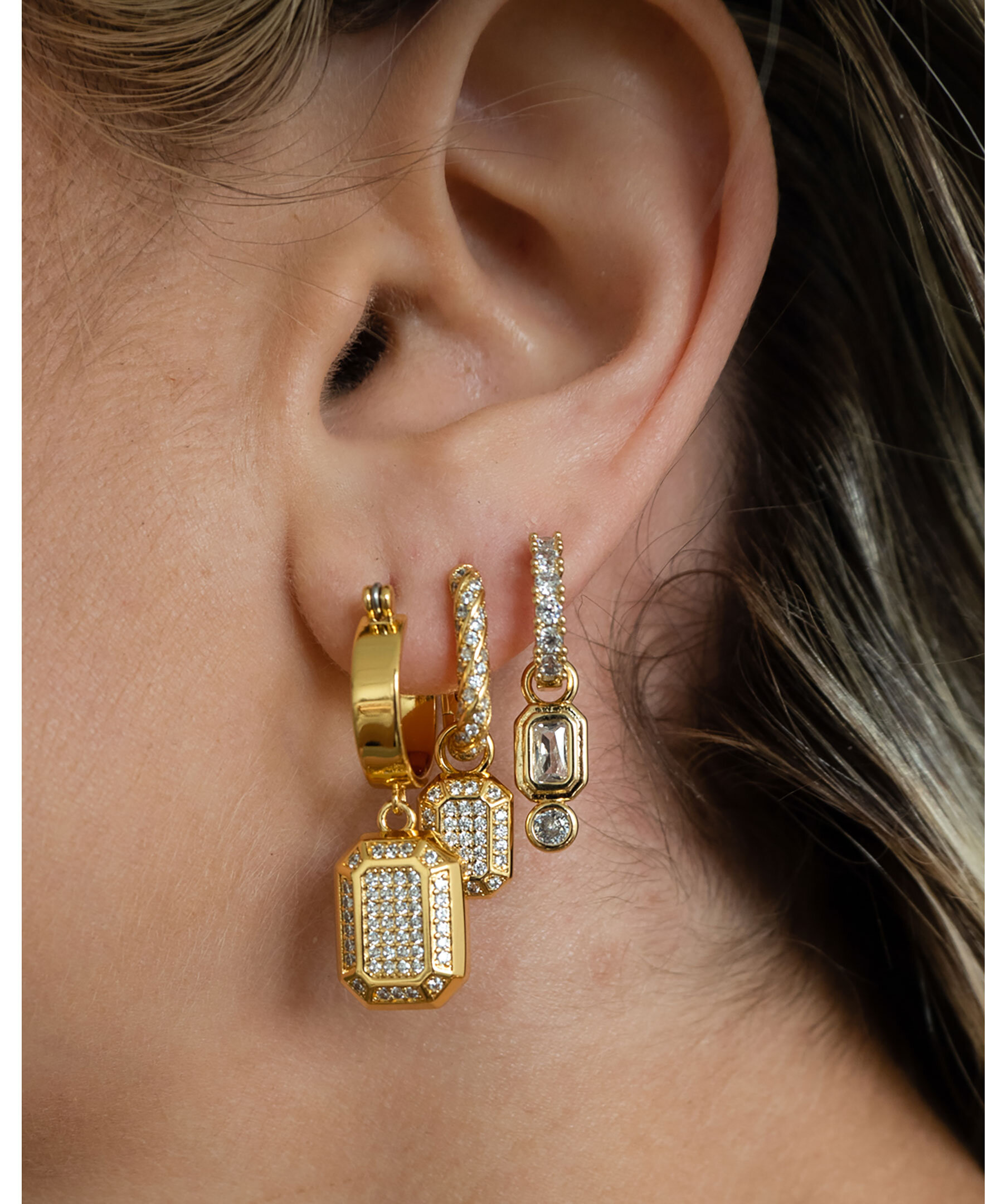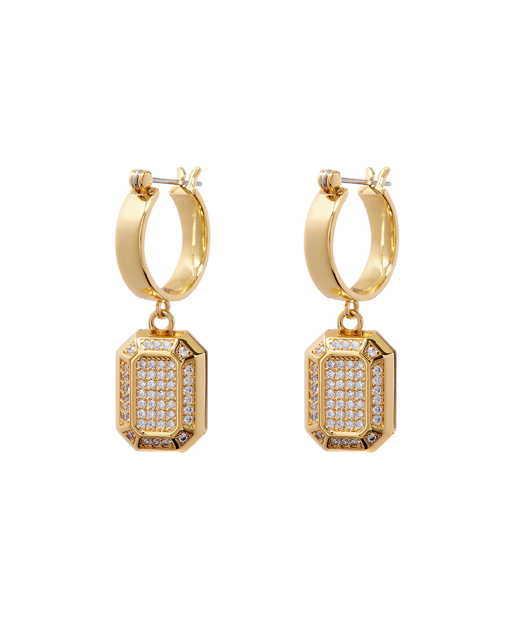 Guldpläterade örhängen från Luv Aj. Tunt, platt och ringformat örhänge med ett smaragdformat hänge täckt med CZ-stenar hängandes från ringen. Ringen är 1,4 cm, berlocken är 1,4 cm x 1 cm, totalt är örhänget 3 cm långt.Tillverkad av mässing med CZ-stenar och är pläterad med guld. Örhängena är 100% nickelfria och kadmiumfria.