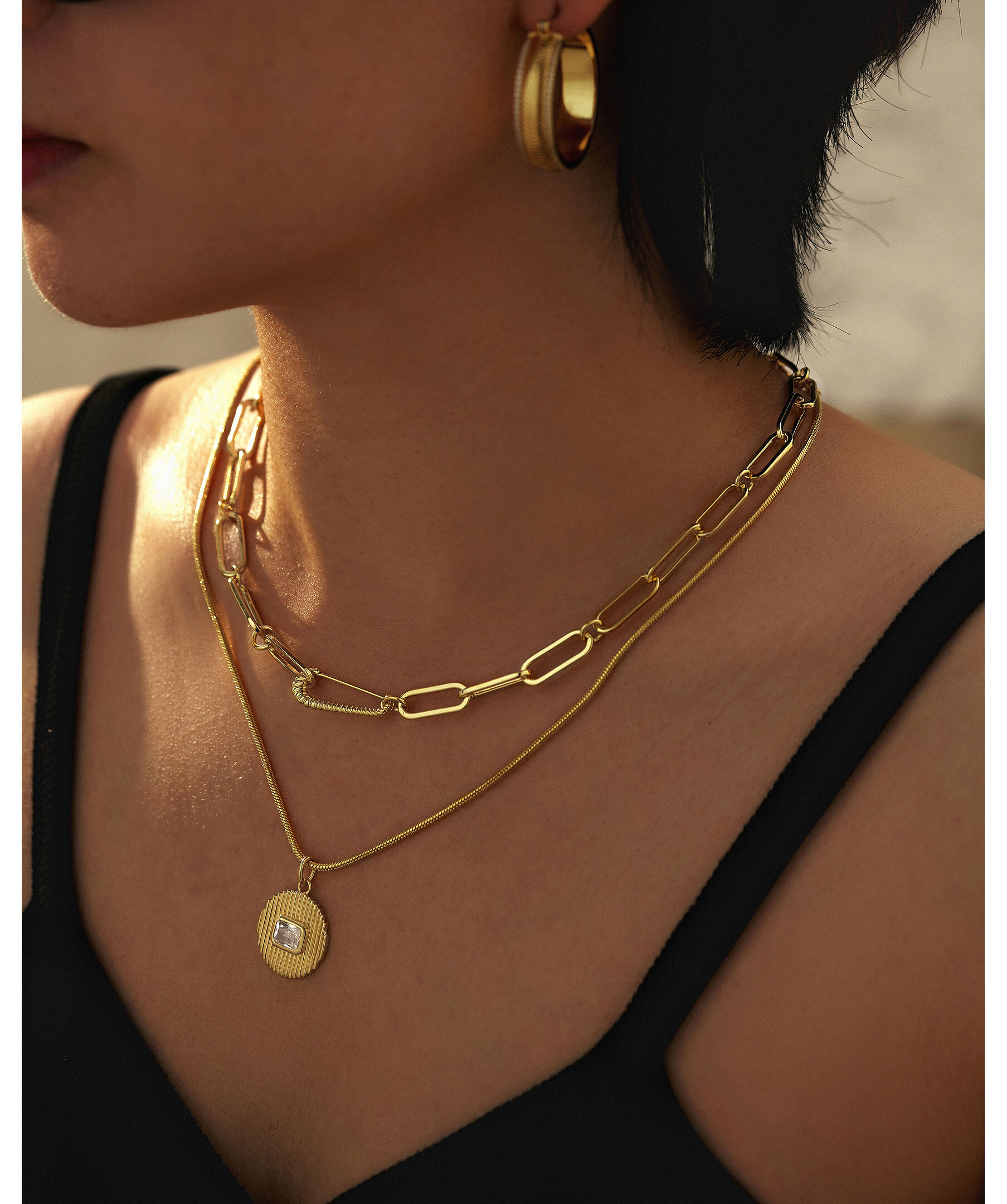 Guldpläterad, överdimensionerat ovalt länkkedjehalsband med en räfflad säkerhetsnålslås från Luv Aj.