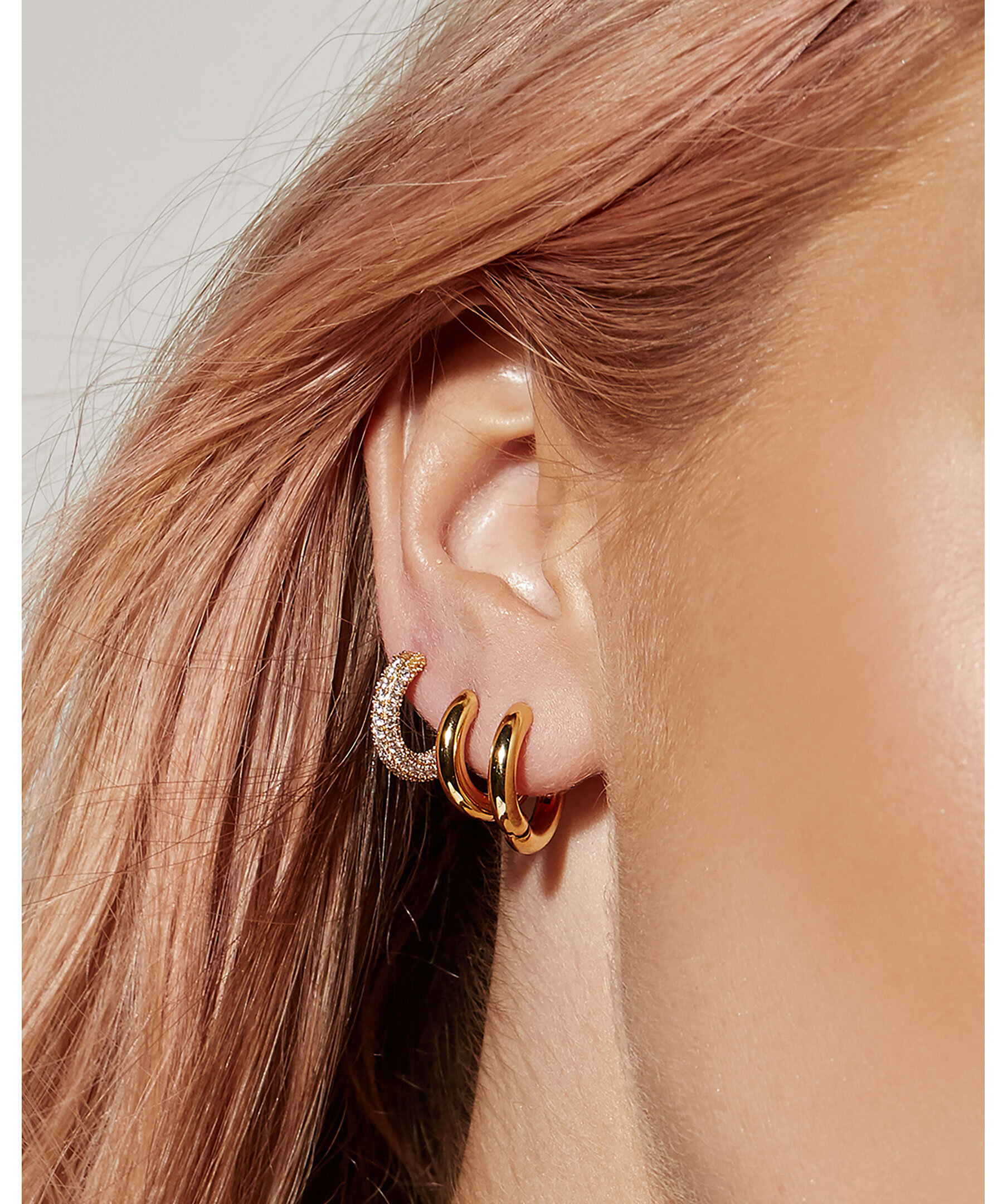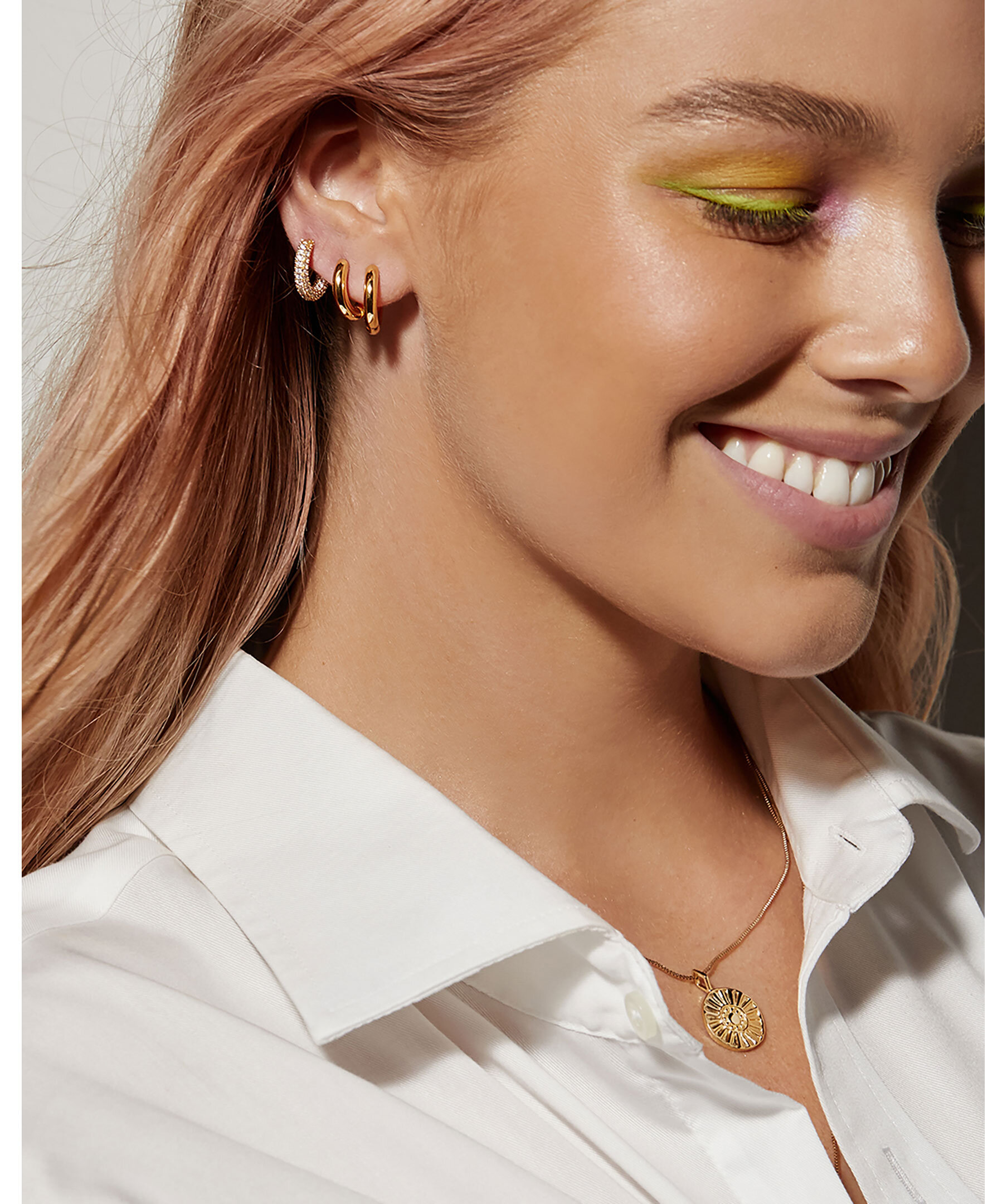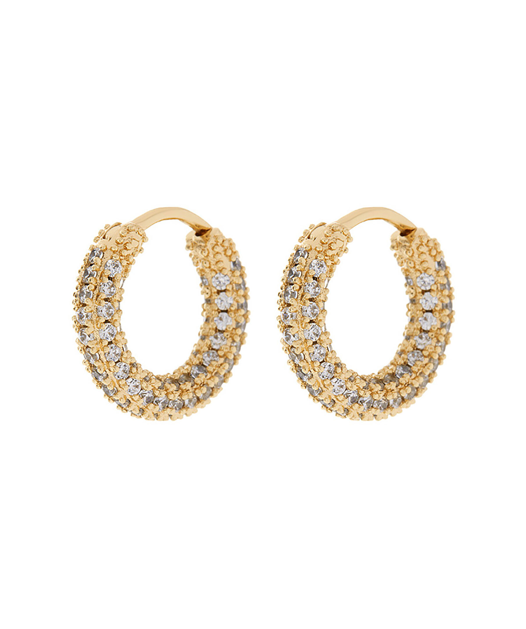 Guldfärgade, små ringörhängen med strasstenar från Luv Aj. Perfekta för vardagsbruk. Tillverkad av 14 K guldpläterad mässing och Cubic Zirconia stenar. Något böjd spakstängning för komfort.
