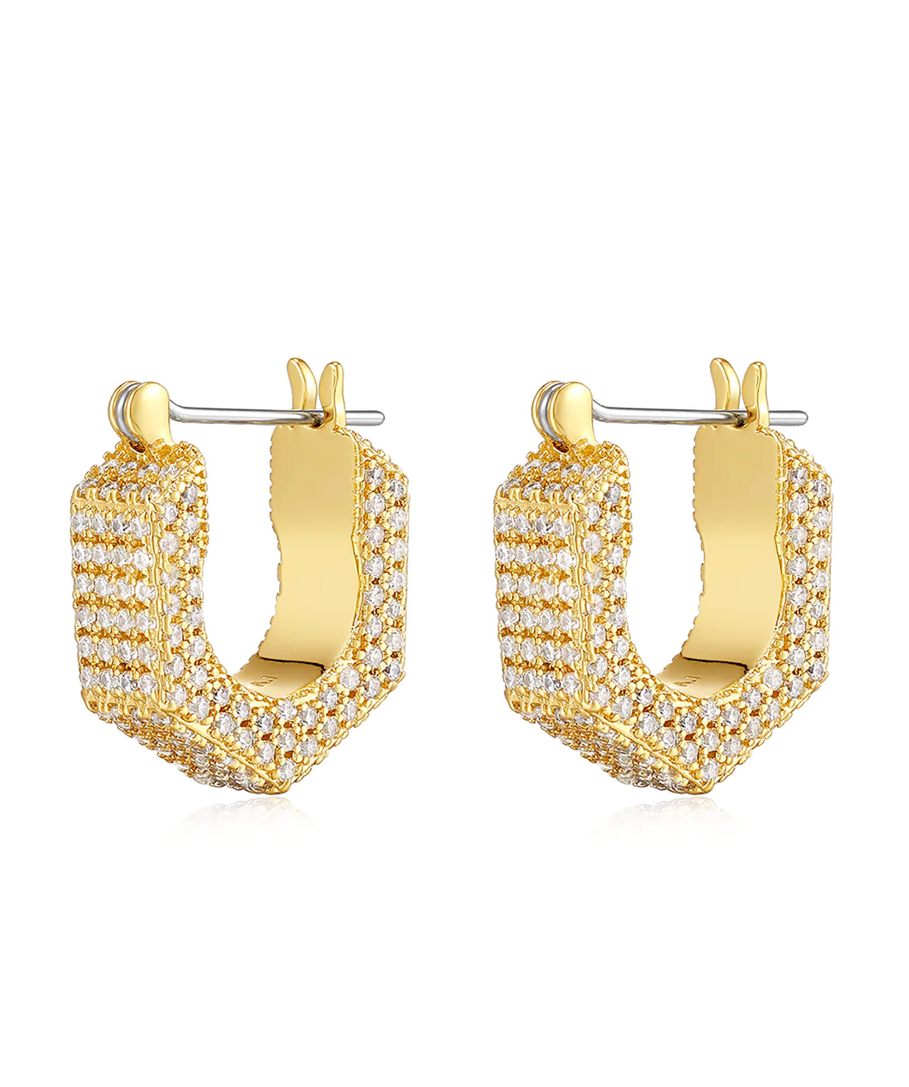 Guldfärgade örhängen med strasstenar från Luv Aj. Perfekta för vardagsbruk. Tillverkad av guldpläterad mässing och Cubic Zirconia stenar. Något böjd spakstängning för komfort. Örhängen är 100 % nickelfria och kadmiumfria.
