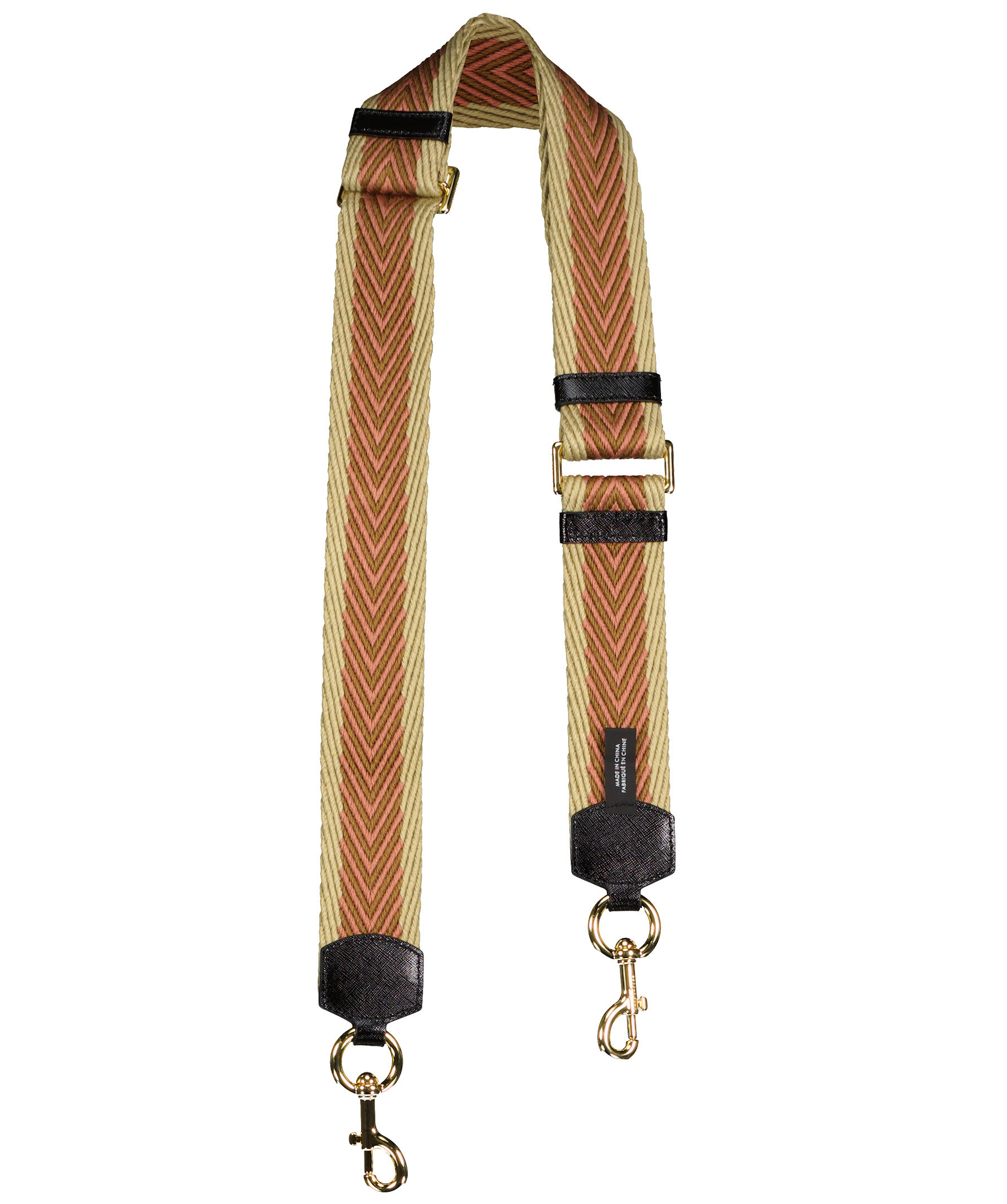 Beige, rosa och brun mönstrad justerbar vävd axelrem från Marc Jacobs. Med konstläder detaljer och guldfärgade spännen. 6 cm bred