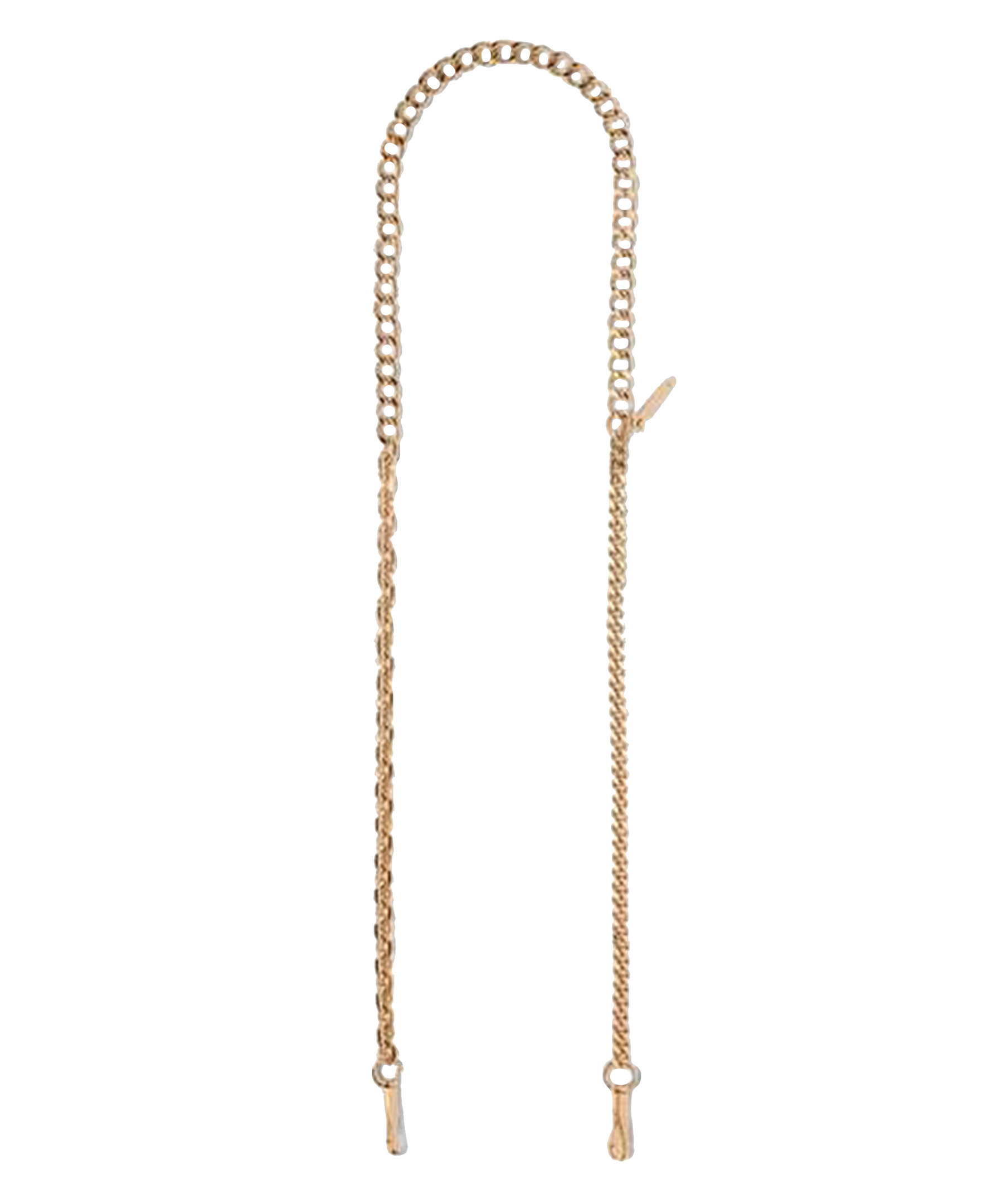 Guldfärgat kedjeband till handväska. Tillverkad i järn och zink. Dubbla guldfärgade spännen och olika storlek på kedjan. Mått: 125 cm L x 2 cm B.