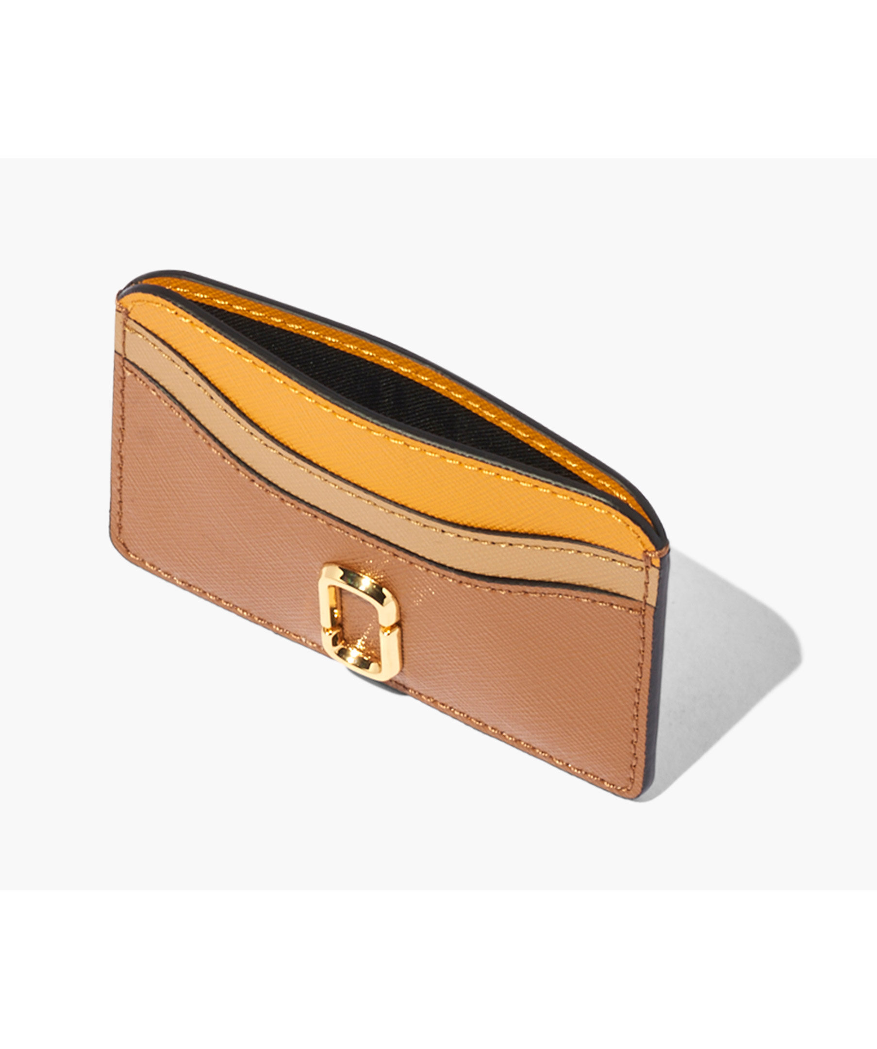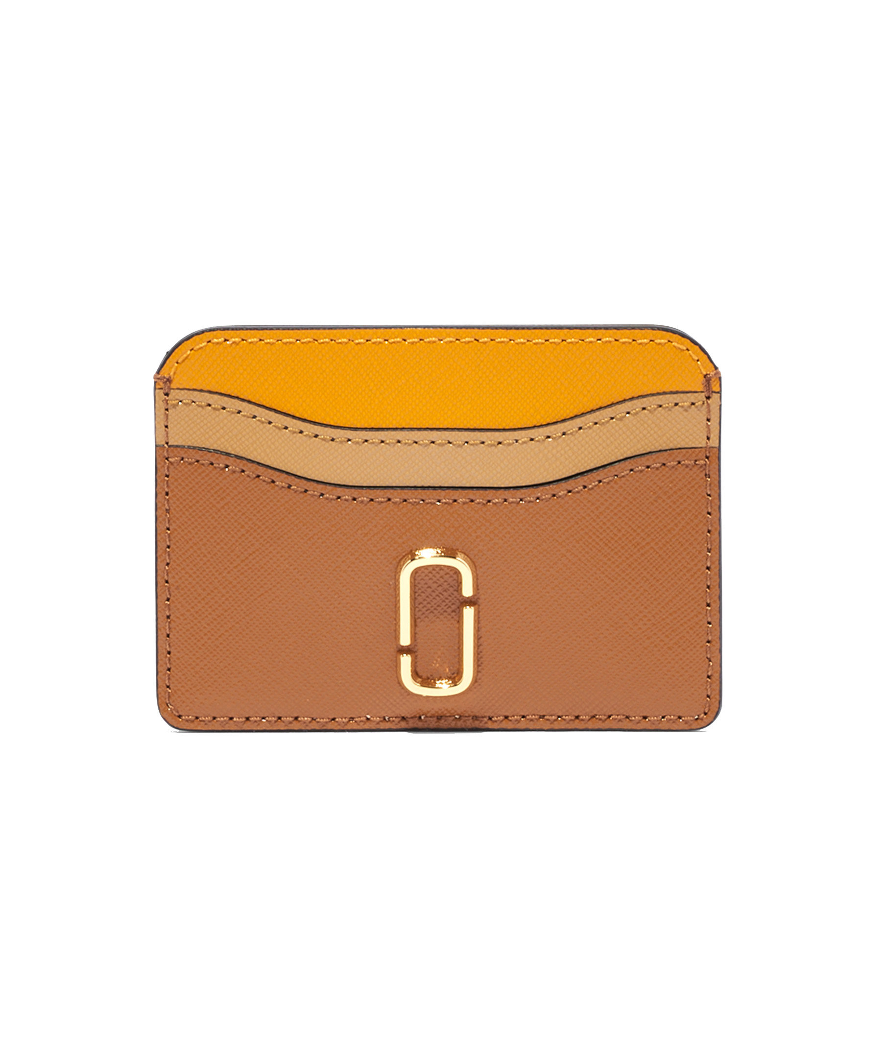 Gul, beige och brun korthållare i läder från Marc Jacobs. Två fickor på vardera sida och logotyp i guldfärgad metall på framsidan.
