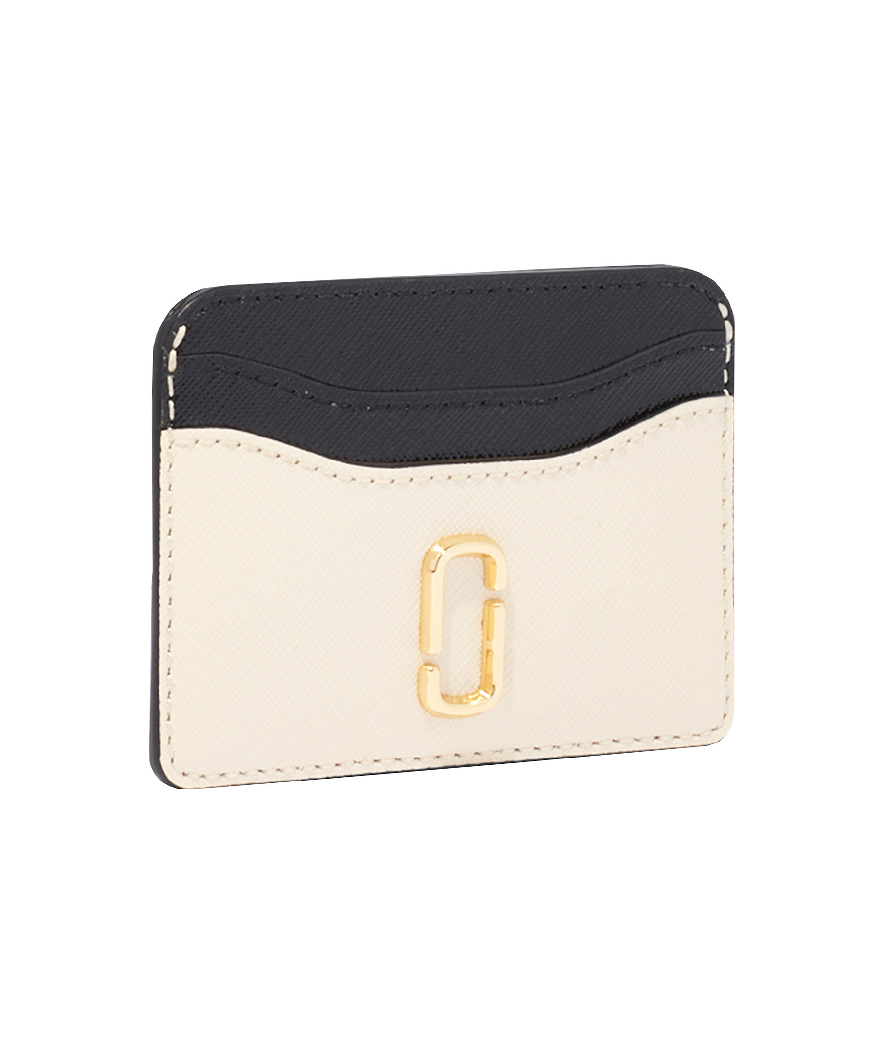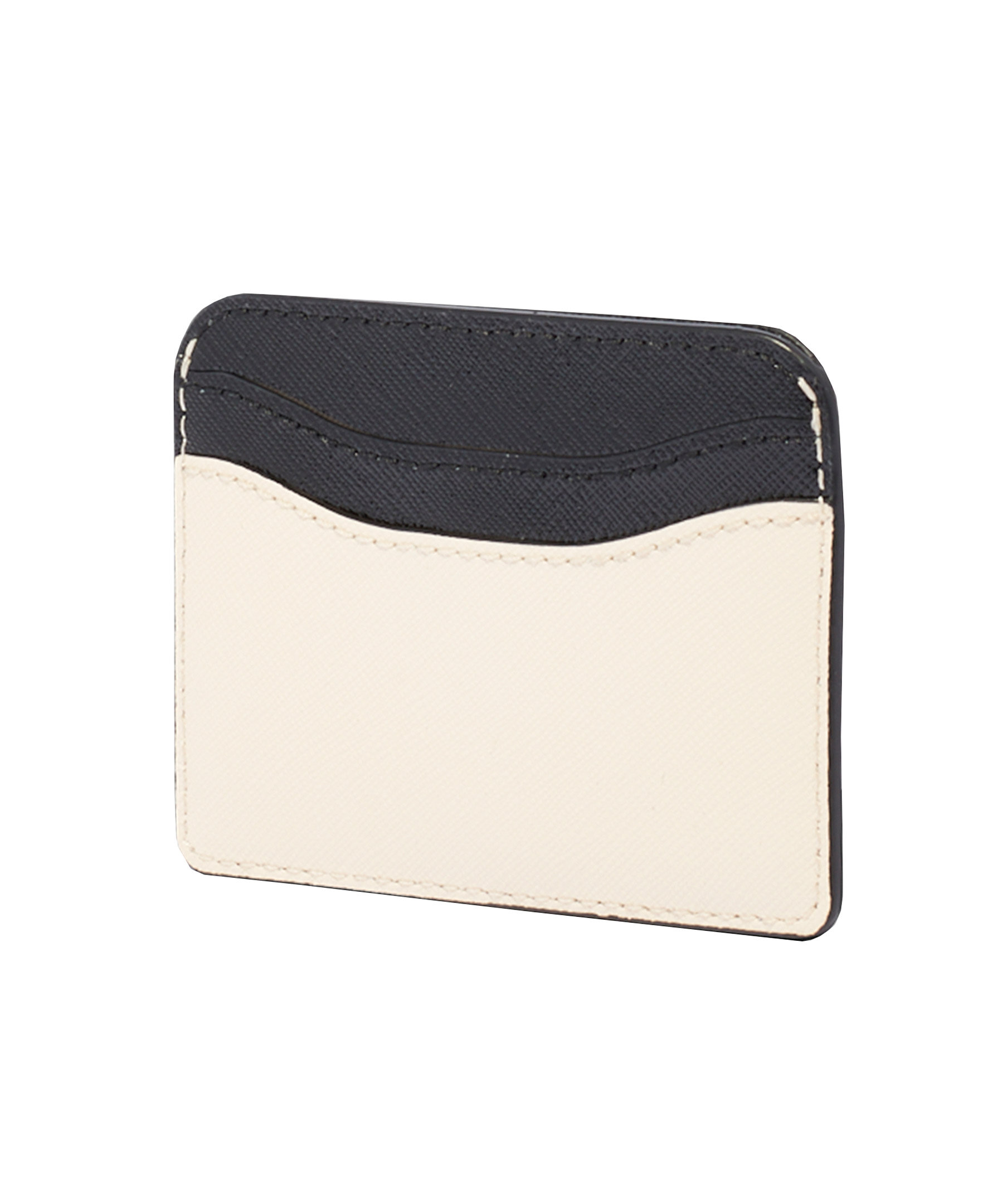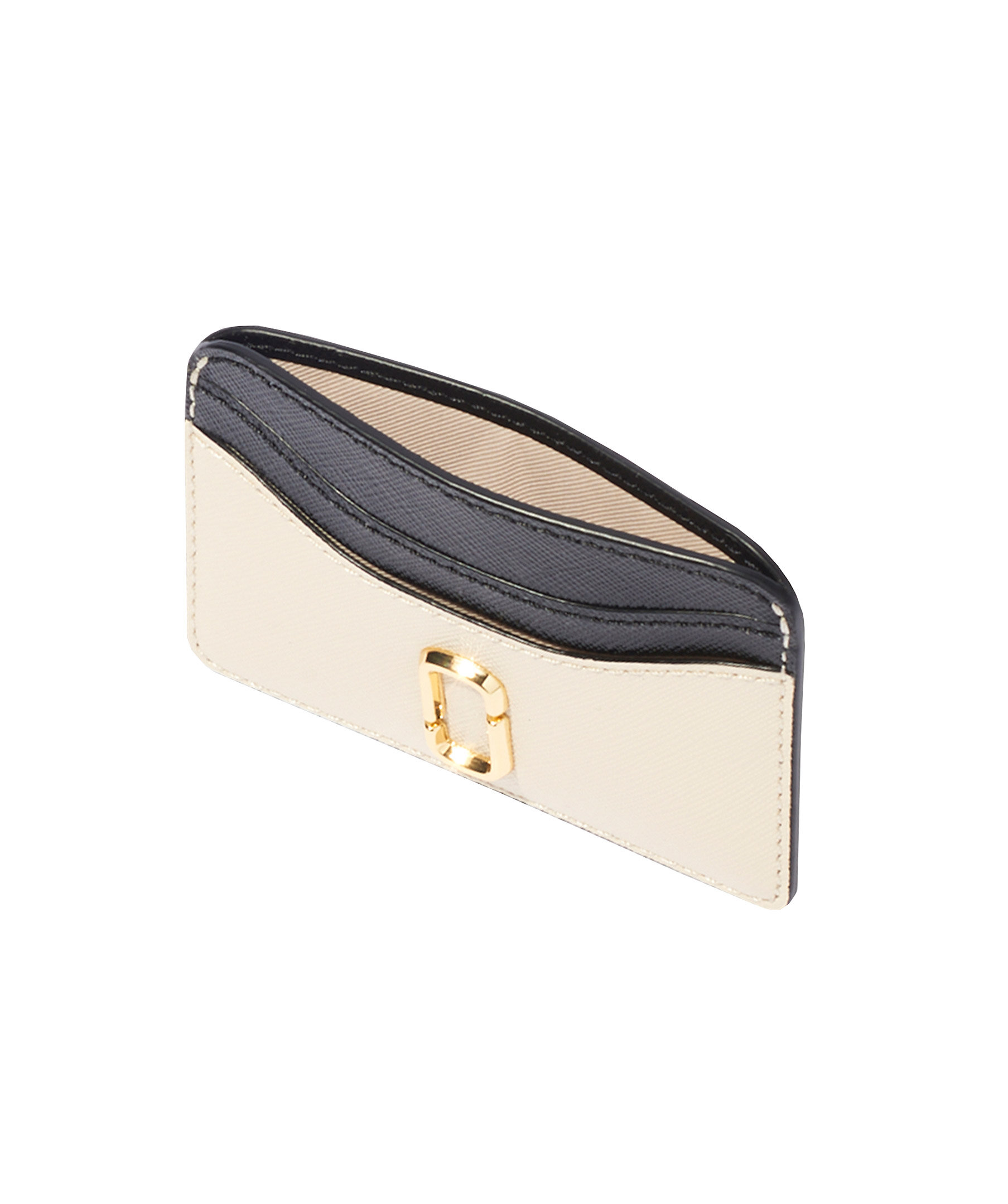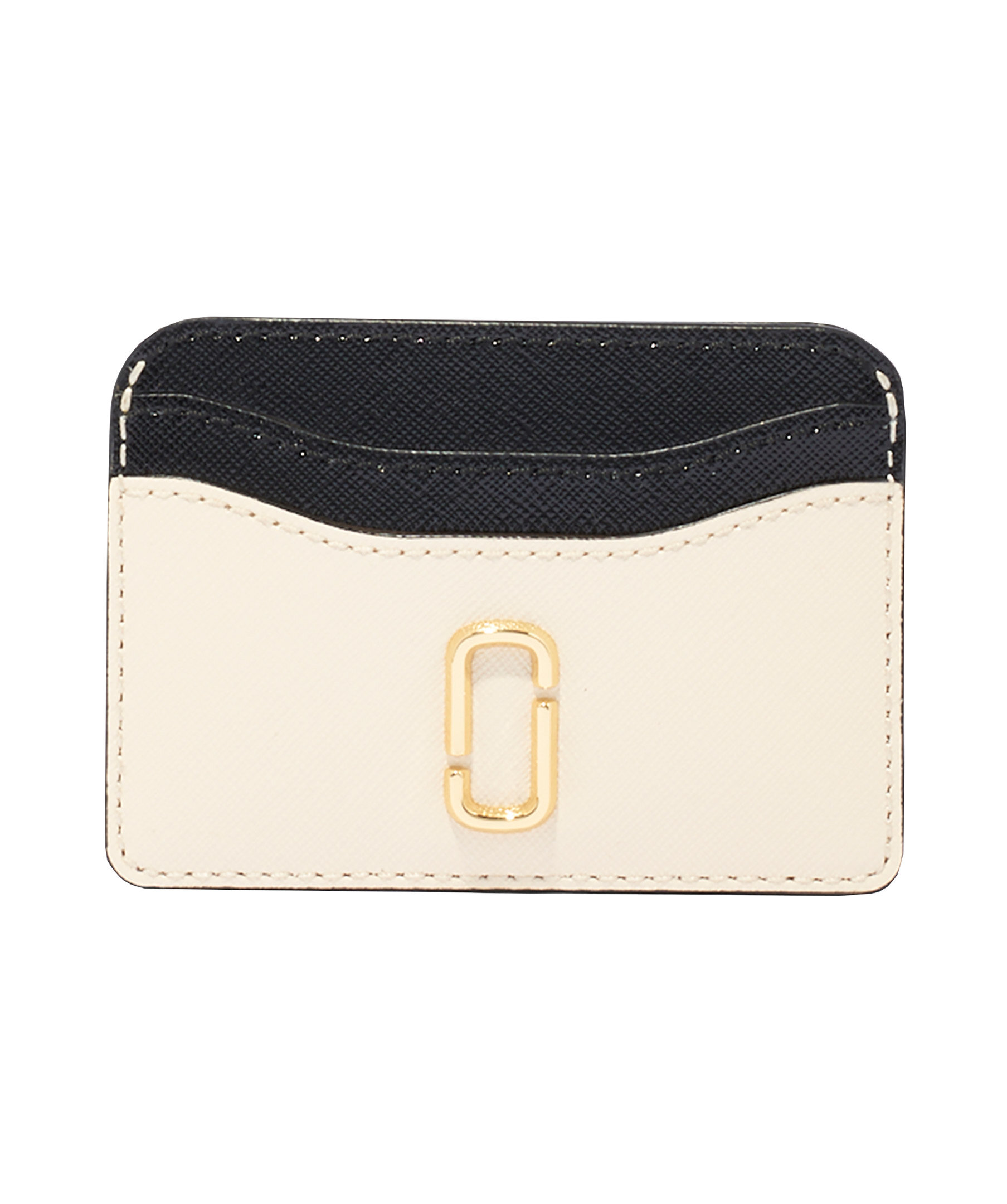 Krämvit och svart korthållare i saffiano läder från Marc Jacobs. Två fickor på vardera sida, ett mittficka och logotyp i guldfärgad metall på framsidan. Mått: 10 cm L x 0,5 cm D x 7 cm H.