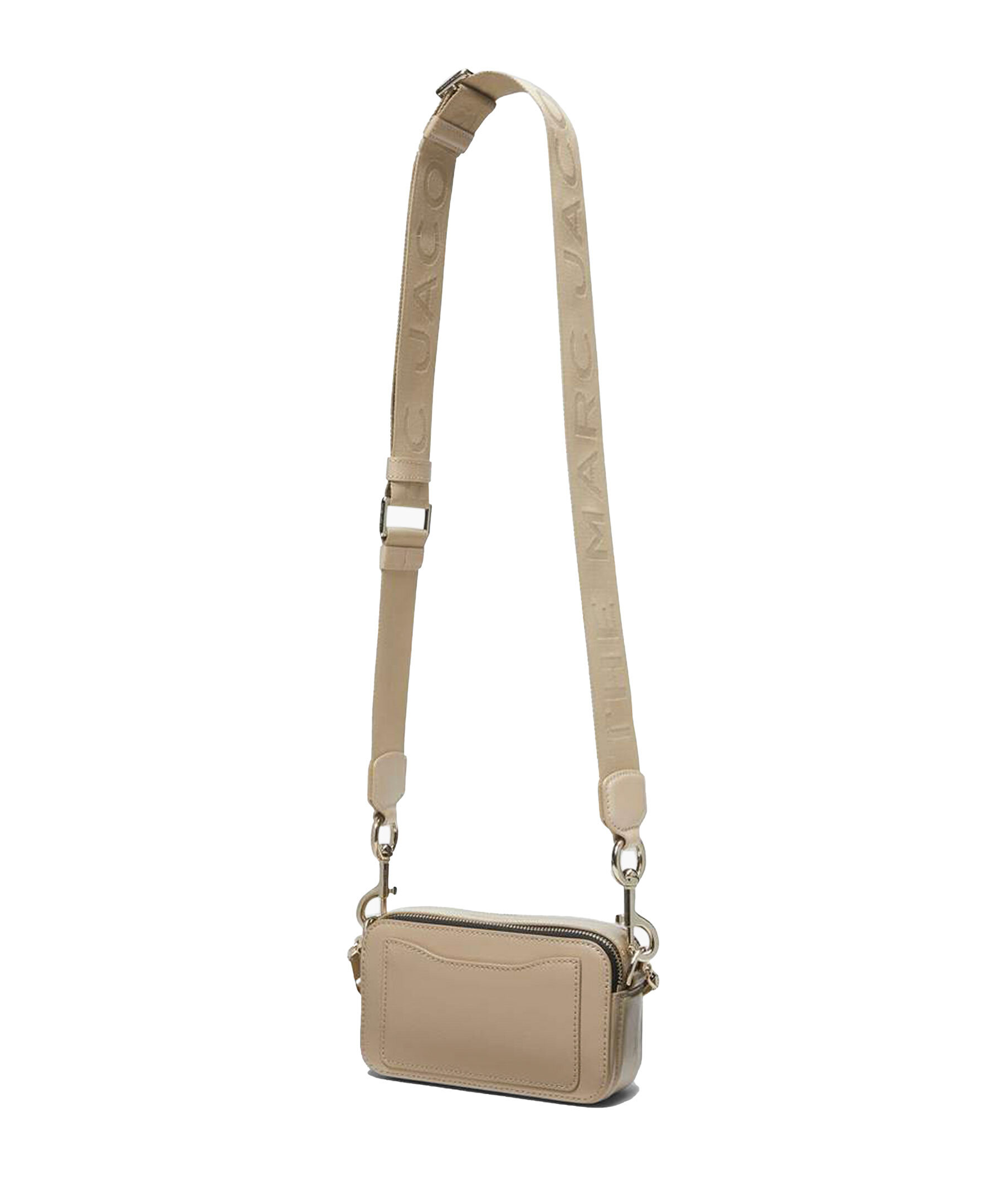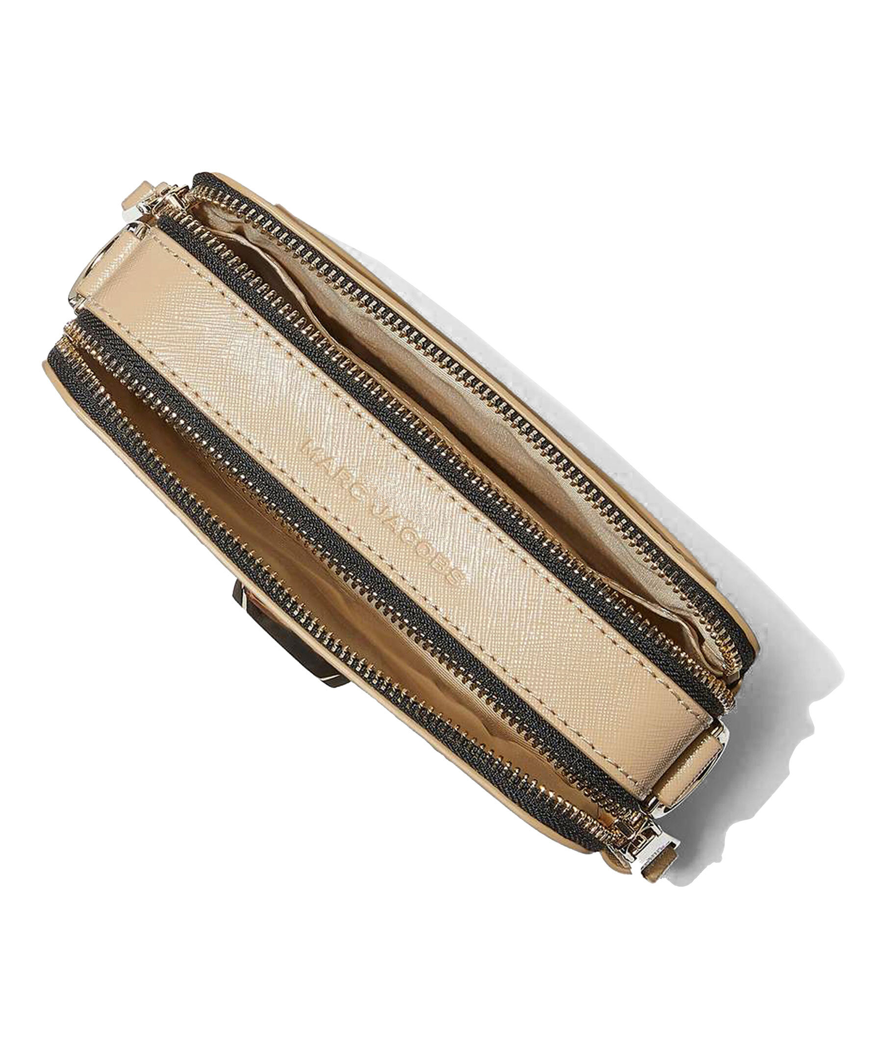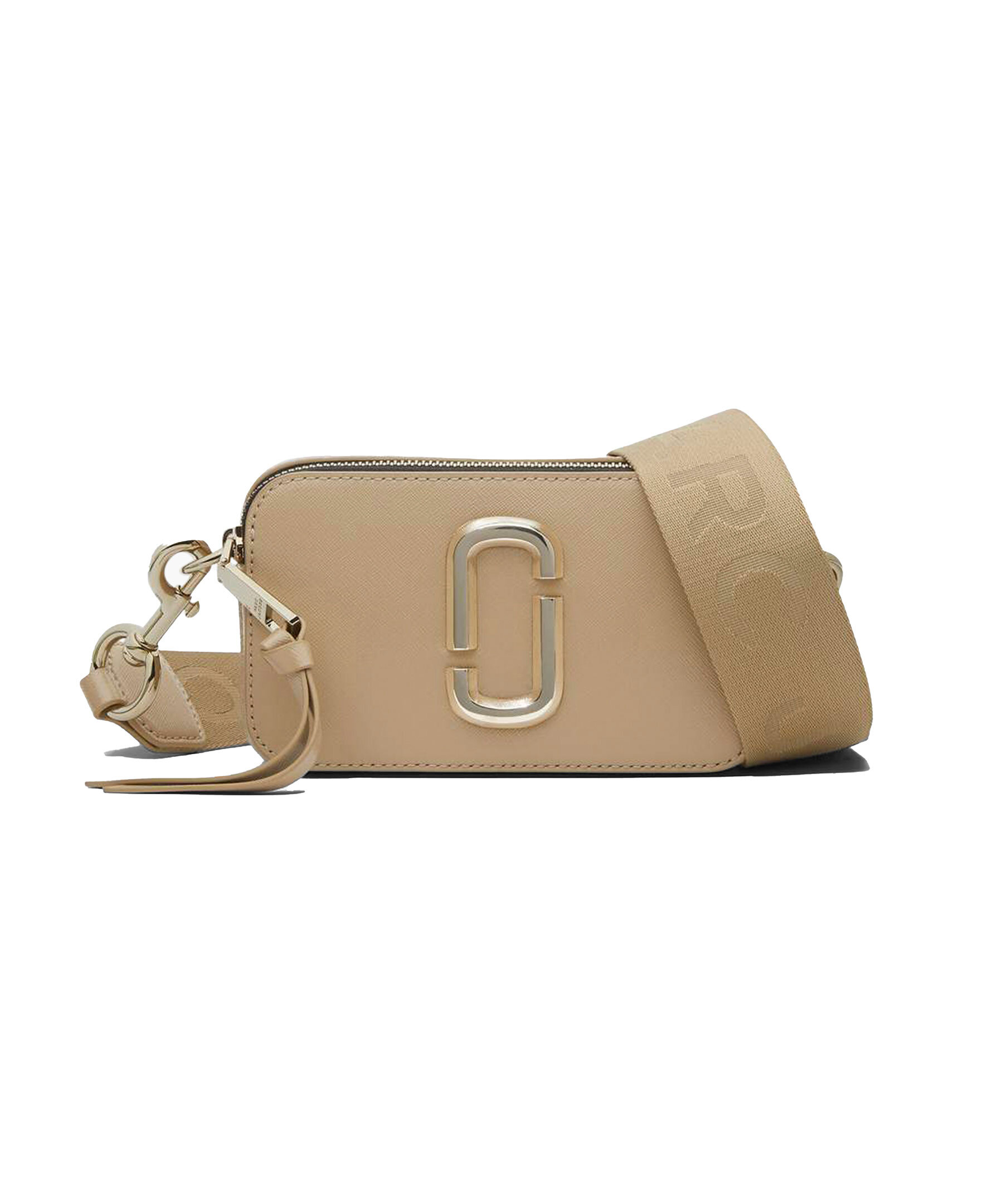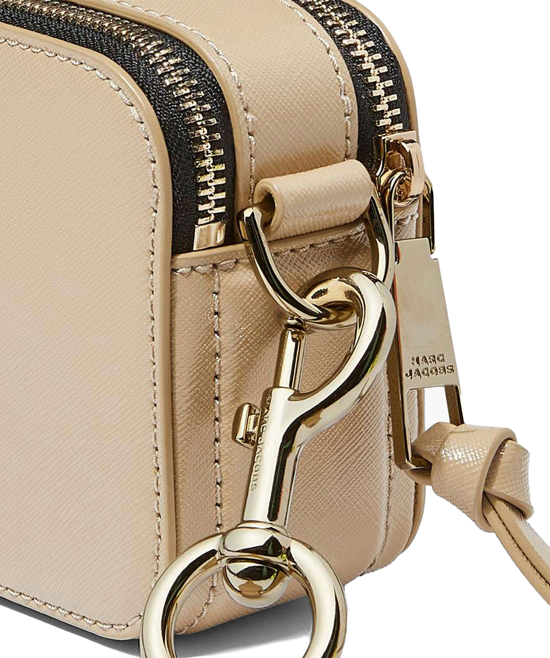 Beige, liten handväska från Marc Jacobs. Camera bag stil, saffiano läder, justerbart axelband. Två fack med dragkedja, en ytterficka. Svarta detaljer, svart logga framtill.