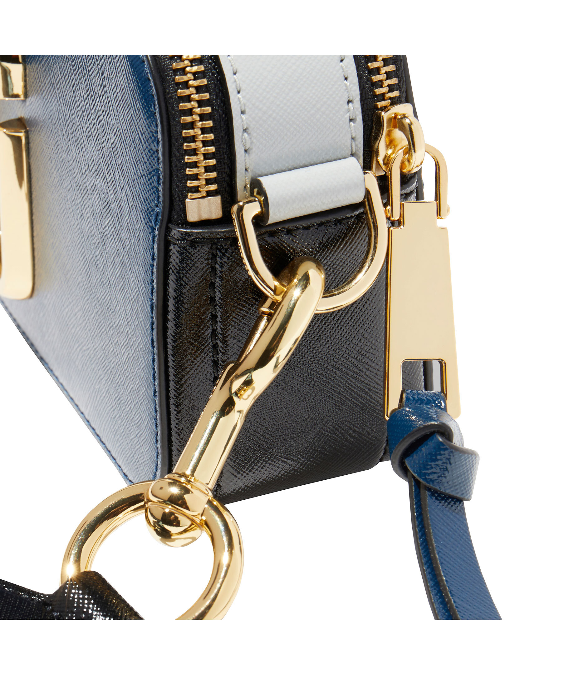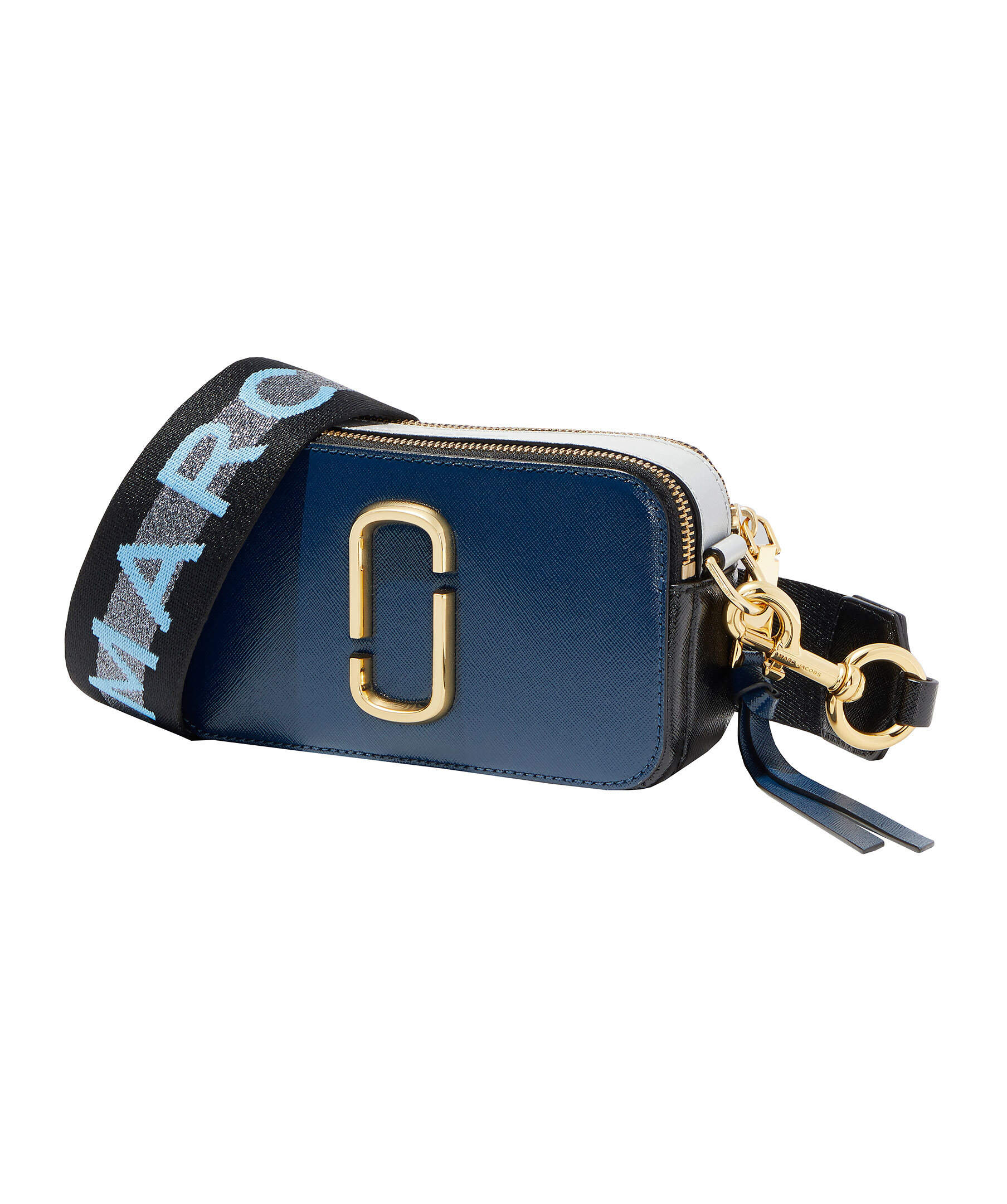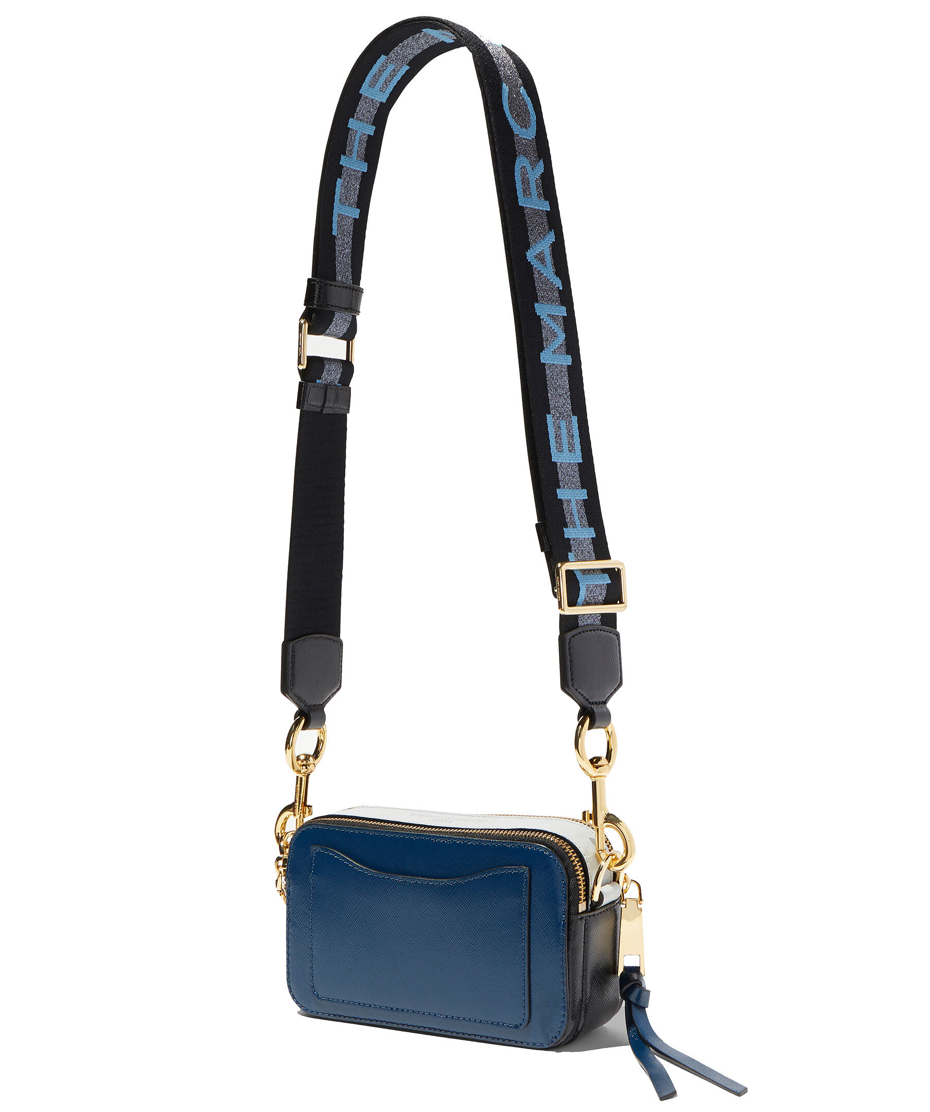 Mörkblå, liten handväska från Marc Jacobs med detaljer i ljusblått och svart. Camera bag stil, tillverkad i saffianoläder och har ett justerbart och avtagbart axelband som är ljusblått, glittrigt och svart. Två fack med guldfärgad dragkedja och en ficka på insidan samt en ytterficka bak. Stor guldfärgad logga i metall fram. Djup: 6 cm Höjd: 11 cm Bredd: 18 cm.