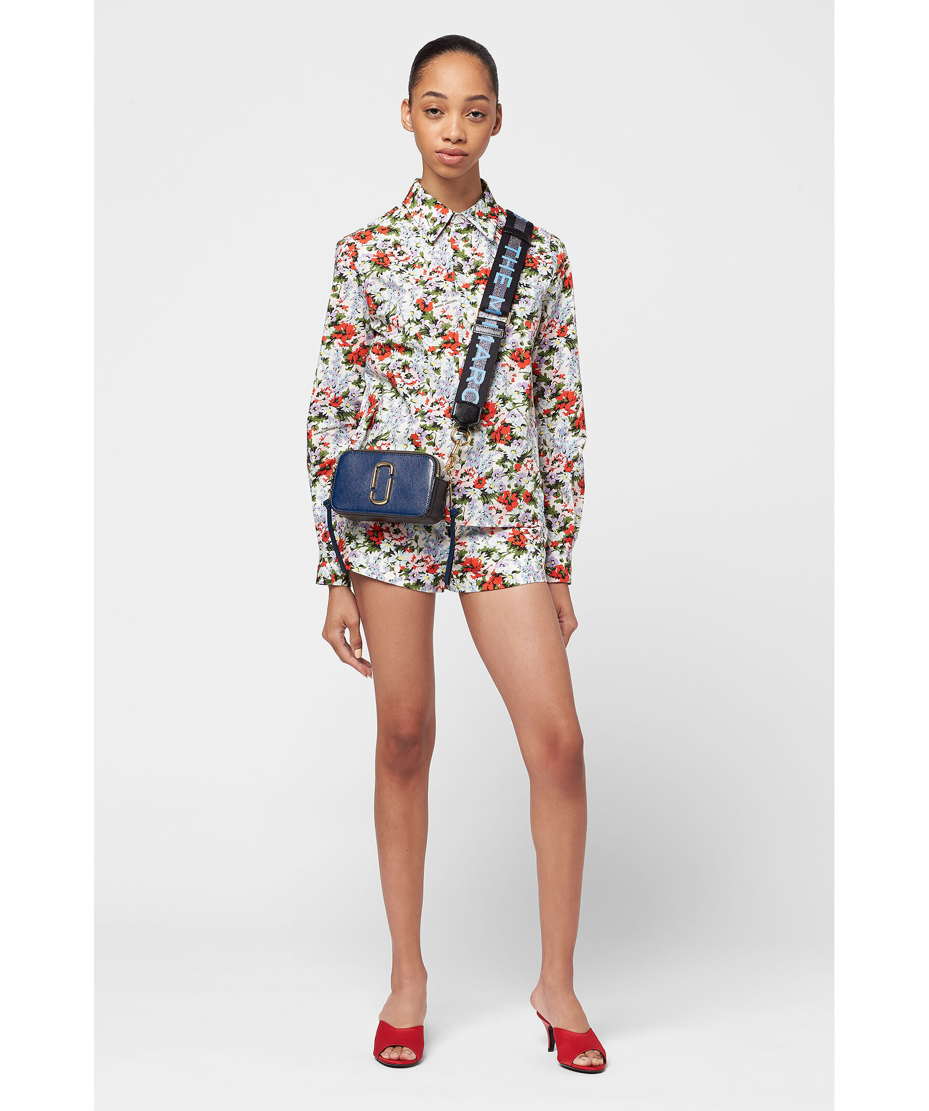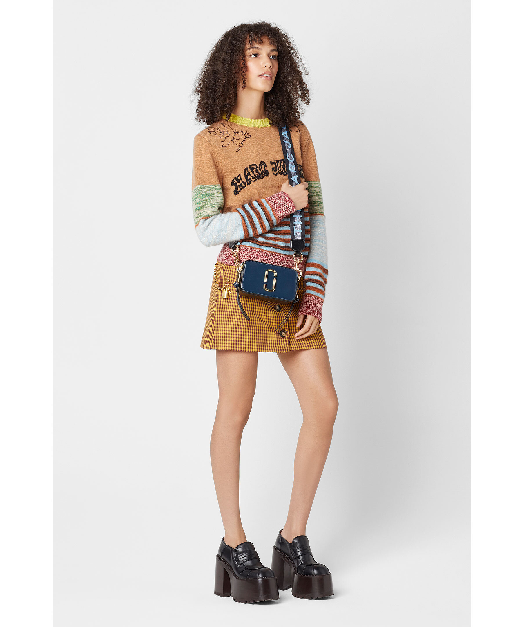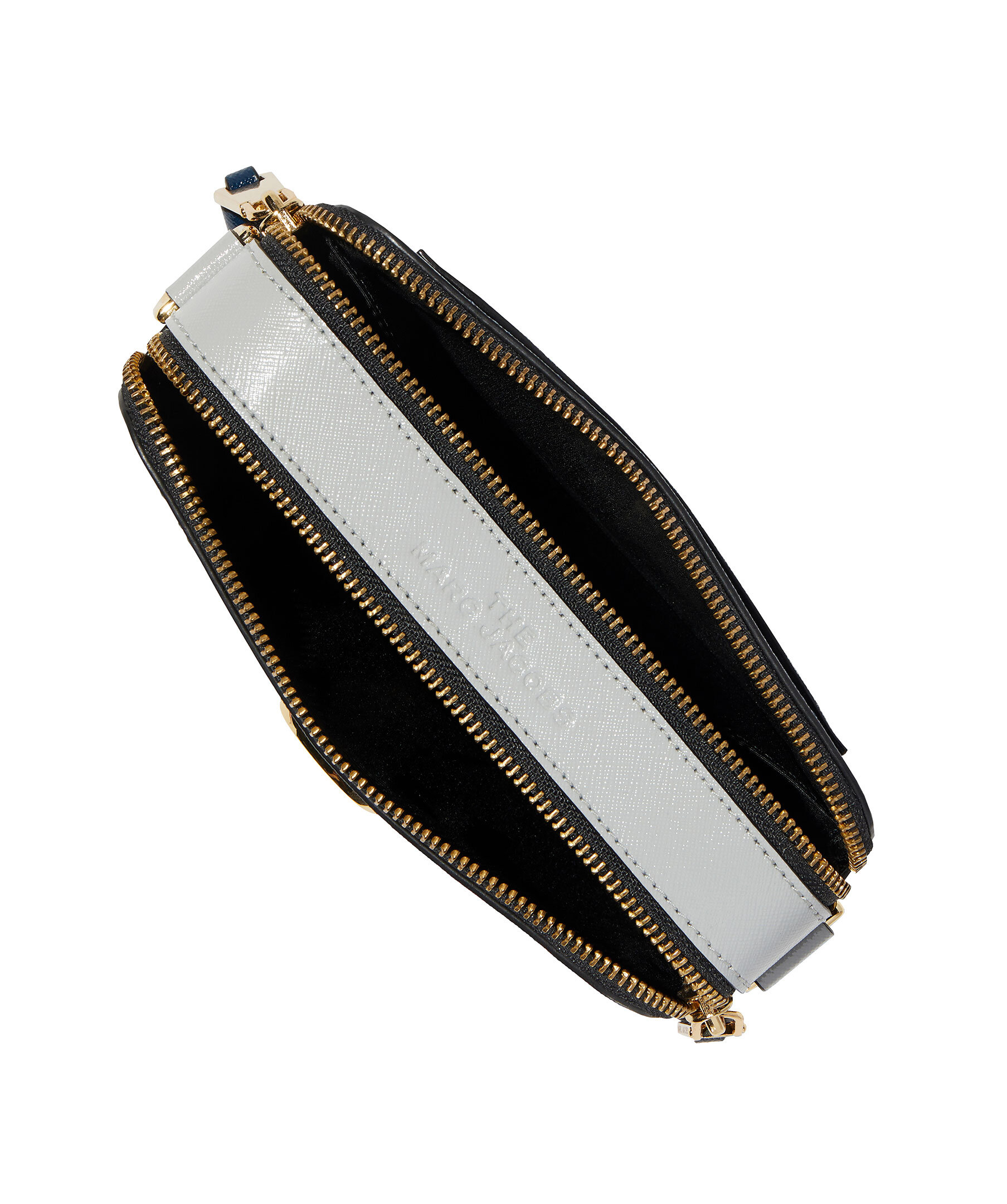 Mörkblå, liten handväska från Marc Jacobs med detaljer i ljusblått och svart. Camera bag stil, tillverkad i saffianoläder och har ett justerbart och avtagbart axelband som är ljusblått, glittrigt och svart. Två fack med guldfärgad dragkedja och en ficka på insidan samt en ytterficka bak. Stor guldfärgad logga i metall fram. Djup: 6 cm Höjd: 11 cm Bredd: 18 cm.