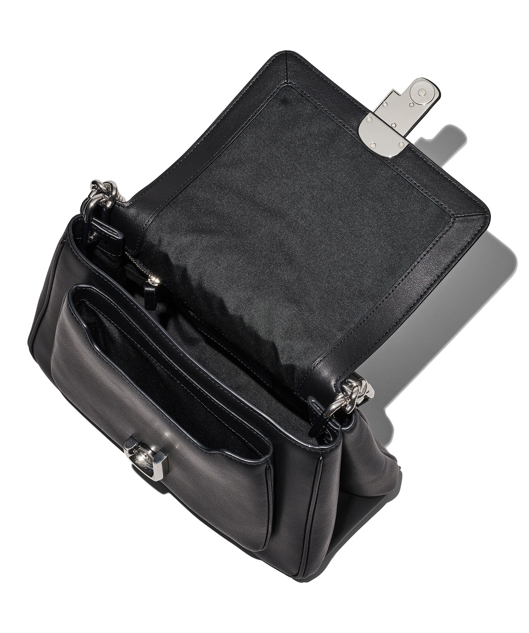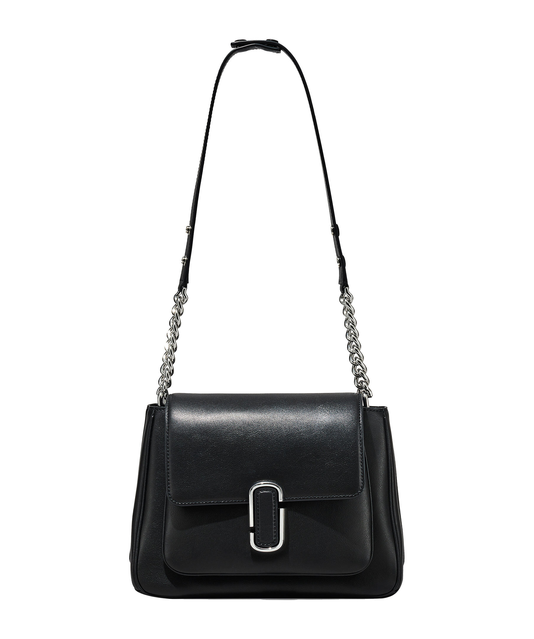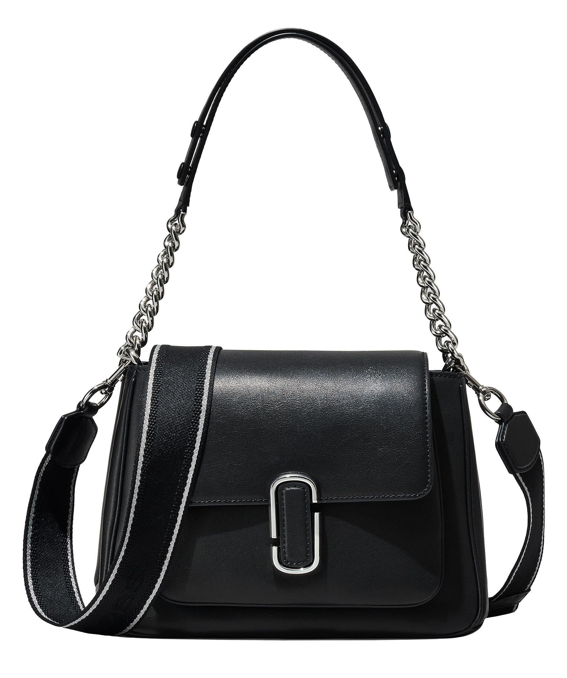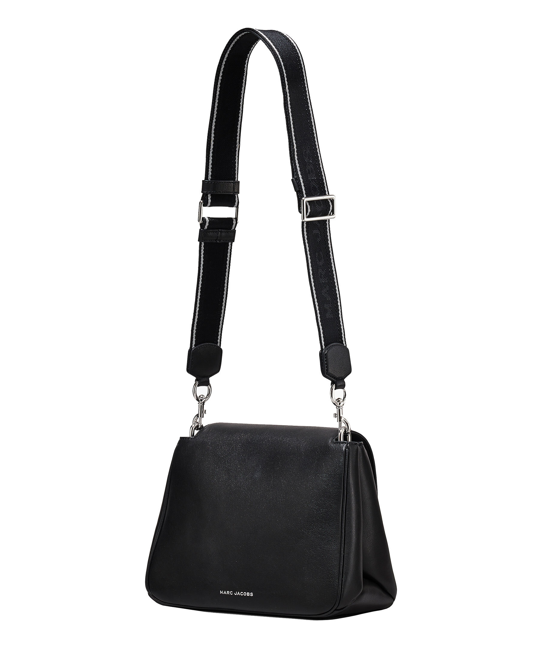 Svart väska från Marc Jacobs. Silverfärgat spänne med magnetlås. Justerbart axelband i svart och silver i vävt material. Ett mindre ytterfack på väskans framsida.