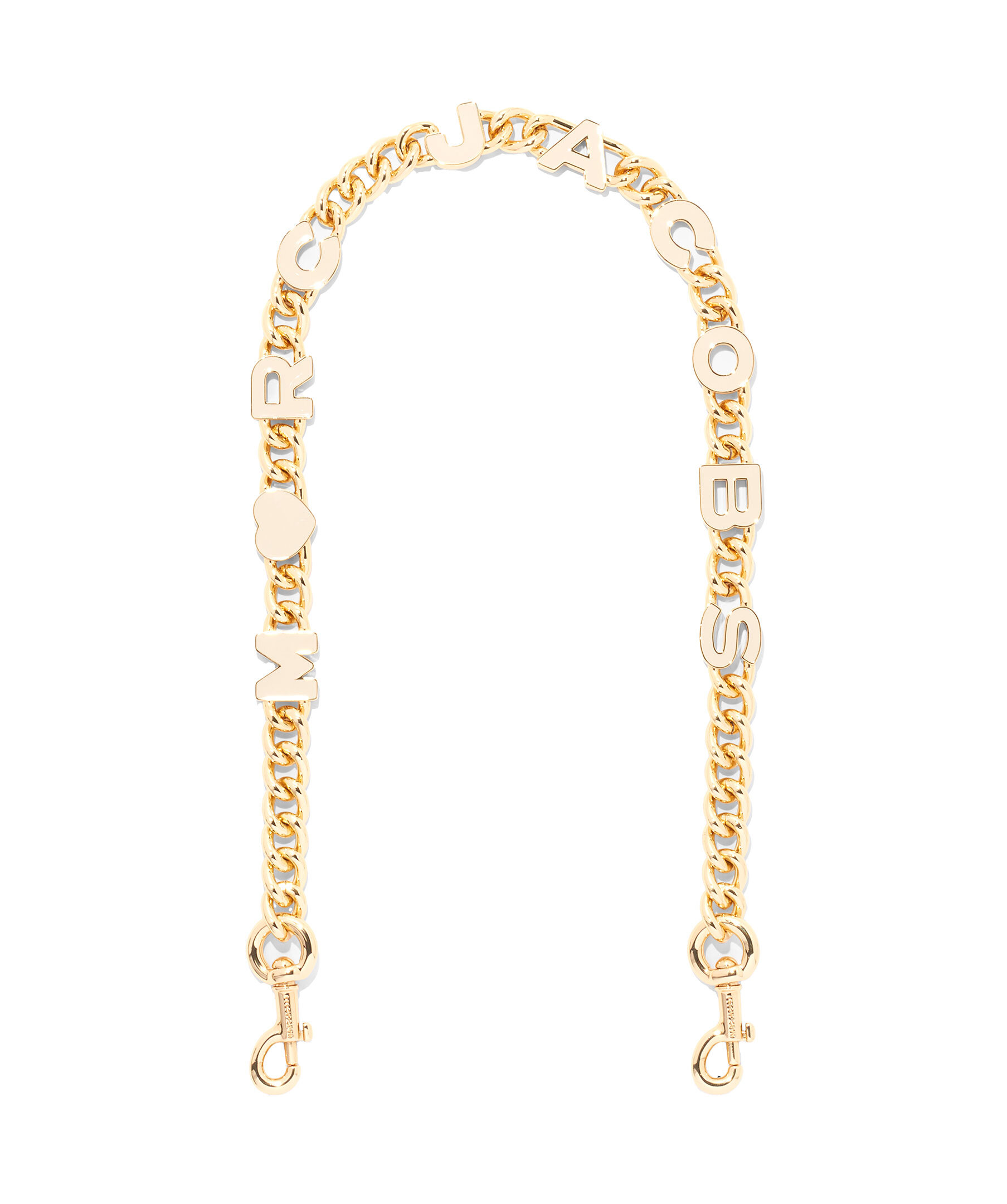Guldig kedja från Marc Jacobs. En charmig switch up. Med hundklämmor på varje sida, fäst denna lekfulla axelrem dekorerad i MJ och hjärtberlocker på deras bästsäljande väskor.