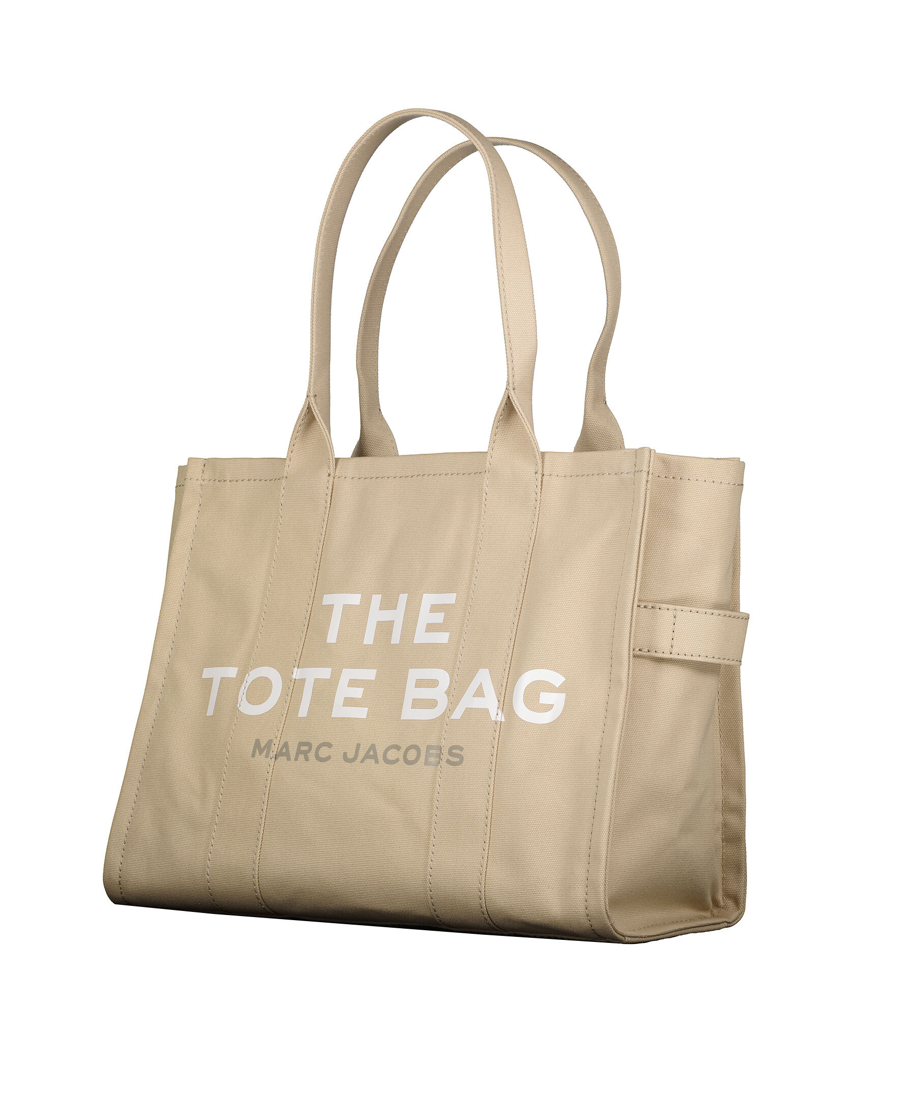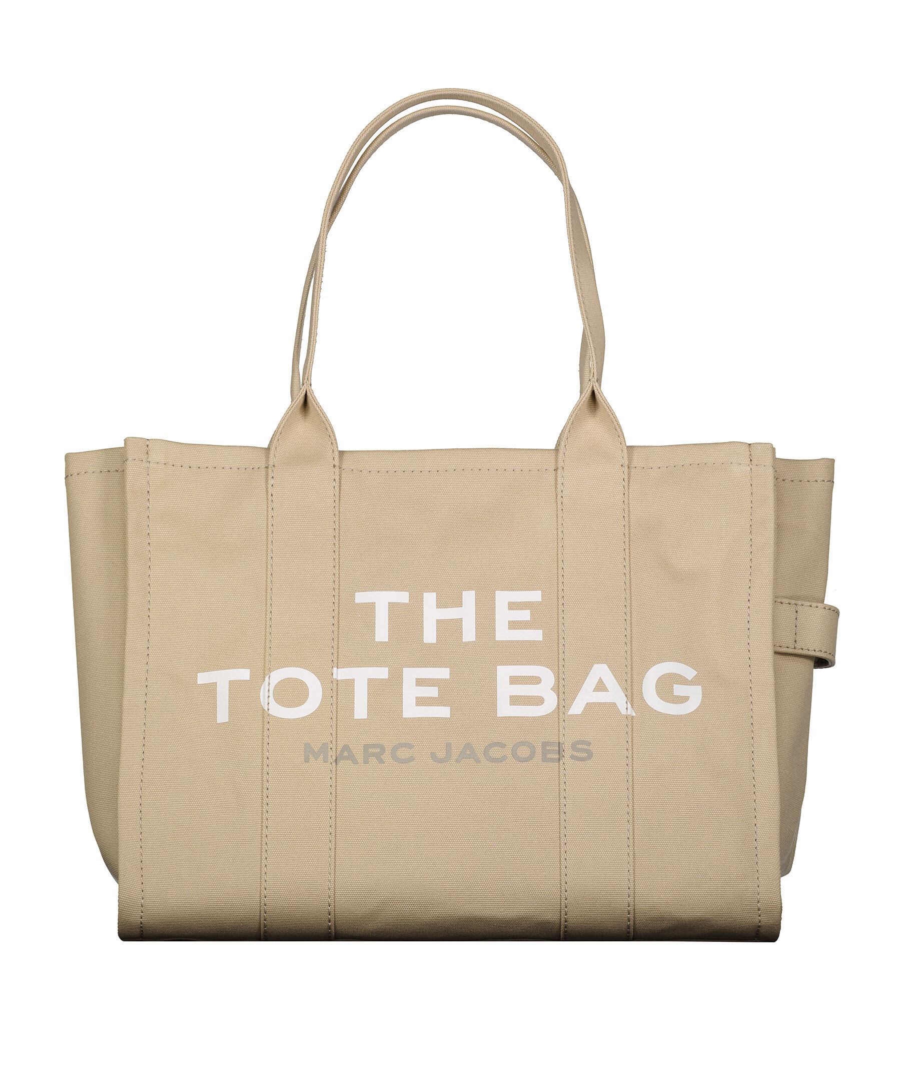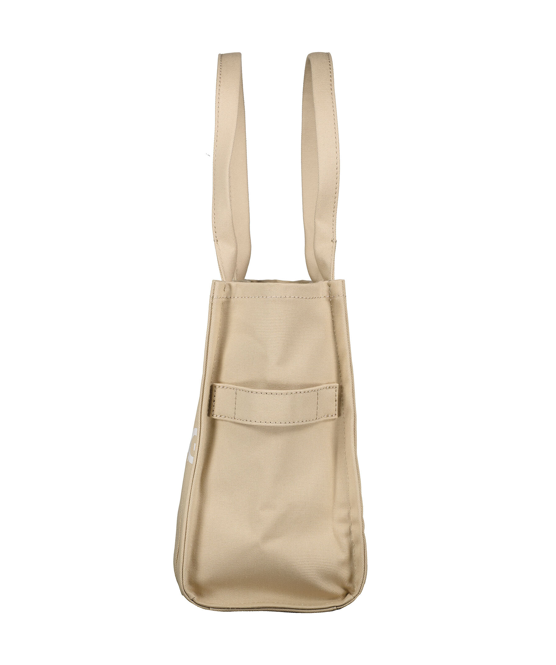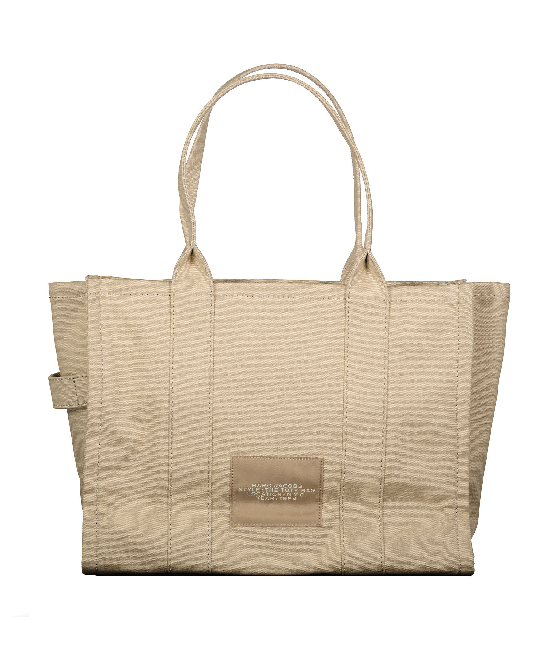 Beige, stor canvas-tote i bomull från Marc Jacobs. Vit, tryckt logotyp fram och liten patch med logotyp på baksidan. Stängs med blixtlås och har en innerficka med blixtlås. Mått: 42cm L x 16cm D x 34cm H, handtag 24cm.