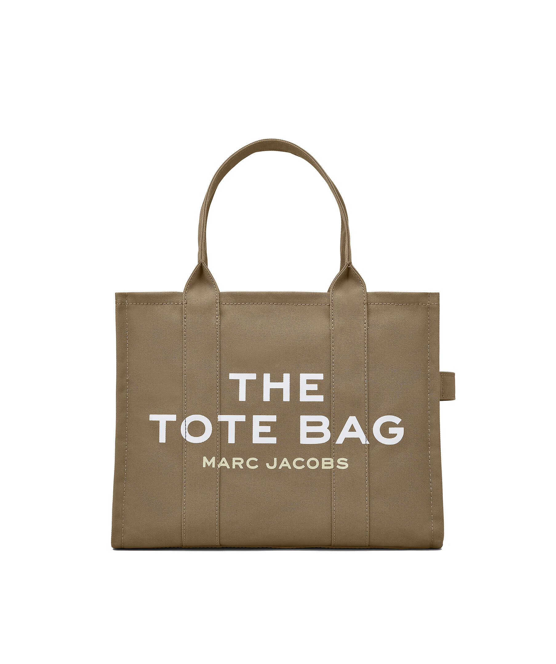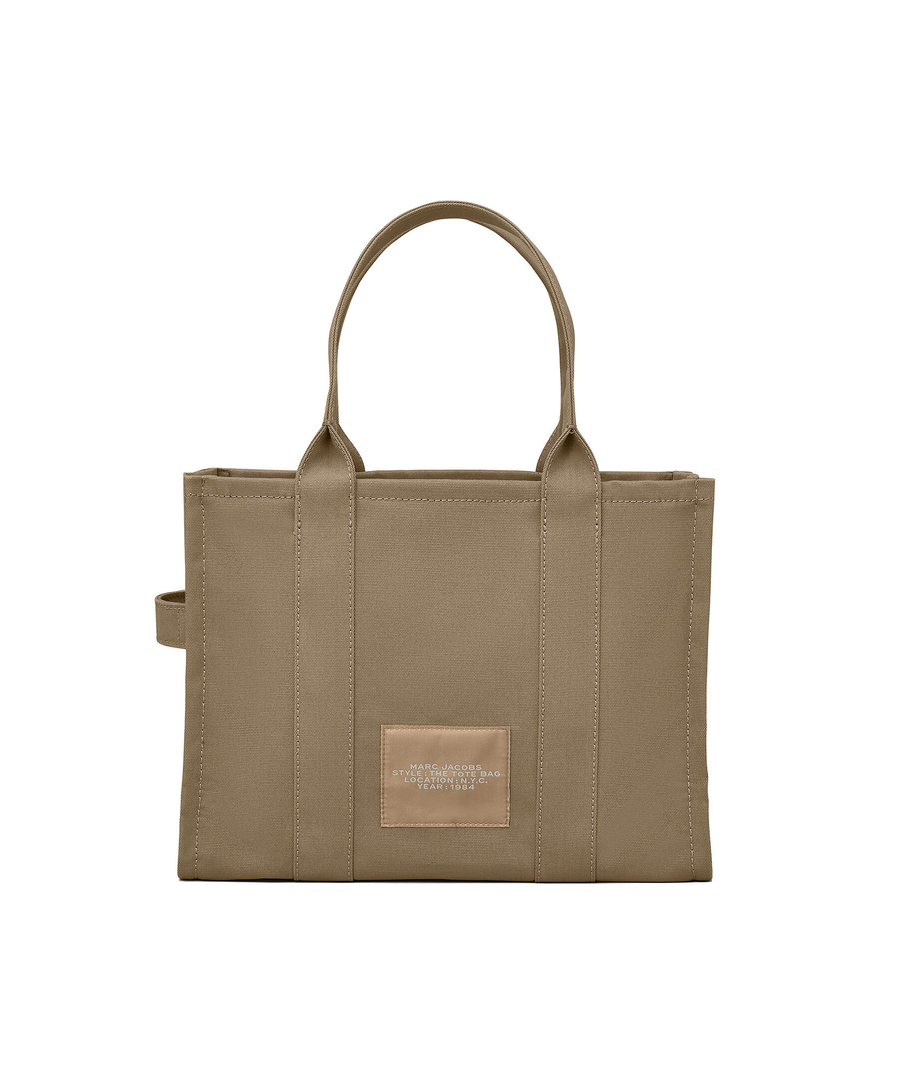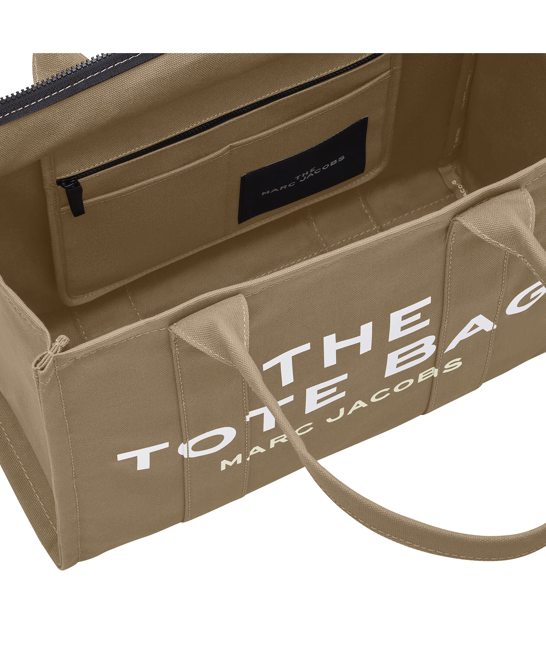 Grön, stor canvas-tote i bomull från Marc Jacobs. Vit, tryckt logotyp fram och liten patch med logotyp på baksidan. Stängs med blixtlås och har en innerficka med blixtlås. Mått: 42cm L x 16cm D x 34cm H, handtag 24cm.