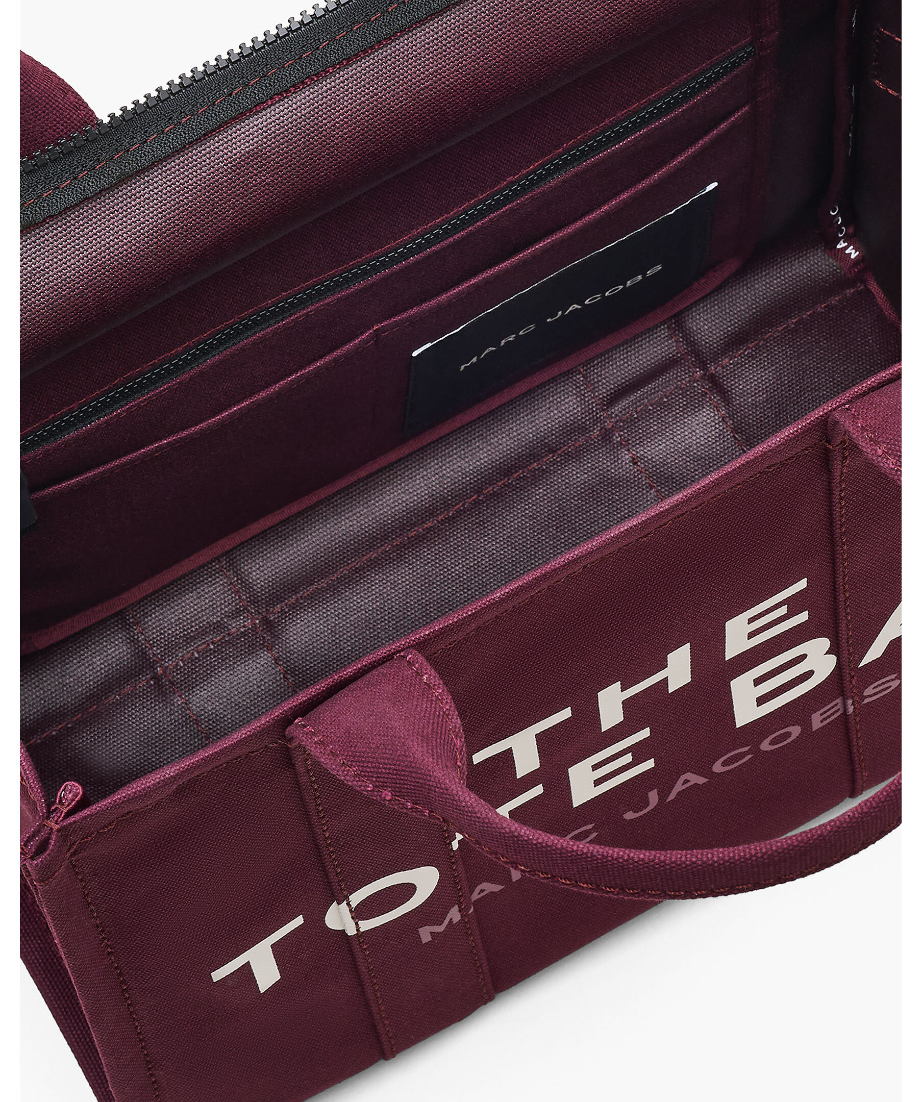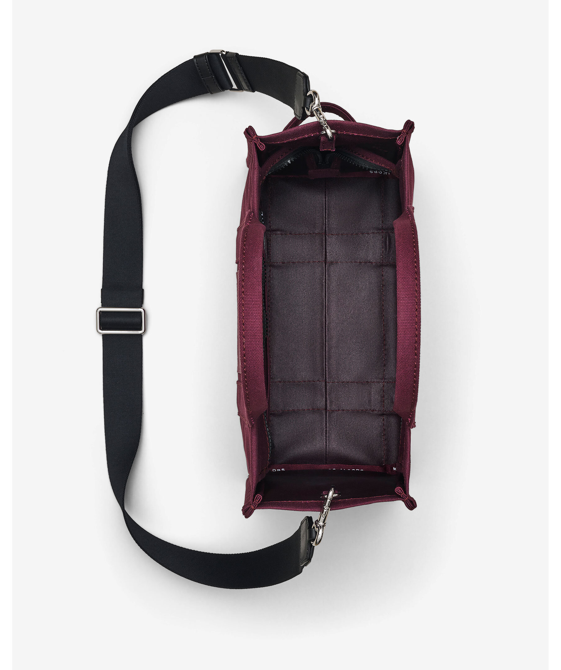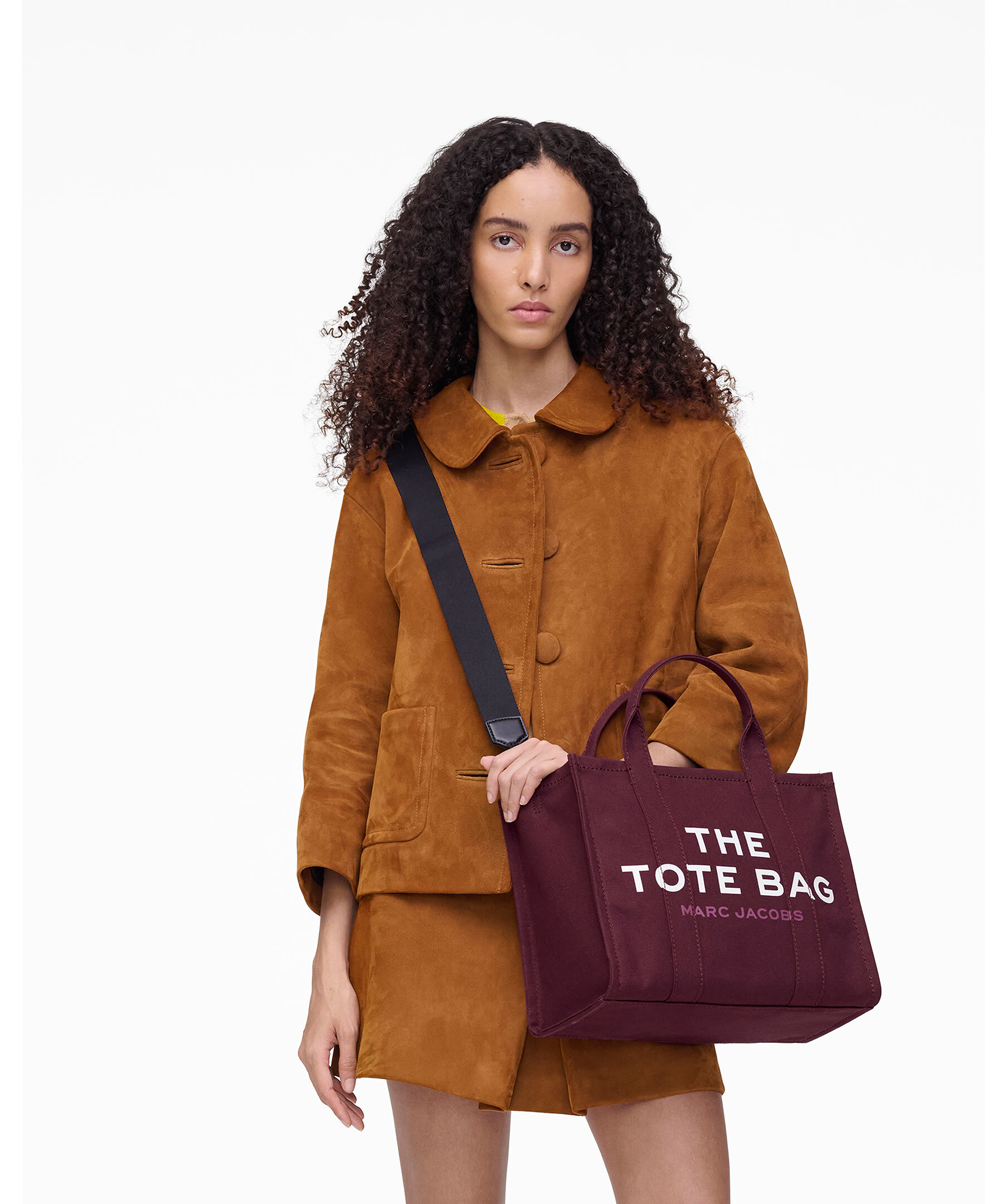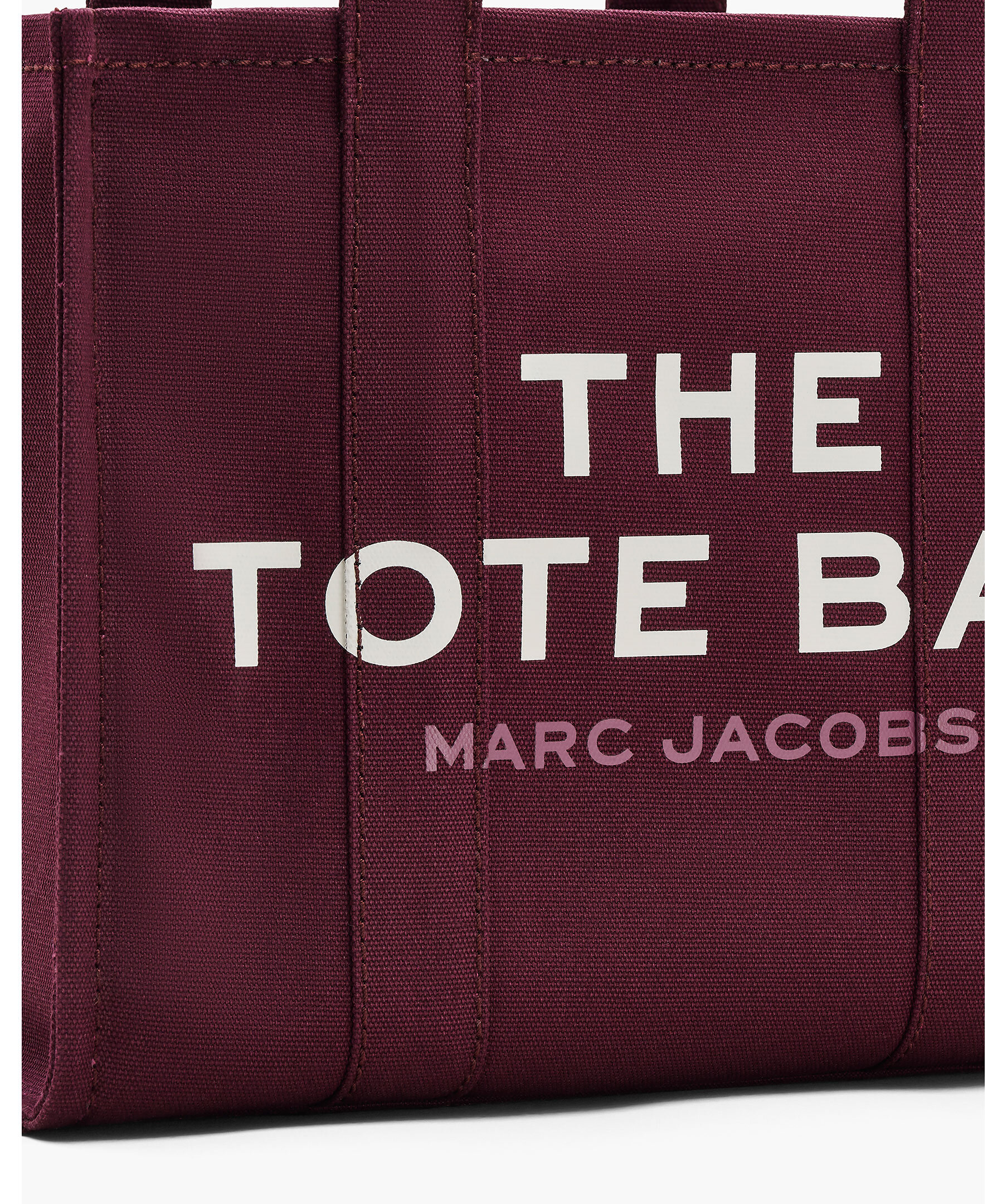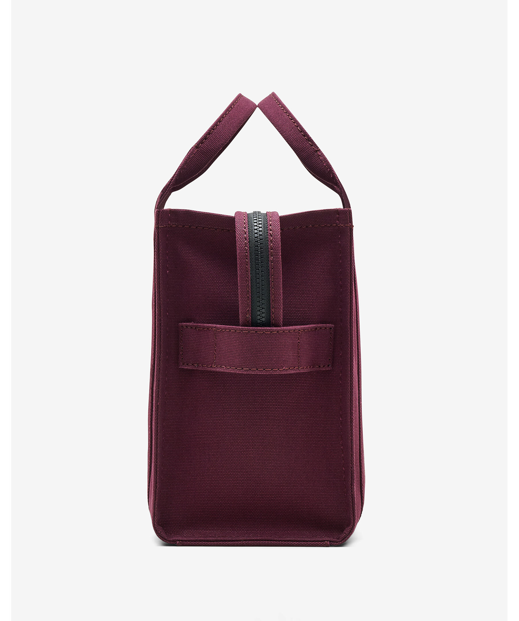 Mörklila, canvas-tote i bomull från Marc Jacobs. Tryckt logotyp fram och liten patch med logotyp på baksidan. Stängs med blixtlås och har en innerficka med blixtlås samt två mindre öppna fickor. Axelband tillkommer. Mått: 34cm L x 15cm D x 27cm H, handtag 12cm och axelrem 69cm.