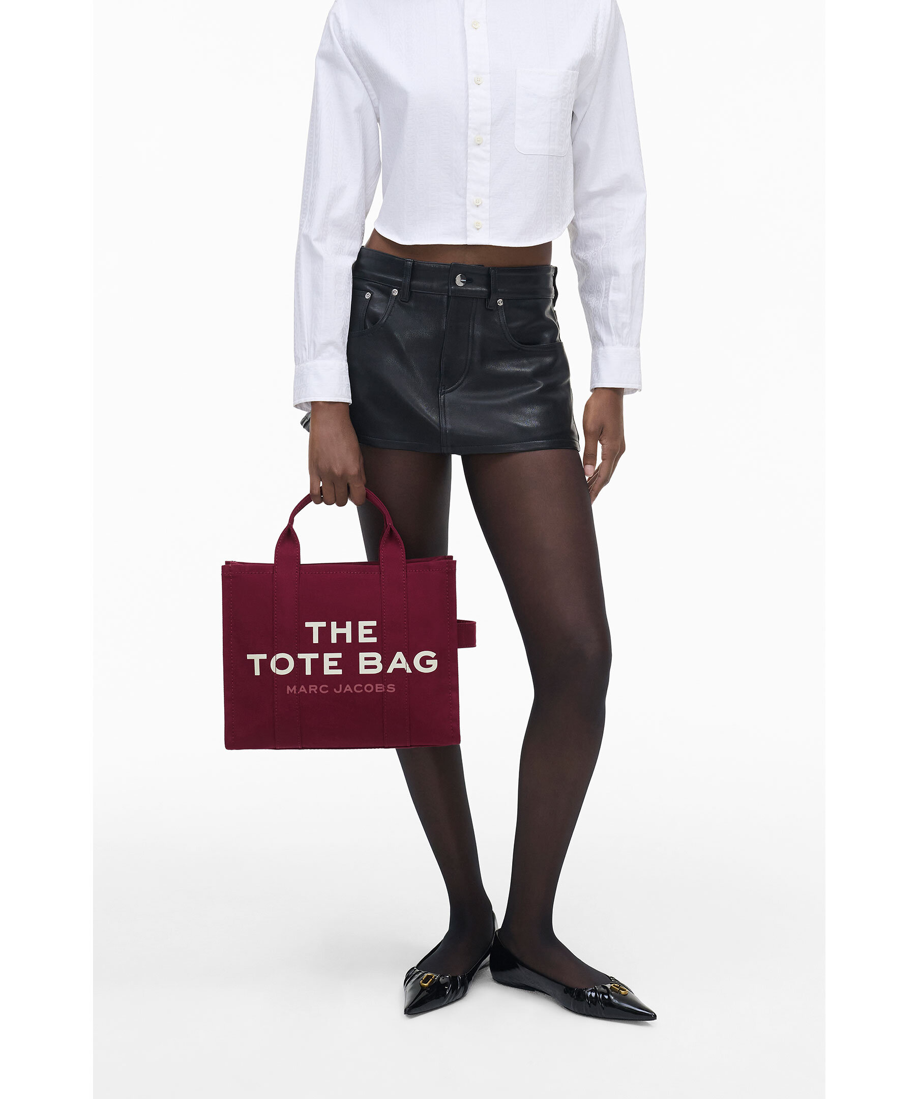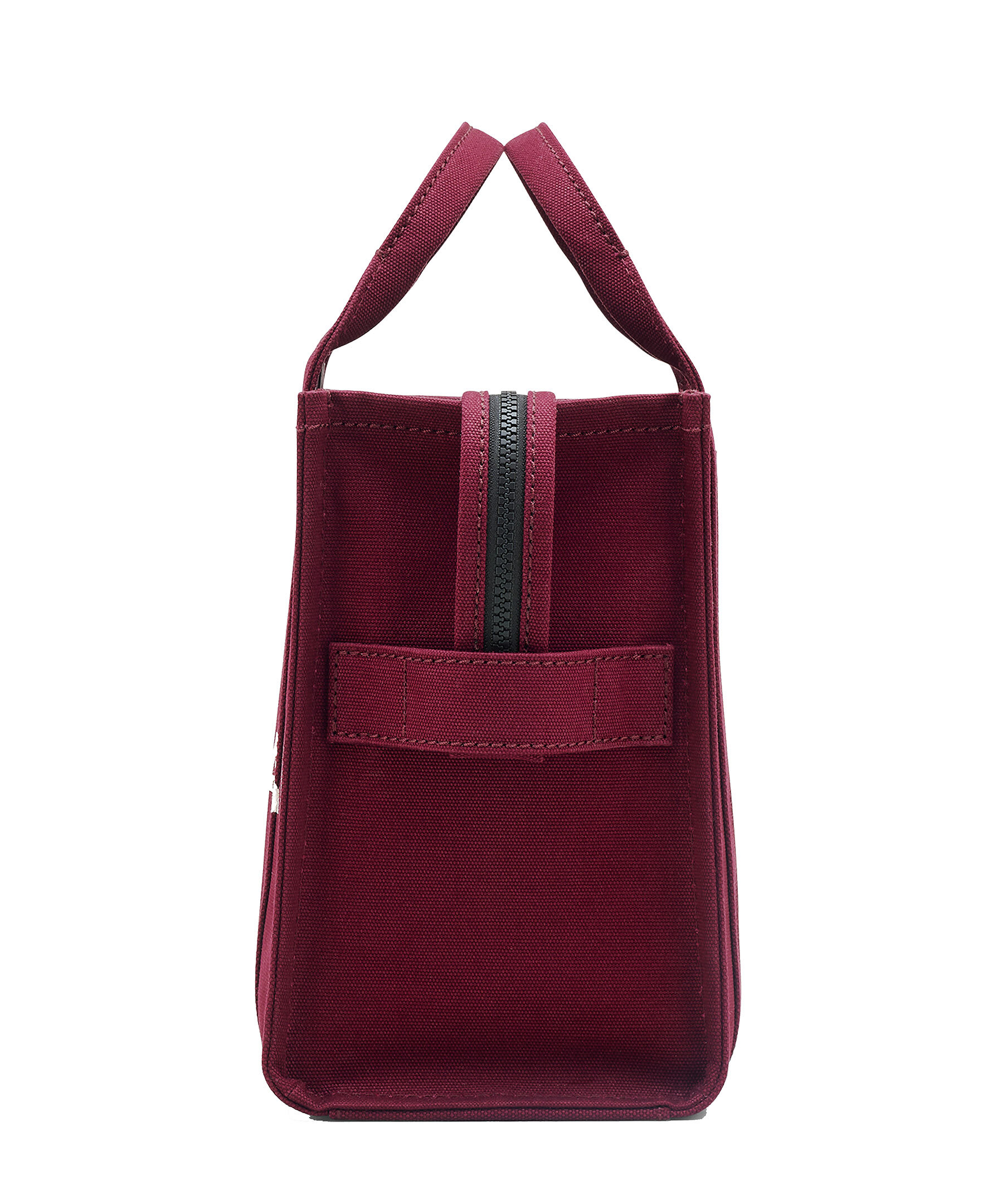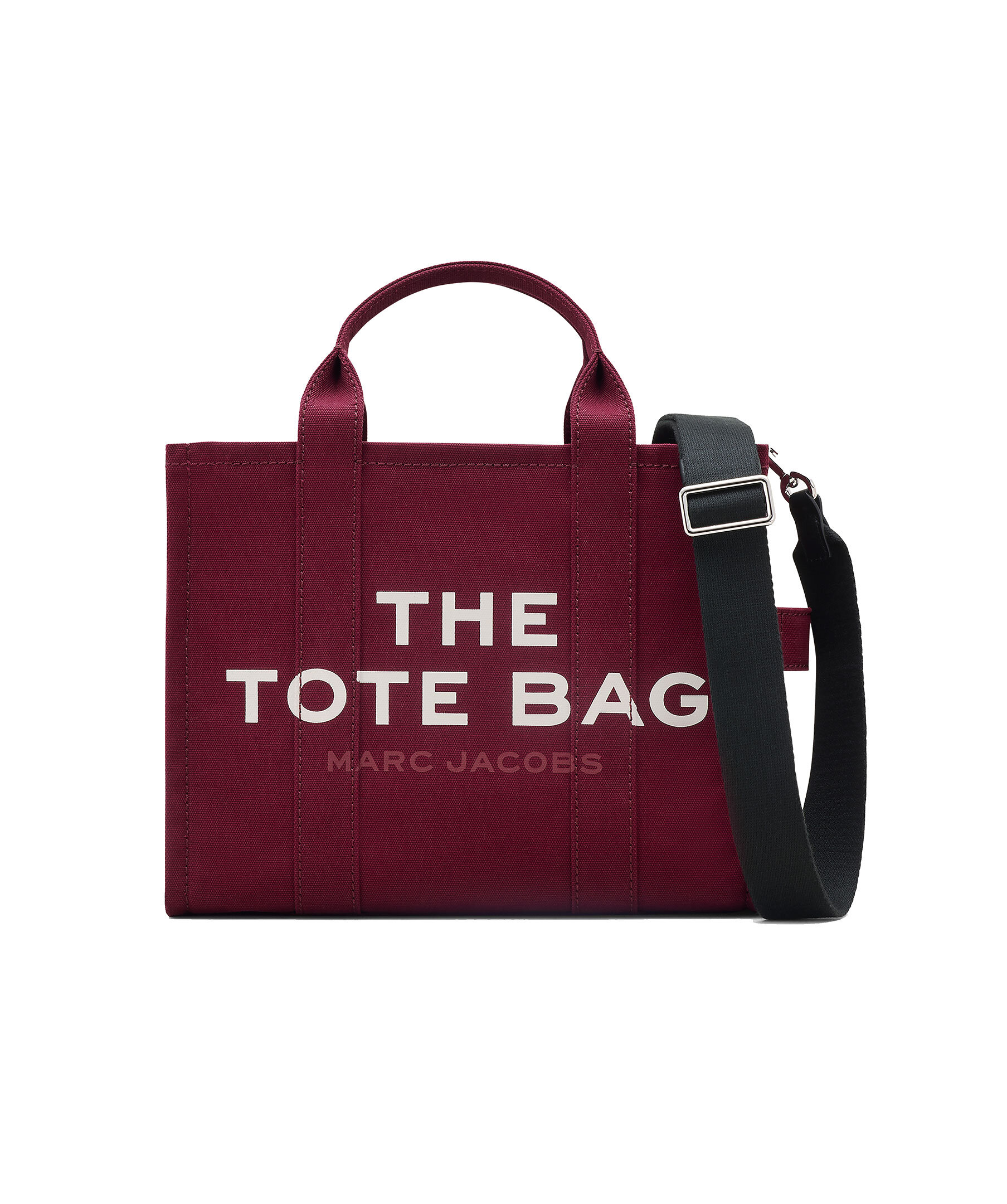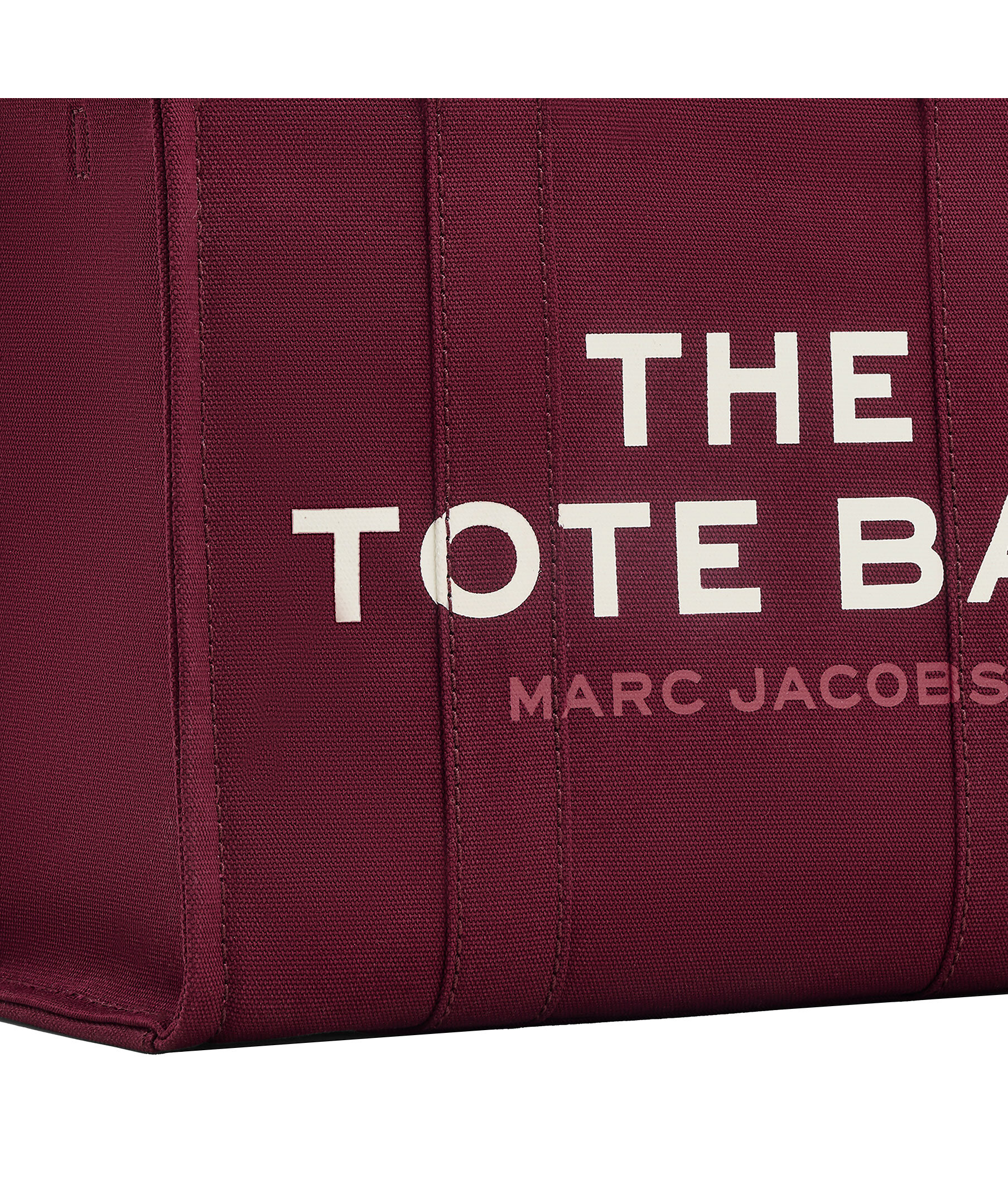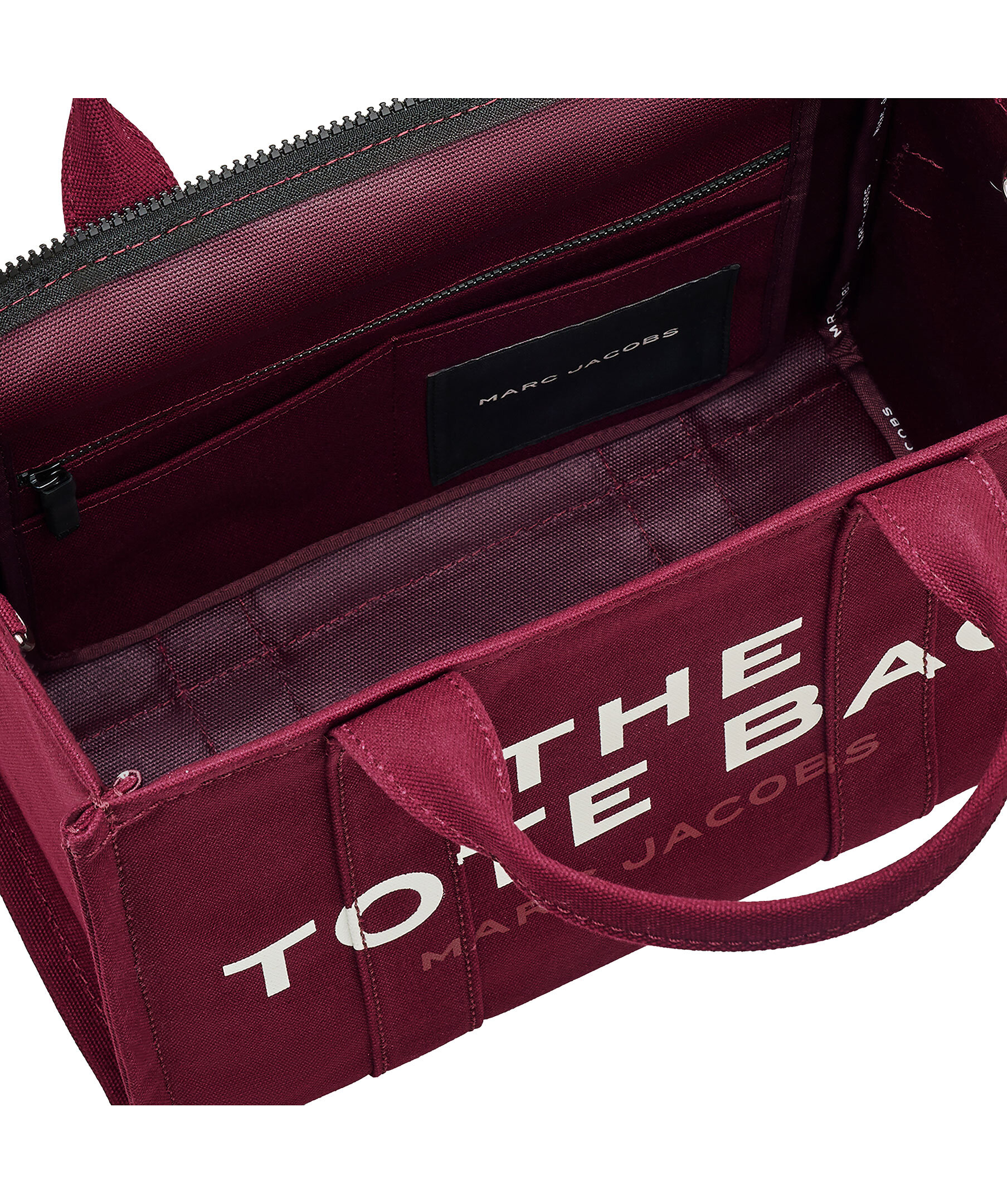 Vinröd, canvas-tote i bomull från Marc Jacobs. Vit, tryckt logotyp fram och liten patch med logotyp på baksidan. Stängs med blixtlås och har en innerficka med blixtlås samt två mindre öppna fickor. Axelband tillkommer. Mått: 32cm L x 16cm D x 24cm H, handtag 11cm.