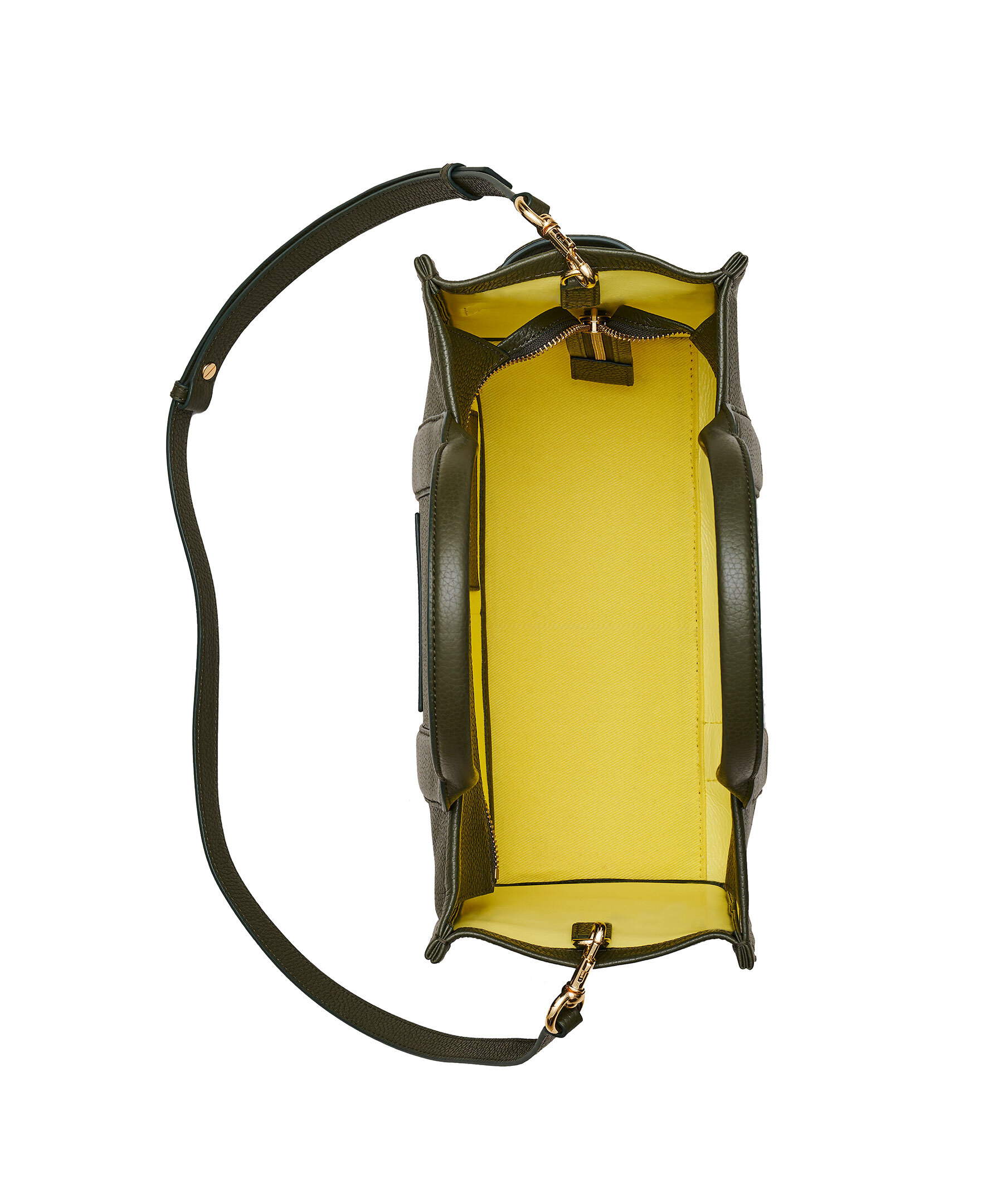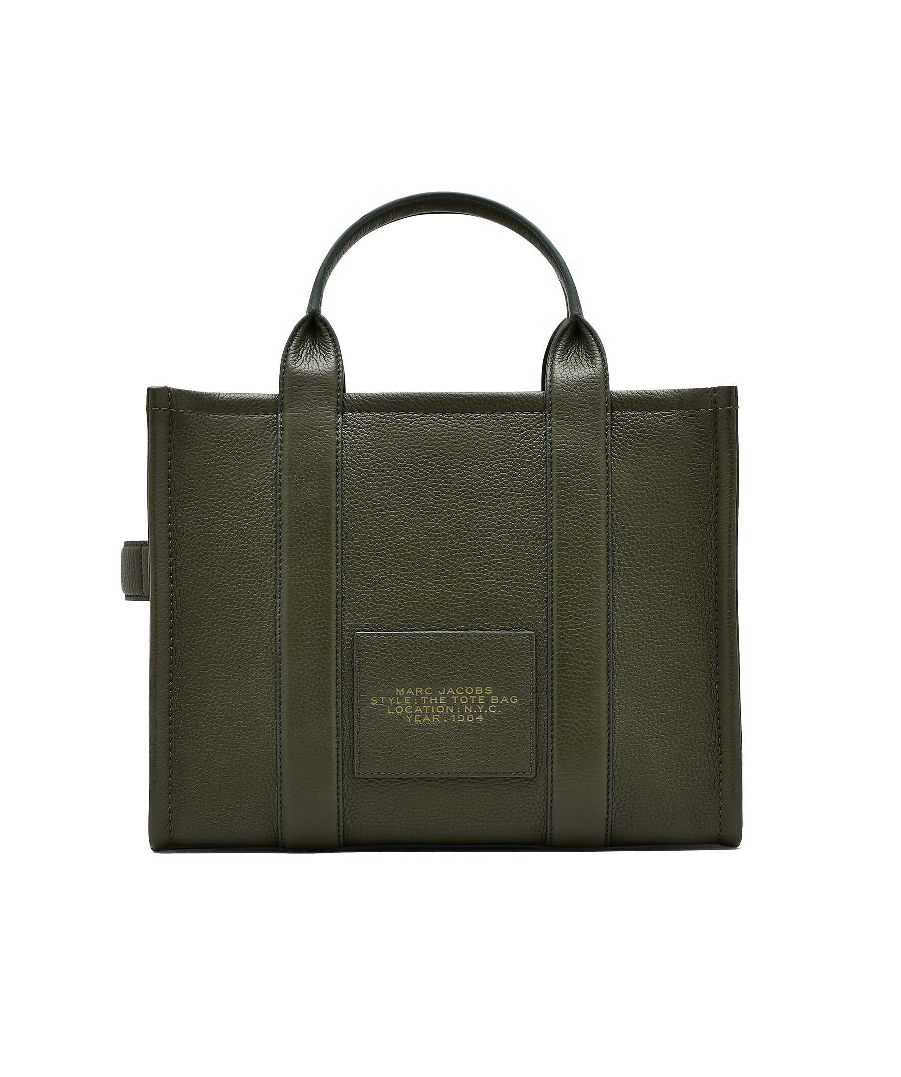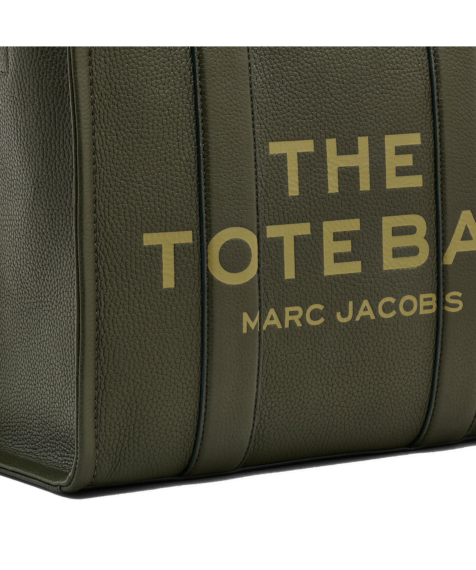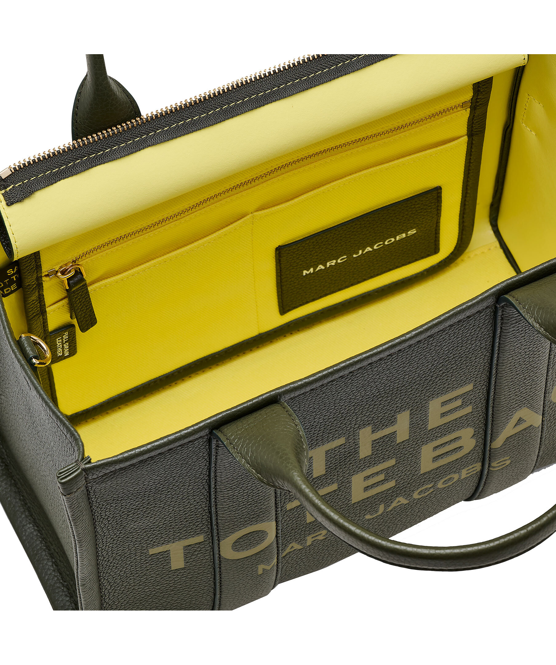 Mörkgrön tote väska i läder från Marc Jacobs med två handtag upptill. Ljusgrön logotyp fram och patch med logotyp på baksidan i läder. Gul insida. Stängs med blixtlås och har en innerficka med blixtlås. Mått: 27cm hög, 15cm djup, 34 cm bred. Handtaget är 12 cm högt.