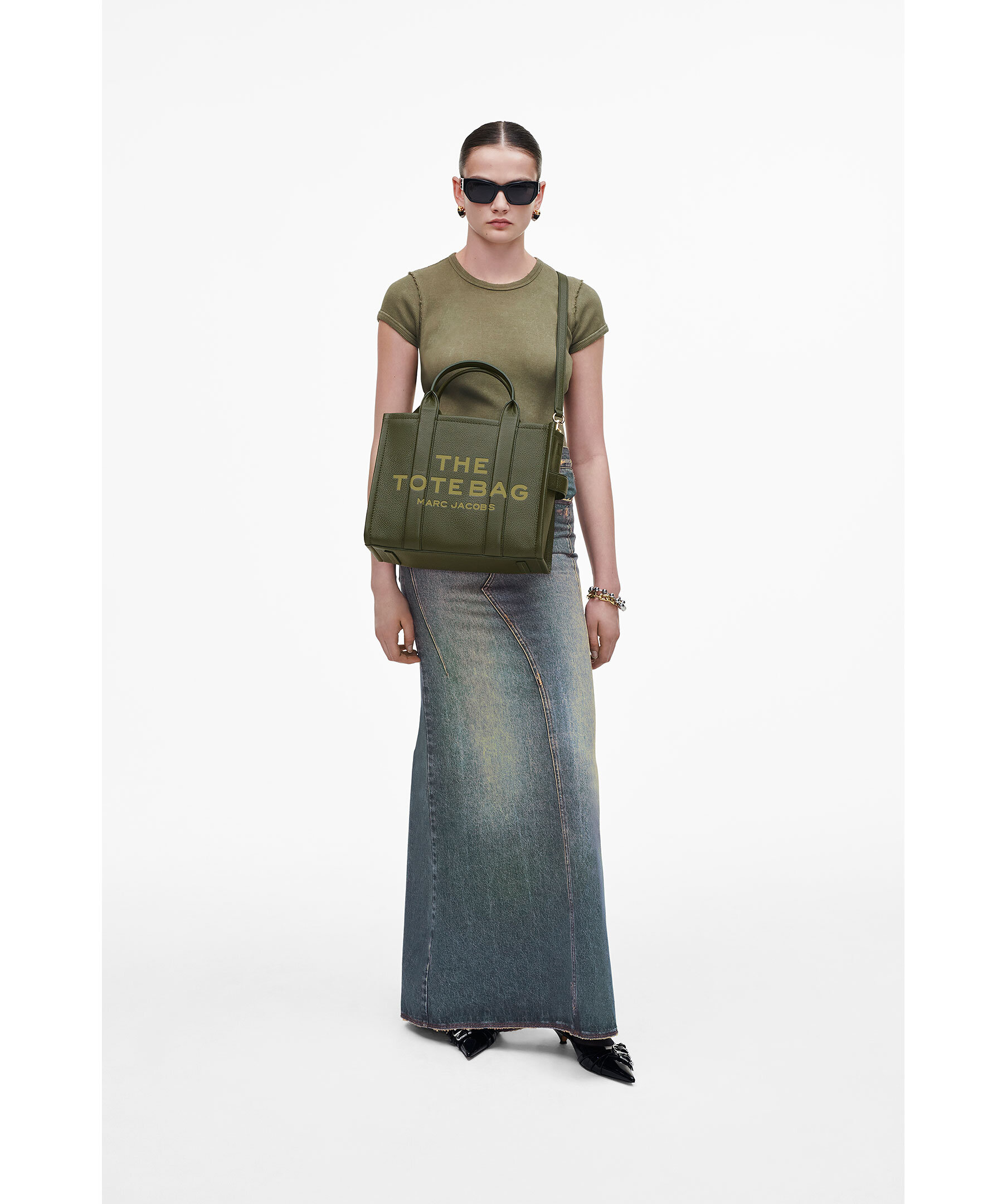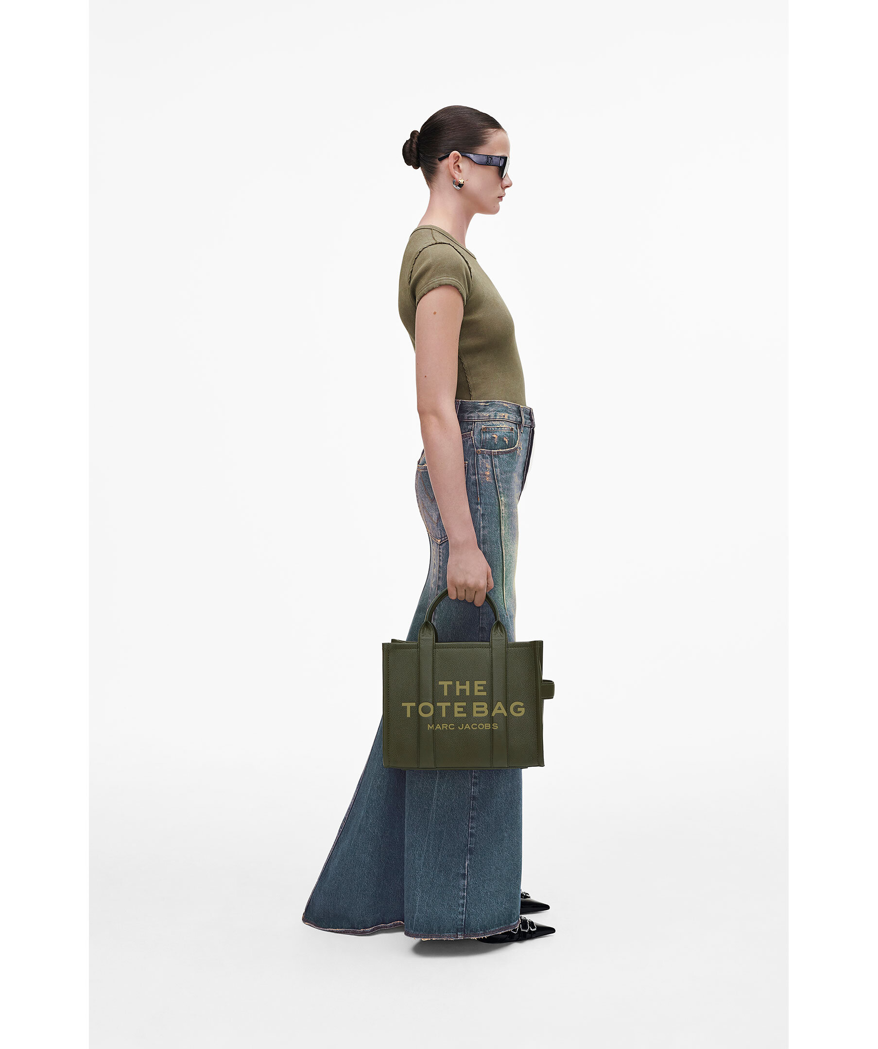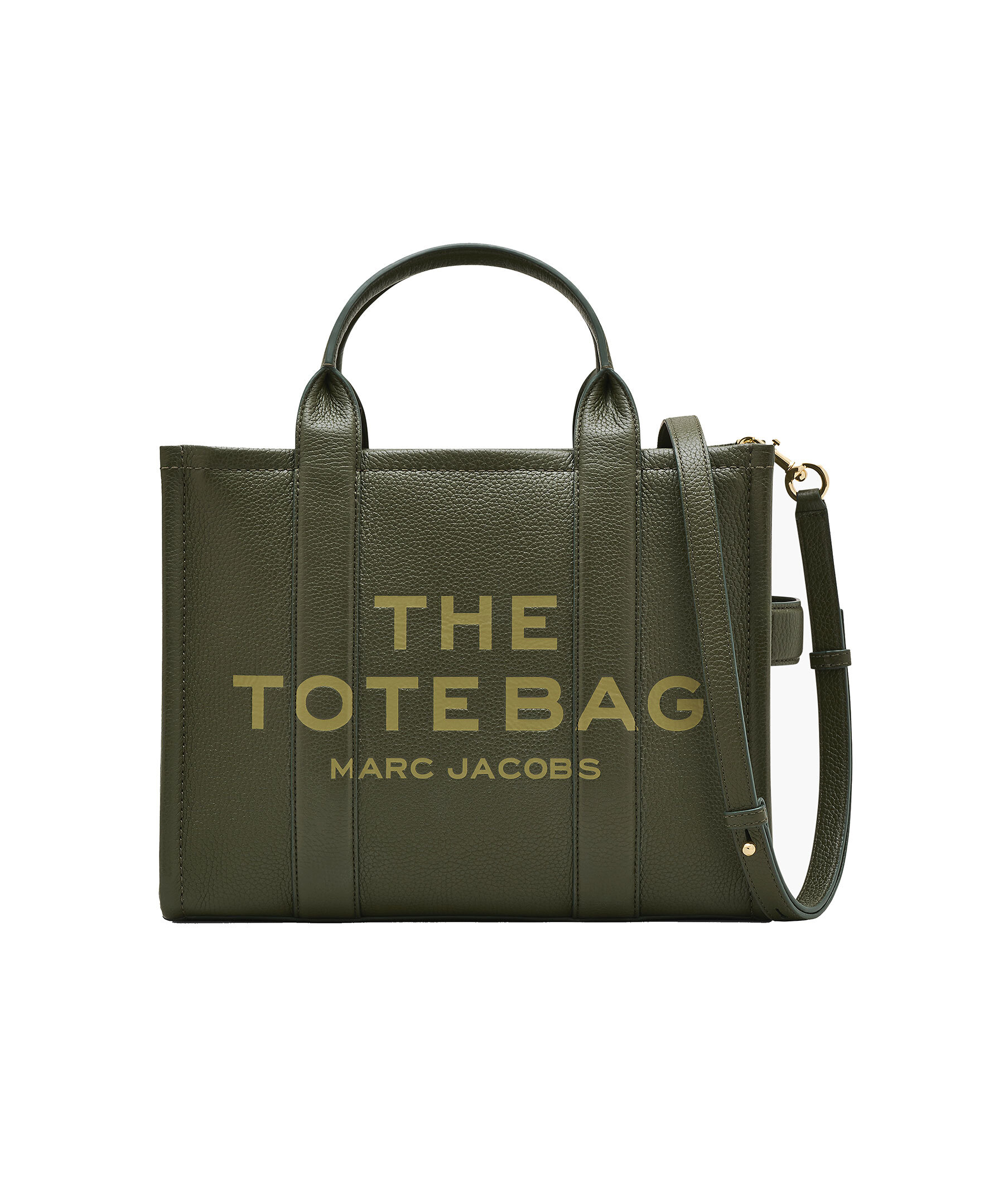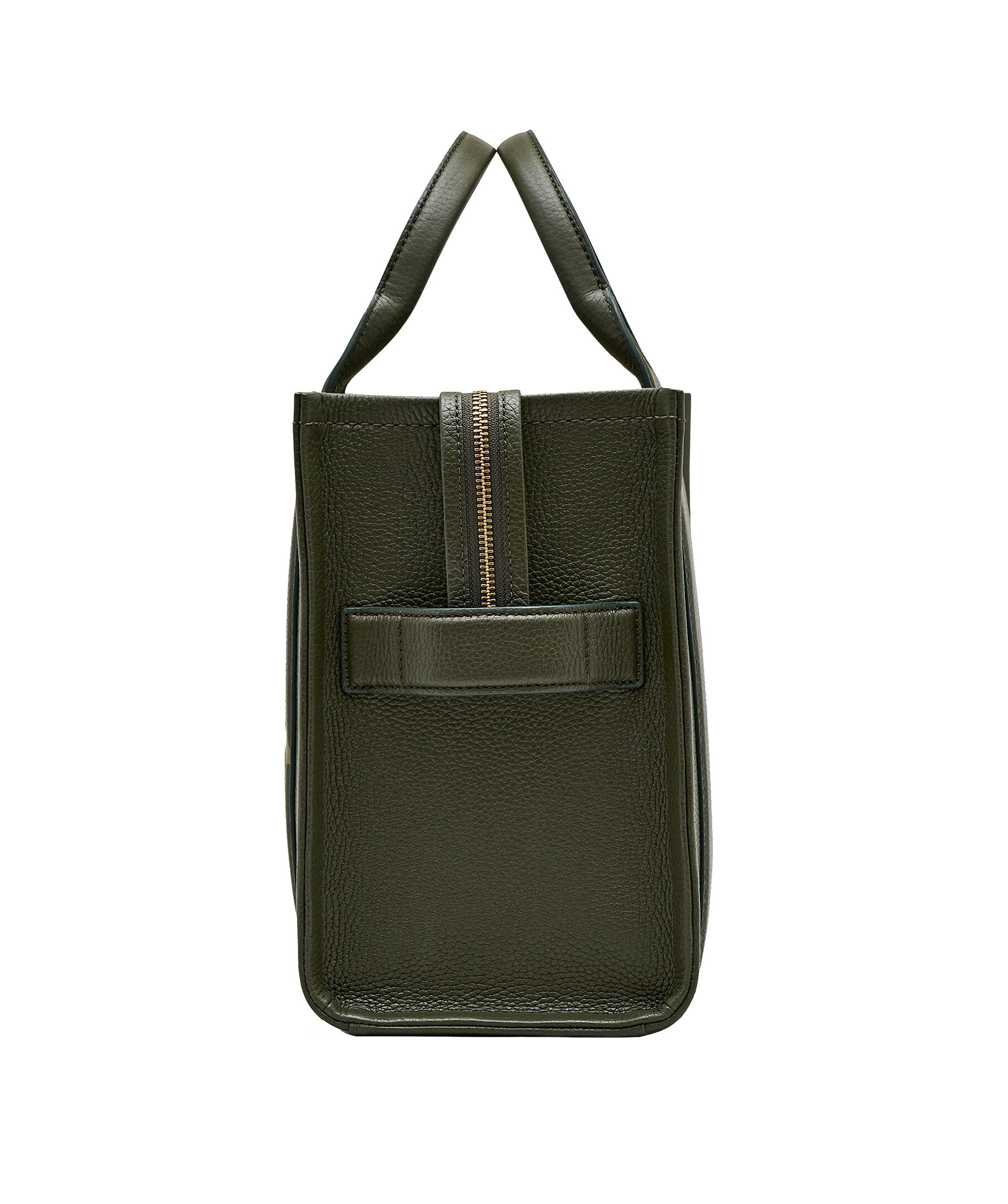 Mörkgrön tote väska i läder från Marc Jacobs med två handtag upptill. Ljusgrön logotyp fram och patch med logotyp på baksidan i läder. Gul insida. Stängs med blixtlås och har en innerficka med blixtlås. Mått: 27cm hög, 15cm djup, 34 cm bred. Handtaget är 12 cm högt.