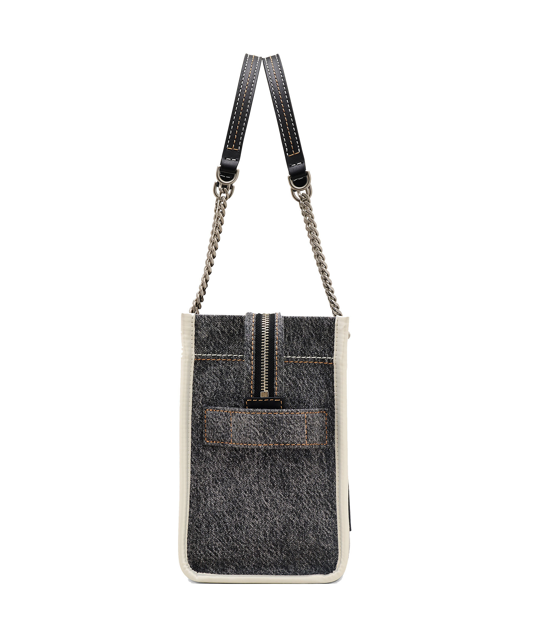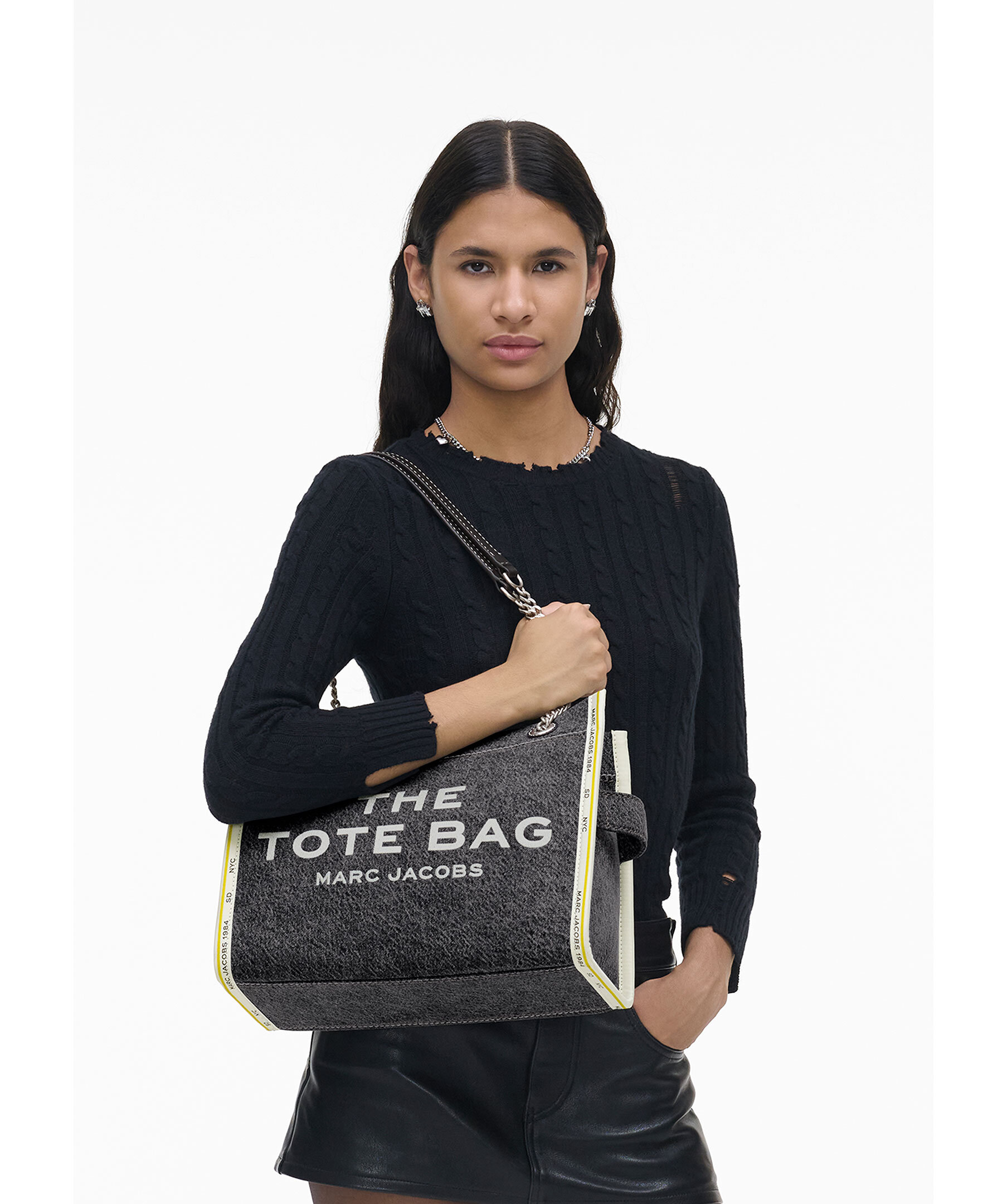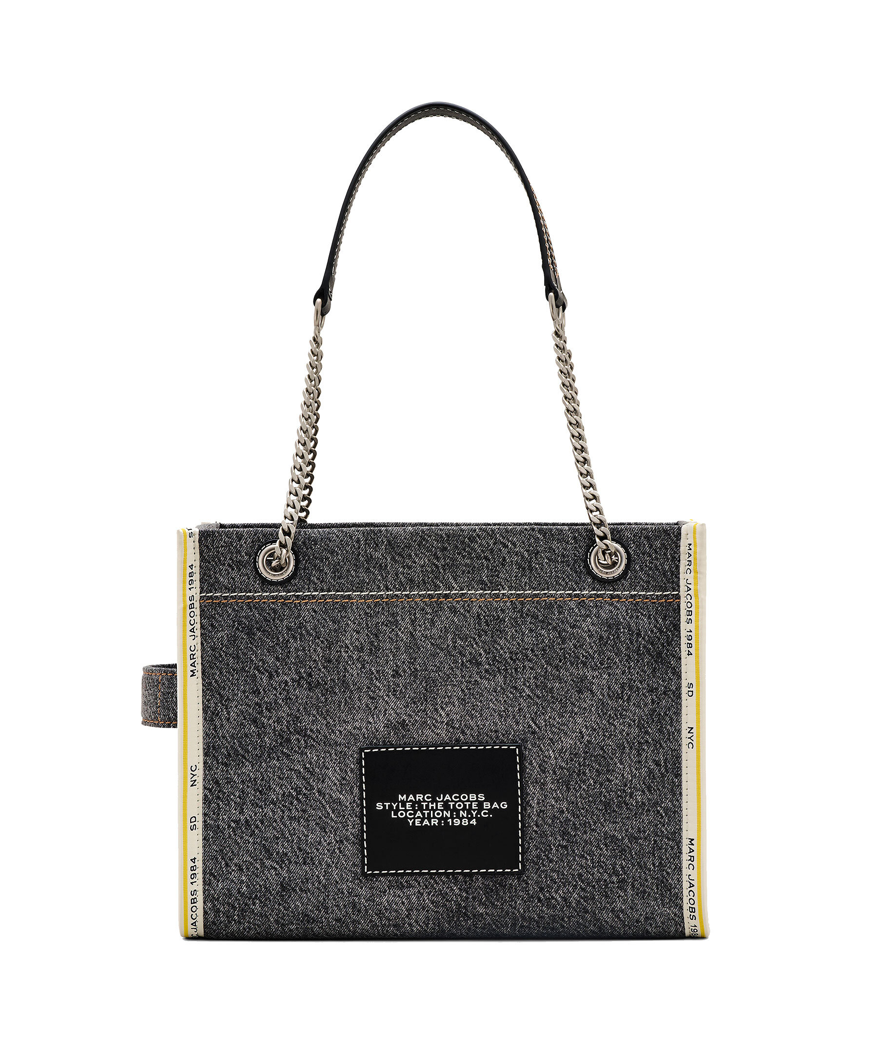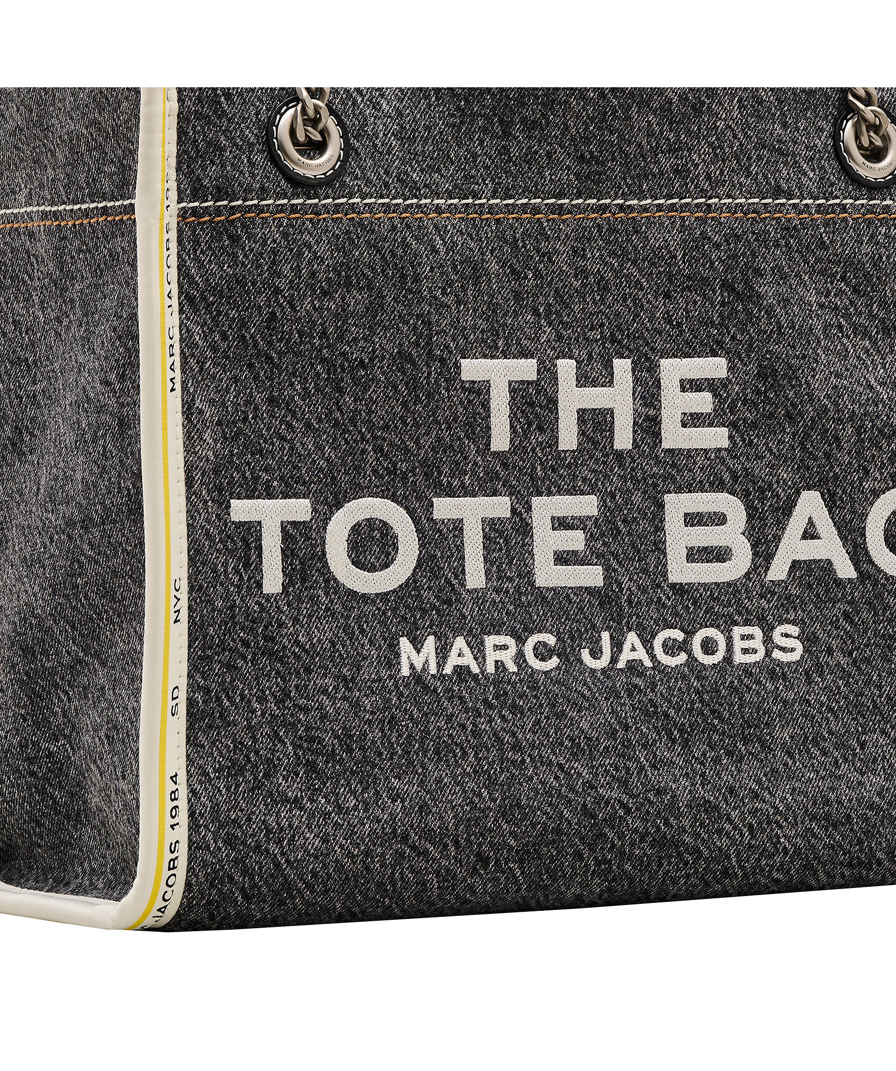 Medelstor totebag i lyxig strukturerad, grå denim från Marc Jacobs. Vit broderad logotyp fram och liten patch med logotyp på baksidan. Stängs med blixtlås och har en innerficka med blixtlås. Väskan bärs i kedjeremmenmed läderskyddsdetaljer. Mått: H: 27cm, D: 15cm, B: 34 cm.