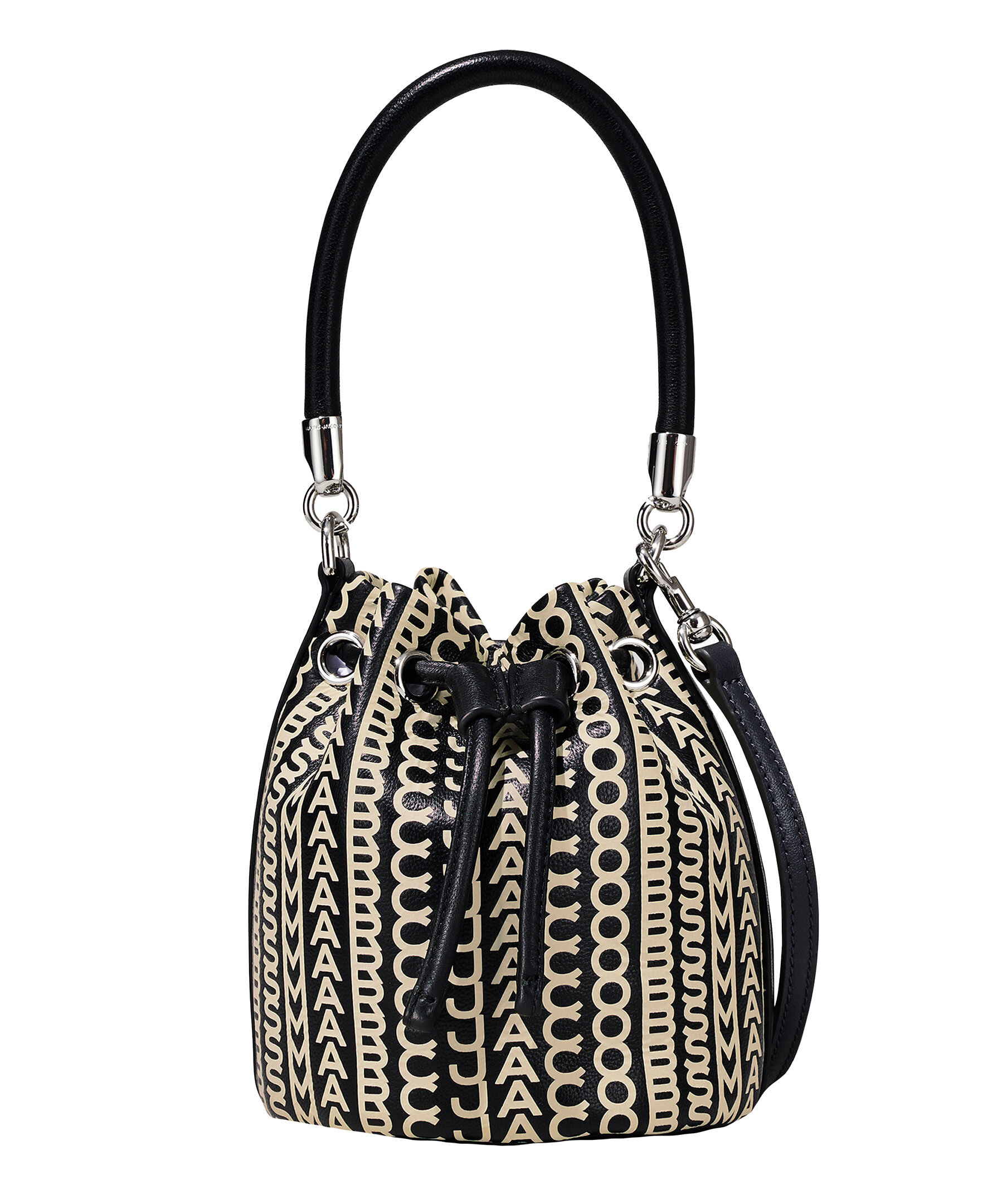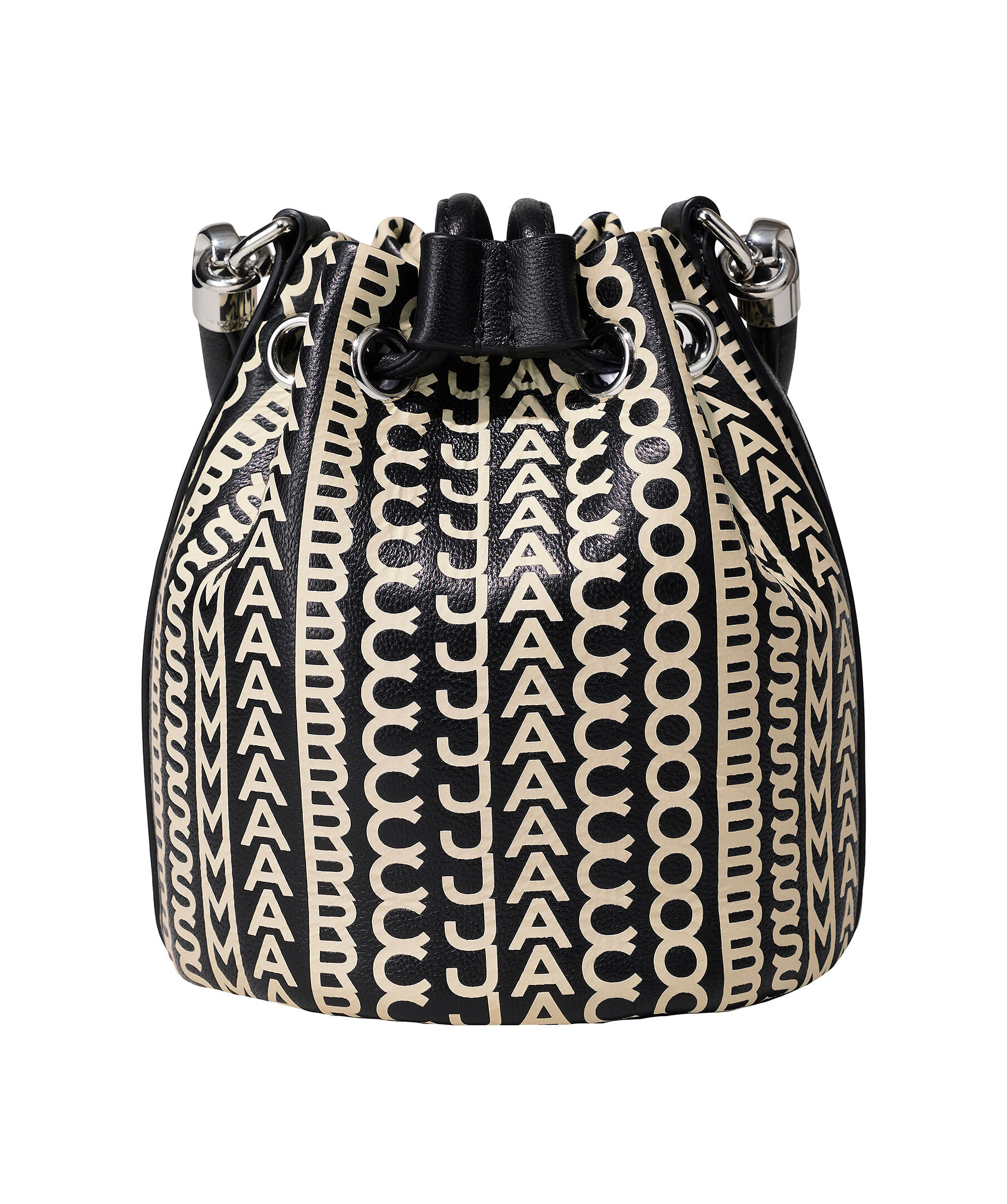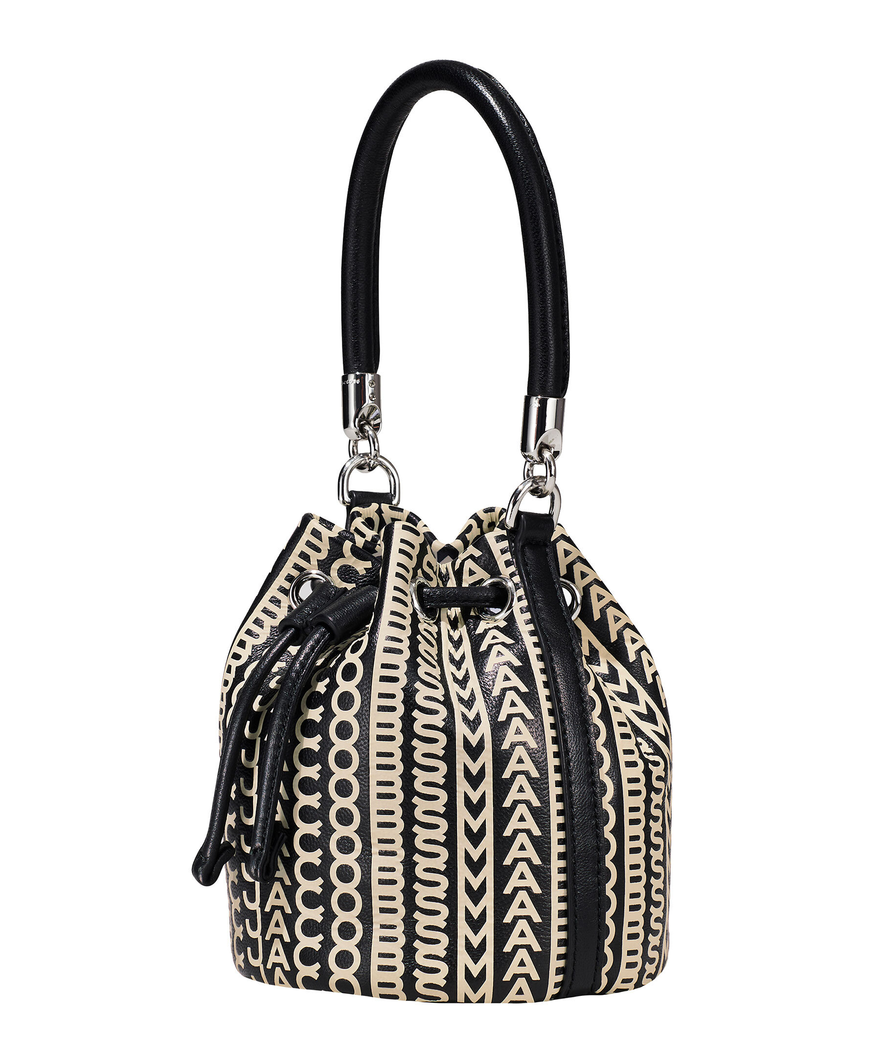 Svart och vit monogram mönstrad läderväska i liten bucket modell från Marc Jacobs. Dragsko vid väskans huvudfack. Justerbart och avtagbart axelband.
