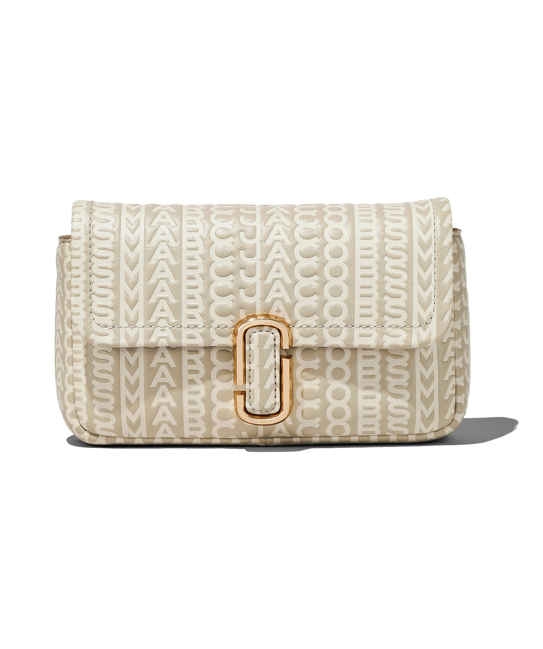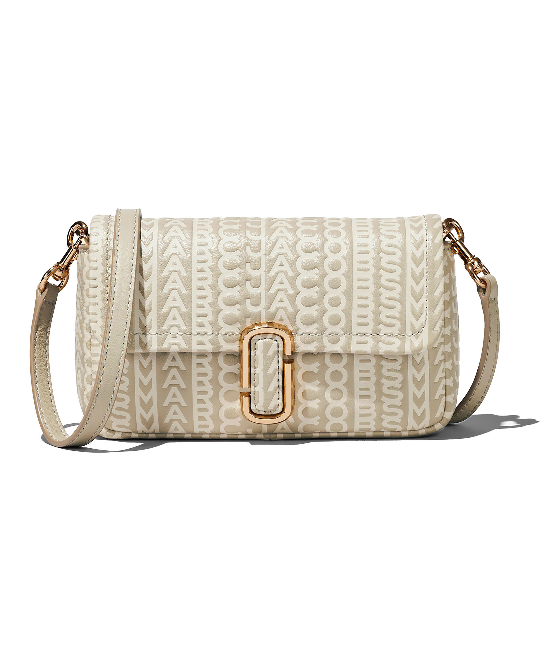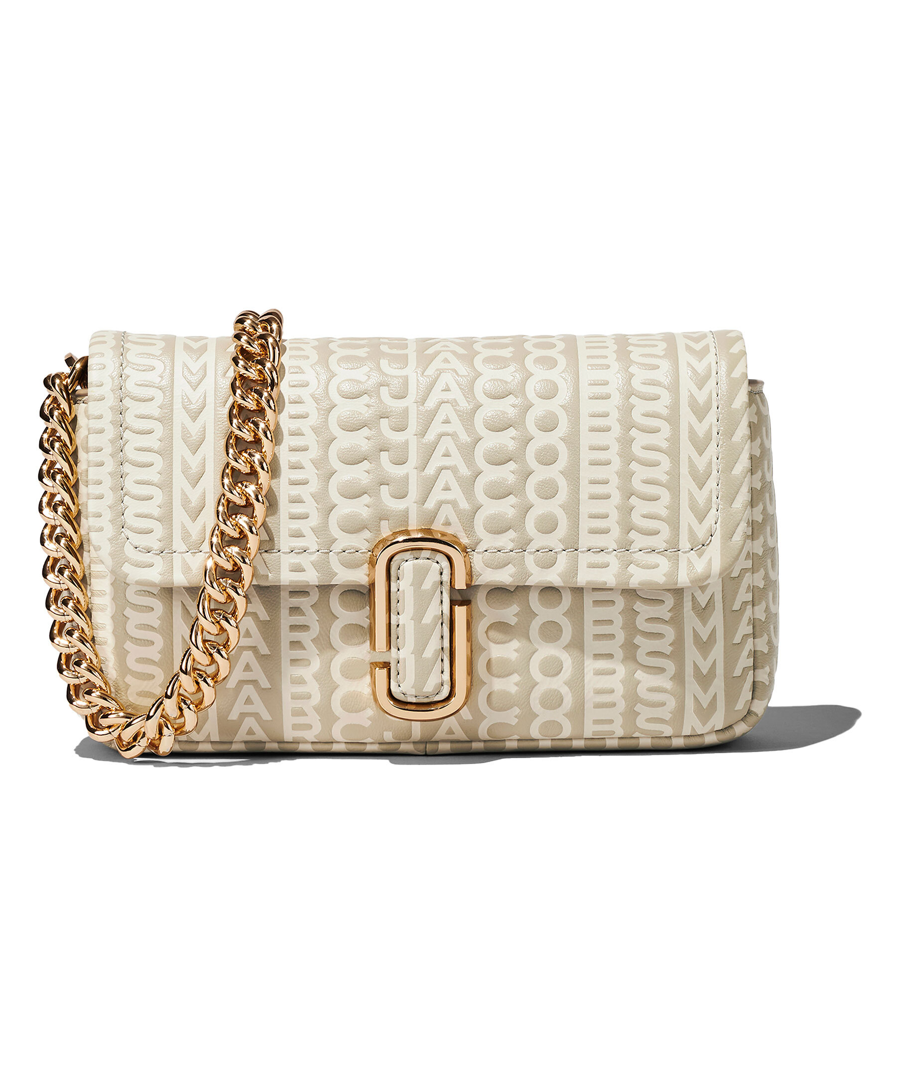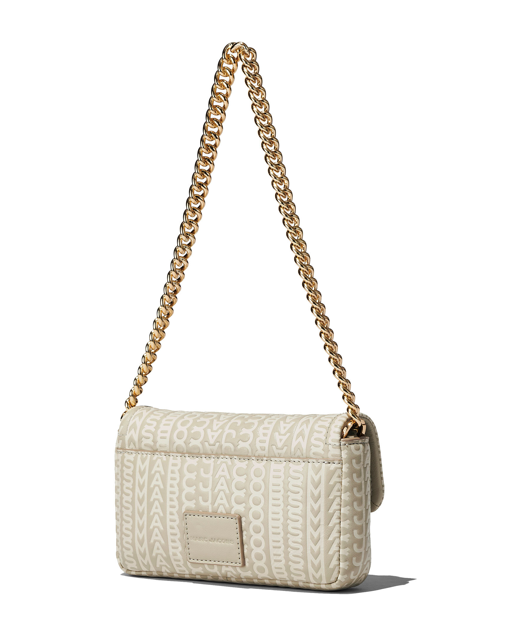 Beige monogram mönstrad väska från Marc Jacobs. Långt axelband i textil med logotyp samt kort handtag i guldfärgad kedja. Guldfärgad logotyp fram, magnetstängning, två invändiga fickor.